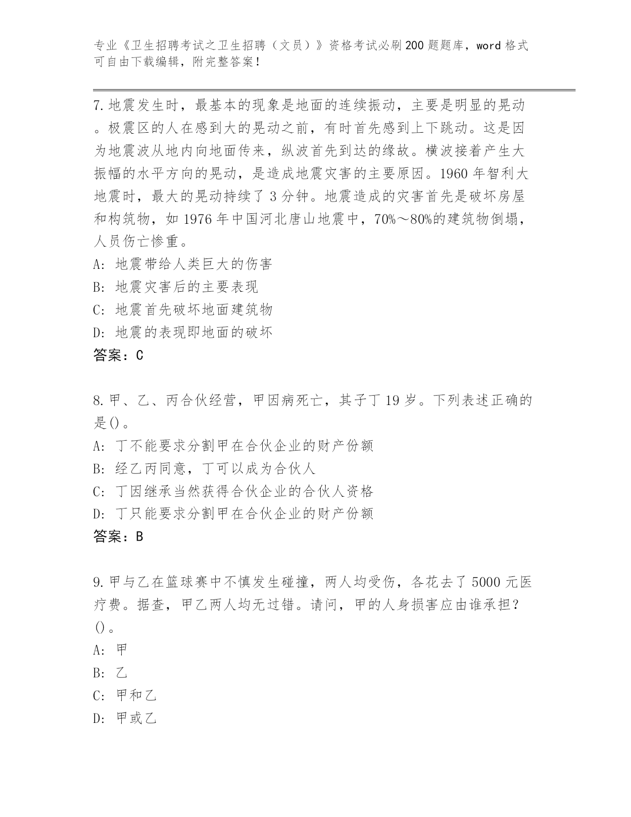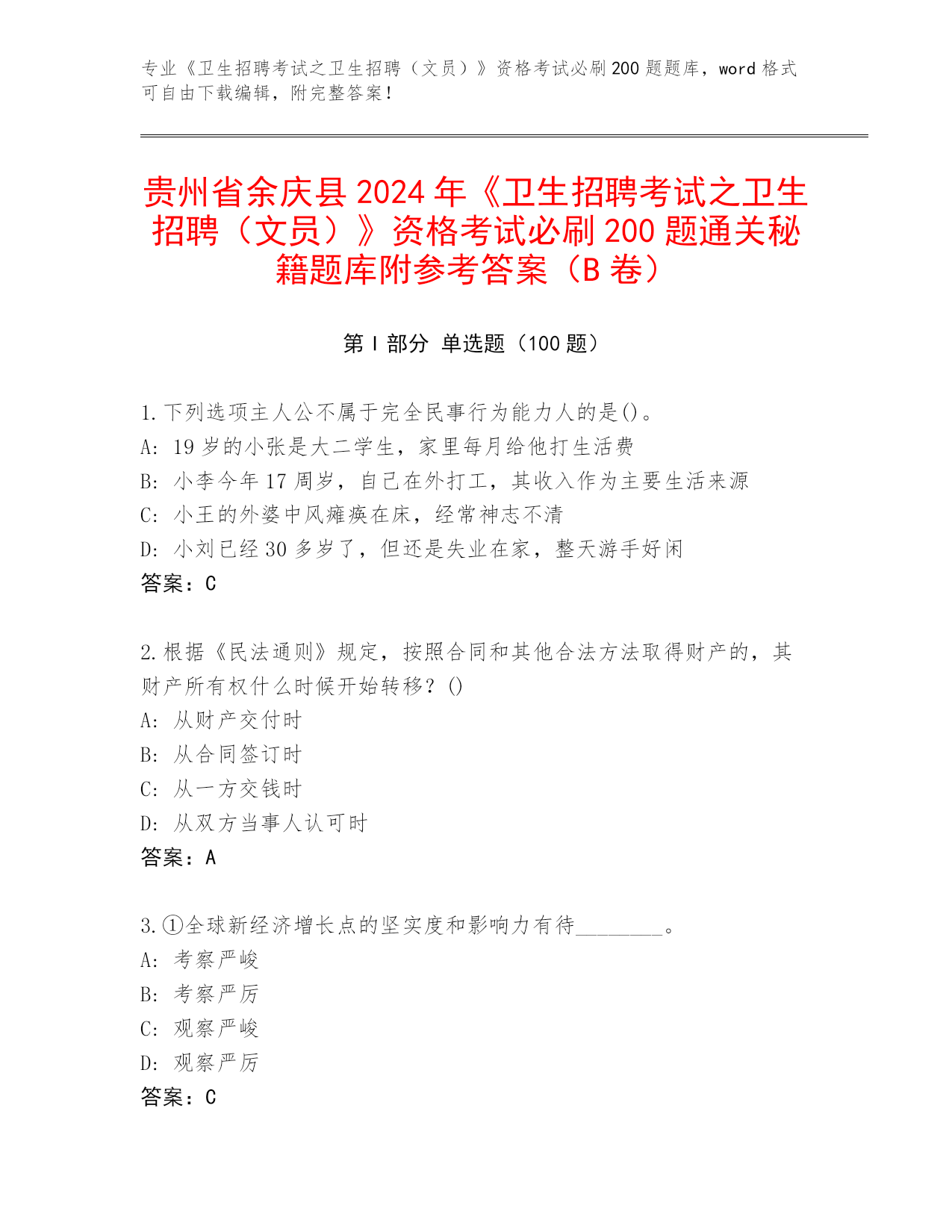 贵州省余庆县2024年《卫生招聘考试之卫生招聘(文员)》资格考试必刷200题通关秘籍题库附参考答案(B卷)