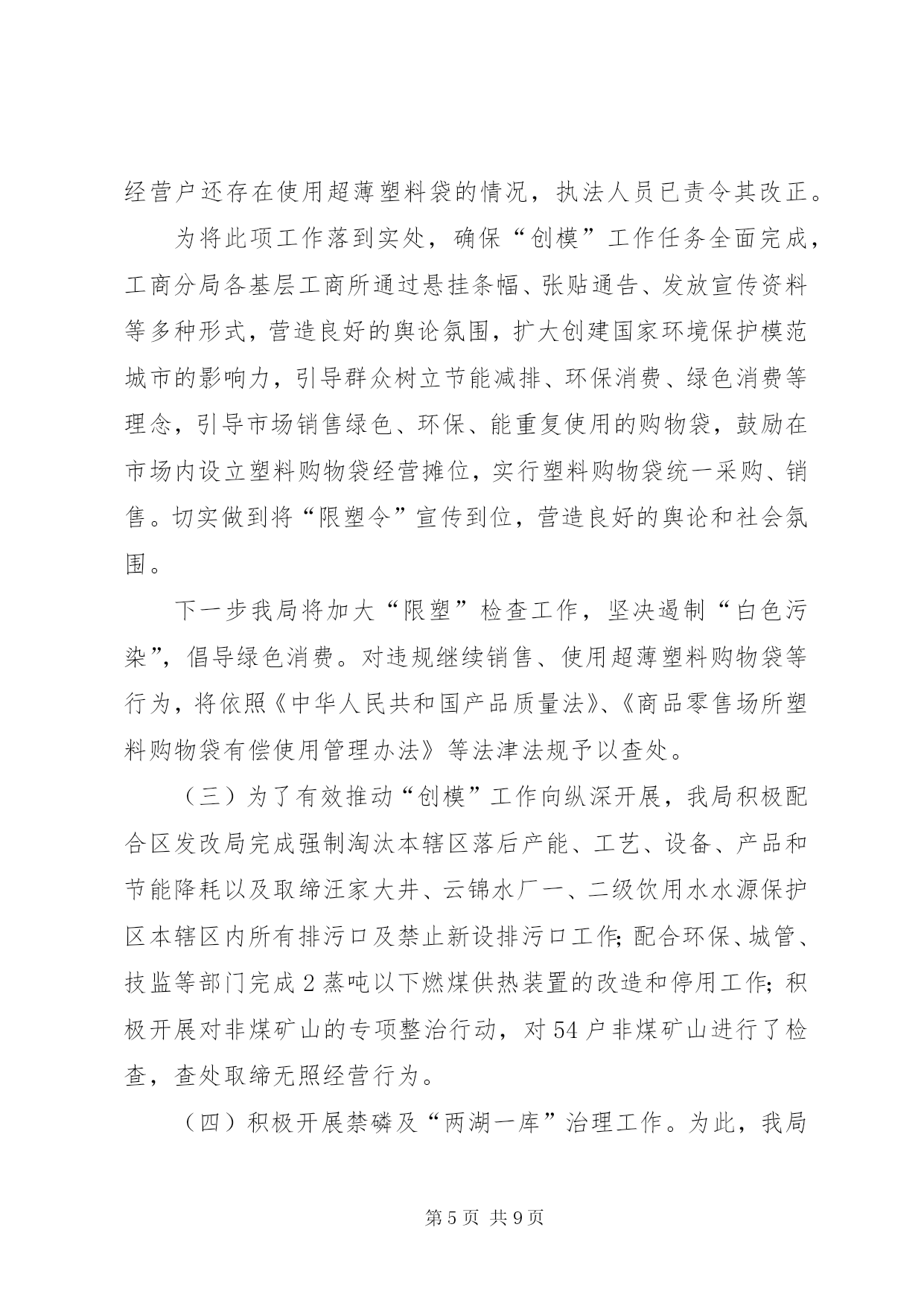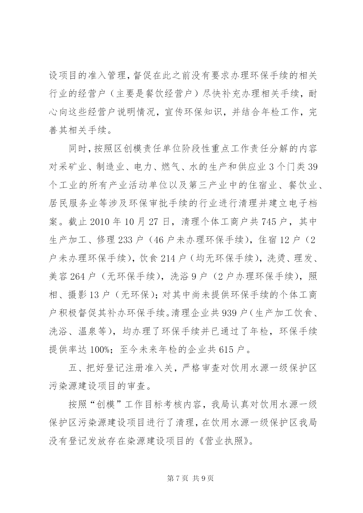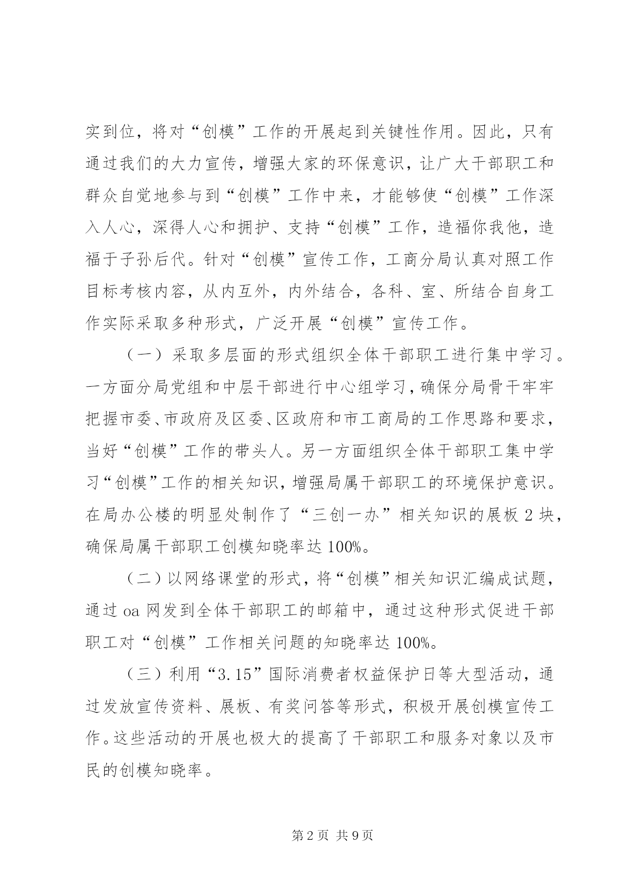 第PAGE\*Arabic\*MERGEFORMAT9页共NUMPAGES\*MERGEFORMAT9页工商局模范城市工作总结根据《区创建国家环境保护模范城市攻坚工作方案》和《市工商行政管理局创建国家环境保护模范城市攻坚工作方案》及其创模目标责任书工作内容的要求,结合工商行政管理职能,在开展“创模”工作中,采取了一系列积极有效的措施,认真贯彻落实创模目标责任,着力推进“创模”工作的开展。一、高度重视,认真贯彻落实创模目标责任。工商分局党组高度重视“创模”工作的开展和推进情况。在“创模”工作伊始,我局立即成立了“创模”工作领导小组,明确了“创模”各项工作的相关责任人。“创模”工作领导小组一方面根据市局及区政府下发的“创模”工作方案制定了《工商分局创模工作攻坚方案》,分解、细化了各项目标计划,将各项工作落实到相关部门和责任人;另一方面建立了督查通报制度、责任追究制度、工作情况等文字材料衔接机制、例会制度,以及“创模”宣传教育、“创模”宣传活动等各项制度。确保全局“创模”工作在领导小组的统一安排部署下,各项制度的落实得到有效的组织保障,使“创模”工作的开展按照攻坚计划有条不紊地组织实施与落实。二、深入开展“创模”宣传工作,确保本系统职工及服务对象众所周知,家喻户晓。宣传工作是“创模”工作的重要组成部分,宣传工作是否落实到位,将对“创模”工作的开展起到关键性作用。因此,只有通过我们的大力宣传,增强大家的环保意识,让广大干部职工和群众自觉地参与到“创模”工作中来,才能够使“创模”工作深入人心,深得人心和拥护、支持“创模”工作,造福你我他,造福于子孙后代。针对“创模”宣传工作,工商分局认真对照工作目标考核内容,从内互外,内外结合,各科、室、所结合自身工作实际采取多种形式,广泛开展“创模”宣传工作。(一)采取多层面的形式组织全体干部职工进行集中学习。一方面分局党组和中层干部进行中心组学习,确保分局骨干牢牢把握市委、市政府及区委、区政府和市工商局的工作思路和要求,当好“创模”工作的带头人。另一方面组织全体干部职工集中学习“创模”工作的相关知识,增强局属干部职工的环境保护意识。在局办公楼的明显处制作了“三创一办”相关知识的展板2块,确保局属干部职工创模知晓率达100%。(二)以网络课堂的形式,将“创模”相关知识汇编成试题,通过oa网发到全体干部职工的邮箱中,通过这种形式促进干部职工对“创模”工作相关问题的知晓率达100%。(三)利用“3.15”国际消费者权益保护日等大型活动,通过发放宣传资料、展板、有奖问答等形式,积极开展创模宣传工作。这些活动的开展也极大的提高了干部职工和服务对象以及市民的创模知晓率。(四)工商分局、区个私协积极配合辖区地方政府通过“入户宣传”等形式开展创模宣传工作。会同综治、城管、司法、公安等部门,组成“三创一办”宣传队,专门针对辖区个体经营户开展了为期20天的“三创一办”宣传动员和教育活动。宣传队以网格化、立体式、全方位的形式对沿街门面逐户开展“三创一办”宣传,深入到大街小巷、楼群院落,发放了《“三创一办”和市民文明守则》、《区委、区政府致全区人民的一封信》、《三创一办倡议书》、《市促进生态文明建设条例》等资料,共发放资料4500多份。在宣传动员中,宣传队广泛动员经营户发扬主人翁精神,自觉遵守“整脏治乱”的要求,做好“门前三包”(包秩序、包绿化、包卫生),积极带头当文明人、做文明事,从我做起、从现在做起、从身边小事做起,积极参与到“三创一办”的行列中。同时,积极参加区人民政府组织举行的十万森林保护志愿者行动。为促进干部职工和服务对象对“创模”的知晓率达100%奠定了坚实的基础。工商分局积极采取了行之有效的措施和方法开展“创模”宣传,这些做法得到了服务对象的普遍支持和认可,很多经营户表示,通过了解“三创一办”的意义和政府的工作,很乐意投入到“三创一办”活动中,从身边小事做起,为把这个共同的“大家”建设得更加美好。经营户们纷纷说道:“通过你们的宣传动员,我知道了‘三创一办’活动的意义,我会更加积极地投入到‘三创一办’活动中来,从身边小事做起,比如做好门前三包,把好食品进货关,做好食品进销货台账,不销售变质过期食品,为食品安全和促进区生态文明建设尽自己的一份力。”通过近一年来的宣传工作和整治行动,“三创一办”工作已经真正起到了众所周知,家喻户晓和广大干部和群众广泛参与的作用,城市环境保护满意率95%的工作目标已经实现。(五)按照“创模”宣传工作目标内容,工商分局在积极开展“创模”宣传工作的同时,对所开展的“创模”宣传工作认真进行自查评估,并按时将自查评估报告上报区“创模”办。三、结合辖区实际,深入开展“创模”整治工作。(一)按照市、区《创建国家环境保护模范城市攻坚工作方案》的要求清理、处置涉危废物。完成