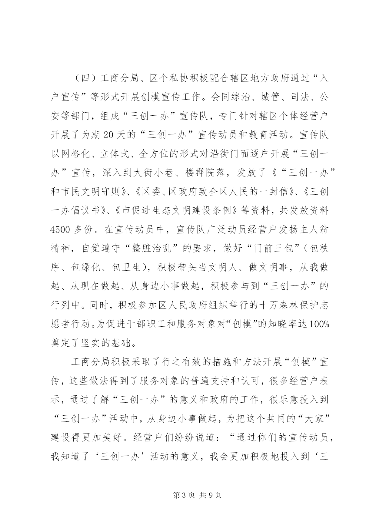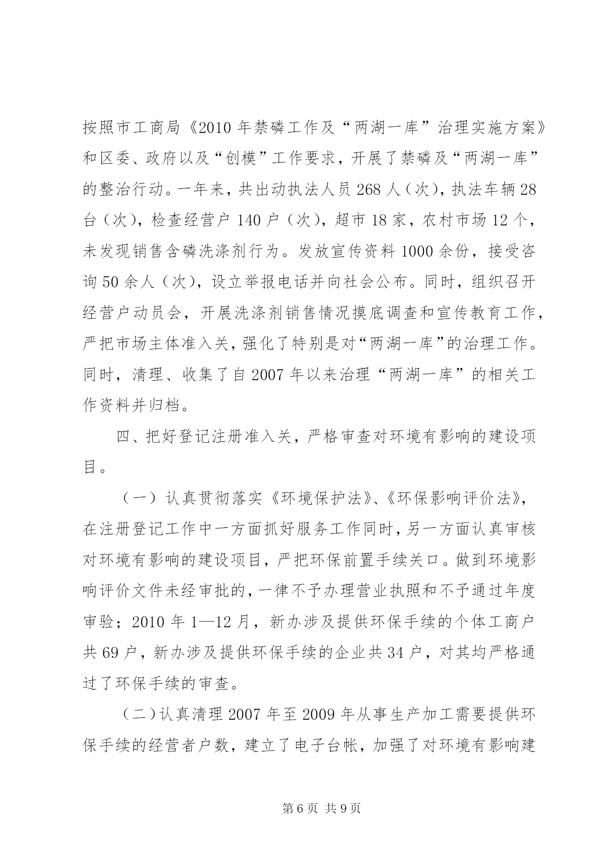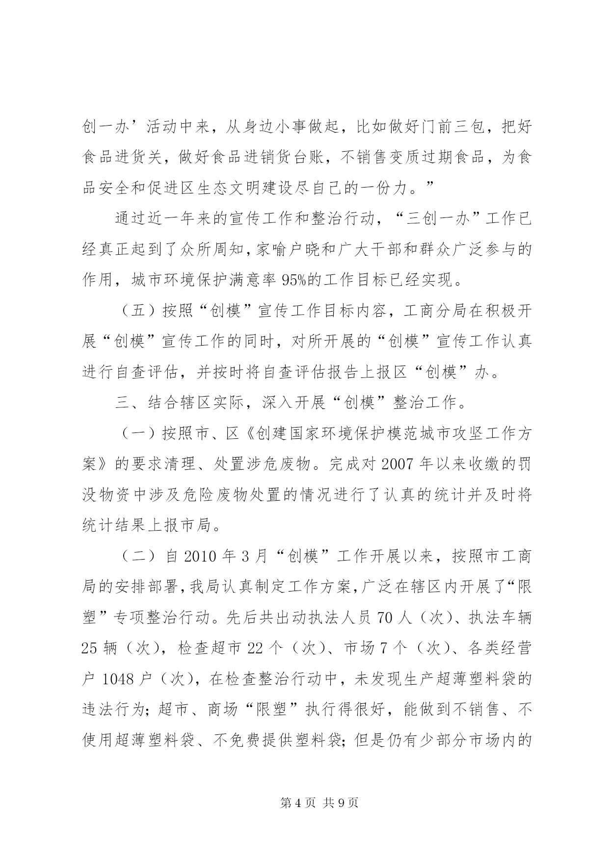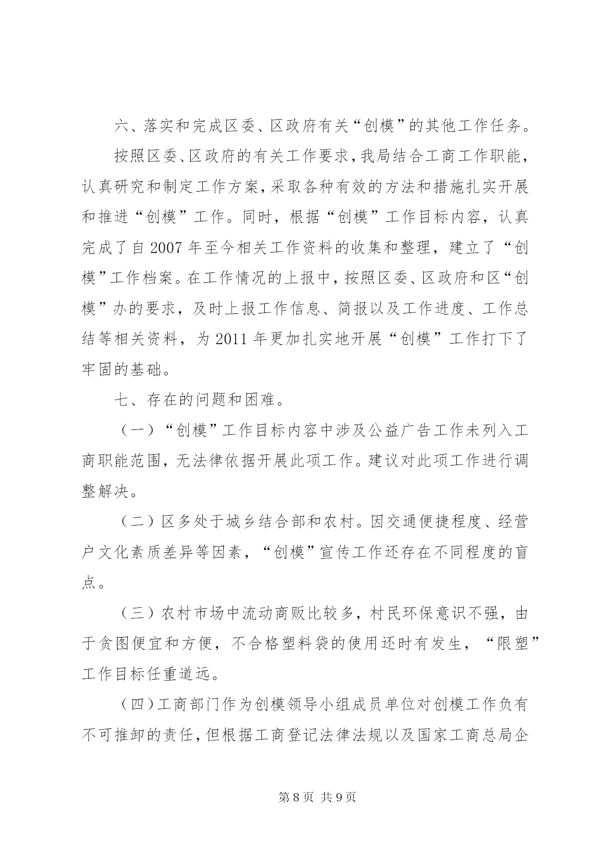 第PAGE\*Arabic\*MERGEFORMAT9页共NUMPAGES\*MERGEFORMAT9页工商局模范城市工作总结根据《区创建国家环境保护模范城市攻坚工作方案》和《市工商行政管理局创建国家环境保护模范城市攻坚工作方案》及其创模目标责任书工作内容的要求,结合工商行政管理职能,在开展“创模”工作中,采取了一系列积极有效的措施,认真贯彻落实创模目标责任,着力推进“创模”工作的开展。一、高度重视,认真贯彻落实创模目标责任。工商分局党组高度重视“创模”工作的开展和推进情况。在“创模”工作伊始,我局立即成立了“创模”工作领导小组,明确了“创模”各项工作的相关责任人。“创模”工作领导小组一方面根据市局及区政府下发的“创模”工作方案制定了《工商分局创模工作攻坚方案》,分解、细化了各项目标计划,将各项工作落实到相关部门和责任人;另一方面建立了督查通报制度、责任追究制度、工作情况等文字材料衔接机制、例会制度,以及“创模”宣传教育、“创模”宣传活动等各项制度。确保全局“创模”工作在领导小组的统一安排部署下,各项制度的落实得到有效的组织保障,使“创模”工作的开展按照攻坚计划有条不紊地组织实施与落实。二、深入开展“创模”宣传工作,确保本系统职工及服务对象众所周知,家喻户晓。宣传工作是“创模”工作的重要组成部分,宣传工作是否落实到位,将对“创模”工作的开展起到关键性作用。因此,只有通过我们的大力宣传,增强大家的环保意识,让广大干部职工和群众自觉地参与到“创模”工作中来,才能够使“创模”工作深入人心,深得人心和拥护、支持“创模”工作,造福你我他,造福于子孙后代。针对“创模”宣传工作,工商分局认真对照工作目标考核内容,从内互外,内外结合,各科、室、所结合自身工作实际采取多种形式,广泛开展“创模”宣传工作。(一)采取多层面的形式组织全体干部职工进行集中学习。一方面分局党组和中层干部进行中心组学习,确保分局骨干牢牢把握市委、市政府及区委、区政府和市工商局的工作思路和要求,当好“创模”工作的带头人。另一方面组织全体干部职工集中学习“创模”工作的相关知识,增强局属干部职工的环境保护意识。在局办公楼的明显处制作了“三创一办”相关知识的展板2块,确保局属干部职工创模知晓率达100%。(二)以网络课堂的形式,将“创模”相关知识汇编成试题,通过oa网发到全体干部职工的邮箱中,通过这种形式促进干部职工对“创模”工作相关问题的知晓率达100%。(三)利用“3.15”国际消费者权益保护日等大型活动,通过发放宣传资料、展板、有奖问答等形式,积极开展创模宣传工作。这些活动的开展也极大的提高了干部职工和服务对象以及市民的创模知晓率。(四)工商分局、区个私协积极配合辖区地方政府通过“入户宣传”等形式开展创模宣传工作。会同综治、城管、司法、公安等部门,组成“三创一办”宣传队,专门针对辖区个体经营户开展了为期20天的“三创一办”宣传动员和教育活动。宣传队以网格化、立体式、全方位的形式对沿街门面逐户开展“三创一办”宣传,深入到大街小巷、楼群院落,发放了《“三创一办”和市民文明守则》、《区委、区政府致全区人民的一封信》、《三创一办倡议书》、《市促进生态文明建设条例》等资料,共发放资料4500多份。在宣传动员中,宣传队广泛动员经营户发扬主人翁精神,自觉遵守“整脏治乱”的要求,做好“门前三包”(包秩序、包绿化、包卫生),积极带头当文明人、做文明事,从我做起、从现在做起、从身边小事做起,积极参与到“三创一办”的行列中。同时,积极参加区人民政府组织举行的十万森林保护志愿者行动。为促进干部职工和服务对象对“创模”的知晓率达100%奠定了坚实的基础。工商分局积极采取了行之有效的措施和方法开展“创模”宣传,这些做法得到了服务对象的普遍支持和认可,很多经营户表示,通过了解“三创一办”的意义和政府的工作,很乐意投入到“三创一办”活动中,从身边小事做起,为把这个共同的“大家”建设得更加美好。经营户们纷纷说道:“通过你们的宣传动员,我知道了‘三创一办’活动的意义,我会更加积极地投入到‘三创一办’活动中来,从身边小事做起,比如做好门前三包,把好食品进货关,做好食品进销货台账,不销售变质过期食品,为食品安全和促进区生态文明建设尽自己的一份力。”通过近一年来的宣传工作和整治行动,“三创一办”工作已经真正起到了众所周知,家喻户晓和广大干部和群众广泛参与的作用,城市环境保护满意率95%的工作目标已经实现。(五)按照“创模”宣传工作目标内容,工商分局在积极开展“创模”宣传工作的同时,对所开展的“创模”宣传工作认真进行自查评估,并按时将自查评估报告上报区“创模”办。三、结合辖区实际,深入开展“创模”整治工作。(一)按照市、区《创建国家环境保护模范城市攻坚工作方案》的要求清理、处置涉危废物。完成