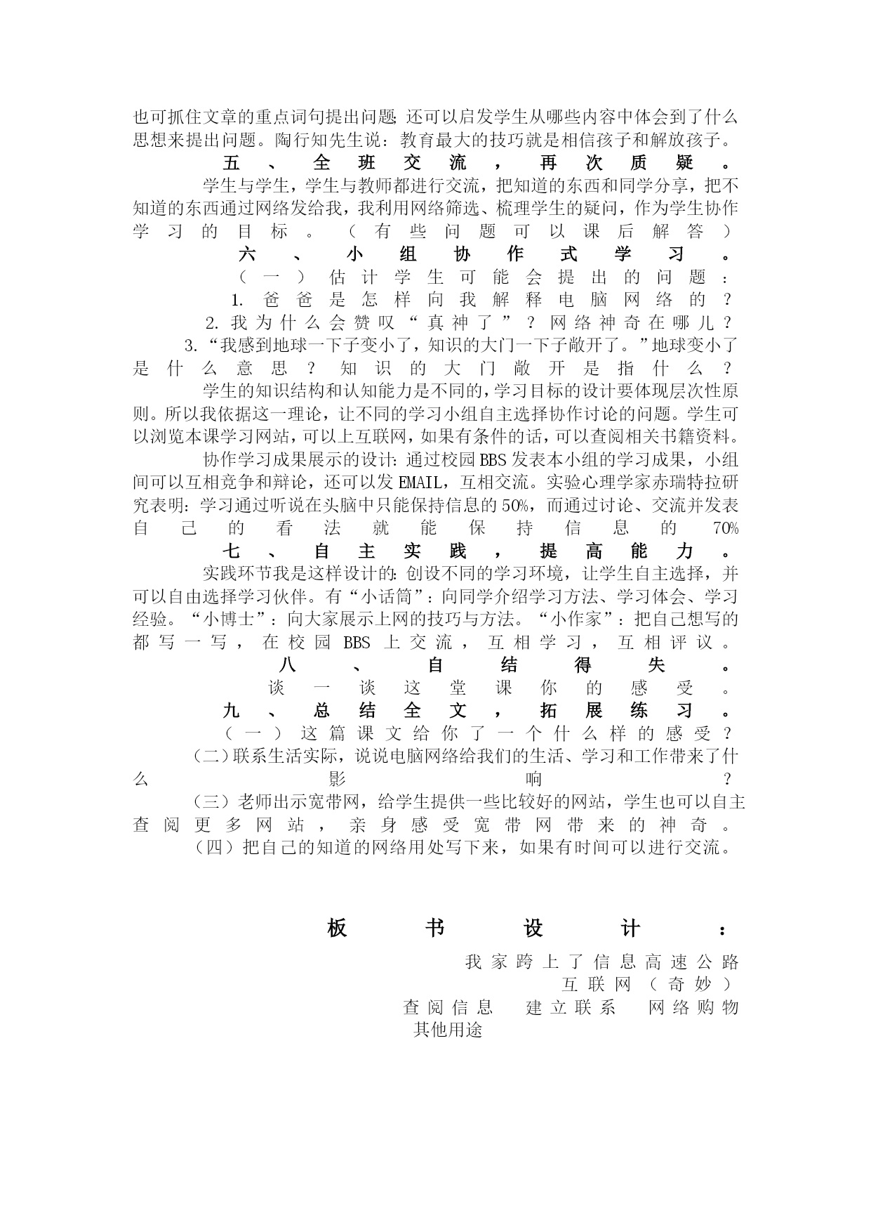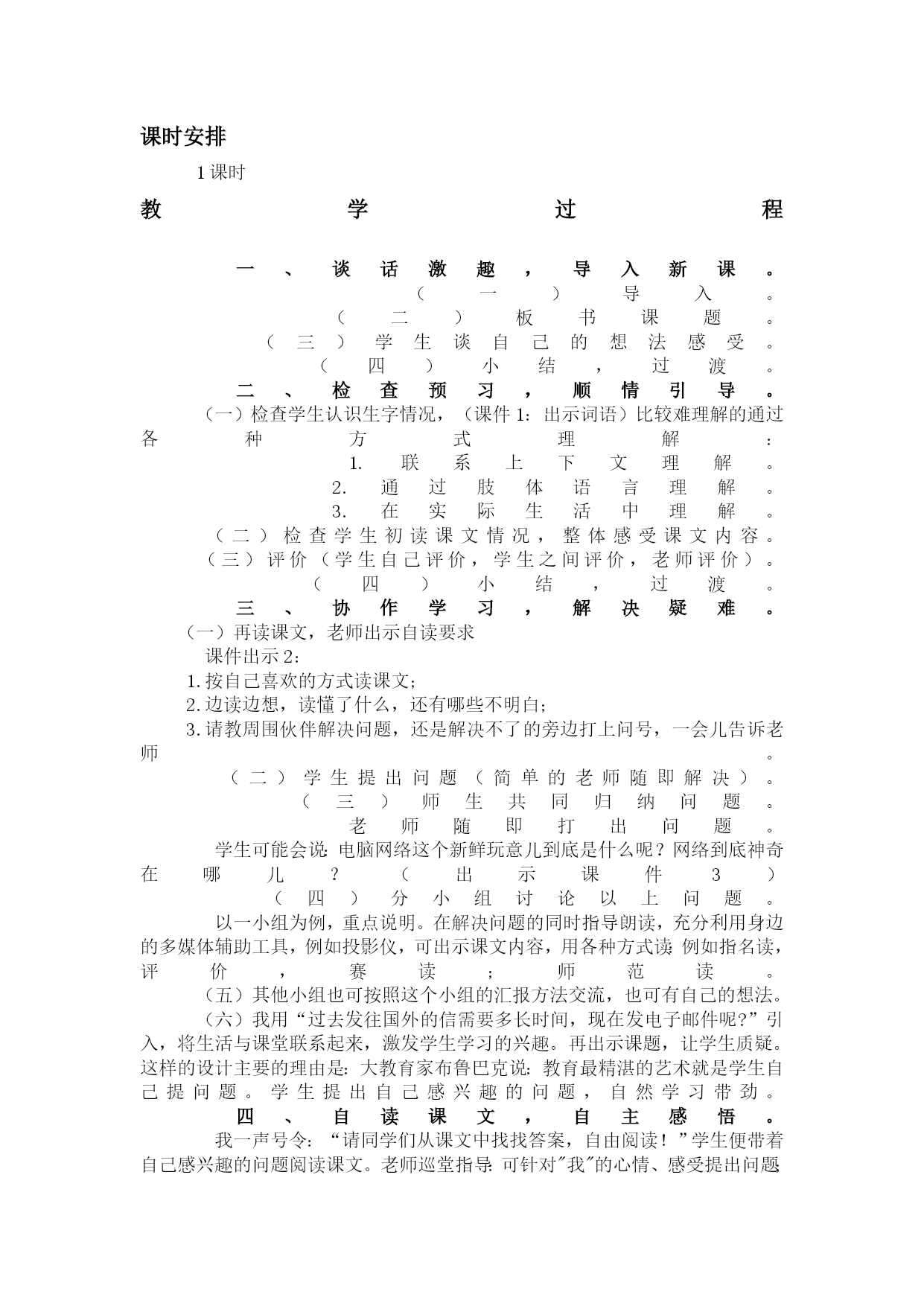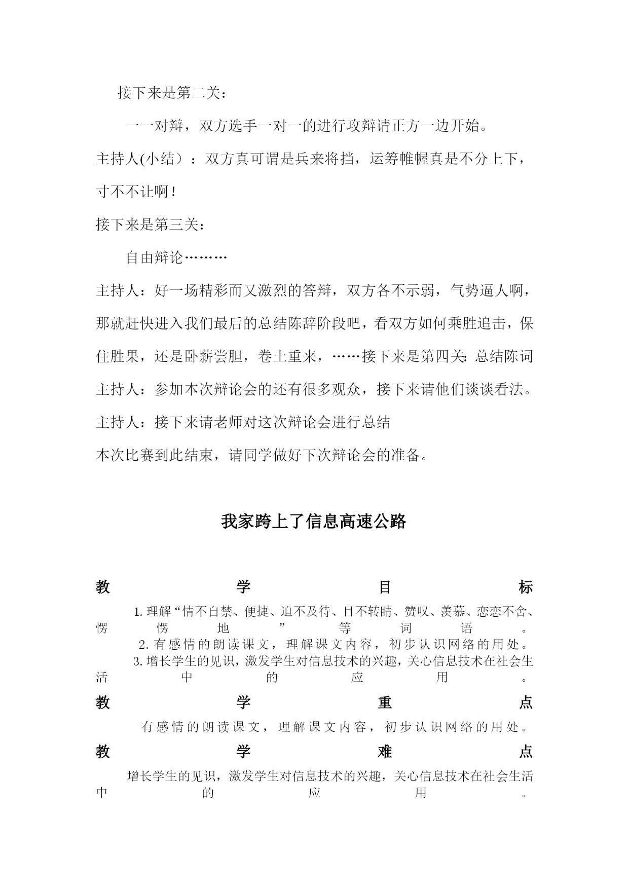 五一班语文实践-----辩论会教案目标:1.在辩论的过程中,培养学生口语表达、倾听和应对能力。2.通过辩论,让学生明白阅读的重要性。过程:主持人:大家好,欢迎来参加本次辩论会,本次辩论会的题目是——开卷有益还是开卷未必有益。正反方观点:在我的右手边是(正)方,他们所持的立场是:开卷有益,我们该阅读,在我的(左)手边是(反)方,他们所持的立场是:开卷未必有益。主持人:欢迎各位辩手和同学们的到来,希望双方在今天的比赛中都有出色的表现。主持人:本次我们的评委是(在座的全班同学)。本次比赛我们分为四关:第一关陈述观点。第二关一一对辩。第三关自由辩论。第四关总结陈词。主持人:本次比赛的规则是1.只能口辩,不能人身攻击。2.注意倾听,一方发言,一方保持安静。首先,进入我们的第一关:陈述观点。请正方组长开始:……双方辩手真是激情满怀,看来双方战略以定。接下来是第二关:一一对辩,双方选手一对一的进行攻辩请正方一边开始。主持人(小结):双方真可谓是兵来将挡,运筹帷幄真是不分上下,寸不不让啊!接下来是第三关:自由辩论………主持人:好一场精彩而又激烈的答辩,双方各不示弱,气势逼人啊,那就赶快进入我们最后的总结陈辞阶段吧,看双方如何乘胜追击,保住胜果,还是卧薪尝胆,卷土重来,……接下来是第四关:总结陈词主持人:参加本次辩论会的还有很多观众,接下来请他们谈谈看法。主持人:接下来请老师对这次辩论会进行总结本次比赛到此结束,请同学做好下次辩论会的准备。我家跨上了信息高速公路教学目标1.理解“情不自禁、便捷、迫不及待、目不转睛、赞叹、羡慕、恋恋不舍、愣愣地”等词语。2.有感情的朗读课文,理解课文内容,初步认识网络的用处。3.增长学生的见识,激发学生对信息技术的兴趣,关心信息技术在社会生活中的应用。教学重点有感情的朗读课文,理解课文内容,初步认识网络的用处。教学难点增长学生的见识,激发学生对信息技术的兴趣,关心信息技术在社会生活中的应用。课时安排1课时教学过程一、谈话激趣,导入新课。(一)导入。(二)板书课题。(三)学生谈自己的想法感受。(四)小结,过渡。二、检查预习,顺情引导。(一)检查学生认识生字情况,(课件1:出示词语)比较难理解的通过各种方式理解:1.联系上下文理解。2.通过肢体语言理解。3.在实际生活中理解。(二)检查学生初读课文情况,整体感受课文内容。(三)评价(学生自己评价,学生之间评价,老师评价)。(四)小结,过渡。三、协作学习,解决疑难。(一)再读课文,老师出示自读要求课件出示2:1.按自己喜欢的方式读课文;2.边读边想,读懂了什么,还有哪些不明白;3.请教周围伙伴解决问题,还是解决不了的旁边打上问号,一会儿告诉老师。(二)学生提出问题(简单的老师随即解决)。(三)师生共同归纳问题。老师随即打出问题。学生可能会说:电脑网络这个新鲜玩意儿到底是什么呢?网络到底神奇在哪儿?(出示课件3)(四)分小组讨论以上问题。以一小组为例,重点说明。在解决问题的同时指导朗读,充分利用身边的多媒体辅助工具,例如投影仪,可出示课文内容,用各种方式读:例如指名读,评价,赛读;师范读。(五)其他小组也可按照这个小组的汇报方法交流,也可有自己的想法。(六)我用“过去发往国外的信需要多长时间,现在发电子邮件呢?”引入,将生活与课堂联系起来,激发学生学习的兴趣。再出示课题,让学生质疑。这样的设计主要的理由是:大教育家布鲁巴克说:教育最精湛的艺术就是学生自己提问题。学生提出自己感兴趣的问题,自然学习带劲。四、自读课文,自主感悟。我一声号令:“请同学们从课文中找找答案,自由阅读!”学生便带着自己感兴趣的问题阅读课文。老师巡堂指导:可针对"我"的心情、感受提出问题;也可抓住文章的重点词句提出问题;还可以启发学生从哪些内容中体会到了什么思想来提出问题。陶行知先生说:教育最大的技巧就是相信孩子和解放孩子。五、全班交流,再次质疑。学生与学生,学生与教师都进行交流,把知道的东西和同学分享,把不知道的东西通过网络发给我,我利用网络筛选、梳理学生的疑问,作为学生协作学习的目标。(有些问题可以课后解答)六、小组协作式学习。(一)估计学生可能会提出的问题:1.爸爸是怎样向我解释电脑网络的?2.我为什么会赞叹“真神了”?网络神奇在哪儿?3.“我感到地球一下子变小了,知识的大门一下子敞开了。”地球变小了是什么意思?知识的大门敞开是指什么?学生的知识结构和认知能力是不同的,学习目标的设计要体现层次性原则。所以我依据这一理论,让不同的学习小组自主选择协作讨论的问题。学生可以浏览本课学习网站,可以上互联网,如果有条件的话,可以查阅相关书籍资料。协作学习成果展示的设计:通过校园BBS发表本小组的学习成果,小组间可以互相竞争和辩论,还可以发EMAIL