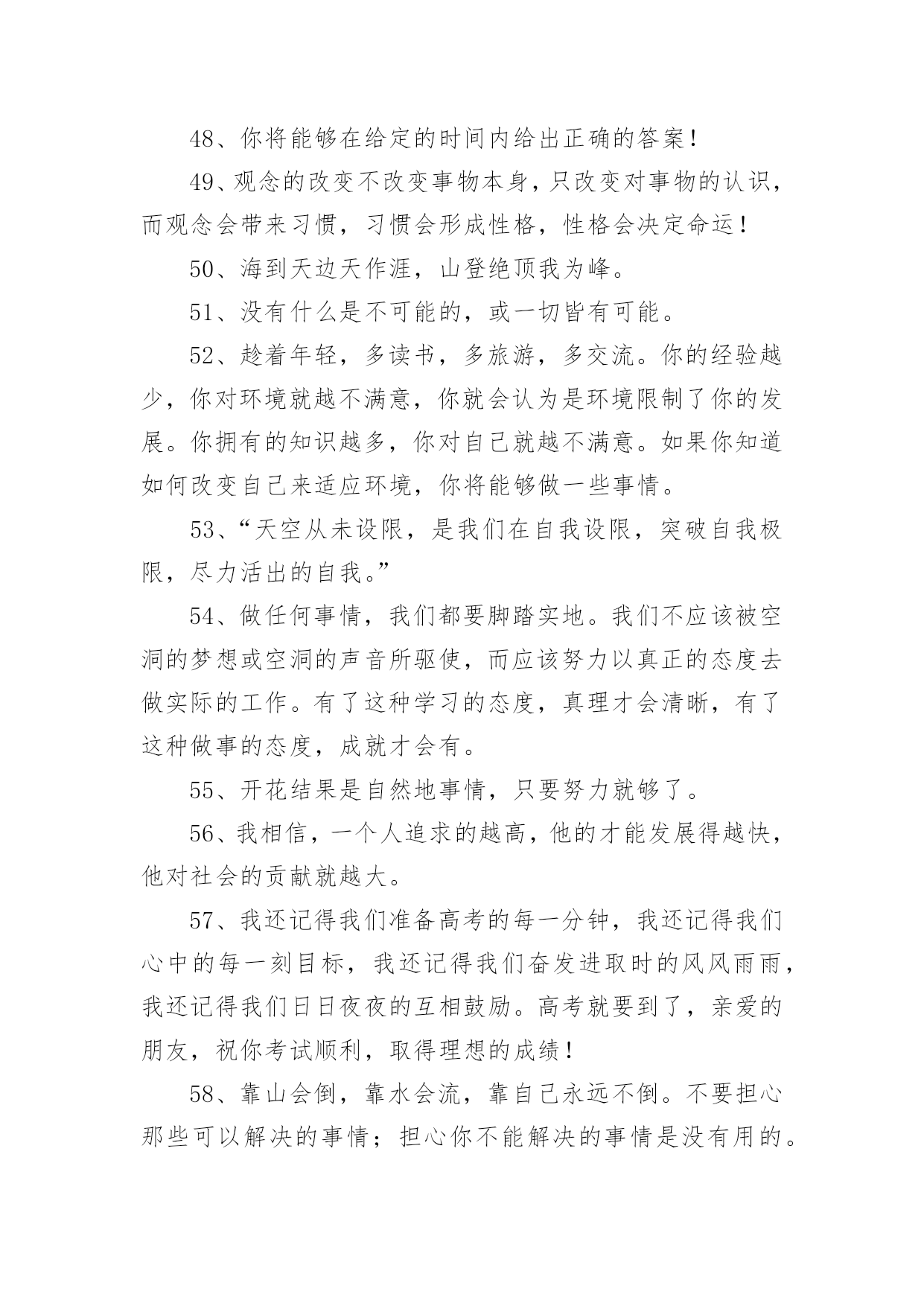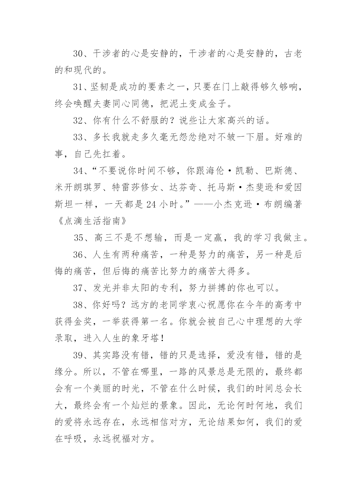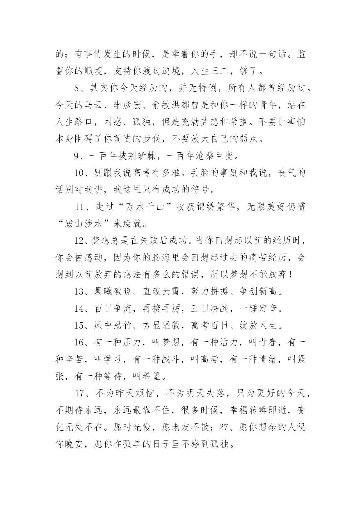 高考激励人心句子高考激励人心句子在学习、工作或生活中,大家都收藏过自己喜欢的句子吧,从语气上分,句子可以分为陈述句、疑问句、祈使句和感叹句。句子的类型多样,你所见过的句子是什么样的呢?以下是小编为大家整理的高考激励人心句子,欢迎阅读与收藏。1、为了将来不后悔,现在必须努力努力再努力。再苦再累也值得。2、“认为某事不可行的人,不应该妄自干扰那些正埋头苦干的人。”3、所有不愉快的事情都是情绪上的,尽可能远离劳动世界。4、被人嘲笑是难免的,我选择不计较,继续我前行的路。因为我的已经看到目的地。那里充满鲜花和掌声。5、我这个世界一个凡人,总有坎坷与世界同行,遇到挫折并不可怕,只要坚持奋斗就行。郁闷的时候朋友说话,困难的时候不要生气,压力面前不要颓废,总有乌云撑开。6、有一个人可以让你一直微笑。有这样一句话,在我心底永远温暖你的心。7、真正在乎你的人,在什么都没发生的时候,是挑剔的;有事情发生的时候,是牵着你的手,却不说一句话。监督你的顺境,支持你渡过逆境,人生三二,够了。8、其实你今天经历的,并无特例,所有人都曾经历过。今天的马云、李彦宏、俞敏洪都曾是和你一样的青年,站在人生路口,困惑、孤独,但是充满梦想和希望。不要让害怕本身阻碍了你前进的步伐,不要放大自己的弱点。9、一百年披荆斩棘,一百年沧桑巨变。10、别跟我说高考有多难。丢脸的事别和我说,丧气的话别对我讲,我这里只有成功的符号。11、走过“万水千山”收获锦绣繁华,无限美好仍需“跋山涉水”来绘就。12、梦想总是在失败后成功。当你回想起以前的经历时,你会被感动,因为你的脑海里会回想起过去的痛苦经历,会想到以前放弃的想法有多么的错误,所以梦想不能放弃!13、晨曦破晓、直破云霄,努力拼搏、争创新高。14、百日争流,再接再厉,三日决战,一锤定音。15、风中劲竹、方显坚毅,高考百日、绽放人生。16、有一种压力,叫梦想,有一种活力,叫青春,有一种辛苦,叫学习,有一种战斗,叫高考,有一种情绪,叫紧张,有一种等待,叫希望。17、不为昨天烦恼,不为明天失落,只为更好的今天,不期待永远,永远最靠不住,很多时候,幸福转瞬即逝,变化无处不在。愿时光慢,愿老友不散;27、愿你想念的人祝你晚安,愿你在孤单的日子里不感到孤独。18、人生是空的,来无影的,走到一缕轻烟里,看淡人生,就会看淡名利,看淡名利,才知道生命中要珍惜什么。19、天黑并不可怕,可怕的是还没有找到通往成功的路。高考也一样。20、让行动与信念齐步,让快乐与成功共享;实现人生自我,创造生命辉煌!21、记住,当别人认为你会输的时候,你要最后一个上场,给他们惊喜,这样你才能赢。22、要看别人的善,要看别人对你的好处,做了一百件好事不要忘恩负义,做了一件不称心的事不要记恨。这样的人是没有道理的,更不用说成就大事了。23、做一个简单的人,踏实而务实。不要沉溺于幻想中。不要为小事烦恼。24、披荆斩棘越苦海,百日奋战铸雄魂。25、将不可能变为可能,可不可以不要笑。奇迹就这我们的手中。26、既然我们选择了远方,就让我们风雨同行。27、当你想要放弃高考的时候,想想自己为什么坚持到这里。28、插上梦想的翅膀,飞出倔强的坚强。29、生活是一场不可抗拒的行军。在岁月的长河中,有无数个驿站,若出的每一句话,都以为;如果你每一步都小心翼翼;如果你做了每一个选择,都怕将来后悔,那么,去做什么芳华!芳华如此痛苦,却又义无反顾。30、干涉者的心是安静的,干涉者的心是安静的,古老的和现代的。31、坚韧是成功的要素之一,只要在门上敲得够久够响,终会唤醒夫妻同心同德,把泥土变成金子。32、你有什么不舒服的?说些让大家高兴的话。33、多长我就走多久毫无怨忿绝对不皱一下眉。好难的事,自己先扛着。34、“不要说你时间不够,你跟海伦·凯勒、巴斯德、米开朗琪罗、特雷莎修女、达芬奇、托马斯·杰斐逊和爱因斯坦一样,一天都是24小时。”——小杰克逊·布朗编著《点滴生活指南》35、高三不是不想输,而是一定赢,我的学习我做主。36、人生有两种痛苦,一种是努力的痛苦,另一种是后悔的痛苦,但后悔的痛苦比努力的痛苦大得多。37、发光并非太阳的专利,努力拼搏的你也可以。38、你好吗?远方的老同学衷心祝愿你在今年的高考中获得金奖,一举获得第一名。你就会被自己心中理想的大学录取,进入人生的象牙塔!39、其实路没有错,错的只是选择,爱没有错,错的是缘分。所以,不管在哪里,一路的风景总是无限的,最终都会有一个美丽的时光,不管在什么时候,我们的时间总会长大,最终会有一个灿烂的景象。因此,无论何时何地,我们的爱将永远存在,永远相信对方,无论结果如何,我们的爱在呼吸,永远祝福对方。40、人生有进有退,输什么都不能输的心情。这个世界,有时候笑别人,有时候给别人笑自己,放松自己,给自己快乐,也给别人快乐。41、每一朵花都像织锦