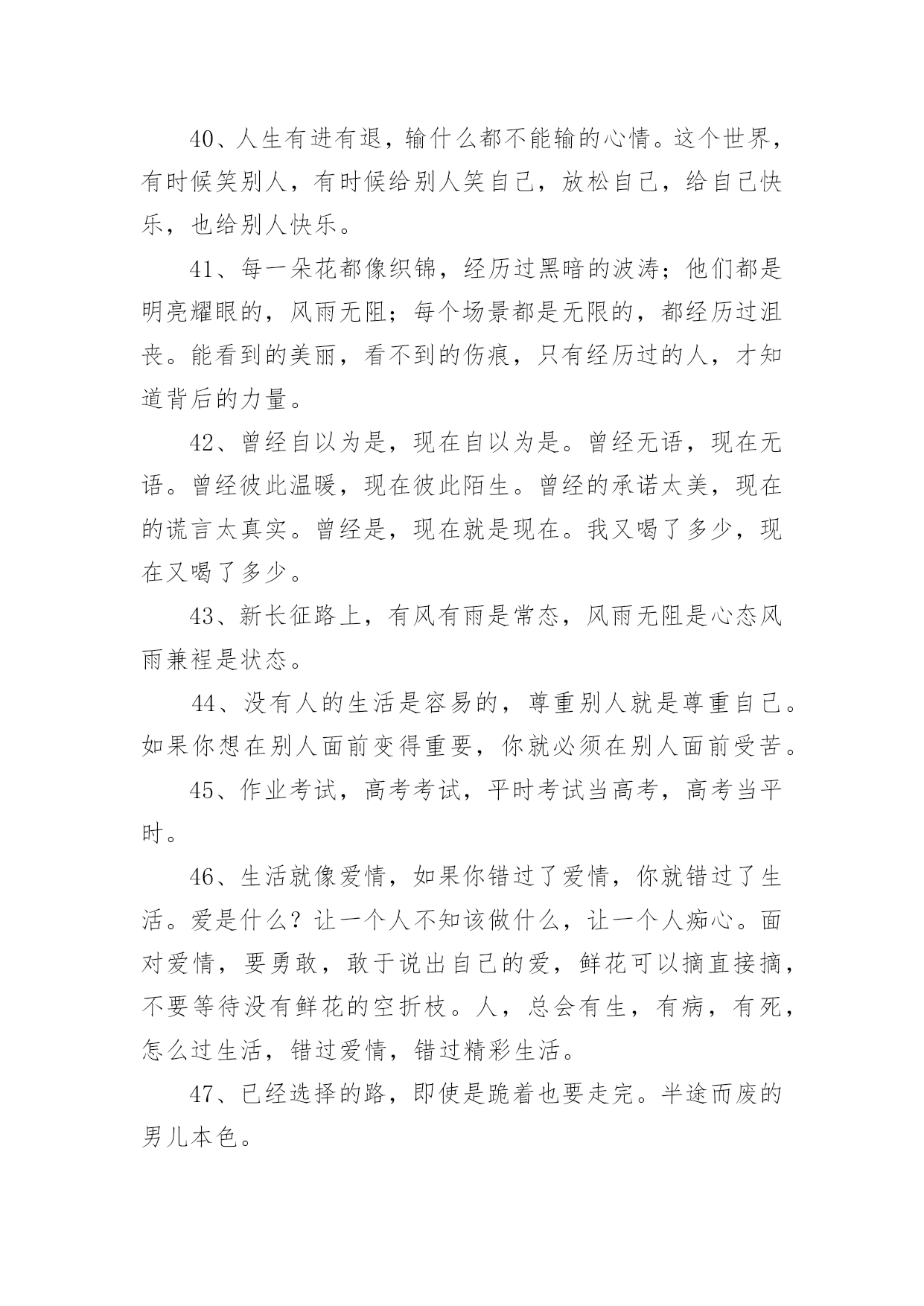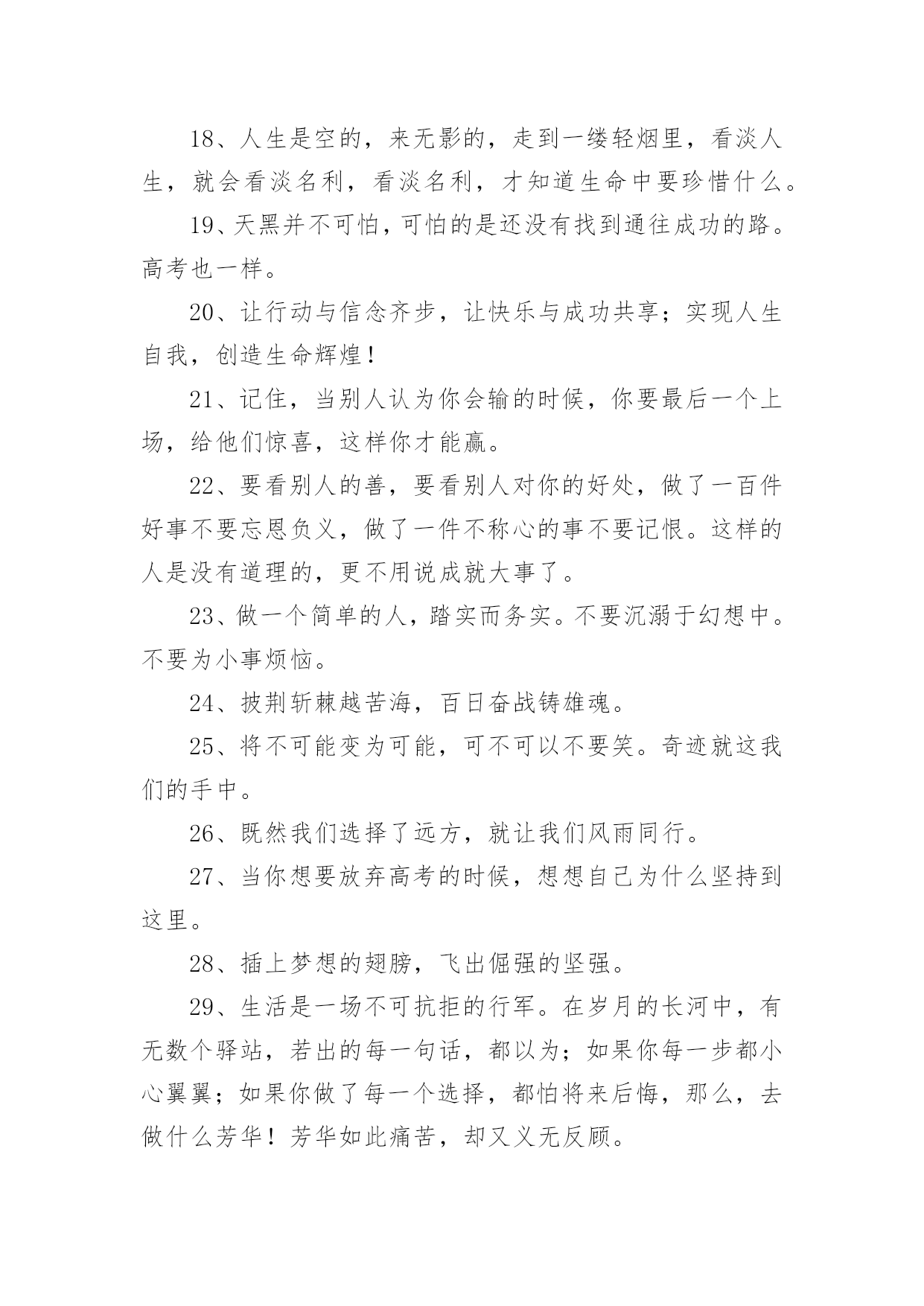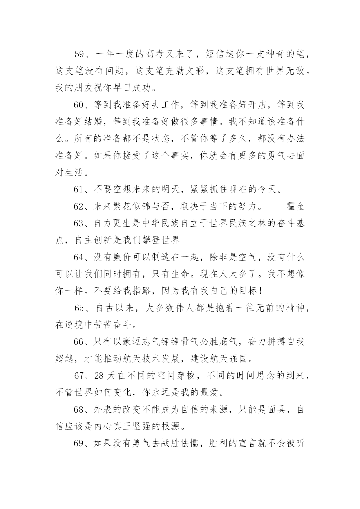 高考激励人心句子高考激励人心句子在学习、工作或生活中,大家都收藏过自己喜欢的句子吧,从语气上分,句子可以分为陈述句、疑问句、祈使句和感叹句。句子的类型多样,你所见过的句子是什么样的呢?以下是小编为大家整理的高考激励人心句子,欢迎阅读与收藏。1、为了将来不后悔,现在必须努力努力再努力。再苦再累也值得。2、“认为某事不可行的人,不应该妄自干扰那些正埋头苦干的人。”3、所有不愉快的事情都是情绪上的,尽可能远离劳动世界。4、被人嘲笑是难免的,我选择不计较,继续我前行的路。因为我的已经看到目的地。那里充满鲜花和掌声。5、我这个世界一个凡人,总有坎坷与世界同行,遇到挫折并不可怕,只要坚持奋斗就行。郁闷的时候朋友说话,困难的时候不要生气,压力面前不要颓废,总有乌云撑开。6、有一个人可以让你一直微笑。有这样一句话,在我心底永远温暖你的心。7、真正在乎你的人,在什么都没发生的时候,是挑剔的;有事情发生的时候,是牵着你的手,却不说一句话。监督你的顺境,支持你渡过逆境,人生三二,够了。8、其实你今天经历的,并无特例,所有人都曾经历过。今天的马云、李彦宏、俞敏洪都曾是和你一样的青年,站在人生路口,困惑、孤独,但是充满梦想和希望。不要让害怕本身阻碍了你前进的步伐,不要放大自己的弱点。9、一百年披荆斩棘,一百年沧桑巨变。10、别跟我说高考有多难。丢脸的事别和我说,丧气的话别对我讲,我这里只有成功的符号。11、走过“万水千山”收获锦绣繁华,无限美好仍需“跋山涉水”来绘就。12、梦想总是在失败后成功。当你回想起以前的经历时,你会被感动,因为你的脑海里会回想起过去的痛苦经历,会想到以前放弃的想法有多么的错误,所以梦想不能放弃!13、晨曦破晓、直破云霄,努力拼搏、争创新高。14、百日争流,再接再厉,三日决战,一锤定音。15、风中劲竹、方显坚毅,高考百日、绽放人生。16、有一种压力,叫梦想,有一种活力,叫青春,有一种辛苦,叫学习,有一种战斗,叫高考,有一种情绪,叫紧张,有一种等待,叫希望。17、不为昨天烦恼,不为明天失落,只为更好的今天,不期待永远,永远最靠不住,很多时候,幸福转瞬即逝,变化无处不在。愿时光慢,愿老友不散;27、愿你想念的人祝你晚安,愿你在孤单的日子里不感到孤独。18、人生是空的,来无影的,走到一缕轻烟里,看淡人生,就会看淡名利,看淡名利,才知道生命中要珍惜什么。19、天黑并不可怕,可怕的是还没有找到通往成功的路。高考也一样。20、让行动与信念齐步,让快乐与成功共享;实现人生自我,创造生命辉煌!21、记住,当别人认为你会输的时候,你要最后一个上场,给他们惊喜,这样你才能赢。22、要看别人的善,要看别人对你的好处,做了一百件好事不要忘恩负义,做了一件不称心的事不要记恨。这样的人是没有道理的,更不用说成就大事了。23、做一个简单的人,踏实而务实。不要沉溺于幻想中。不要为小事烦恼。24、披荆斩棘越苦海,百日奋战铸雄魂。25、将不可能变为可能,可不可以不要笑。奇迹就这我们的手中。26、既然我们选择了远方,就让我们风雨同行。27、当你想要放弃高考的时候,想想自己为什么坚持到这里。28、插上梦想的翅膀,飞出倔强的坚强。29、生活是一场不可抗拒的行军。在岁月的长河中,有无数个驿站,若出的每一句话,都以为;如果你每一步都小心翼翼;如果你做了每一个选择,都怕将来后悔,那么,去做什么芳华!芳华如此痛苦,却又义无反顾。30、干涉者的心是安静的,干涉者的心是安静的,古老的和现代的。31、坚韧是成功的要素之一,只要在门上敲得够久够响,终会唤醒夫妻同心同德,把泥土变成金子。32、你有什么不舒服的?说些让大家高兴的话。33、多长我就走多久毫无怨忿绝对不皱一下眉。好难的事,自己先扛着。34、“不要说你时间不够,你跟海伦·凯勒、巴斯德、米开朗琪罗、特雷莎修女、达芬奇、托马斯·杰斐逊和爱因斯坦一样,一天都是24小时。”——小杰克逊·布朗编著《点滴生活指南》35、高三不是不想输,而是一定赢,我的学习我做主。36、人生有两种痛苦,一种是努力的痛苦,另一种是后悔的痛苦,但后悔的痛苦比努力的痛苦大得多。37、发光并非太阳的专利,努力拼搏的你也可以。38、你好吗?远方的老同学衷心祝愿你在今年的高考中获得金奖,一举获得第一名。你就会被自己心中理想的大学录取,进入人生的象牙塔!39、其实路没有错,错的只是选择,爱没有错,错的是缘分。所以,不管在哪里,一路的风景总是无限的,最终都会有一个美丽的时光,不管在什么时候,我们的时间总会长大,最终会有一个灿烂的景象。因此,无论何时何地,我们的爱将永远存在,永远相信对方,无论结果如何,我们的爱在呼吸,永远祝福对方。40、人生有进有退,输什么都不能输的心情。这个世界,有时候笑别人,有时候给别人笑自己,放松自己,给自己快乐,也给别人快乐。41、每一朵花都像织锦