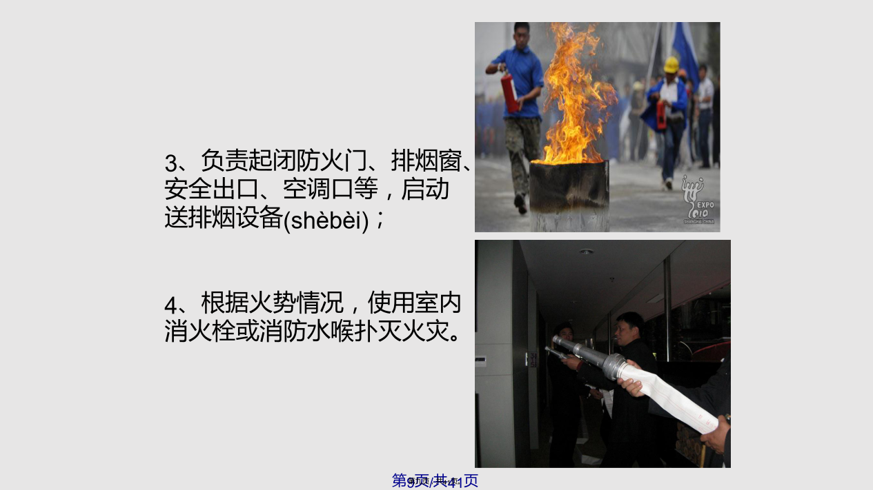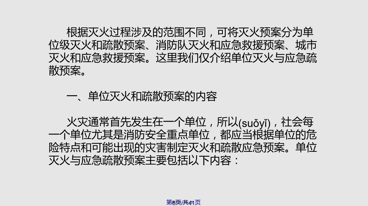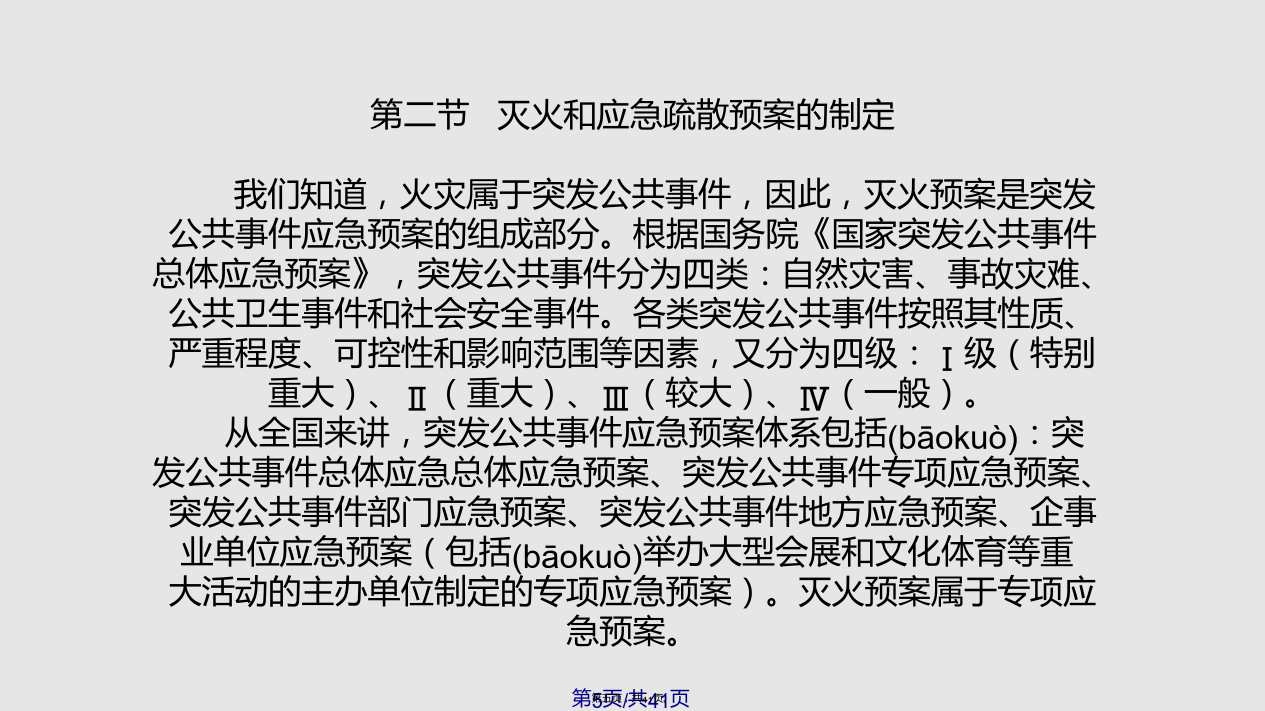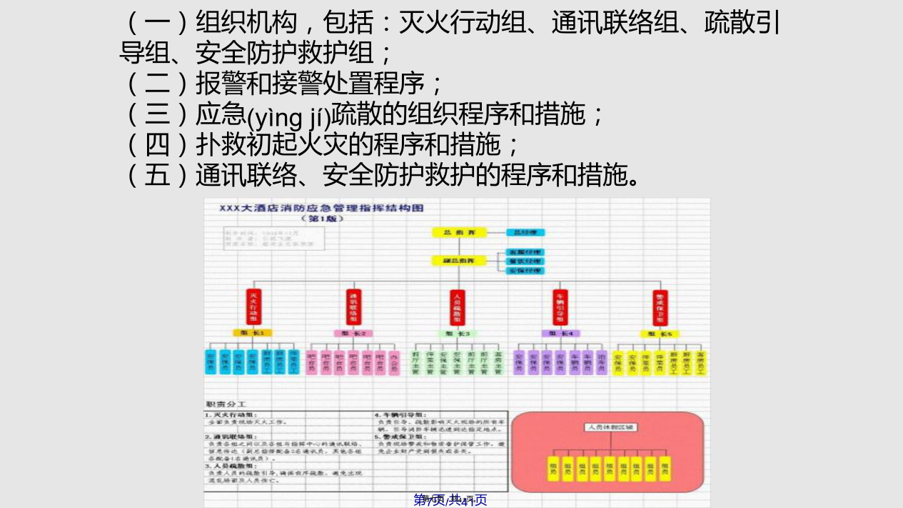 灭火(mièhuǒ)与应急疏散预案第一节灭火和应急疏散预案的意义和作用我国消防工作的方针是“预防为主、防消结合”。通常情况下,通过消防宣传、教育(jiàoyù)与培训,通过实行消防安全责任制,完善消防安全制度,通过必要的技术手段,绝大多数火灾是可以预防的。然而,要绝对杜绝火灾的发生又是不可能的,或者说是难以做到的。问题的关键不是火灾是否能杜绝,而是一旦发生火灾,能否及时有效地扑灭。这就是说,预防虽然重要,但是,不能解决所有的问题,“防”和“消”必须结合起来。灭火预案就是解决“消”这一手硬。没有灭火预案,当发生火灾时,就会束手无策。许多火灾案例表明,凡是预先制定(zhìdìng)灭火和疏散预案并实施演练的,在发生火灾时,就能有条不紊地实施灭火、疏散,就不至于发展成大火,至少不会发生群死群伤火灾;凡是预先没有制定(zhìdìng)灭火和疏散预案的,或者虽然制定(zhìdìng)了预案,但只是写在纸上,没有实施演练,在发生火灾时,人们就不知所措,小火就发展成为大火,甚至导致群死群伤的惨剧。古人云:凡事预则立,不预则废,就是这个道理。所以,只有制定(zhìdìng)灭火与应急疏散预案,才能及时扑灭火灾、疏散人员;另一方面灭火与应急疏散预案的演练本身就是提高职工消防素质的过程。第二节灭火和应急疏散预案的制定我们知道,火灾属于突发公共事件,因此,灭火预案是突发公共事件应急预案的组成部分。根据国务院《国家突发公共事件总体应急预案》,突发公共事件分为四类:自然灾害、事故灾难、公共卫生事件和社会安全事件。各类突发公共事件按照其性质、严重程度、可控性和影响范围等因素,又分为四级:Ⅰ级(特别重大)、Ⅱ(重大)、Ⅲ(较大)、Ⅳ(一般)。从全国来讲,突发公共事件应急预案体系包括(bāokuò):突发公共事件总体应急总体应急预案、突发公共事件专项应急预案、突发公共事件部门应急预案、突发公共事件地方应急预案、企事业单位应急预案(包括(bāokuò)举办大型会展和文化体育等重大活动的主办单位制定的专项应急预案)。灭火预案属于专项应急预案。根据灭火过程涉及的范围不同,可将灭火预案分为单位级灭火和疏散预案、消防队灭火和应急救援预案、城市灭火和应急救援预案。这里我们仅介绍单位灭火与应急疏散预案。一、单位灭火和疏散预案的内容火灾通常首先发生在一个单位,所以(suǒyǐ),社会每一个单位尤其是消防安全重点单位,都应当根据单位的危险特点和可能出现的灾害制定灭火和疏散应急预案。单位灭火与应急疏散预案主要包括以下内容:(一)组织机构,包括:灭火行动组、通讯联络组、疏散引导组、安全防护救护组;(二)报警和接警处置程序;(三)应急(yìngjí)疏散的组织程序和措施;(四)扑救初起火灾的程序和措施;(五)通讯联络、安全防护救护的程序和措施。其中组织机构的要求如下:灭火行动组的主要(zhǔyào)任务,是组织员工及时开启固定消防设施,充分利用单位配备的灭火器材,迅速有效地控制火灾的扩大蔓延,扑灭初起火灾。其职责:3、负责起闭防火门、排烟窗、安全出口、空调口等,启动送排烟设备(shèbèi);4、根据火势情况,使用室内消火栓或消防水喉扑灭火灾。通讯联络组的主要任务,是及时有效的发布火灾消息,将发生火灾情况及时通知有关领导,并做好现场(xiànchǎng)的通讯联络工作。其职责:3、负责通知单位值班领导及相关部门(bùmén),及时到现场组织指挥灭火救人;4、负责火灾现场的通讯联络工作。疏散引导组的主要任务,是及时有效的疏散引导在场群众,避免人员伤亡。其职责(zhízé):1、负责组织在场员工疏散引导群众安全疏散;2、负责利用现场地形地物疏散引导群众安全疏散;3、负责采取多种方法疏散引导(yǐndǎo)群众安全疏散;4、负责引导(yǐndǎo)群众采取正确方法安全疏散逃生。安全(ānquán)防护救护组的主要任务,是对火灾现场实行安全(ānquán)防护,对疏散出来的受伤群众采取救护措施。其职责:1、负责维持火灾现场秩序和确定安全(ānquán)警戒,严禁无关人员入内;2、负责对疏散出火场人员的看护,严禁再返火场;3、负责接应消防车,并引导消防车辆停靠水源;4、负责清除和疏散消防车道上的车辆和人员;5、负责及时通知120医疗急救中心,并对现场(xiànchǎng)受伤者实行医疗救护。二、制定灭火和应急疏散预案遵循的程序和要素(一)程序1、编制(biānzhì)准备,包括以下内容:(1)选择预案编制(biānzhì)人员,成立编制(biānzhì)组织;(2)制定编制(biānzhì)大纲;(3)大纲收集各种基础和技术资料;(4)进行火灾危险因素辨识和火灾风险评估;(5)对单位应对火灾的实际能力与资源