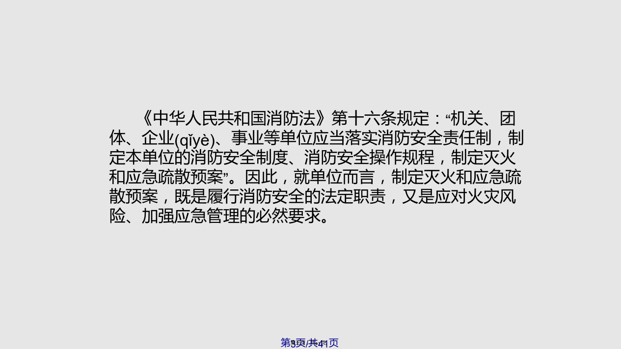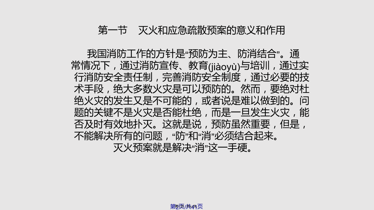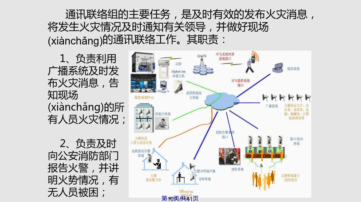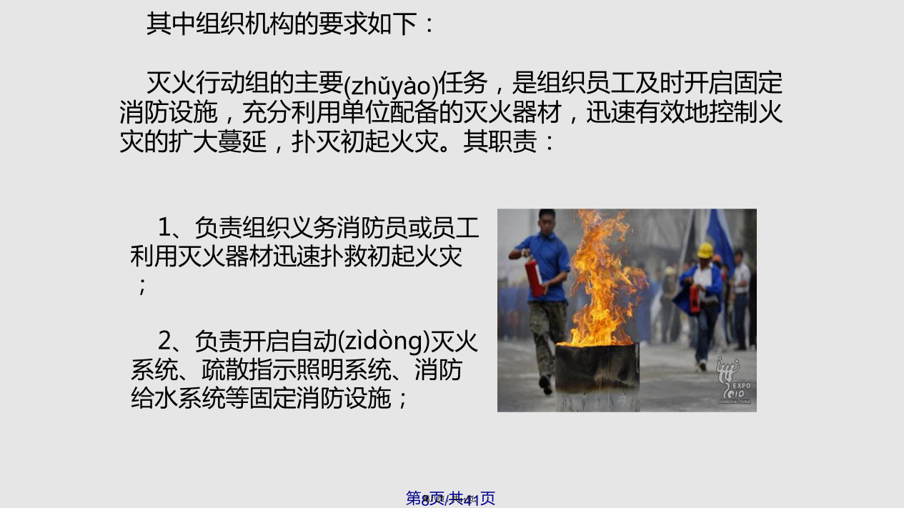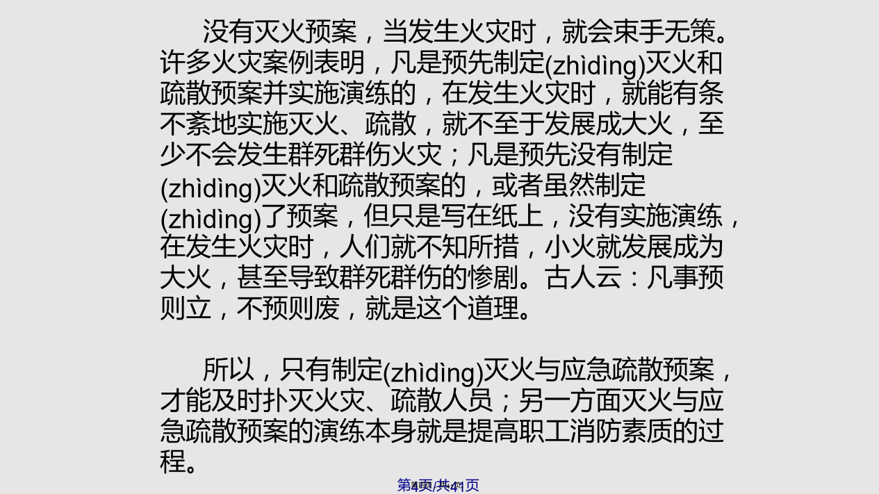 灭火(mièhuǒ)与应急疏散预案第一节灭火和应急疏散预案的意义和作用我国消防工作的方针是“预防为主、防消结合”。通常情况下,通过消防宣传、教育(jiàoyù)与培训,通过实行消防安全责任制,完善消防安全制度,通过必要的技术手段,绝大多数火灾是可以预防的。然而,要绝对杜绝火灾的发生又是不可能的,或者说是难以做到的。问题的关键不是火灾是否能杜绝,而是一旦发生火灾,能否及时有效地扑灭。这就是说,预防虽然重要,但是,不能解决所有的问题,“防”和“消”必须结合起来。灭火预案就是解决“消”这一手硬。没有灭火预案,当发生火灾时,就会束手无策。许多火灾案例表明,凡是预先制定(zhìdìng)灭火和疏散预案并实施演练的,在发生火灾时,就能有条不紊地实施灭火、疏散,就不至于发展成大火,至少不会发生群死群伤火灾;凡是预先没有制定(zhìdìng)灭火和疏散预案的,或者虽然制定(zhìdìng)了预案,但只是写在纸上,没有实施演练,在发生火灾时,人们就不知所措,小火就发展成为大火,甚至导致群死群伤的惨剧。古人云:凡事预则立,不预则废,就是这个道理。所以,只有制定(zhìdìng)灭火与应急疏散预案,才能及时扑灭火灾、疏散人员;另一方面灭火与应急疏散预案的演练本身就是提高职工消防素质的过程。第二节灭火和应急疏散预案的制定我们知道,火灾属于突发公共事件,因此,灭火预案是突发公共事件应急预案的组成部分。根据国务院《国家突发公共事件总体应急预案》,突发公共事件分为四类:自然灾害、事故灾难、公共卫生事件和社会安全事件。各类突发公共事件按照其性质、严重程度、可控性和影响范围等因素,又分为四级:Ⅰ级(特别重大)、Ⅱ(重大)、Ⅲ(较大)、Ⅳ(一般)。从全国来讲,突发公共事件应急预案体系包括(bāokuò):突发公共事件总体应急总体应急预案、突发公共事件专项应急预案、突发公共事件部门应急预案、突发公共事件地方应急预案、企事业单位应急预案(包括(bāokuò)举办大型会展和文化体育等重大活动的主办单位制定的专项应急预案)。灭火预案属于专项应急预案。根据灭火过程涉及的范围不同,可将灭火预案分为单位级灭火和疏散预案、消防队灭火和应急救援预案、城市灭火和应急救援预案。这里我们仅介绍单位灭火与应急疏散预案。一、单位灭火和疏散预案的内容火灾通常首先发生在一个单位,所以(suǒyǐ),社会每一个单位尤其是消防安全重点单位,都应当根据单位的危险特点和可能出现的灾害制定灭火和疏散应急预案。单位灭火与应急疏散预案主要包括以下内容:(一)组织机构,包括:灭火行动组、通讯联络组、疏散引导组、安全防护救护组;(二)报警和接警处置程序;(三)应急(yìngjí)疏散的组织程序和措施;(四)扑救初起火灾的程序和措施;(五)通讯联络、安全防护救护的程序和措施。其中组织机构的要求如下:灭火行动组的主要(zhǔyào)任务,是组织员工及时开启固定消防设施,充分利用单位配备的灭火器材,迅速有效地控制火灾的扩大蔓延,扑灭初起火灾。其职责:3、负责起闭防火门、排烟窗、安全出口、空调口等,启动送排烟设备(shèbèi);4、根据火势情况,使用室内消火栓或消防水喉扑灭火灾。通讯联络组的主要任务,是及时有效的发布火灾消息,将发生火灾情况及时通知有关领导,并做好现场(xiànchǎng)的通讯联络工作。其职责:3、负责通知单位值班领导及相关部门(bùmén),及时到现场组织指挥灭火救人;4、负责火灾现场的通讯联络工作。疏散引导组的主要任务,是及时有效的疏散引导在场群众,避免人员伤亡。其职责(zhízé):1、负责组织在场员工疏散引导群众安全疏散;2、负责利用现场地形地物疏散引导群众安全疏散;3、负责采取多种方法疏散引导(yǐndǎo)群众安全疏散;4、负责引导(yǐndǎo)群众采取正确方法安全疏散逃生。安全(ānquán)防护救护组的主要任务,是对火灾现场实行安全(ānquán)防护,对疏散出来的受伤群众采取救护措施。其职责:1、负责维持火灾现场秩序和确定安全(ānquán)警戒,严禁无关人员入内;2、负责对疏散出火场人员的看护,严禁再返火场;3、负责接应消防车,并引导消防车辆停靠水源;4、负责清除和疏散消防车道上的车辆和人员;5、负责及时通知120医疗急救中心,并对现场(xiànchǎng)受伤者实行医疗救护。二、制定灭火和应急疏散预案遵循的程序和要素(一)程序1、编制(biānzhì)准备,包括以下内容:(1)选择预案编制(biānzhì)人员,成立编制(biānzhì)组织;(2)制定编制(biānzhì)大纲;(3)大纲收集各种基础和技术资料;(4)进行火灾危险因素辨识和火灾风险评估;(5)对单位应对火灾的实际能力与资源