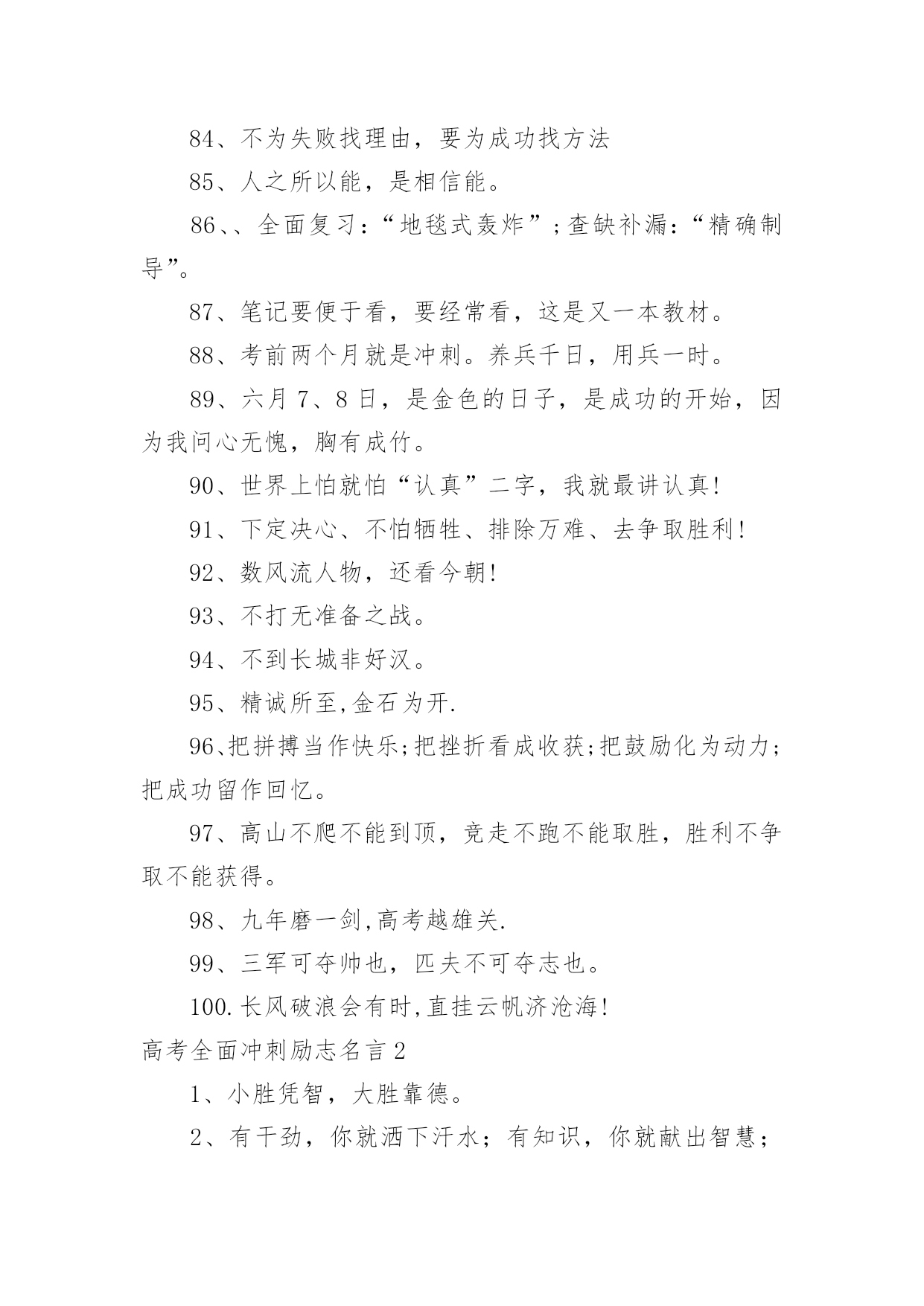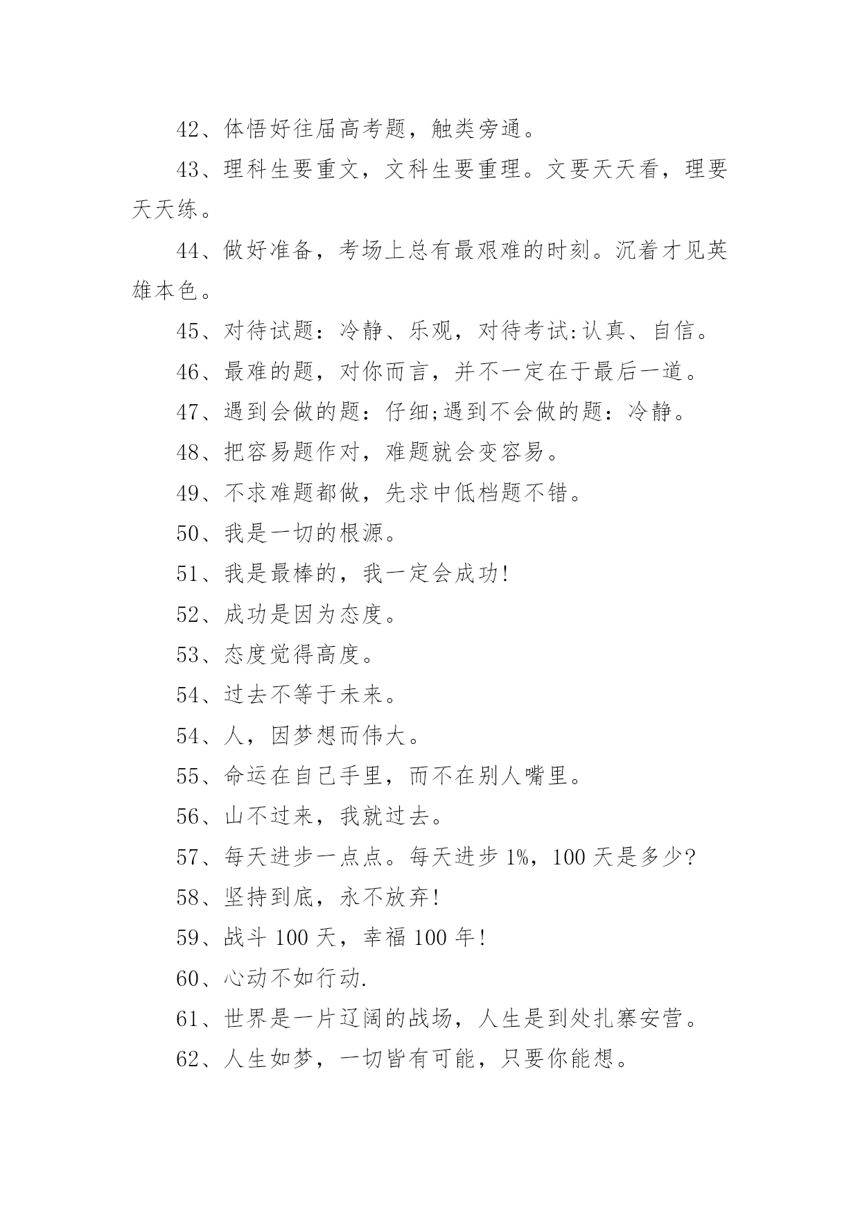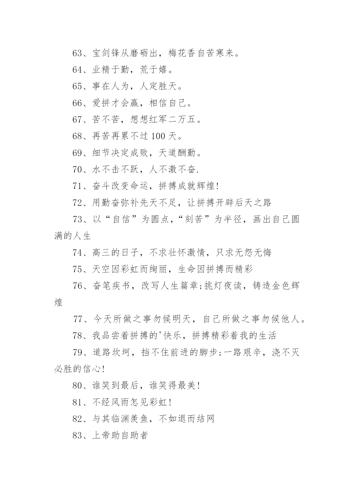 高考全面冲刺励志名言高考全面冲刺励志名言在平时的学习、工作或生活中,说到名言,大家肯定都不陌生吧,名言是人们在实践中的经验教训的提炼和总结。你还在找寻优秀经典的名言吗?下面是小编精心整理的高考全面冲刺励志名言,希望能够帮助到大家。高考全面冲刺励志名言11、高三不再有,劝君珍惜之。一年之经历,终身之财富.2、仰望天空时,什么都比你高,你会自卑;俯视大地时,什么都比你低,你会自负;只有放宽视野,把天空和大地尽收眼底,才能在苍穹泛土之间找到你真正的位置。无须自卑,不要自负,坚持自信。3、信心来自于实力,实力来自于勤奋。4、自信,是无尽智慧的凝聚。5、不问收获,但问耕耘!天道酬勤。6、善待你的爱好,别让它们为学习让路,要让它们替学习服务。7、自信是成功的先决条件。8、不计付出,坚韧不拔;不达目的,誓不罢休。9、更快、更高、更强。就是金牌。10、试试就能行,争争就能赢。11、信心是成功的一半。12、生命之中最快乐的是拼搏,生命之中最痛苦的是懒散。13、圣人与常人之间往往只相差一小步,而这一小步却往往需要非凡的毅力才能赶上。14、一分耕耘,一分收获,未必;九分耕耘,会有收获,一定!15、平日从严,高考坦然。16、永远不要以粗心为借口原谅自己。17、练习就是高考,高考就是练习。18、紧张而有序,效率是关键。19、争取时间就是争取成功,提高效率就是提高分数。20、不必每分钟都学习,但求学习中每分钟都有收获。21、超越自己,向自己挑战,向弱项挑战,向懒惰挑战,向陋习挑战。22、面对机遇,不犹豫;面对抉择,不彷徨;面对决战,不惧怕!23、不要自卑,你不比别人笨。不要自满,别人不比你笨。24、只求“少丢分”,不说“得高分”!25、每道错题做三遍。第一遍:讲评时;第二遍:一周后;第三遍:考试前。26、高考得高分的秘诀就是少丢分!27、面对高考试卷的“前120分”,志在必得,细大不捐;“后30分”多多益善,失不足惜。28、高考试卷的“前120分”若能稳拿,“后30分”定不落空。29、每天5分钟,写好5个字(用钢笔或圆珠笔)。30、身体常动,内心常静。31、学习与坐禅相似,须有一颗恒心。32、四分学识智,三心细耐恒,二成应试法,一片平常心。33、没有目标就没有方向,每一个学习阶段都应该给自己树立一个目标。34、高考中没有失败,它带给每个人的深刻思考、刻骨铭心的经历和感受都是不可多得的财富。我们为理想而奋进的过程,其意义远大于未知的结果。35、人生能有几回搏?现在不搏更待何时?珍惜机遇吧,让金色的年华碰撞出更加灿烂的火花!36、说穿了,其实提高成绩并不难,就看你是不是肯下功夫积累——多做题,多总结。37、学习是一次独立的行动,需要探索、琢磨、积极应战、顽强应战,艰辛由你独自承担,胜利由你独立争取。38、勤思则得,善问则裕,广泛交流,深入切磋。39、不经三思不求教,不动笔墨不读书。40、博学之,审问之,慎思之,明辨之,笃行之。41、计划要细,动手要早,落实要准。计划与目标、行动一致。42、体悟好往届高考题,触类旁通。43、理科生要重文,文科生要重理。文要天天看,理要天天练。44、做好准备,考场上总有最艰难的时刻。沉着才见英雄本色。45、对待试题:冷静、乐观,对待考试:认真、自信。46、最难的题,对你而言,并不一定在于最后一道。47、遇到会做的题:仔细;遇到不会做的题:冷静。48、把容易题作对,难题就会变容易。49、不求难题都做,先求中低档题不错。50、我是一切的根源。51、我是最棒的,我一定会成功!52、成功是因为态度。53、态度觉得高度。54、过去不等于未来。54、人,因梦想而伟大。55、命运在自己手里,而不在别人嘴里。56、山不过来,我就过去。57、每天进步一点点。每天进步1%,100天是多少?58、坚持到底,永不放弃!59、战斗100天,幸福100年!60、心动不如行动.61、世界是一片辽阔的战场,人生是到处扎寨安营。62、人生如梦,一切皆有可能,只要你能想。63、宝剑锋从磨砺出,梅花香自苦寒来。64、业精于勤,荒于嬉。65、事在人为,人定胜天。66、爱拼才会赢,相信自己。67、苦不苦,想想红军二万五。68、再苦再累不过100天。69、细节决定成败,天道酬勤。70、水不击不跃,人不激不奋.71、奋斗改变命运,拼搏成就辉煌!72、用勤奋弥补先天不足,让拼搏开辟后天之路73、以“自信”为圆点,“刻苦”为半径,画出自己圆满的人生74、高三的日子,不求壮怀激情,只求无怨无悔75、天空因彩虹而绚丽,生命因拼搏而精彩76、奋笔疾书,改写人生篇章;挑灯夜读,铸造金色辉煌77、今天所做之事勿候明天,自己所做之事勿候他人。78、我品尝着拼搏的'快乐,拼搏精彩着我的生活79、道路坎坷,挡不住前进的脚步;一路艰辛,浇不灭必胜的信心!80、谁笑到最后,谁笑得最美!81、不