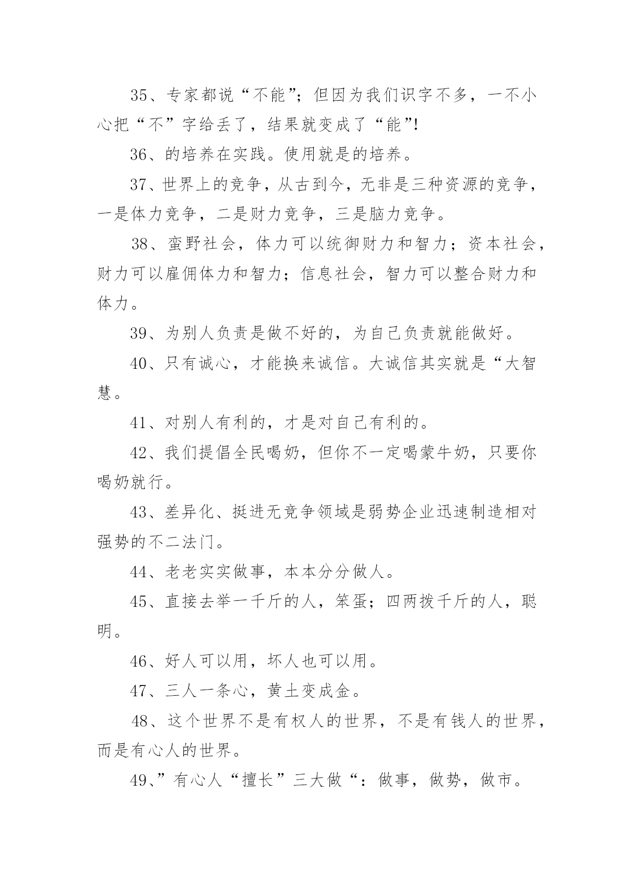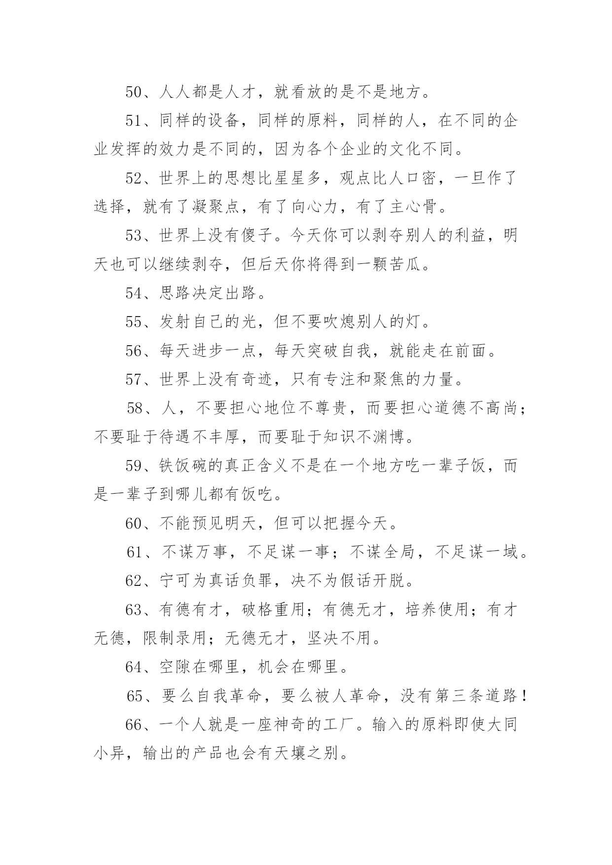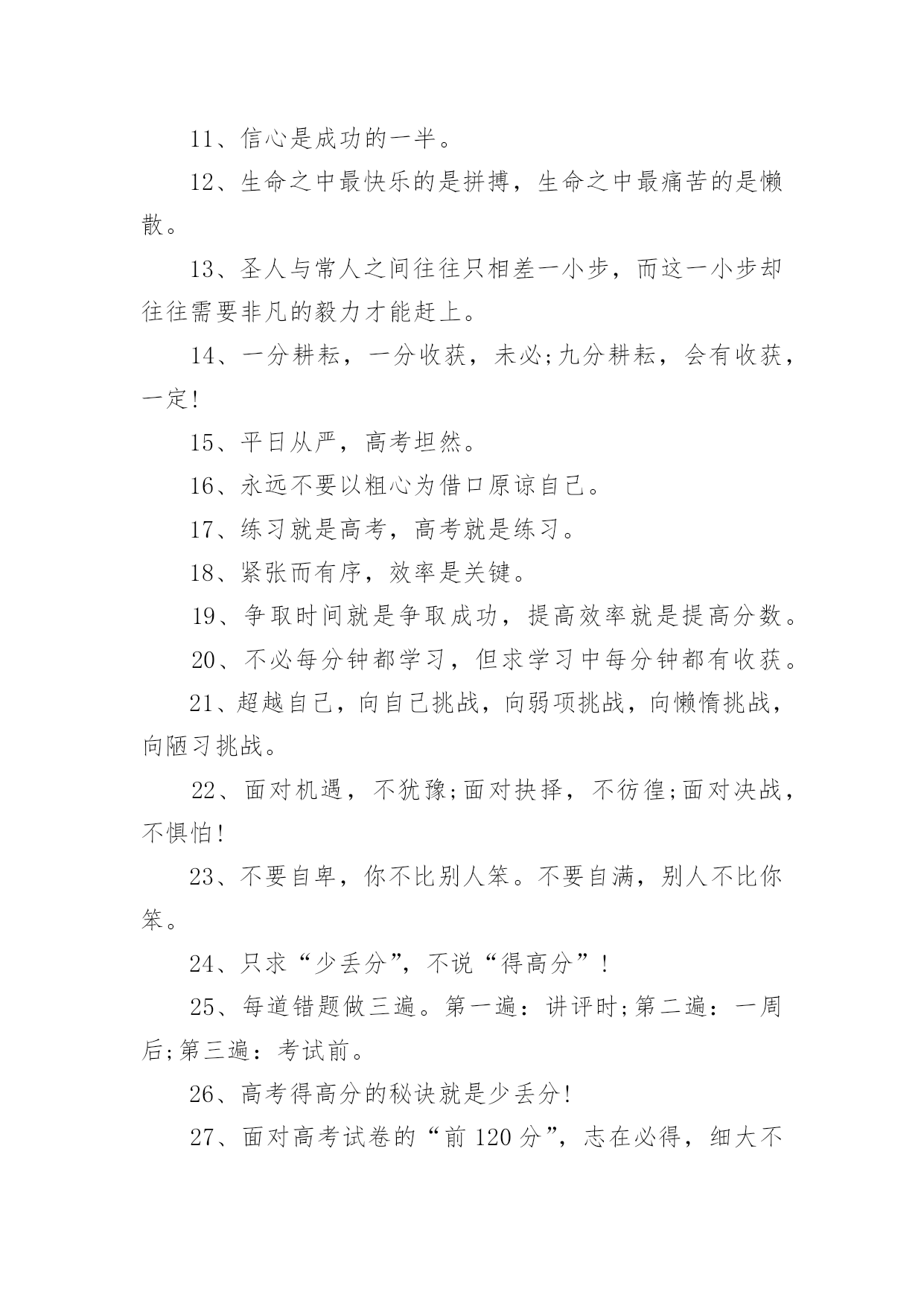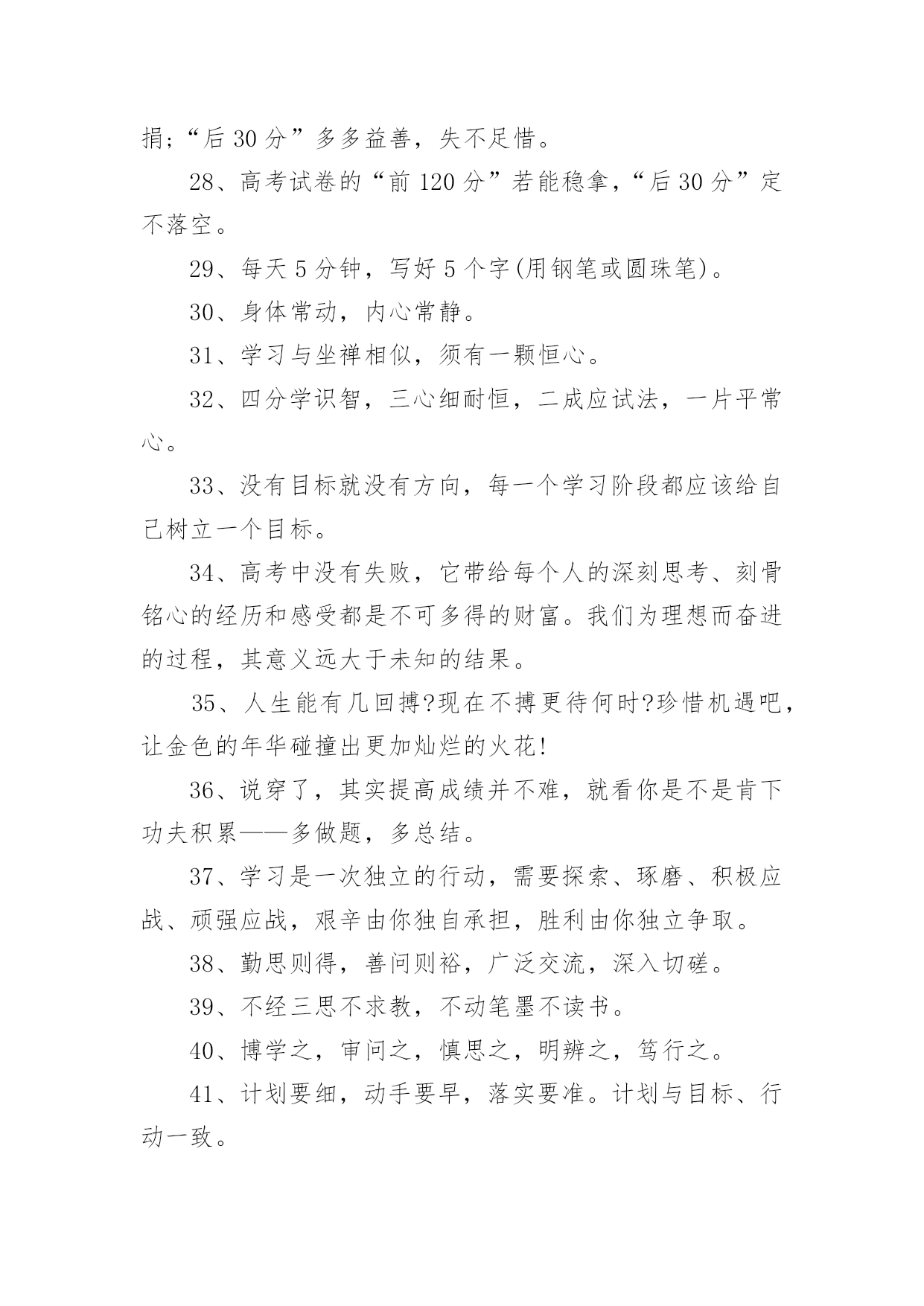 高考全面冲刺励志名言高考全面冲刺励志名言在平时的学习、工作或生活中,说到名言,大家肯定都不陌生吧,名言是人们在实践中的经验教训的提炼和总结。你还在找寻优秀经典的名言吗?下面是小编精心整理的高考全面冲刺励志名言,希望能够帮助到大家。高考全面冲刺励志名言11、高三不再有,劝君珍惜之。一年之经历,终身之财富.2、仰望天空时,什么都比你高,你会自卑;俯视大地时,什么都比你低,你会自负;只有放宽视野,把天空和大地尽收眼底,才能在苍穹泛土之间找到你真正的位置。无须自卑,不要自负,坚持自信。3、信心来自于实力,实力来自于勤奋。4、自信,是无尽智慧的凝聚。5、不问收获,但问耕耘!天道酬勤。6、善待你的爱好,别让它们为学习让路,要让它们替学习服务。7、自信是成功的先决条件。8、不计付出,坚韧不拔;不达目的,誓不罢休。9、更快、更高、更强。就是金牌。10、试试就能行,争争就能赢。11、信心是成功的一半。12、生命之中最快乐的是拼搏,生命之中最痛苦的是懒散。13、圣人与常人之间往往只相差一小步,而这一小步却往往需要非凡的毅力才能赶上。14、一分耕耘,一分收获,未必;九分耕耘,会有收获,一定!15、平日从严,高考坦然。16、永远不要以粗心为借口原谅自己。17、练习就是高考,高考就是练习。18、紧张而有序,效率是关键。19、争取时间就是争取成功,提高效率就是提高分数。20、不必每分钟都学习,但求学习中每分钟都有收获。21、超越自己,向自己挑战,向弱项挑战,向懒惰挑战,向陋习挑战。22、面对机遇,不犹豫;面对抉择,不彷徨;面对决战,不惧怕!23、不要自卑,你不比别人笨。不要自满,别人不比你笨。24、只求“少丢分”,不说“得高分”!25、每道错题做三遍。第一遍:讲评时;第二遍:一周后;第三遍:考试前。26、高考得高分的秘诀就是少丢分!27、面对高考试卷的“前120分”,志在必得,细大不捐;“后30分”多多益善,失不足惜。28、高考试卷的“前120分”若能稳拿,“后30分”定不落空。29、每天5分钟,写好5个字(用钢笔或圆珠笔)。30、身体常动,内心常静。31、学习与坐禅相似,须有一颗恒心。32、四分学识智,三心细耐恒,二成应试法,一片平常心。33、没有目标就没有方向,每一个学习阶段都应该给自己树立一个目标。34、高考中没有失败,它带给每个人的深刻思考、刻骨铭心的经历和感受都是不可多得的财富。我们为理想而奋进的过程,其意义远大于未知的结果。35、人生能有几回搏?现在不搏更待何时?珍惜机遇吧,让金色的年华碰撞出更加灿烂的火花!36、说穿了,其实提高成绩并不难,就看你是不是肯下功夫积累——多做题,多总结。37、学习是一次独立的行动,需要探索、琢磨、积极应战、顽强应战,艰辛由你独自承担,胜利由你独立争取。38、勤思则得,善问则裕,广泛交流,深入切磋。39、不经三思不求教,不动笔墨不读书。40、博学之,审问之,慎思之,明辨之,笃行之。41、计划要细,动手要早,落实要准。计划与目标、行动一致。42、体悟好往届高考题,触类旁通。43、理科生要重文,文科生要重理。文要天天看,理要天天练。44、做好准备,考场上总有最艰难的时刻。沉着才见英雄本色。45、对待试题:冷静、乐观,对待考试:认真、自信。46、最难的题,对你而言,并不一定在于最后一道。47、遇到会做的题:仔细;遇到不会做的题:冷静。48、把容易题作对,难题就会变容易。49、不求难题都做,先求中低档题不错。50、我是一切的根源。51、我是最棒的,我一定会成功!52、成功是因为态度。53、态度觉得高度。54、过去不等于未来。54、人,因梦想而伟大。55、命运在自己手里,而不在别人嘴里。56、山不过来,我就过去。57、每天进步一点点。每天进步1%,100天是多少?58、坚持到底,永不放弃!59、战斗100天,幸福100年!60、心动不如行动.61、世界是一片辽阔的战场,人生是到处扎寨安营。62、人生如梦,一切皆有可能,只要你能想。63、宝剑锋从磨砺出,梅花香自苦寒来。64、业精于勤,荒于嬉。65、事在人为,人定胜天。66、爱拼才会赢,相信自己。67、苦不苦,想想红军二万五。68、再苦再累不过100天。69、细节决定成败,天道酬勤。70、水不击不跃,人不激不奋.71、奋斗改变命运,拼搏成就辉煌!72、用勤奋弥补先天不足,让拼搏开辟后天之路73、以“自信”为圆点,“刻苦”为半径,画出自己圆满的人生74、高三的日子,不求壮怀激情,只求无怨无悔75、天空因彩虹而绚丽,生命因拼搏而精彩76、奋笔疾书,改写人生篇章;挑灯夜读,铸造金色辉煌77、今天所做之事勿候明天,自己所做之事勿候他人。78、我品尝着拼搏的'快乐,拼搏精彩着我的生活79、道路坎坷,挡不住前进的脚步;一路艰辛,浇不灭必胜的信心!80、谁笑到最后,谁笑得最美!81、不