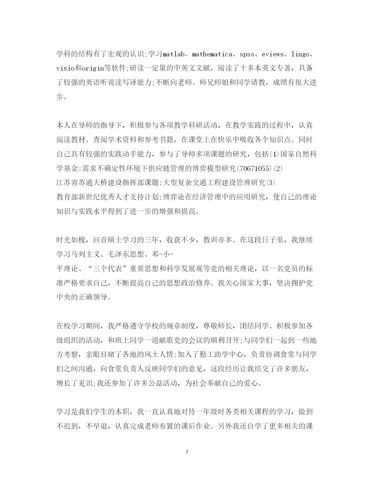 此资料由网络收集而来,如有侵权请告知上传者立即删除。资料共分享,我们负责传递知识。PAGEPAGE4关于毕业研究生自我鉴定研究生毕业是终点,也是起点。未来在工作中我将继续保持勤恳敬业的作风,努力做好自己的本职工作,为母校增添彩,为社会做出更多贡献。下面是整理的关于2019年毕业研究生自我鉴定范文,欢迎阅读!2019年毕业研究生自我鉴定本人在硕士研究生学习阶段,作为一名中共党员,思想积极上进,热爱祖国,热爱人民,拥护中国共产党的领导,拥护党的各项方针政策,认真学习党的政策路线,遵守法律法规,严于律己,戒骄戒躁。在专业课程的学习上,根据专业研究方向的要求,有针对性的认真学习专业课程,广泛阅读专业书籍和文献,为自己的科研工作打下扎实基础,在导师的指导下,积极参与科研项目实践,使自己的理论知识与实践水平得到了进一步的增强和提高,顺利完成了硕士毕业论文。在平时生活中,为人诚实,待人和善,乐于助人,和同学关系融洽,积极参加了各项集体活动,在担任学院研究生会体育部部长期间,团结同学,乐于为大家服务,成功组织了多项大型活动,深得老师和同学的好评。本人在研究生阶段所获颇丰,无论学业、科研工作,还是个人素质,都得到了很大提高和进步。相信这些学习和实践经历都将成为本人人生道路上的宝贵财富。在以后的工作和学习中,本人将继续保持并发扬严谨治学的作风,兢兢业业,不断实现自我的人生价值和追求目标。班组鉴定:该同学在硕士研究生学习阶段,思想进步,主动学习党中央的政策路线,时刻关注国际、国内要闻,积极向上,始终严格要求自己,不断自我提高。在学习上,该同学能按照专业研究方向的要求,系统地掌握专业知识,认真而广泛地研读相关专业书籍和文献,积极参加项目实践,具有较强的科学研究能力和创新能力,顺利地完成了硕士毕业论文。在生活中,该同学为人诚实友善,乐于助人,和同学关系融洽,并积极参加各项集体活动,作为学院研究生会的体育部部长,该同学成功组织了多项大型活动,具备较强的组织协作能力。希望在以后的工作和学习中,继续发扬优良作风,勤勤恳恳,争取取得更大的成绩。2019年毕业研究生自我鉴定本人在硕士研究生学习阶段,思想上要求上进,认真学习,努力钻研专业知识,毕业之际,回顾近三年来的学习、工作以及生活,做自我鉴定如下:思想觉悟上,本人始终对自己有较高的要求,主动和党组织靠拢。自入党以来,我以一名优秀党员的标准严格要求自己,努力学习党的会议精神,在思想上积极要求进步,树立了良好的人生观、价值观和道德观。曾作为罗佳、裴清华、陈磊、孙秀玉和范致镇同学的入党介绍人,介绍其入党。在汶川地震中捐款50元。能用科学发展观来认识世界、认识社会,能清醒的意识到自己所担负的社会责任,对个人的人生理想和发展目标,有了相对成熟的认识和定位。专业课程的学习上,本人根据自身研究方向的要求,有针对性的认真学习了有关课程,为自己的科研工作打下扎实基础;并涉猎了一部分其他课程,开阔视野,不断完善知识结构,选修控制科学与工程系的《工程矩阵论》、数学系的《数值代数》和信息管理系的《知识管理》等课程,对本人研究方向的应用背景以及整个学科的结构有了宏观的认识;学习matlab、mathematica、spss、eviews、lingo、visio和origin等软件;研读一定量的中英文文献,阅读了十多本英文专著,具备了较强的英语听说读写译能力;不断向老师、师兄师姐和同学请教,成绩有很大进步。本人在导师的指导下,积极参与各项教学科研活动,在教学实践的过程中,认真阅读教材、查阅学术资料和参考书籍,在课堂上在快乐中吸收各个知识点。同时自己具有较强的实践动手能力,参与了导师多项课题的研究,包括(1)国家自然科学基金:需求不确定性环境下供应链管理的博弈模型研究(70671055)(2)江苏省苏通大桥建设指挥部课题:大型复杂交通工程建设管理研究(3)教育部新世纪优秀人才支持计划:博弈论在经济管理中的应用研究,使自己的理论知识与实践水平得到了进一步的增强和提高。时光如梭,回首硕士学习的三年,收获不少,教训亦多。在这段日子里,我继续学习马列主义、毛泽东思想、邓-小-平理论、“三个代表”重要思想和科学发展观等党的相关理论,以一名党员的标准严格要求自己,不断提高自己的思想政治修养。我关心国家大事,坚决拥护党中央的正确领导。在校学习期间,我严格遵守学校的规章制度,尊敬师长,团结同学。积极参加各级组织的活动,和班上同学一道献歌党的会议的顺利召开;与同学们一起到一些地方考察,亲眼目睹了各地的风土人情;加入了勤工助学中心,负责协调食堂与同学们之间沟通,向食堂负责人反映同学们的意见,这段经历让我结交了许多朋友,增长了见识;我还参加了许多公益活动,为社会奉献自己的爱心。学习是我们学生的本职,我一