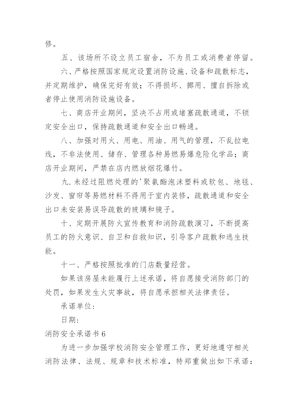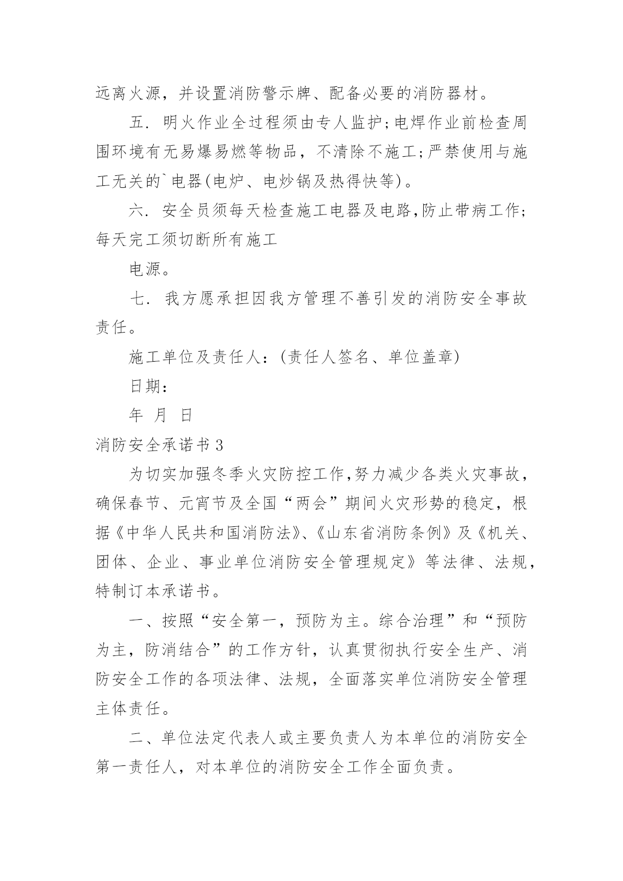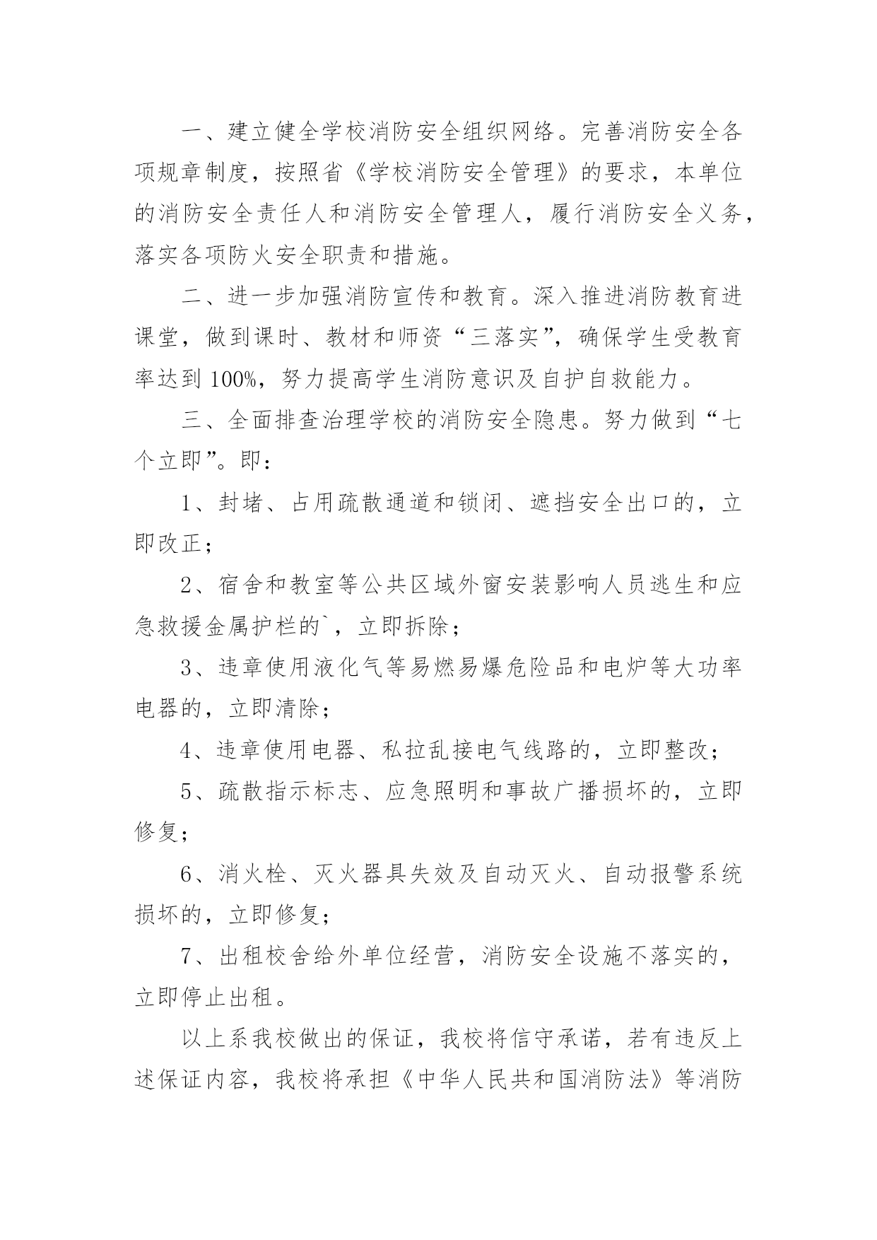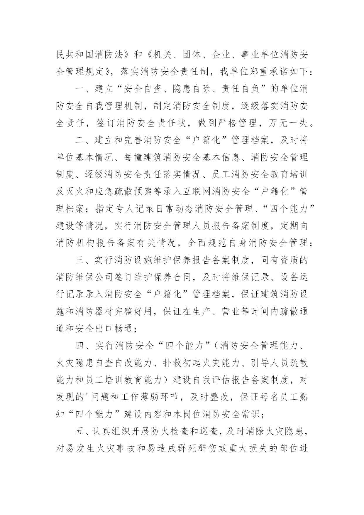 消防安全承诺书消防安全承诺书(合集15篇)在快速变化和不断变革的新时代,我们都跟承诺书有着直接或间接的联系,承诺书必须由受要约人作出,只有受要约人才能取得承诺的权利,受要约人以外的第三人不享有承诺的权利。你写承诺书时总是没有文字可写?以下是小编为大家整理的消防安全承诺书,欢迎大家借鉴与参考,希望对大家有所帮助。消防安全承诺书1为了确保消防安全,严防火灾事故,本人作出以下承诺:一、必须自觉遵守公司制定的安全规章制度和安全操作规程,树立“安全在我心中”增强自我保护的防火安全知识,切实做到不违章、不蛮干、不违反防火安全制度,有权拒绝违章作业的'指令,见到他人违章,应予以制止。二、进入厂区,决不吸烟,禁火区域内动用明火作业时,严格执行动火审批制度。三、努力学习消防安全、生产安全知识,掌握使用各类灭火器材的操作本领,提高灭火技能。四、工作前应对本人操作设备,防火安全装置,生产工具等都进行一次检查,生产中应集中思想,精心操作,决不擅自离开工作岗位,决不在工作中打瞌睡等违反劳动纪律行为。五、工作时应按规定正确使用个人劳动防护用品,决不穿拖鞋或易滑跌的鞋子上岗,更不会赤膊、赤脚上岗,一定做到文明上岗。六、认真做好交接班制度,必须把生产记录和安全生产情况,以及消防设备交接清楚,下班前应清理好现场,搞好环境卫生,做好文明生产。班组负责人:xxxx年xx月xx日承诺人:xxxx年xx月xx日消防安全承诺书2XX大学:消防安全工作事关人员生命和财产安全,为严格执行《消防法》,确保学校项目施工期间消防安全管理工作落实到位、责任到人,保证消防安全,我方特此承诺如下:一.我方项目经理为本项目施工期间(施工现场范围)的消防安全管理第一责任人,为消防专职安全员。二.我方施工进场前先到学校保卫处或物管部门办理审批备案手续,涉及明火作业及电焊工艺提前申报,施工期间服从校方或物管部门对消防安全管理和监督。三.我方负责施工人员进入施工现场前进行消防安全交底,并自觉保护施工现场已有的消防设施。四.加强对施工现场易燃易爆材料的管理,妥善保管,远离火源,并设置消防警示牌、配备必要的消防器材。五.明火作业全过程须由专人监护;电焊作业前检查周围环境有无易爆易燃等物品,不清除不施工;严禁使用与施工无关的`电器(电炉、电炒锅及热得快等)。六.安全员须每天检查施工电器及电路,防止带病工作;每天完工须切断所有施工电源。七.我方愿承担因我方管理不善引发的消防安全事故责任。施工单位及责任人:(责任人签名、单位盖章)日期:年月日消防安全承诺书3为切实加强冬季火灾防控工作,努力减少各类火灾事故,确保春节、元宵节及全国“两会”期间火灾形势的稳定,根据《中华人民共和国消防法》、《山东省消防条例》及《机关、团体、企业、事业单位消防安全管理规定》等法律、法规,特制订本承诺书。一、按照“安全第一,预防为主。综合治理”和“预防为主,防消结合”的工作方针,认真贯彻执行安全生产、消防安全工作的各项法律、法规,全面落实单位消防安全管理主体责任。二、单位法定代表人或主要负责人为本单位的消防安全第一责任人,对本单位的消防安全工作全面负责。三、按照“实名制”要求明确各级、各岗位人员,逐级落实消防安全责任制和岗位消防安全责任制,明确消防安全责任。四、公共聚集场所营业时每两小时、其他单位每日组织人员进行防火巡查,每周开展消防安全全面检查,并做好相关记录。五、营业期间坚决不占用、堵塞疏散通道,不锁闭安全出口,保持疏散通道、安全出口畅通。六、制定并熟练掌握灭火和应急疏散预案,定期组织演练。七、定期开展员工消防知识培训,安保人员应掌握防火和灭火的基本技能。消防控制室值班员和消防设施操作维护人员应经过专业培训并持证上岗。八.严格按照国家规定设置消防设施、器材和疏散指示标志,并经常维护保养,确保完好有效;不损坏和擅自挪用、拆除、停用消防设施及器材。九、明确消防设施管理责任,按要求签订消防设施、设备维保合同,定期进行维护保养。对发现的设施、设备故障要提供资金保障,确保设施、设备完好有效。十、员工宿舍及其他居住场所的设置必须符合消防法律、法规规定。十一、落实“六个一”工作要求。即:开展一次消防安全评估、与单位员工签订一份消防安全承诺书、维护保养一次消防设施、全面检测一次电气和燃气线路设施、全民清洗一次油烟道、集中组织一次全员培训演练。十二、加强用火、用电、用油、用气的.管理,不乱拉乱接电线,严格按照要求使用、储存、经营各种易燃易爆的危险化学品;营业期间坚决禁止在场所内燃放烟花、爆竹。十三、严格落实火灾应急处置机制,提高应急处突能力;加强消防安全“四个能力”建设,营造良好的消防安全环境。十四、保证消防控制室24小时双人持证上岗,上岗人员能熟练掌握自动消防设施操作规程和火警处置流程。十五、确保疏散通道、安全出口畅通,严禁占用、堵塞、封