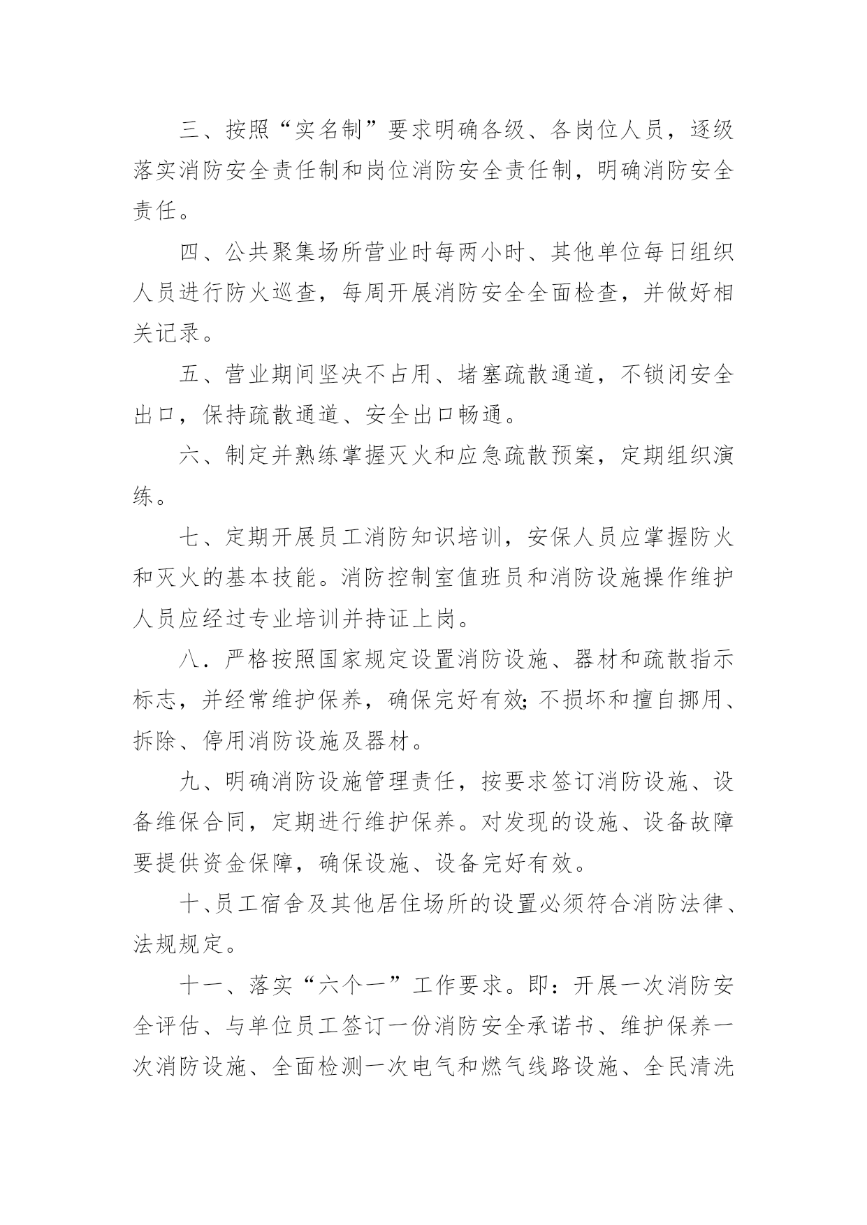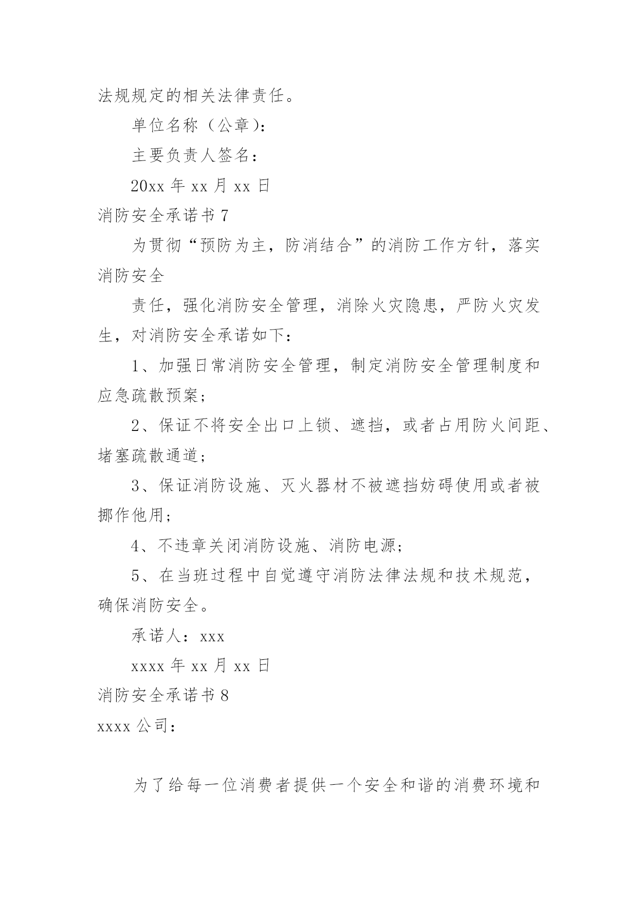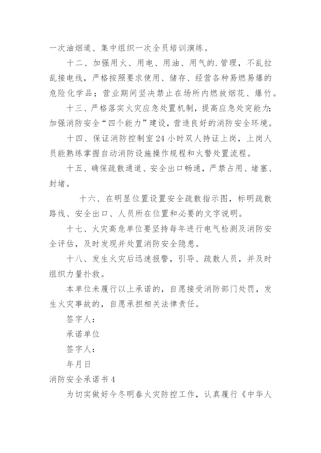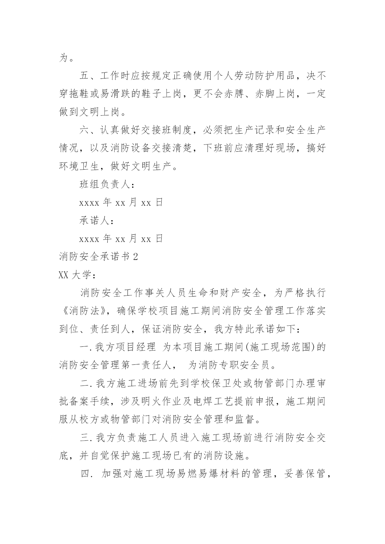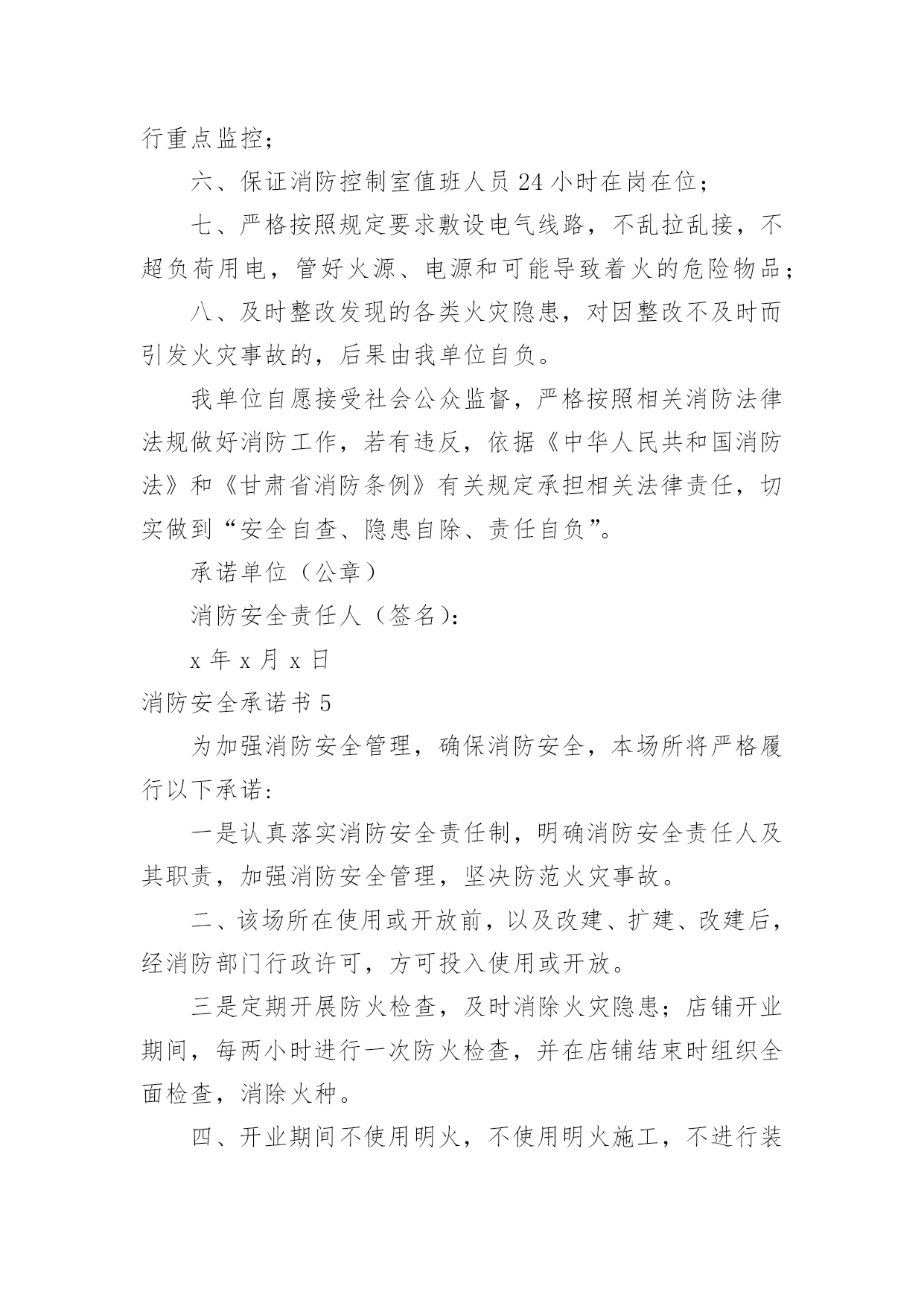 消防安全承诺书消防安全承诺书(合集15篇)在快速变化和不断变革的新时代,我们都跟承诺书有着直接或间接的联系,承诺书必须由受要约人作出,只有受要约人才能取得承诺的权利,受要约人以外的第三人不享有承诺的权利。你写承诺书时总是没有文字可写?以下是小编为大家整理的消防安全承诺书,欢迎大家借鉴与参考,希望对大家有所帮助。消防安全承诺书1为了确保消防安全,严防火灾事故,本人作出以下承诺:一、必须自觉遵守公司制定的安全规章制度和安全操作规程,树立“安全在我心中”增强自我保护的防火安全知识,切实做到不违章、不蛮干、不违反防火安全制度,有权拒绝违章作业的'指令,见到他人违章,应予以制止。二、进入厂区,决不吸烟,禁火区域内动用明火作业时,严格执行动火审批制度。三、努力学习消防安全、生产安全知识,掌握使用各类灭火器材的操作本领,提高灭火技能。四、工作前应对本人操作设备,防火安全装置,生产工具等都进行一次检查,生产中应集中思想,精心操作,决不擅自离开工作岗位,决不在工作中打瞌睡等违反劳动纪律行为。五、工作时应按规定正确使用个人劳动防护用品,决不穿拖鞋或易滑跌的鞋子上岗,更不会赤膊、赤脚上岗,一定做到文明上岗。六、认真做好交接班制度,必须把生产记录和安全生产情况,以及消防设备交接清楚,下班前应清理好现场,搞好环境卫生,做好文明生产。班组负责人:xxxx年xx月xx日承诺人:xxxx年xx月xx日消防安全承诺书2XX大学:消防安全工作事关人员生命和财产安全,为严格执行《消防法》,确保学校项目施工期间消防安全管理工作落实到位、责任到人,保证消防安全,我方特此承诺如下:一.我方项目经理为本项目施工期间(施工现场范围)的消防安全管理第一责任人,为消防专职安全员。二.我方施工进场前先到学校保卫处或物管部门办理审批备案手续,涉及明火作业及电焊工艺提前申报,施工期间服从校方或物管部门对消防安全管理和监督。三.我方负责施工人员进入施工现场前进行消防安全交底,并自觉保护施工现场已有的消防设施。四.加强对施工现场易燃易爆材料的管理,妥善保管,远离火源,并设置消防警示牌、配备必要的消防器材。五.明火作业全过程须由专人监护;电焊作业前检查周围环境有无易爆易燃等物品,不清除不施工;严禁使用与施工无关的`电器(电炉、电炒锅及热得快等)。六.安全员须每天检查施工电器及电路,防止带病工作;每天完工须切断所有施工电源。七.我方愿承担因我方管理不善引发的消防安全事故责任。施工单位及责任人:(责任人签名、单位盖章)日期:年月日消防安全承诺书3为切实加强冬季火灾防控工作,努力减少各类火灾事故,确保春节、元宵节及全国“两会”期间火灾形势的稳定,根据《中华人民共和国消防法》、《山东省消防条例》及《机关、团体、企业、事业单位消防安全管理规定》等法律、法规,特制订本承诺书。一、按照“安全第一,预防为主。综合治理”和“预防为主,防消结合”的工作方针,认真贯彻执行安全生产、消防安全工作的各项法律、法规,全面落实单位消防安全管理主体责任。二、单位法定代表人或主要负责人为本单位的消防安全第一责任人,对本单位的消防安全工作全面负责。三、按照“实名制”要求明确各级、各岗位人员,逐级落实消防安全责任制和岗位消防安全责任制,明确消防安全责任。四、公共聚集场所营业时每两小时、其他单位每日组织人员进行防火巡查,每周开展消防安全全面检查,并做好相关记录。五、营业期间坚决不占用、堵塞疏散通道,不锁闭安全出口,保持疏散通道、安全出口畅通。六、制定并熟练掌握灭火和应急疏散预案,定期组织演练。七、定期开展员工消防知识培训,安保人员应掌握防火和灭火的基本技能。消防控制室值班员和消防设施操作维护人员应经过专业培训并持证上岗。八.严格按照国家规定设置消防设施、器材和疏散指示标志,并经常维护保养,确保完好有效;不损坏和擅自挪用、拆除、停用消防设施及器材。九、明确消防设施管理责任,按要求签订消防设施、设备维保合同,定期进行维护保养。对发现的设施、设备故障要提供资金保障,确保设施、设备完好有效。十、员工宿舍及其他居住场所的设置必须符合消防法律、法规规定。十一、落实“六个一”工作要求。即:开展一次消防安全评估、与单位员工签订一份消防安全承诺书、维护保养一次消防设施、全面检测一次电气和燃气线路设施、全民清洗一次油烟道、集中组织一次全员培训演练。十二、加强用火、用电、用油、用气的.管理,不乱拉乱接电线,严格按照要求使用、储存、经营各种易燃易爆的危险化学品;营业期间坚决禁止在场所内燃放烟花、爆竹。十三、严格落实火灾应急处置机制,提高应急处突能力;加强消防安全“四个能力”建设,营造良好的消防安全环境。十四、保证消防控制室24小时双人持证上岗,上岗人员能熟练掌握自动消防设施操作规程和火警处置流程。十五、确保疏散通道、安全出口畅通,严禁占用、堵塞、封