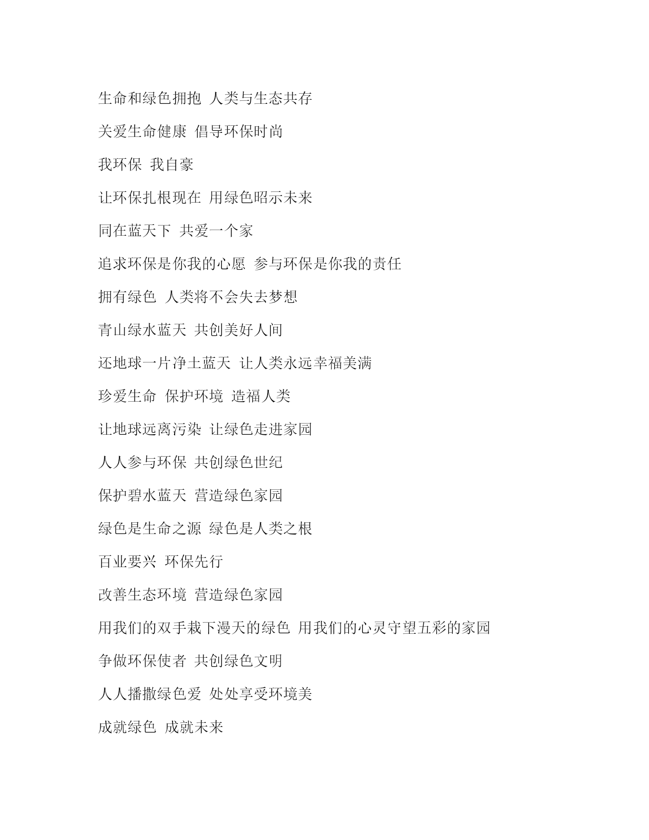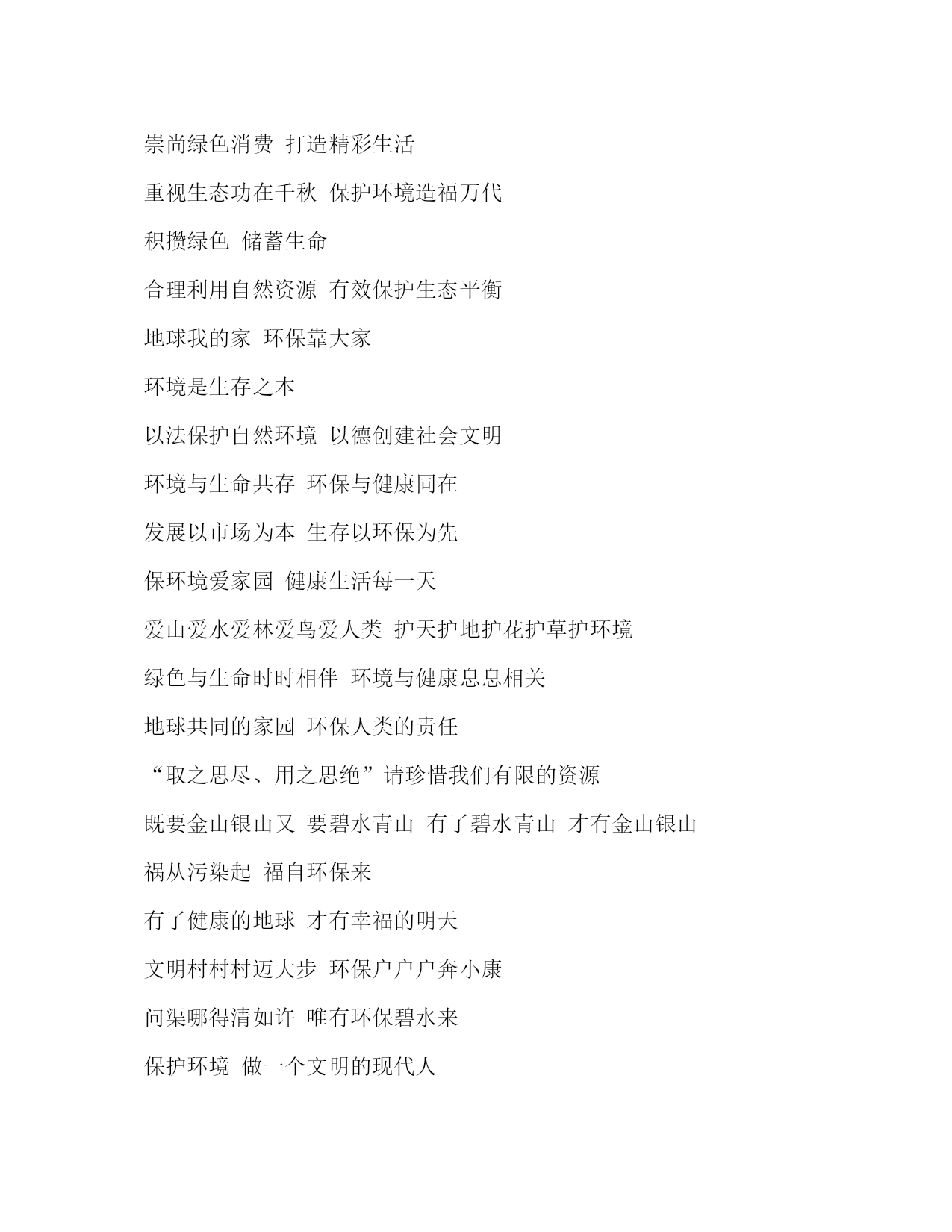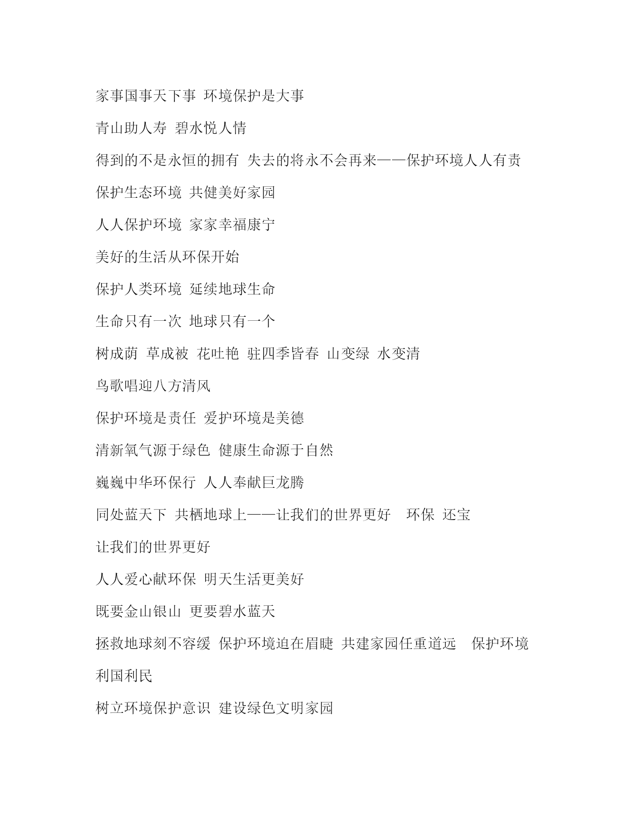 PAGE此资料由网络收集而来,如有侵权请告知上传者立即删除。资料共分享,我们负责传递知识。环保的标语大全篇一:环保的标语大全环保的标语大全1、环境保护,人人有责。5、保护蓝天碧水。8、保护环境是每一位公民应尽的责任。9、环境保护从我做起。10、保护环境,造福人类。11、保护环境就是保护我们自己。12、破坏环境,就是破坏我们赖以生存的家园。13、土壤不能再生,防止土壤污染和沙化,减少水土流失。14、环境与人类共存,资源开发与环境保护协调。15、保护水环境,节约水资源。17、树立大环境意识,保护生态环境。5.地球资源有限,尽量不用一次性消耗品7.垃圾是放错位置的资源11.提布袋购物是一种时尚12.多乘公交车,少用私家车13.请选用无磷洗衣粉18.选用无氟制品,保护臭氧层19.酸雨是地球万物的共同敌人23.种树种草,有利环保口号:人人齐参与,创建绿色家园!口号:环境与人共存,开发与保护同步!口号:保护地球,保护环境!口号:我们拒绝使用一次性筷子!口号:让我们拥有美好的明天,世界从此没有污染!保护环境功在当代利在千秋追求绿色时尚拥抱绿色生活同建绿色温馨家园共享清澈碧水蓝天风调雨顺始自环境保护人寿年丰源于生态平衡积德行善造福后代百年大计环保第一我爱花我爱草我爱青青小树苗不摘花不踏草不折树枝不乱摇花草树木是朋友大家都要爱护好治理环境污染重现丽日蓝天爱青山绿水爱蓝天白云让生命在爱中每时每刻充满活力当环保卫士做时代公民保护生态环境造就秀美山川人类靠环境生存环境靠人类保护生命和绿色拥抱人类与生态共存关爱生命健康倡导环保时尚我环保我自豪让环保扎根现在用绿色昭示未来同在蓝天下共爱一个家追求环保是你我的心愿参与环保是你我的责任拥有绿色人类将不会失去梦想青山绿水蓝天共创美好人间还地球一片净土蓝天让人类永远幸福美满珍爱生命保护环境造福人类让地球远离污染让绿色走进家园人人参与环保共创绿色世纪保护碧水蓝天营造绿色家园绿色是生命之源绿色是人类之根百业要兴环保先行改善生态环境营造绿色家园用我们的双手栽下漫天的绿色用我们的心灵守望五彩的家园争做环保使者共创绿色文明人人播撒绿色爱处处享受环境美成就绿色成就未来崇尚绿色消费打造精彩生活重视生态功在千秋保护环境造福万代积攒绿色储蓄生命合理利用自然资源有效保护生态平衡地球我的家环保靠大家环境是生存之本以法保护自然环境以德创建社会文明环境与生命共存环保与健康同在发展以市场为本生存以环保为先保环境爱家园健康生活每一天爱山爱水爱林爱鸟爱人类护天护地护花护草护环境绿色与生命时时相伴环境与健康息息相关地球共同的家园环保人类的责任“取之思尽、用之思绝”请珍惜我们有限的资源既要金山银山又要碧水青山有了碧水青山才有金山银山祸从污染起福自环保来有了健康的地球才有幸福的明天文明村村村迈大步环保户户户奔小康问渠哪得清如许唯有环保碧水来保护环境做一个文明的现代人家事国事天下事环境保护是大事青山助人寿碧水悦人情得到的不是永恒的拥有失去的将永不会再来——保护环境人人有责保护生态环境共健美好家园人人保护环境家家幸福康宁美好的生活从环保开始保护人类环境延续地球生命生命只有一次地球只有一个树成荫草成被花吐艳驻四季皆春山变绿水变清鸟歌唱迎八方清风保护环境是责任爱护环境是美德清新氧气源于绿色健康生命源于自然巍巍中华环保行人人奉献巨龙腾同处蓝天下共栖地球上——让我们的世界更好环保还宝让我们的世界更好人人爱心献环保明天生活更美好既要金山银山更要碧水蓝天拯救地球刻不容缓保护环境迫在眉睫共建家园任重道远保护环境利国利民树立环境保护意识建设绿色文明家园保护人类生态环境倡导全球绿色文明地球我的家环境靠大家处处鸟语花香生活充满阳光大力增强环保意识提高全民环保素质还天地之本原传人类之文明环境保护人人有责开发与环保同步生产与治污并举篇二:环保宣传标语口号环境保护宣传标语口号建绿色海东,创和谐家园节约资源,保护环境节约资源,从我做起环境保护,规划先行加强环境监管,保障环境安全促进全员参与,共建绿色武广线实施环保规划,依法保护环境弘扬环境文化,建设绿色文明保护森林关爱绿色请关爱我们的家园爱我绿色家园保护生态环境保护环境人人有责保护环境造福子孙保护环境防止水土流失保护生物多样性请爱护我我给你带来一片绿茵青春生命大家关爱保护生态造福人类保护生态平衡爱护我们家园保护一山一水珍惜一草一木保护生态环境走可持续发展的道路改善环境造福人类环境与人类共存,开发与保护同步;贯彻环境教育,宣导环保资讯;生产绿色产品,节约地球资源;落实环保责任,