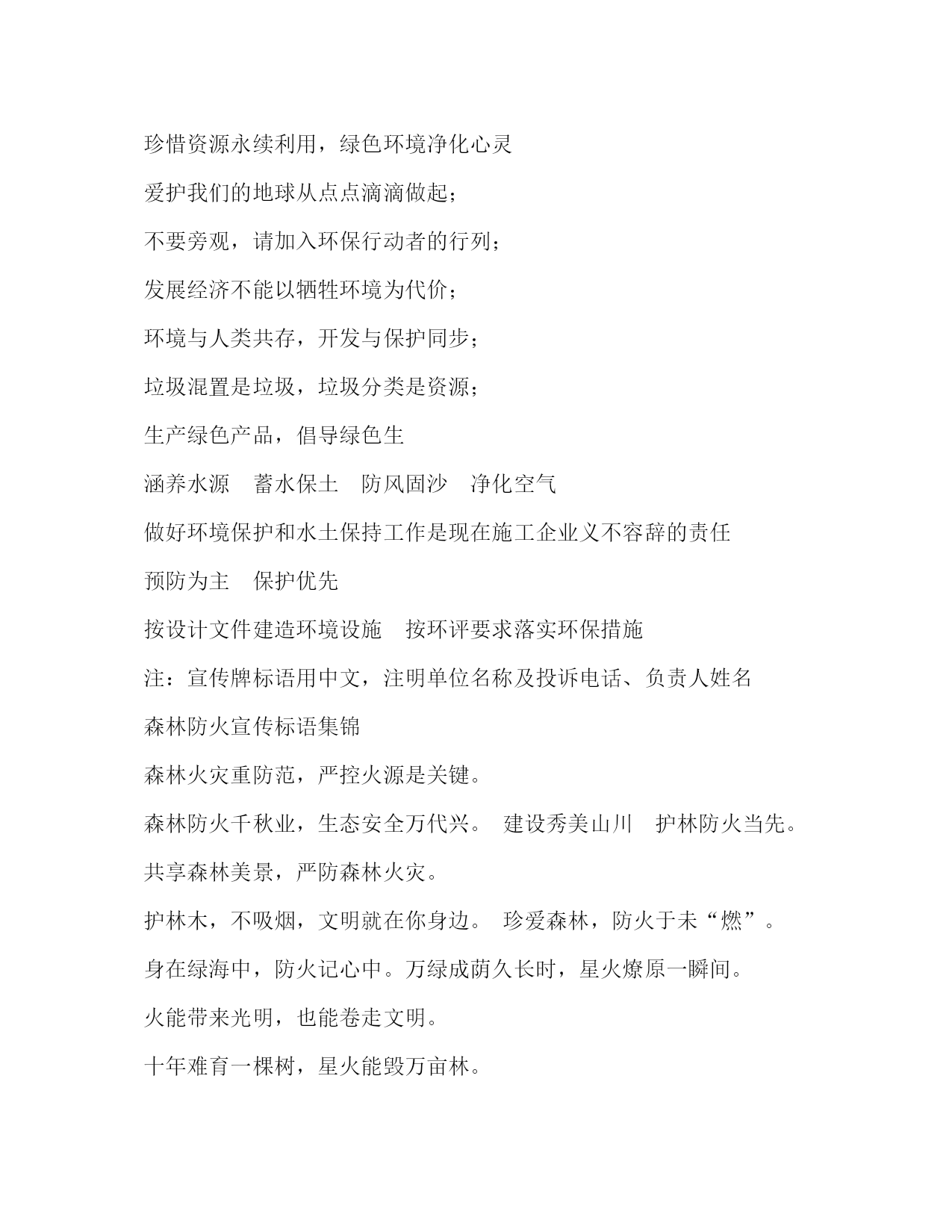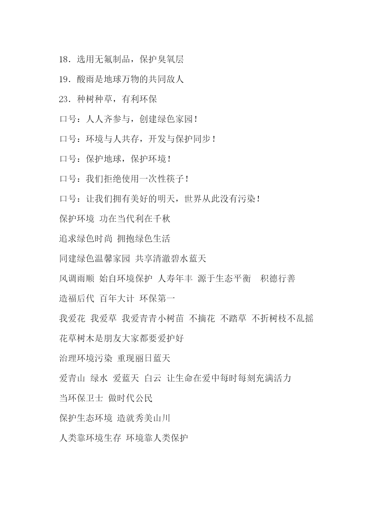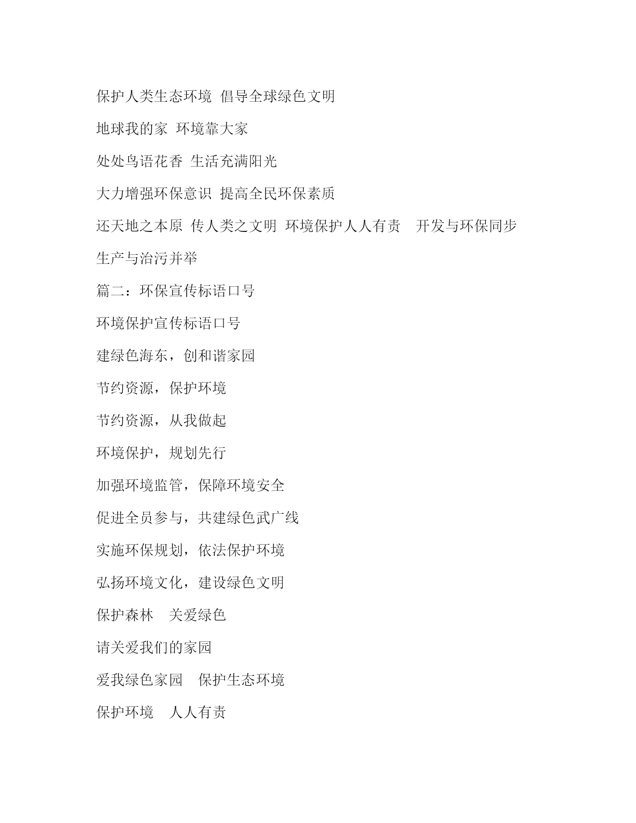 PAGE此资料由网络收集而来,如有侵权请告知上传者立即删除。资料共分享,我们负责传递知识。环保的标语大全篇一:环保的标语大全环保的标语大全1、环境保护,人人有责。5、保护蓝天碧水。8、保护环境是每一位公民应尽的责任。9、环境保护从我做起。10、保护环境,造福人类。11、保护环境就是保护我们自己。12、破坏环境,就是破坏我们赖以生存的家园。13、土壤不能再生,防止土壤污染和沙化,减少水土流失。14、环境与人类共存,资源开发与环境保护协调。15、保护水环境,节约水资源。17、树立大环境意识,保护生态环境。5.地球资源有限,尽量不用一次性消耗品7.垃圾是放错位置的资源11.提布袋购物是一种时尚12.多乘公交车,少用私家车13.请选用无磷洗衣粉18.选用无氟制品,保护臭氧层19.酸雨是地球万物的共同敌人23.种树种草,有利环保口号:人人齐参与,创建绿色家园!口号:环境与人共存,开发与保护同步!口号:保护地球,保护环境!口号:我们拒绝使用一次性筷子!口号:让我们拥有美好的明天,世界从此没有污染!保护环境功在当代利在千秋追求绿色时尚拥抱绿色生活同建绿色温馨家园共享清澈碧水蓝天风调雨顺始自环境保护人寿年丰源于生态平衡积德行善造福后代百年大计环保第一我爱花我爱草我爱青青小树苗不摘花不踏草不折树枝不乱摇花草树木是朋友大家都要爱护好治理环境污染重现丽日蓝天爱青山绿水爱蓝天白云让生命在爱中每时每刻充满活力当环保卫士做时代公民保护生态环境造就秀美山川人类靠环境生存环境靠人类保护生命和绿色拥抱人类与生态共存关爱生命健康倡导环保时尚我环保我自豪让环保扎根现在用绿色昭示未来同在蓝天下共爱一个家追求环保是你我的心愿参与环保是你我的责任拥有绿色人类将不会失去梦想青山绿水蓝天共创美好人间还地球一片净土蓝天让人类永远幸福美满珍爱生命保护环境造福人类让地球远离污染让绿色走进家园人人参与环保共创绿色世纪保护碧水蓝天营造绿色家园绿色是生命之源绿色是人类之根百业要兴环保先行改善生态环境营造绿色家园用我们的双手栽下漫天的绿色用我们的心灵守望五彩的家园争做环保使者共创绿色文明人人播撒绿色爱处处享受环境美成就绿色成就未来崇尚绿色消费打造精彩生活重视生态功在千秋保护环境造福万代积攒绿色储蓄生命合理利用自然资源有效保护生态平衡地球我的家环保靠大家环境是生存之本以法保护自然环境以德创建社会文明环境与生命共存环保与健康同在发展以市场为本生存以环保为先保环境爱家园健康生活每一天爱山爱水爱林爱鸟爱人类护天护地护花护草护环境绿色与生命时时相伴环境与健康息息相关地球共同的家园环保人类的责任“取之思尽、用之思绝”请珍惜我们有限的资源既要金山银山又要碧水青山有了碧水青山才有金山银山祸从污染起福自环保来有了健康的地球才有幸福的明天文明村村村迈大步环保户户户奔小康问渠哪得清如许唯有环保碧水来保护环境做一个文明的现代人家事国事天下事环境保护是大事青山助人寿碧水悦人情得到的不是永恒的拥有失去的将永不会再来——保护环境人人有责保护生态环境共健美好家园人人保护环境家家幸福康宁美好的生活从环保开始保护人类环境延续地球生命生命只有一次地球只有一个树成荫草成被花吐艳驻四季皆春山变绿水变清鸟歌唱迎八方清风保护环境是责任爱护环境是美德清新氧气源于绿色健康生命源于自然巍巍中华环保行人人奉献巨龙腾同处蓝天下共栖地球上——让我们的世界更好环保还宝让我们的世界更好人人爱心献环保明天生活更美好既要金山银山更要碧水蓝天拯救地球刻不容缓保护环境迫在眉睫共建家园任重道远保护环境利国利民树立环境保护意识建设绿色文明家园保护人类生态环境倡导全球绿色文明地球我的家环境靠大家处处鸟语花香生活充满阳光大力增强环保意识提高全民环保素质还天地之本原传人类之文明环境保护人人有责开发与环保同步生产与治污并举篇二:环保宣传标语口号环境保护宣传标语口号建绿色海东,创和谐家园节约资源,保护环境节约资源,从我做起环境保护,规划先行加强环境监管,保障环境安全促进全员参与,共建绿色武广线实施环保规划,依法保护环境弘扬环境文化,建设绿色文明保护森林关爱绿色请关爱我们的家园爱我绿色家园保护生态环境保护环境人人有责保护环境造福子孙保护环境防止水土流失保护生物多样性请爱护我我给你带来一片绿茵青春生命大家关爱保护生态造福人类保护生态平衡爱护我们家园保护一山一水珍惜一草一木保护生态环境走可持续发展的道路改善环境造福人类环境与人类共存,开发与保护同步;贯彻环境教育,宣导环保资讯;生产绿色产品,节约地球资源;落实环保责任,