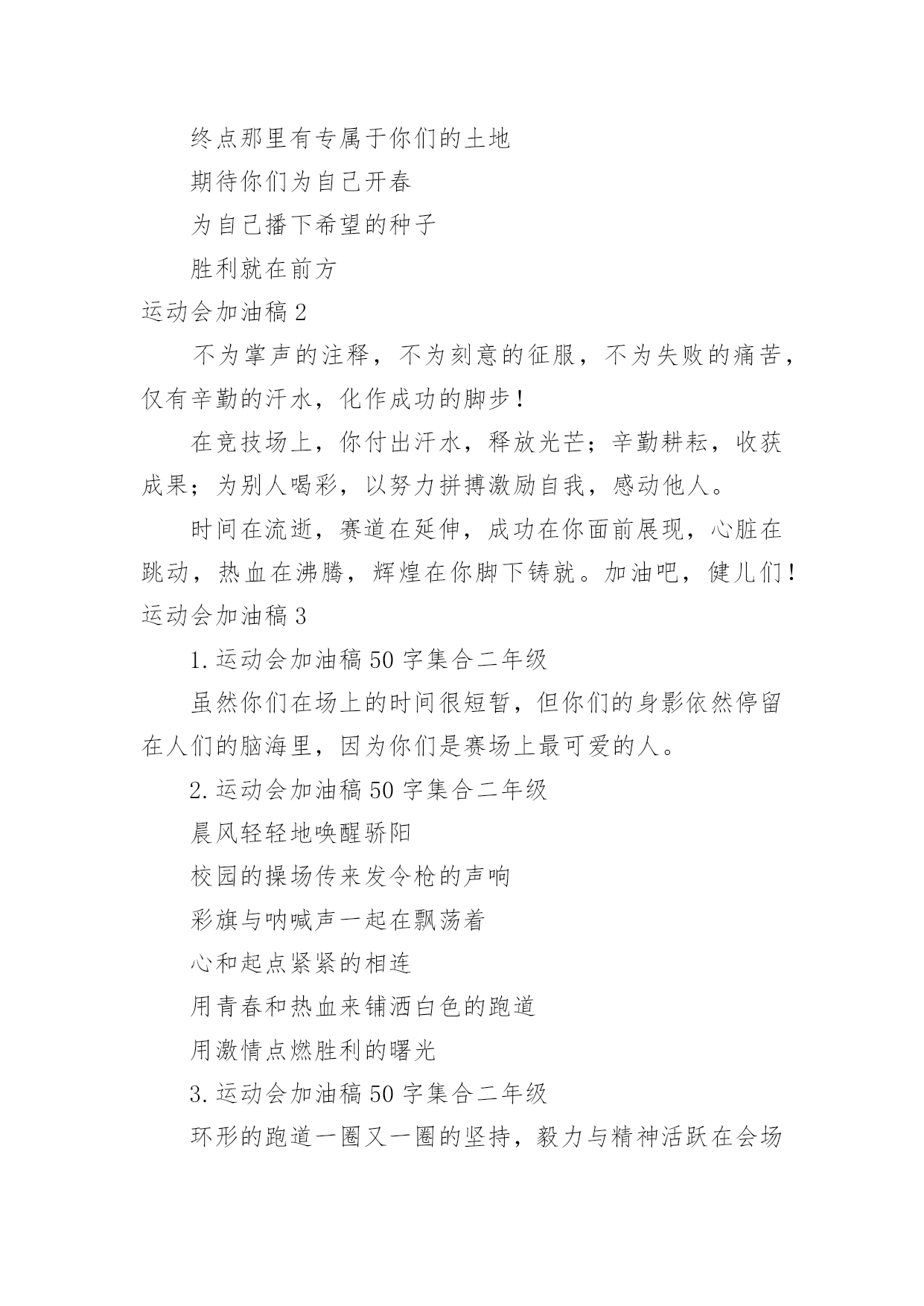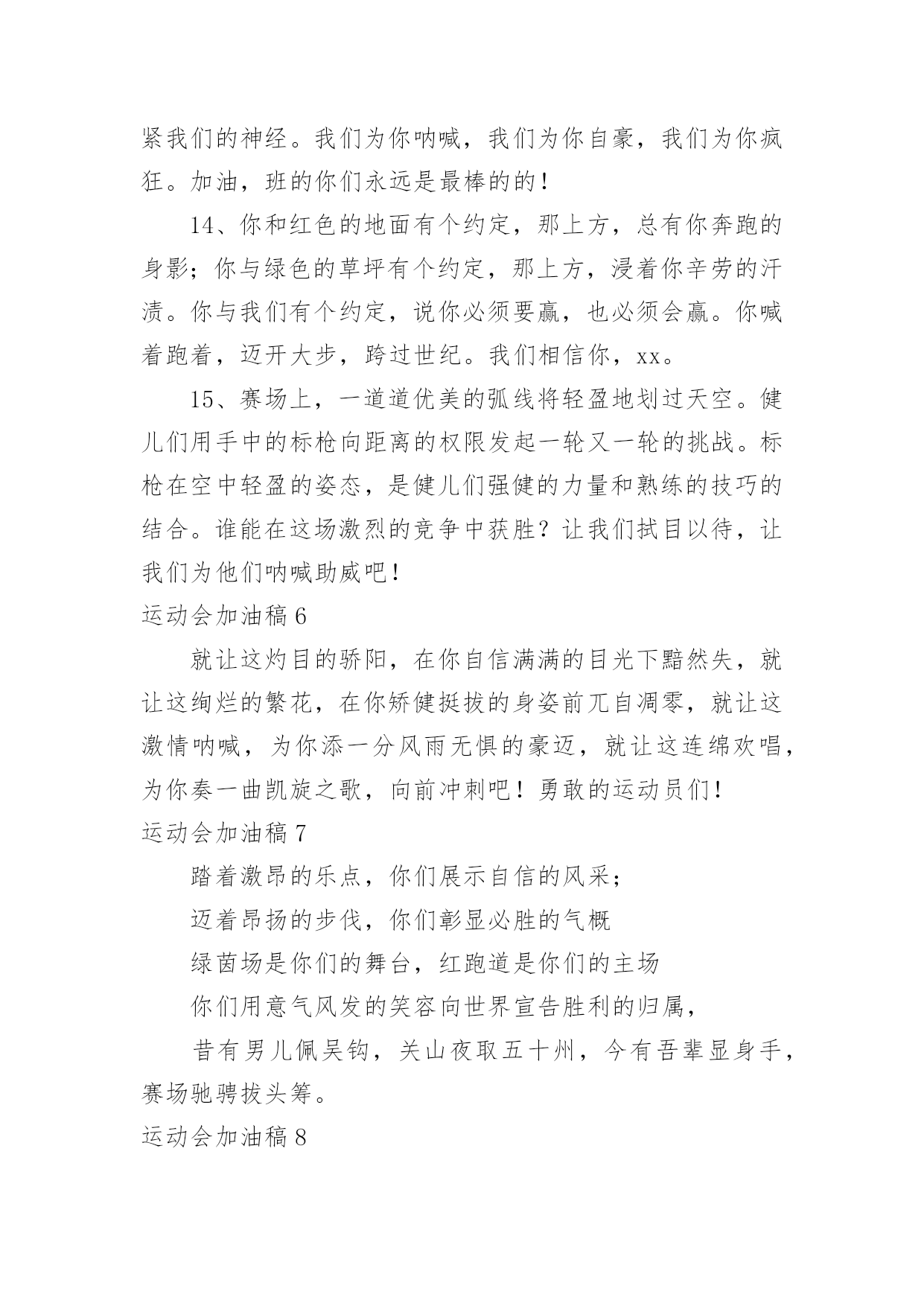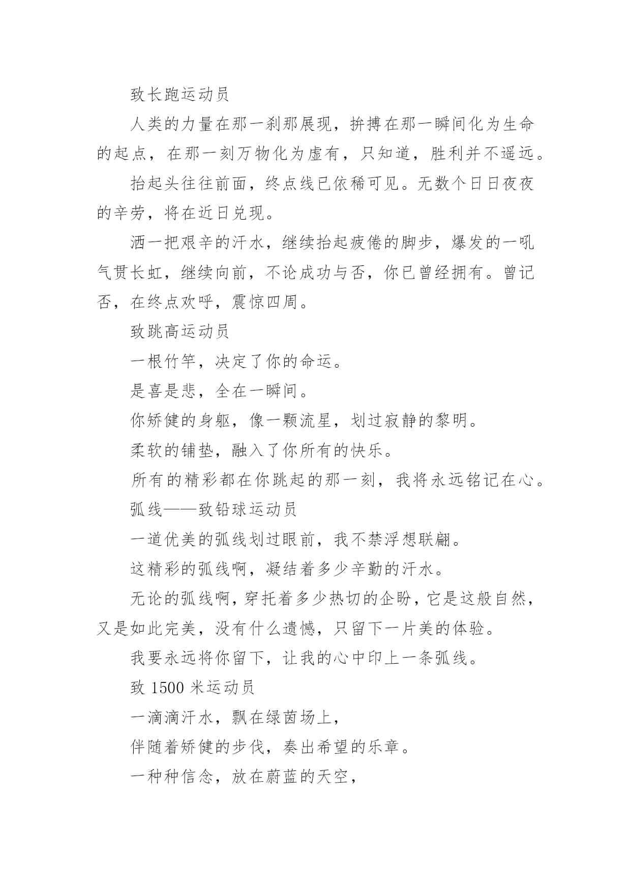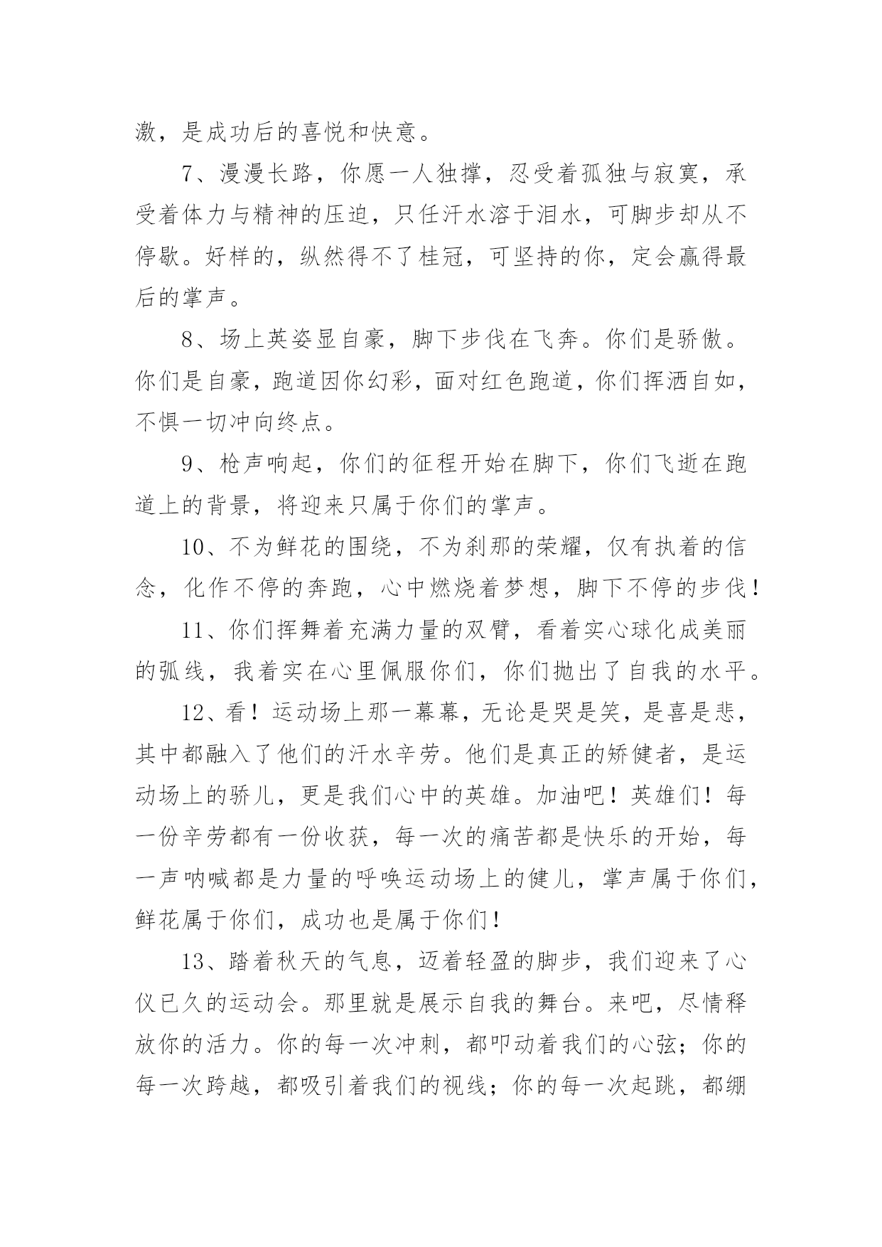 运动会加油稿运动会加油稿集合15篇随着社会一步步向前发展,我们很多时候都不得不用到加油稿,加油稿可以增添对方必胜的勇气和信心。你知道加油稿怎样才能写的好吗?以下是小编为大家整理的运动会加油稿,供大家参考借鉴,希望可以帮助到有需要的朋友。运动会加油稿1漫漫长路,的确令人忐忑然而我们知道,你们早已跑过多次早已在这红色的跑道上挥汗如雨劳累没有使你们退缩酸痛没有使你们放弃你们用毅力证明内心的渴望天气转凉,秋叶泛黄而你们便是那生生不息的希望用倔强和坚持,用顽强的拼劲展现春的生气冬天快到了,春天还会远吗在起点焦灼等待的人儿啊扬帆起航吧,驶向春天驶向渴望,驶向美好的明天终点那里有专属于你们的土地期待你们为自己开春为自己播下希望的种子胜利就在前方运动会加油稿2不为掌声的注释,不为刻意的征服,不为失败的痛苦,仅有辛勤的汗水,化作成功的脚步!在竞技场上,你付出汗水,释放光芒;辛勤耕耘,收获成果;为别人喝彩,以努力拼搏激励自我,感动他人。时间在流逝,赛道在延伸,成功在你面前展现,心脏在跳动,热血在沸腾,辉煌在你脚下铸就。加油吧,健儿们!运动会加油稿31.运动会加油稿50字集合二年级虽然你们在场上的时间很短暂,但你们的身影依然停留在人们的脑海里,因为你们是赛场上最可爱的人。2.运动会加油稿50字集合二年级晨风轻轻地唤醒骄阳校园的操场传来发令枪的声响彩旗与呐喊声一起在飘荡着心和起点紧紧的相连用青春和热血来铺洒白色的跑道用激情点燃胜利的曙光3.运动会加油稿50字集合二年级环形的跑道一圈又一圈的坚持,毅力与精神活跃在会场上,湿透的衣衫,满头的大汗,无限追求奋力追赶,我们为你欢呼跳跃,我们为你骄傲。4.运动会加油稿50字集合二年级在明媚的蓝天下,在宽广的绿茵上,一颗颗炽热的心为你们而跳动,一双双期待的眼神因你们而牵动。努力吧!运动健儿们,相信自己,胜利的光环将永远环绕你们!5.运动会加油稿50字集合二年级快去追赶对手,快去夺取胜利!相信你会送给我们一个汗水浸湿的微笑!6.运动会加油稿50字集合二年级广阔的绿茵场,是为你们搭建的舞台。张扬吧,年轻的心,我们将为你永远喝彩!7.运动会加油稿50字集合二年级赛场上,无数飞扬的红色生命,无数威武的骑手,无数干枯的与蓝天对吻的草儿,映动着一个个跃动的生命。因为有你,初冬的阳光编织煦暖;因为有你,终点的线条色彩斑斓;因为有你,掌声才显现出非凡的意义。8.运动会加油稿50字集合二年级就像花儿准备了春秋冬,就是为了红透整个盛夏。就像雪花经历了春夏秋就是为了洁白整个严冬。蹲下,昂首,出发……轻轻的一抬脚,便牵动了全场的目光。潇洒的挥挥手,便满足了那一份无言的等待。9.运动会加油稿50字集合二年级你是运动场的心脏,跳动梦想;你是漫长路的精神,激励辉煌。你们是将上下求索的人!风为你加油,云为你助兴。坚定,执着,耐力与希望,在延伸的白色跑道中点点凝聚!10.运动会加油稿50字集合二年级泥泞的路走过无数,累了,告诉自我:快了,再坚持一会儿;身上的伤流出血来,疼了,告诉自我:别哭,会好的;摔倒了,告诉自我:快爬起来,世上很少有坦途。11.运动会加油稿50字集合二年级超越对手,更要超越自我,追求卓越是我们的目标,是我们的信念,在清爽的秋季,在喧嚣的赛场,你们点燃了似火的热情,无论成败,你们永远是我们的骄傲,我们都为你们感到自豪!12.运动会加油稿50字集合二年级踏上跑道,是一种选择。离开起点,是一种勇气。驰骋赛场,是一种胜利。运动健将们,用你的实力,用你的精神,去开拓出,一片属于你的长跑天地!13.运动会加油稿50字集合二年级你的毅力令我们全班折服,你的努力,令我们全班佩服,你是我们班的焦点,你是全班的中心。14.运动会加油稿50字集合二年级最高的不是天空,是你们的信念,最远的不是天边,而是永不实现的目标。最广的不是海洋,是你们对运动的热情,最美的不是天上的彩虹,而是你们胜利的微笑!15.运动会加油稿50字集合二年级运动场上有你们的飒爽英姿,运动场上有你们拼搏的身影,面对漫漫的征程,你没有畏惧和退缩!16.运动会加油稿50字集合二年级你用行动述说着成功的好处,运动场上有无数成绩的高峰,而我们只是向更高处攀登。17.运动会加油稿50字集合二年级多少次挥汗如雨,伤痛曾添满记忆,只因为始终相信,去拼搏才能胜利。18.运动会加油稿50字集合二年级运动场上彩旗飘,运动健儿显英豪,跳跃身姿轻如燕,铅球飞落地动摇,百米冲刺如猛虎。19.运动会加油稿50字集合二年级这是速度与毅力的接力,这是期望与祈盼的接力,时间在这里凝固,几分几秒也变得如此漫长。20.运动会加油稿50字集合二年级看,终点就在眼前;听,同学为你呼喊。鼓起勇气奋力向前,用你的荣誉带给我们期望。运动会加油稿41.九年级男子200米预赛即将开始,虽然你没有身高上的优势,但我们相信你的努力不