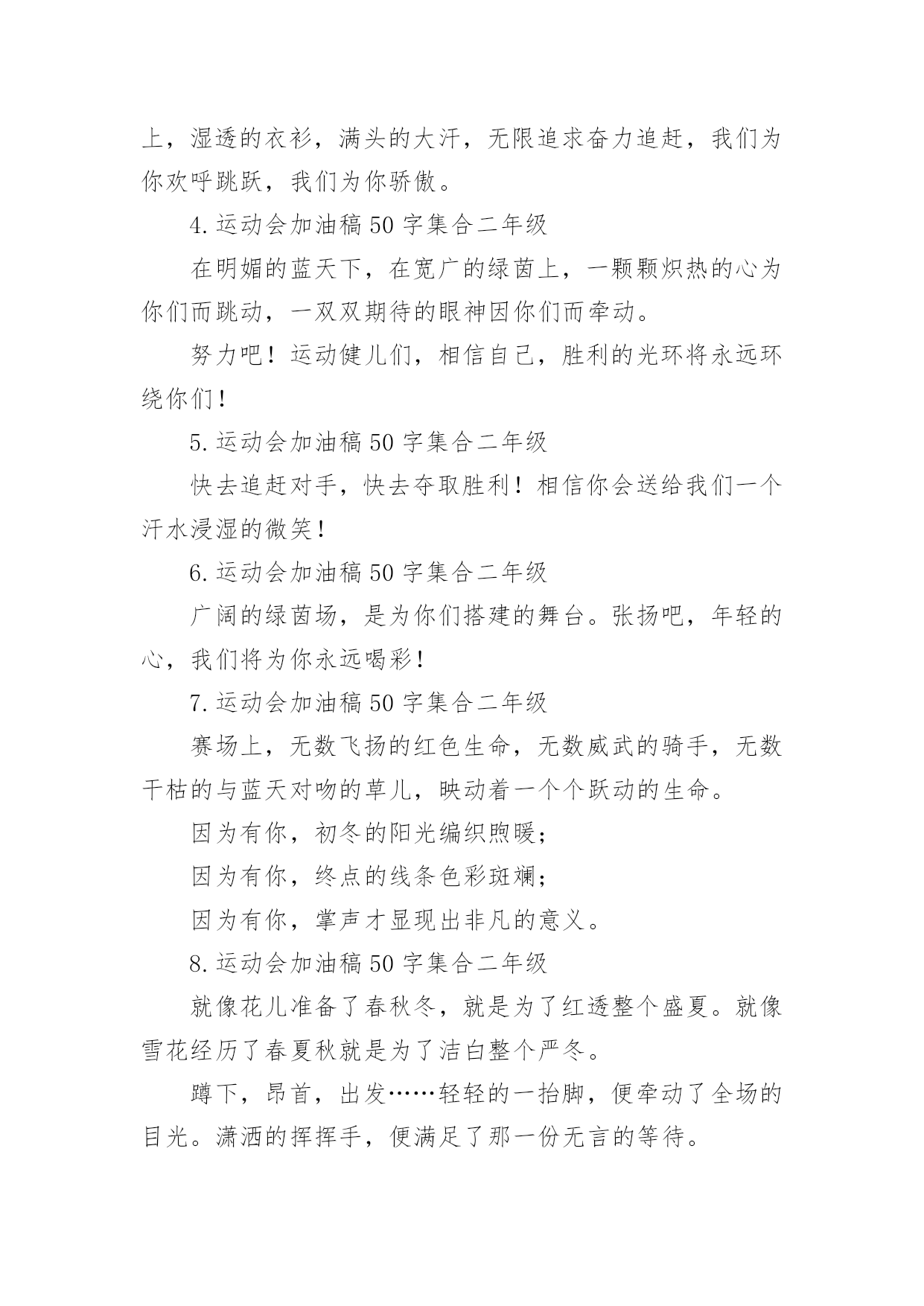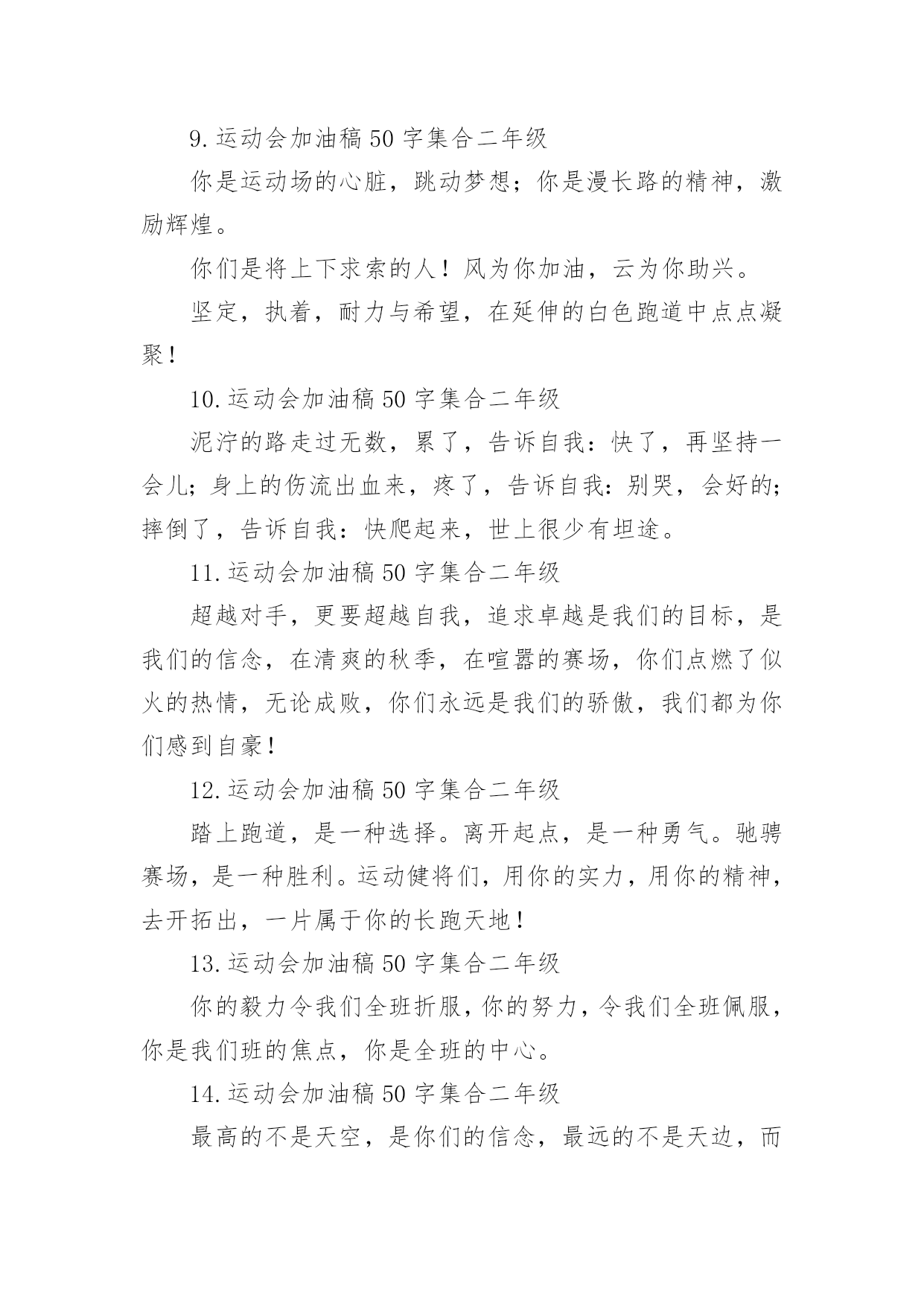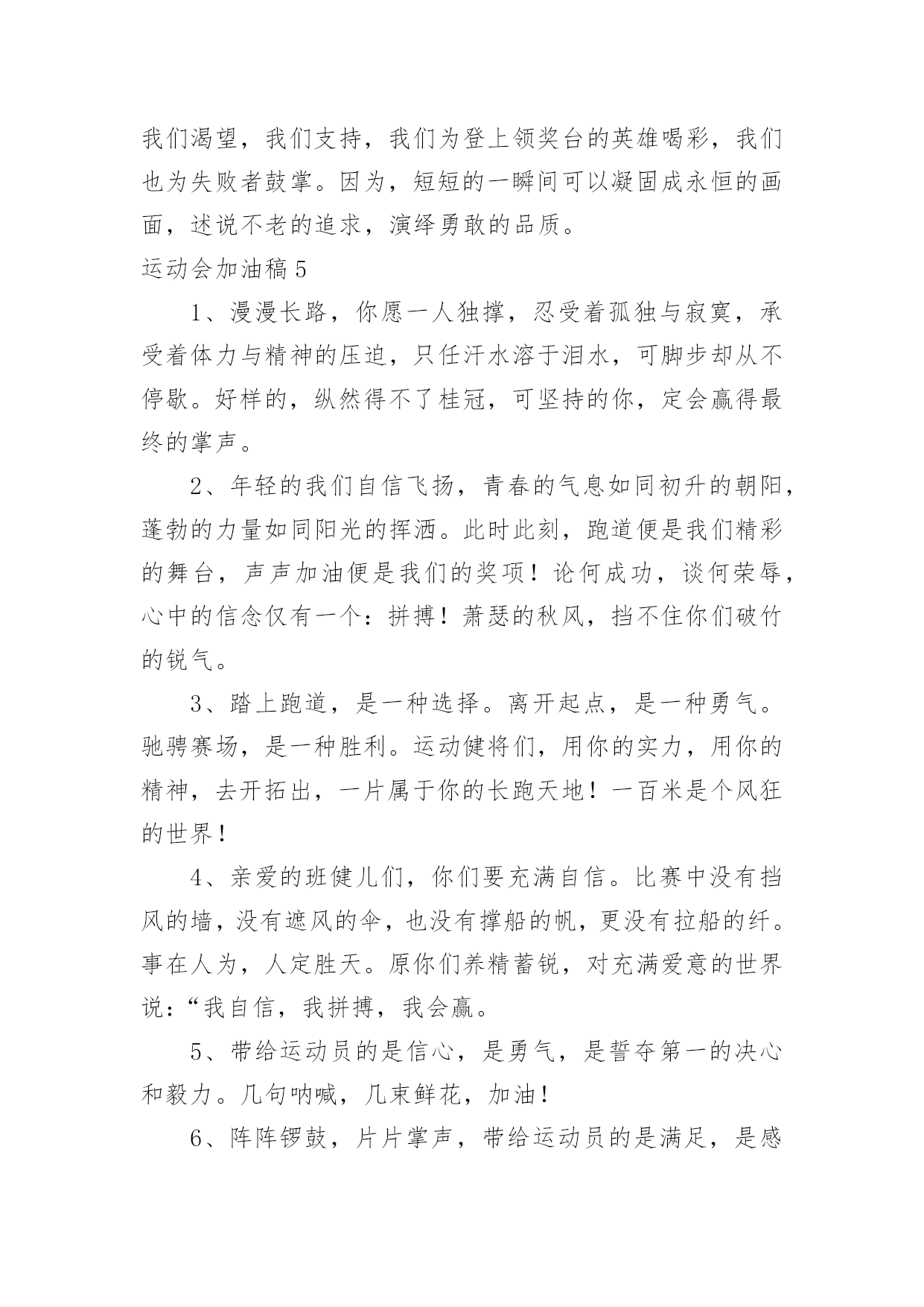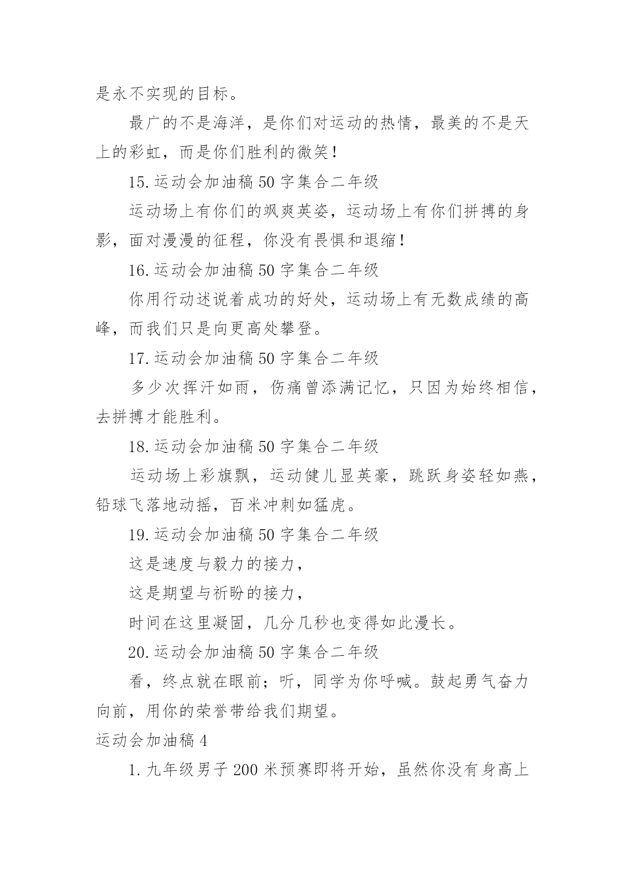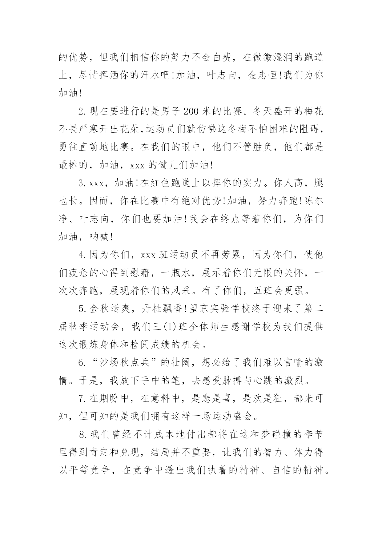 运动会加油稿运动会加油稿集合15篇随着社会一步步向前发展,我们很多时候都不得不用到加油稿,加油稿可以增添对方必胜的勇气和信心。你知道加油稿怎样才能写的好吗?以下是小编为大家整理的运动会加油稿,供大家参考借鉴,希望可以帮助到有需要的朋友。运动会加油稿1漫漫长路,的确令人忐忑然而我们知道,你们早已跑过多次早已在这红色的跑道上挥汗如雨劳累没有使你们退缩酸痛没有使你们放弃你们用毅力证明内心的渴望天气转凉,秋叶泛黄而你们便是那生生不息的希望用倔强和坚持,用顽强的拼劲展现春的生气冬天快到了,春天还会远吗在起点焦灼等待的人儿啊扬帆起航吧,驶向春天驶向渴望,驶向美好的明天终点那里有专属于你们的土地期待你们为自己开春为自己播下希望的种子胜利就在前方运动会加油稿2不为掌声的注释,不为刻意的征服,不为失败的痛苦,仅有辛勤的汗水,化作成功的脚步!在竞技场上,你付出汗水,释放光芒;辛勤耕耘,收获成果;为别人喝彩,以努力拼搏激励自我,感动他人。时间在流逝,赛道在延伸,成功在你面前展现,心脏在跳动,热血在沸腾,辉煌在你脚下铸就。加油吧,健儿们!运动会加油稿31.运动会加油稿50字集合二年级虽然你们在场上的时间很短暂,但你们的身影依然停留在人们的脑海里,因为你们是赛场上最可爱的人。2.运动会加油稿50字集合二年级晨风轻轻地唤醒骄阳校园的操场传来发令枪的声响彩旗与呐喊声一起在飘荡着心和起点紧紧的相连用青春和热血来铺洒白色的跑道用激情点燃胜利的曙光3.运动会加油稿50字集合二年级环形的跑道一圈又一圈的坚持,毅力与精神活跃在会场上,湿透的衣衫,满头的大汗,无限追求奋力追赶,我们为你欢呼跳跃,我们为你骄傲。4.运动会加油稿50字集合二年级在明媚的蓝天下,在宽广的绿茵上,一颗颗炽热的心为你们而跳动,一双双期待的眼神因你们而牵动。努力吧!运动健儿们,相信自己,胜利的光环将永远环绕你们!5.运动会加油稿50字集合二年级快去追赶对手,快去夺取胜利!相信你会送给我们一个汗水浸湿的微笑!6.运动会加油稿50字集合二年级广阔的绿茵场,是为你们搭建的舞台。张扬吧,年轻的心,我们将为你永远喝彩!7.运动会加油稿50字集合二年级赛场上,无数飞扬的红色生命,无数威武的骑手,无数干枯的与蓝天对吻的草儿,映动着一个个跃动的生命。因为有你,初冬的阳光编织煦暖;因为有你,终点的线条色彩斑斓;因为有你,掌声才显现出非凡的意义。8.运动会加油稿50字集合二年级就像花儿准备了春秋冬,就是为了红透整个盛夏。就像雪花经历了春夏秋就是为了洁白整个严冬。蹲下,昂首,出发……轻轻的一抬脚,便牵动了全场的目光。潇洒的挥挥手,便满足了那一份无言的等待。9.运动会加油稿50字集合二年级你是运动场的心脏,跳动梦想;你是漫长路的精神,激励辉煌。你们是将上下求索的人!风为你加油,云为你助兴。坚定,执着,耐力与希望,在延伸的白色跑道中点点凝聚!10.运动会加油稿50字集合二年级泥泞的路走过无数,累了,告诉自我:快了,再坚持一会儿;身上的伤流出血来,疼了,告诉自我:别哭,会好的;摔倒了,告诉自我:快爬起来,世上很少有坦途。11.运动会加油稿50字集合二年级超越对手,更要超越自我,追求卓越是我们的目标,是我们的信念,在清爽的秋季,在喧嚣的赛场,你们点燃了似火的热情,无论成败,你们永远是我们的骄傲,我们都为你们感到自豪!12.运动会加油稿50字集合二年级踏上跑道,是一种选择。离开起点,是一种勇气。驰骋赛场,是一种胜利。运动健将们,用你的实力,用你的精神,去开拓出,一片属于你的长跑天地!13.运动会加油稿50字集合二年级你的毅力令我们全班折服,你的努力,令我们全班佩服,你是我们班的焦点,你是全班的中心。14.运动会加油稿50字集合二年级最高的不是天空,是你们的信念,最远的不是天边,而是永不实现的目标。最广的不是海洋,是你们对运动的热情,最美的不是天上的彩虹,而是你们胜利的微笑!15.运动会加油稿50字集合二年级运动场上有你们的飒爽英姿,运动场上有你们拼搏的身影,面对漫漫的征程,你没有畏惧和退缩!16.运动会加油稿50字集合二年级你用行动述说着成功的好处,运动场上有无数成绩的高峰,而我们只是向更高处攀登。17.运动会加油稿50字集合二年级多少次挥汗如雨,伤痛曾添满记忆,只因为始终相信,去拼搏才能胜利。18.运动会加油稿50字集合二年级运动场上彩旗飘,运动健儿显英豪,跳跃身姿轻如燕,铅球飞落地动摇,百米冲刺如猛虎。19.运动会加油稿50字集合二年级这是速度与毅力的接力,这是期望与祈盼的接力,时间在这里凝固,几分几秒也变得如此漫长。20.运动会加油稿50字集合二年级看,终点就在眼前;听,同学为你呼喊。鼓起勇气奋力向前,用你的荣誉带给我们期望。运动会加油稿41.九年级男子200米预赛即将开始,虽然你没有身高上的优势,但我们相信你的努力不