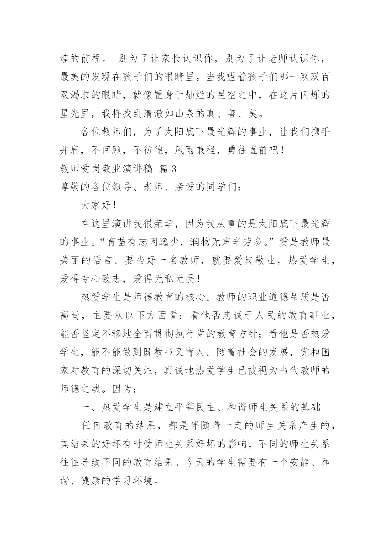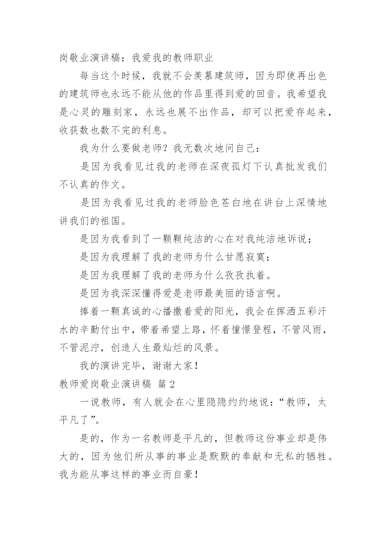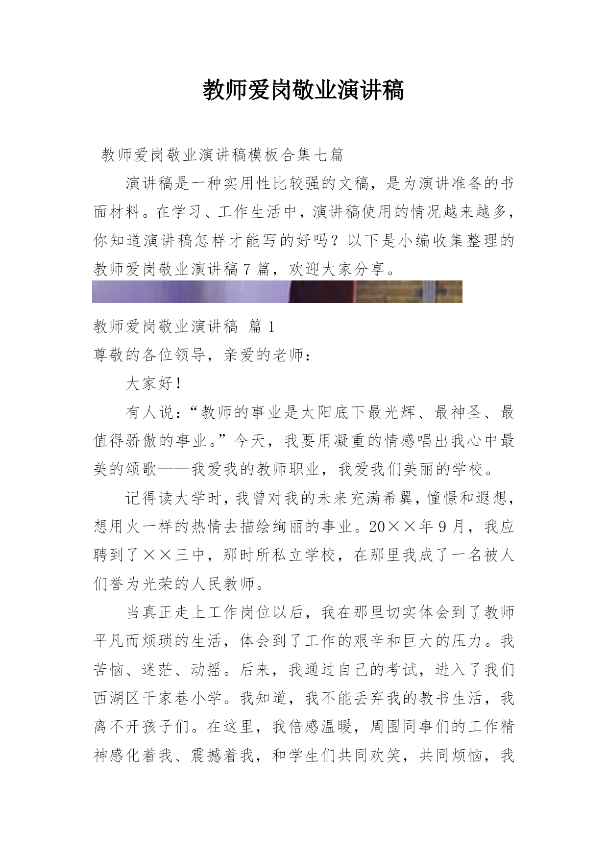 教师爱岗敬业演讲稿教师爱岗敬业演讲稿模板合集七篇演讲稿是一种实用性比较强的文稿,是为演讲准备的书面材料。在学习、工作生活中,演讲稿使用的情况越来越多,你知道演讲稿怎样才能写的好吗?以下是小编收集整理的教师爱岗敬业演讲稿7篇,欢迎大家分享。教师爱岗敬业演讲稿篇1尊敬的各位领导,亲爱的老师:大家好!有人说:“教师的事业是太阳底下最光辉、最神圣、最值得骄傲的事业。”今天,我要用凝重的情感唱出我心中最美的颂歌——我爱我的教师职业,我爱我们美丽的学校。记得读大学时,我曾对我的未来充满希翼,憧憬和遐想,想用火一样的热情去描绘绚丽的事业。20××年9月,我应聘到了××三中,那时所私立学校,在那里我成了一名被人们誉为光荣的人民教师。当真正走上工作岗位以后,我在那里切实体会到了教师平凡而烦琐的生活,体会到了工作的艰辛和巨大的压力。我苦恼、迷茫、动摇。后来,我通过自己的考试,进入了我们西湖区干家巷小学。我知道,我不能丢弃我的教书生活,我离不开孩子们。在这里,我倍感温暖,周围同事们的工作精神感化着我、震撼着我,和学生们共同欢笑,共同烦恼,我周围的老师们无怨无悔的这样做着,他们像春蚕,象蜡烛,用自己的青春和生命来捍卫这个职业的神圣。一天又一天,一年又一年。时光流转,我谛听着自己踩踏的足音,摇摇晃晃地在这条路上已走了近四年,四年的教学生活,我被自己周围的人感动着:我喜欢走在路上,听学生们远远地面带微笑叫我“老师”;我喜欢登上讲台,看台下几十双期待和信任的目光;我喜欢拿起粉笔,为年轻的航船导航,为他们开启智慧之门,帮他们点燃理想之灯。而他们也在影响着我,他们丰富着我的生活,他们美丽着我的人生……当在一个春天,我从一个不爱学习的学生脸上读到笑靥,当在一个清晨,我听到一个学生说“我错了”,当在一个黄昏,我听到一个学生说“我会努力”,那真的是一种幸福。每当这个时候,我的心里就会美滋滋饿,我希望我是培育孩子,不轻易说“不”,不轻易否定,因为我深深懂得,不是所有的笑容,都只绽放一次,不是所有尚未出池的珍贝受过挫伤就从此不再有夺目的光华。倾尽所有的爱和期望,培育出一颗颗夺目耀眼的珍珠,这样的工作是多么有意义呀!当在每各教师节的日子里,我收到学生们给我的一束束花,一张张贺卡;当在中秋团圆的日子里,接到学生打来的电话,发来的短信;当在静静的夜里,读着这样的话“老师,您是我们永远的老师和朋友。请您相信,即使参天大树也忘不了细细根须;即使浩荡大海也会铭记那小小源泉。教师爱岗敬业演讲稿:我爱我的教师职业每当这个时候,我就不会羡慕建筑师,因为即使再出色的建筑师也永远不能从他的作品里得到爱的回音。我希望我是心灵的雕刻家,永远也展不出作品,却可以把爱存起来,收获数也数不完的利息。我为什么要做老师?我无数次地问自己:是因为我看见过我的老师在深夜孤灯下认真批发我们不认真的作文。是因为我看见过我的老师脸色苍白地在讲台上深情地讲我们的祖国。是因为我看到了一颗颗纯洁的心在对我纯洁地诉说;是因为我理解了我的老师为什么甘愿寂寞;是因为我理解了我的老师为什么孜孜执着。是因为我深深懂得爱是老师最美丽的语言啊。捧着一颗真诚的心播撒着爱的阳光,我会在挥洒五彩汗水的辛勤付出中,带着希望上路,怀着憧憬登程,不管风雨,不管泥泞,创造人生最灿烂的风景。我的演讲完毕,谢谢大家!教师爱岗敬业演讲稿篇2一说教师,有人就会在心里隐隐约约地说:“教师,太平凡了”。是的,作为一名教师是平凡的,但教师这份事业却是伟大的,因为他们所从事的事业是默默的奉献和无私的牺牲。我为能从事这样的事业而自豪!当我登上那讲台,不,应当是舞台,我似乎觉的两侧的紫色帷幕正缓缓的拉开。最富有生气的戏剧就要开始了。最令我兴奋的是这戏剧拥有一群忠于自己的角色的演员——我的学生们!这戏剧也许是世间最长的了,为此,我愿做一名热情的报幕员,向观众宣布:××班的戏剧开始了!我想,我还应该是一名合格的导演。我渴望导出充满时代气息的戏剧来:团结,紧张,严肃,活泼是它的主调;理解,友爱,开拓,创新应当是它的主要内容;爱着这个集体和被这个集体爱着是它的主要故事。作为导演我将要精心设计出生动的情节,典型的角色,迷人的故事奉献给所有的演员。我也心甘情愿地做一名配角,尽我的力量成为主角服务、效劳。不仅如此,我还要做一名最虔诚的观众,为演员们精诚的演出微笑,流泪,鼓掌,吹呼。生活的目的,不在于显耀和享受,而在于精神上的充实和事业上的成功。没有战士谁也当不了将军;没有水手,谁也当不了船长;没有多行多业的分工,就不存在国家和民族。我们既然选择了教师这条路,就要坚定不移地走下去。时代在前进,社会在发展,改革在深入,教育要振兴。作为一名平凡的教育工作者,我一定会竭尽全力把书叫教好!如果我的学生是蜜蜂,我甘当采蜜的花朵;如果我的学生是花朵呢,我一定做好护花的绿叶;如果我的学生是幼苗