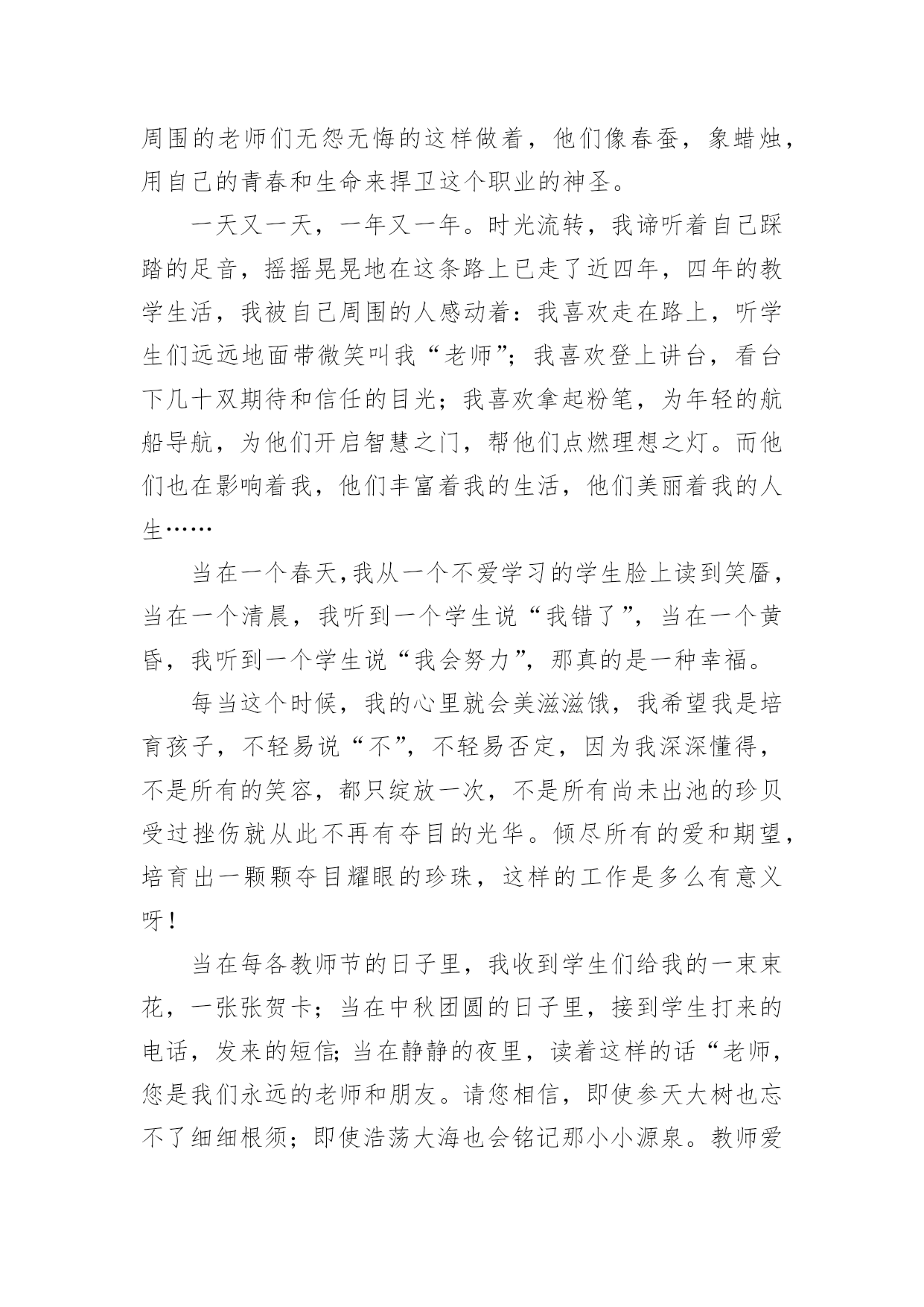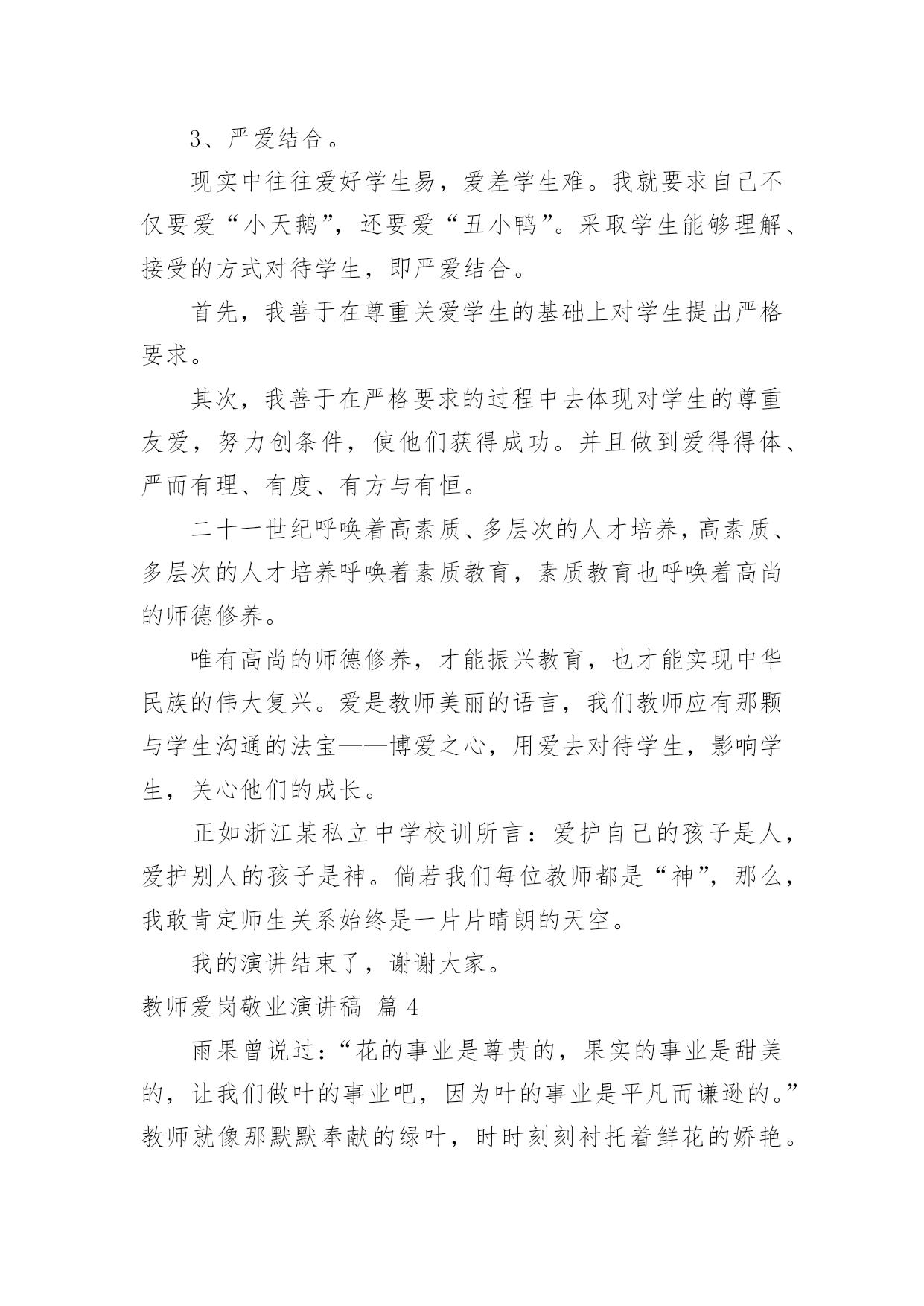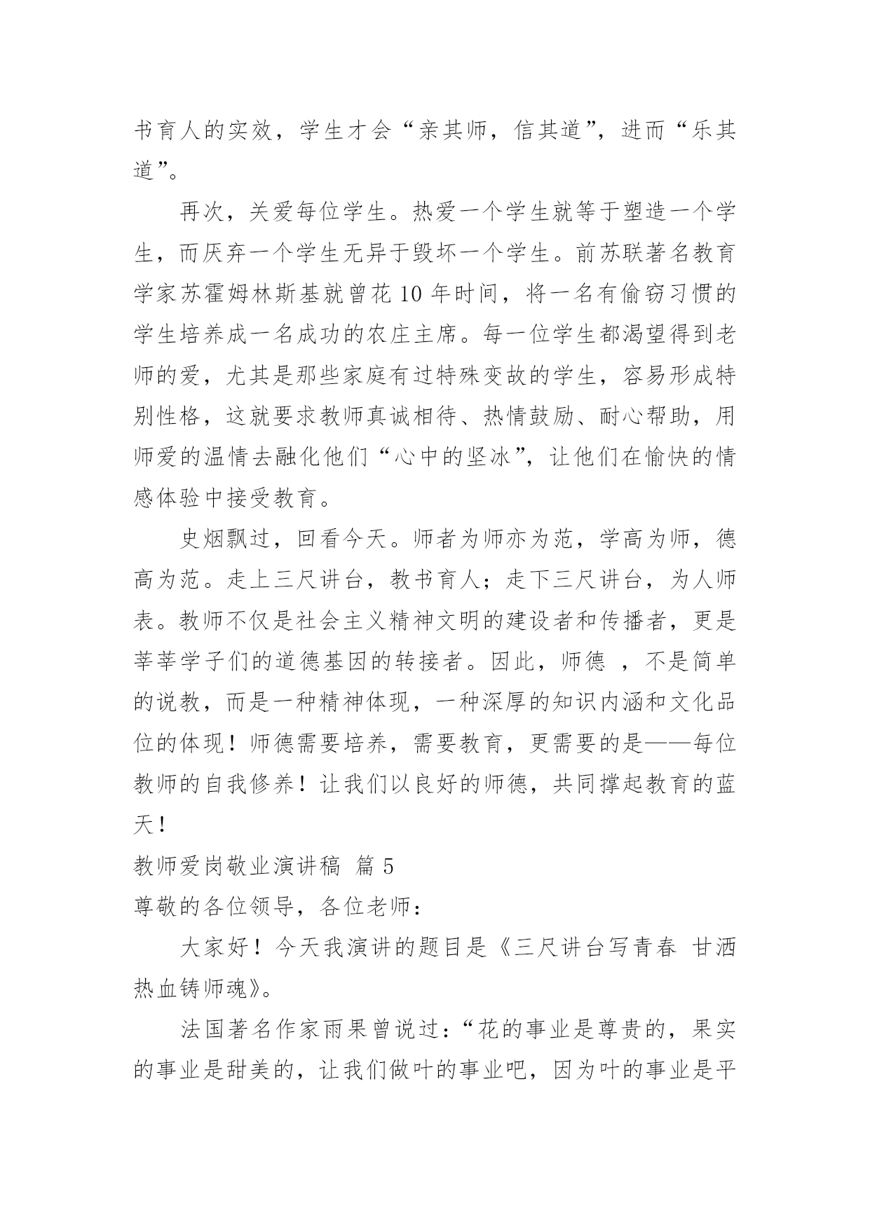 教师爱岗敬业演讲稿教师爱岗敬业演讲稿模板合集七篇演讲稿是一种实用性比较强的文稿,是为演讲准备的书面材料。在学习、工作生活中,演讲稿使用的情况越来越多,你知道演讲稿怎样才能写的好吗?以下是小编收集整理的教师爱岗敬业演讲稿7篇,欢迎大家分享。教师爱岗敬业演讲稿篇1尊敬的各位领导,亲爱的老师:大家好!有人说:“教师的事业是太阳底下最光辉、最神圣、最值得骄傲的事业。”今天,我要用凝重的情感唱出我心中最美的颂歌——我爱我的教师职业,我爱我们美丽的学校。记得读大学时,我曾对我的未来充满希翼,憧憬和遐想,想用火一样的热情去描绘绚丽的事业。20××年9月,我应聘到了××三中,那时所私立学校,在那里我成了一名被人们誉为光荣的人民教师。当真正走上工作岗位以后,我在那里切实体会到了教师平凡而烦琐的生活,体会到了工作的艰辛和巨大的压力。我苦恼、迷茫、动摇。后来,我通过自己的考试,进入了我们西湖区干家巷小学。我知道,我不能丢弃我的教书生活,我离不开孩子们。在这里,我倍感温暖,周围同事们的工作精神感化着我、震撼着我,和学生们共同欢笑,共同烦恼,我周围的老师们无怨无悔的这样做着,他们像春蚕,象蜡烛,用自己的青春和生命来捍卫这个职业的神圣。一天又一天,一年又一年。时光流转,我谛听着自己踩踏的足音,摇摇晃晃地在这条路上已走了近四年,四年的教学生活,我被自己周围的人感动着:我喜欢走在路上,听学生们远远地面带微笑叫我“老师”;我喜欢登上讲台,看台下几十双期待和信任的目光;我喜欢拿起粉笔,为年轻的航船导航,为他们开启智慧之门,帮他们点燃理想之灯。而他们也在影响着我,他们丰富着我的生活,他们美丽着我的人生……当在一个春天,我从一个不爱学习的学生脸上读到笑靥,当在一个清晨,我听到一个学生说“我错了”,当在一个黄昏,我听到一个学生说“我会努力”,那真的是一种幸福。每当这个时候,我的心里就会美滋滋饿,我希望我是培育孩子,不轻易说“不”,不轻易否定,因为我深深懂得,不是所有的笑容,都只绽放一次,不是所有尚未出池的珍贝受过挫伤就从此不再有夺目的光华。倾尽所有的爱和期望,培育出一颗颗夺目耀眼的珍珠,这样的工作是多么有意义呀!当在每各教师节的日子里,我收到学生们给我的一束束花,一张张贺卡;当在中秋团圆的日子里,接到学生打来的电话,发来的短信;当在静静的夜里,读着这样的话“老师,您是我们永远的老师和朋友。请您相信,即使参天大树也忘不了细细根须;即使浩荡大海也会铭记那小小源泉。教师爱岗敬业演讲稿:我爱我的教师职业每当这个时候,我就不会羡慕建筑师,因为即使再出色的建筑师也永远不能从他的作品里得到爱的回音。我希望我是心灵的雕刻家,永远也展不出作品,却可以把爱存起来,收获数也数不完的利息。我为什么要做老师?我无数次地问自己:是因为我看见过我的老师在深夜孤灯下认真批发我们不认真的作文。是因为我看见过我的老师脸色苍白地在讲台上深情地讲我们的祖国。是因为我看到了一颗颗纯洁的心在对我纯洁地诉说;是因为我理解了我的老师为什么甘愿寂寞;是因为我理解了我的老师为什么孜孜执着。是因为我深深懂得爱是老师最美丽的语言啊。捧着一颗真诚的心播撒着爱的阳光,我会在挥洒五彩汗水的辛勤付出中,带着希望上路,怀着憧憬登程,不管风雨,不管泥泞,创造人生最灿烂的风景。我的演讲完毕,谢谢大家!教师爱岗敬业演讲稿篇2一说教师,有人就会在心里隐隐约约地说:“教师,太平凡了”。是的,作为一名教师是平凡的,但教师这份事业却是伟大的,因为他们所从事的事业是默默的奉献和无私的牺牲。我为能从事这样的事业而自豪!当我登上那讲台,不,应当是舞台,我似乎觉的两侧的紫色帷幕正缓缓的拉开。最富有生气的戏剧就要开始了。最令我兴奋的是这戏剧拥有一群忠于自己的角色的演员——我的学生们!这戏剧也许是世间最长的了,为此,我愿做一名热情的报幕员,向观众宣布:××班的戏剧开始了!我想,我还应该是一名合格的导演。我渴望导出充满时代气息的戏剧来:团结,紧张,严肃,活泼是它的主调;理解,友爱,开拓,创新应当是它的主要内容;爱着这个集体和被这个集体爱着是它的主要故事。作为导演我将要精心设计出生动的情节,典型的角色,迷人的故事奉献给所有的演员。我也心甘情愿地做一名配角,尽我的力量成为主角服务、效劳。不仅如此,我还要做一名最虔诚的观众,为演员们精诚的演出微笑,流泪,鼓掌,吹呼。生活的目的,不在于显耀和享受,而在于精神上的充实和事业上的成功。没有战士谁也当不了将军;没有水手,谁也当不了船长;没有多行多业的分工,就不存在国家和民族。我们既然选择了教师这条路,就要坚定不移地走下去。时代在前进,社会在发展,改革在深入,教育要振兴。作为一名平凡的教育工作者,我一定会竭尽全力把书叫教好!如果我的学生是蜜蜂,我甘当采蜜的花朵;如果我的学生是花朵呢,我一定做好护花的绿叶;如果我的学生是幼苗