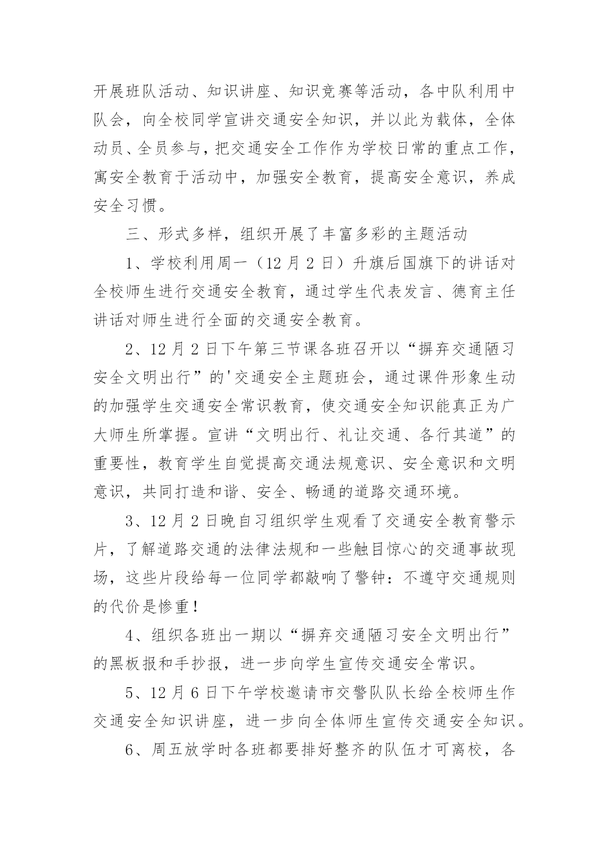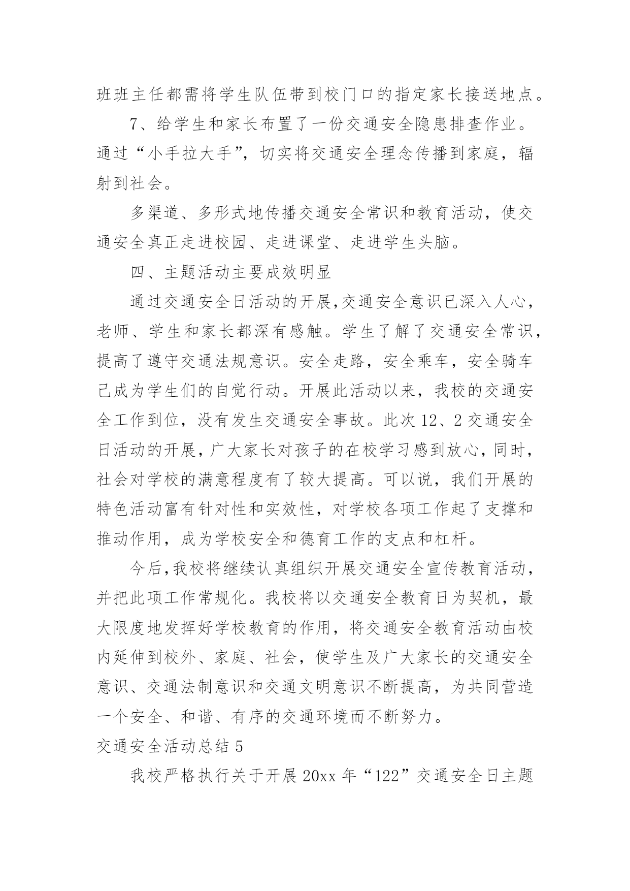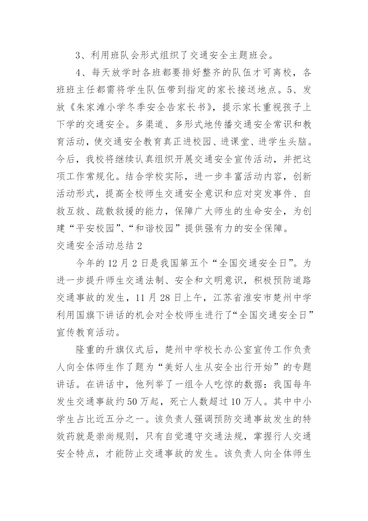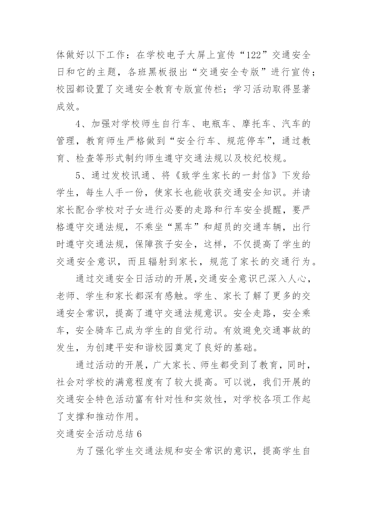 交通安全活动总结交通安全活动总结(通用15篇)总结是事后对某一阶段的学习、工作或其完成情况加以回顾和分析的一种书面材料,它可以给我们下一阶段的学习和工作生活做指导,不如静下心来好好写写总结吧。你想知道总结怎么写吗?以下是小编为大家收集的交通安全活动总结,欢迎大家分享。交通安全活动总结1镇教育组:今年12月2日,是我国第三个“国家交通安全日”,我校按照宝鸡市实施“文明交通行动计划”领导小组办公室《关于认真开展20xx年“全国交通安全日”主题活动的通知》(宝文交办《20xx》1号)要求,我校全面深入抓好安全教育工作,并结合学校实际,积极、主动、科学、有效地开展了丰富多彩的交通安全宣传教育,营造浓厚的宣传教育氛围。动员全校师生共同参与交通安全活动,不断提高全校师生的交通安全意识和应对突发事件的自救能力,最大限度地预防和减少各种事故的发生,为构建“平安校园”、“和谐校园”提供了安全保障。现就我校此项活动情况总结如下:一、高度重视,加强领导学校领导高度重视安全教育主题活动的开展,牢固树立“珍爱生命、安全第一”的意识,坚持以人为本。本着对学校安全工作高度负责的态度,由副校长具体负责此项活动的开展,认真负起学校安全教育的领导责任,切实把安全教育摆上学校议事日程,作为学校安全建设的一项重要内容来抓,精心组织,周密安排,使我校交通安全主题教育活动取得实实在在的效果。二、周密计划,认真落实学校紧密结合本校实际,认真贯彻交通安全教育。结合学生认知特点,制定切实可行的交通安全教育活动方案,明确安全教育目标、组织领导机构、教育活动措施、实施方法步骤等,确保交通安全教育活动有人抓、不脱节。12月2日,庞拴才校长利用升国旗仪式做了题为《关爱生命文明出行》的.国旗下讲话,并且学校发放了《朱家滩小学冬季安全告家长书》,做好宣传教育发动工作,营造安全教育活动氛围。12月4日法制教育日,利用课间时间集合学生进行法制教育宣传,主管安全赵副校长做了题为《知法守法,与法同行》的讲话。同时,学校充分利用黑板报、标语以及班队会活动等方式,大张旗鼓地向学生进行交通安全宣传教育:1、组织学生观看了一部分交通安全教育片,了解道路交通的法律法规和一些触目惊心的交通事故现场,这些片段给每一位同学投敲响了警钟:不遵守交通规则的代价是惨重的!2、组织各班办了《交通安全知识》专题板报,向学生介绍交通安全知识。3、利用班队会形式组织了交通安全主题班会。4、每天放学时各班都要排好整齐的队伍才可离校,各班班主任都需将学生队伍带到指定的家长接送地点。5、发放《朱家滩小学冬季安全告家长书》,提示家长重视孩子上下学的交通安全。多渠道、多形式地传播交通安全常识和教育活动,使交通安全教育真正进校园、进课堂、进学生头脑。今后,我校将继续认真组织开展交通安全宣传活动,并把这项工作常规化。结合学校实际,进一步丰富活动内容,创新活动形式,提高全校师生交通安全意识和应对突发事件、自救互救、疏散救援的能力,保障广大师生的生命安全,为创建“平安校园”、“和谐校园”提供强有力的安全保障。交通安全活动总结2今年的12月2日是我国第五个“全国交通安全日”。为进一步提升师生交通法制、安全和文明意识,积极预防道路交通事故的发生,11月28日上午,江苏省淮安市楚州中学利用国旗下讲话的机会对全校师生进行了“全国交通安全日”宣传教育活动。隆重的升旗仪式后,楚州中学校长办公室宣传工作负责人向全体师生作了题为“美好人生从安全出行开始”的专题讲话。在讲话中,他列举了一组令人吃惊的数据:我国每年发生交通事故约50万起,死亡人数超过10万人。其中中小学生占比近五分之一。该负责人强调预防交通事故发生的特效药就是崇尚规则,只有自觉遵守交通法规,掌握行人交通安全特点,才能防止交通事故的发生。该负责人向全体师生作了四点提醒:一是汽车并非一刹车就能停止,千万不能横穿马路;二是千万不要在车前、车后急穿公路;三是要让特种车辆先行,积极配合;四是应积极避让转弯车辆。最后,该负责人号召全体师生一定要培养文明交通的'良好习惯,崇尚规则,只有始终把交通安全牢记在心里,落实到行动中,才可以远离交通事故。本次交通安全宣传教育活动,使“122全国交通安全宣传日”的公众认知度在师生中得到了提升,使师生的交通安全意识和自觉摒弃陋习、文明出行的自觉性得到了进一步增强。交通安全活动总结3冬季来临,为了强化学生交通法规和安全常识的意识,提高学生自我防护能力,我校通过开展形式多样的学习教育活动,加大了安全的宣传力度,增强了全体学生的安全观念,牢固树立了“安全第一,预防为主“的思想。把“交通安全教育系列”活动作为学校德育特色活动,切实加强对学生交通法规教育,增强学生交通安全意识,确保学生交通安全。现总结如下:1、冬季天气恶劣,针对学生安全我校坚持做到时时教育,时刻强调。通过班会、国