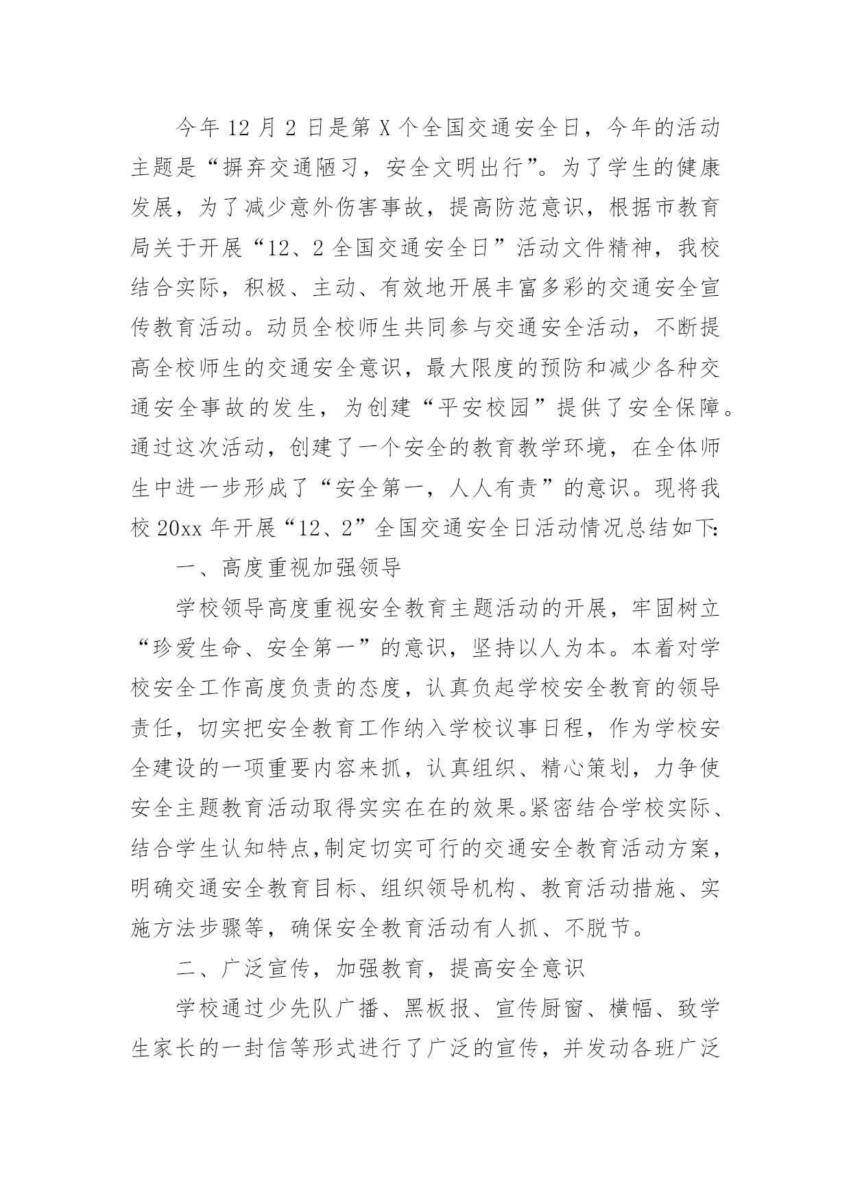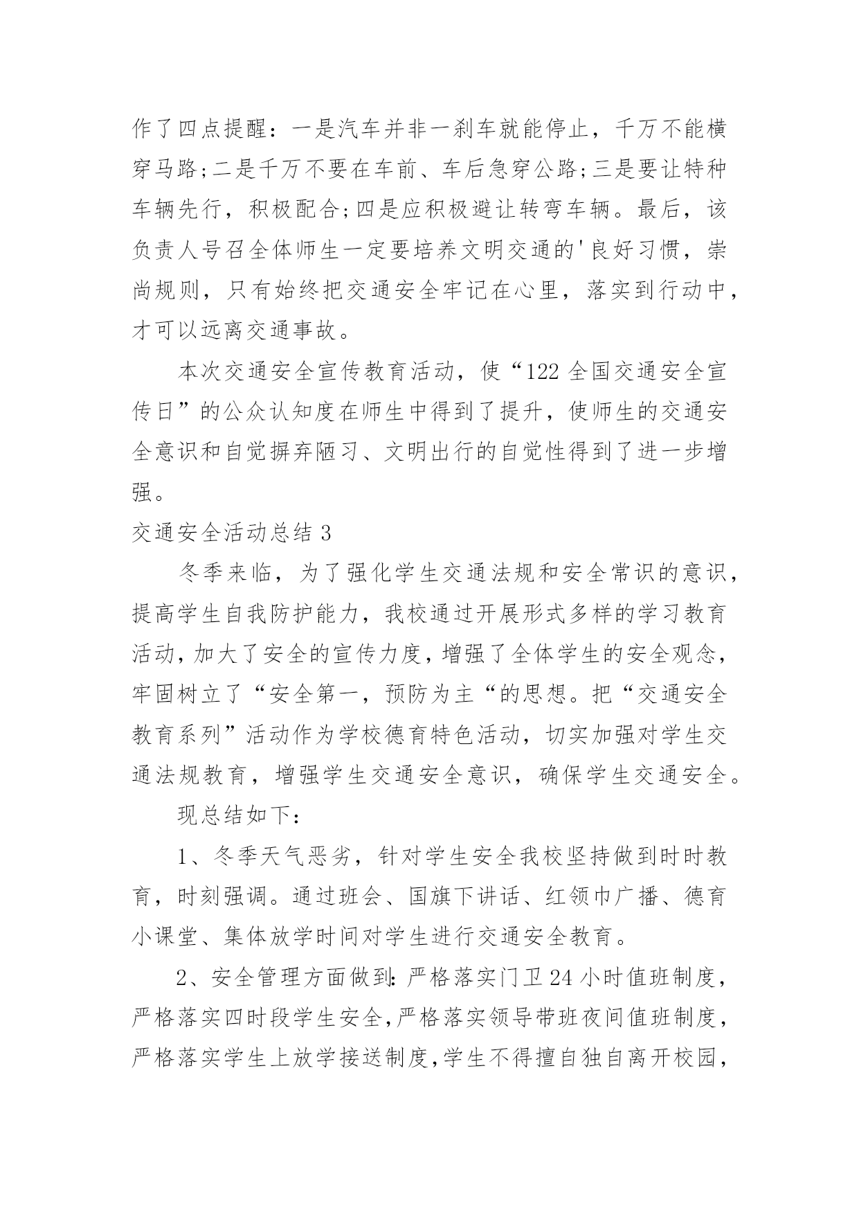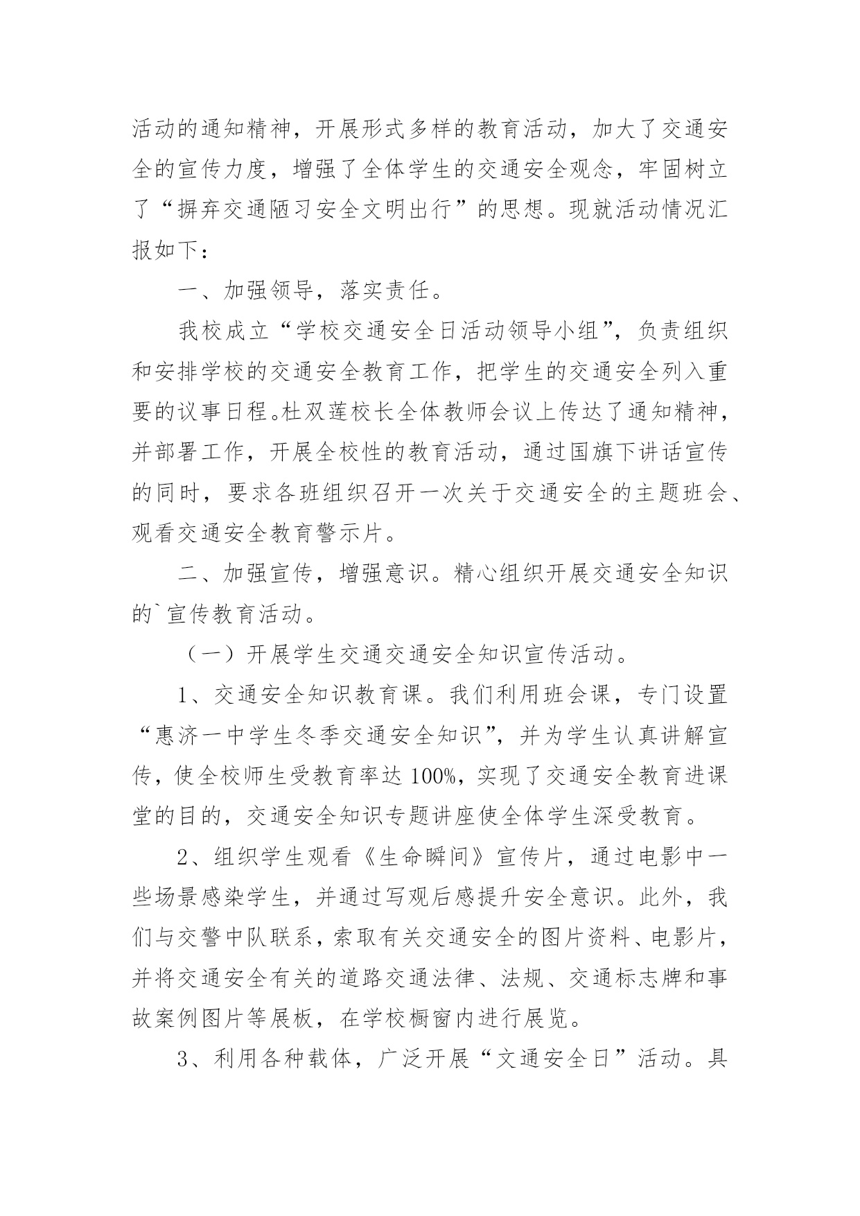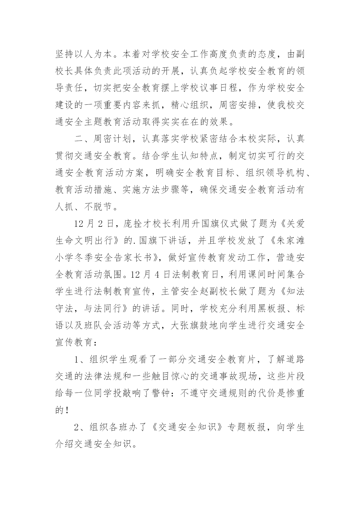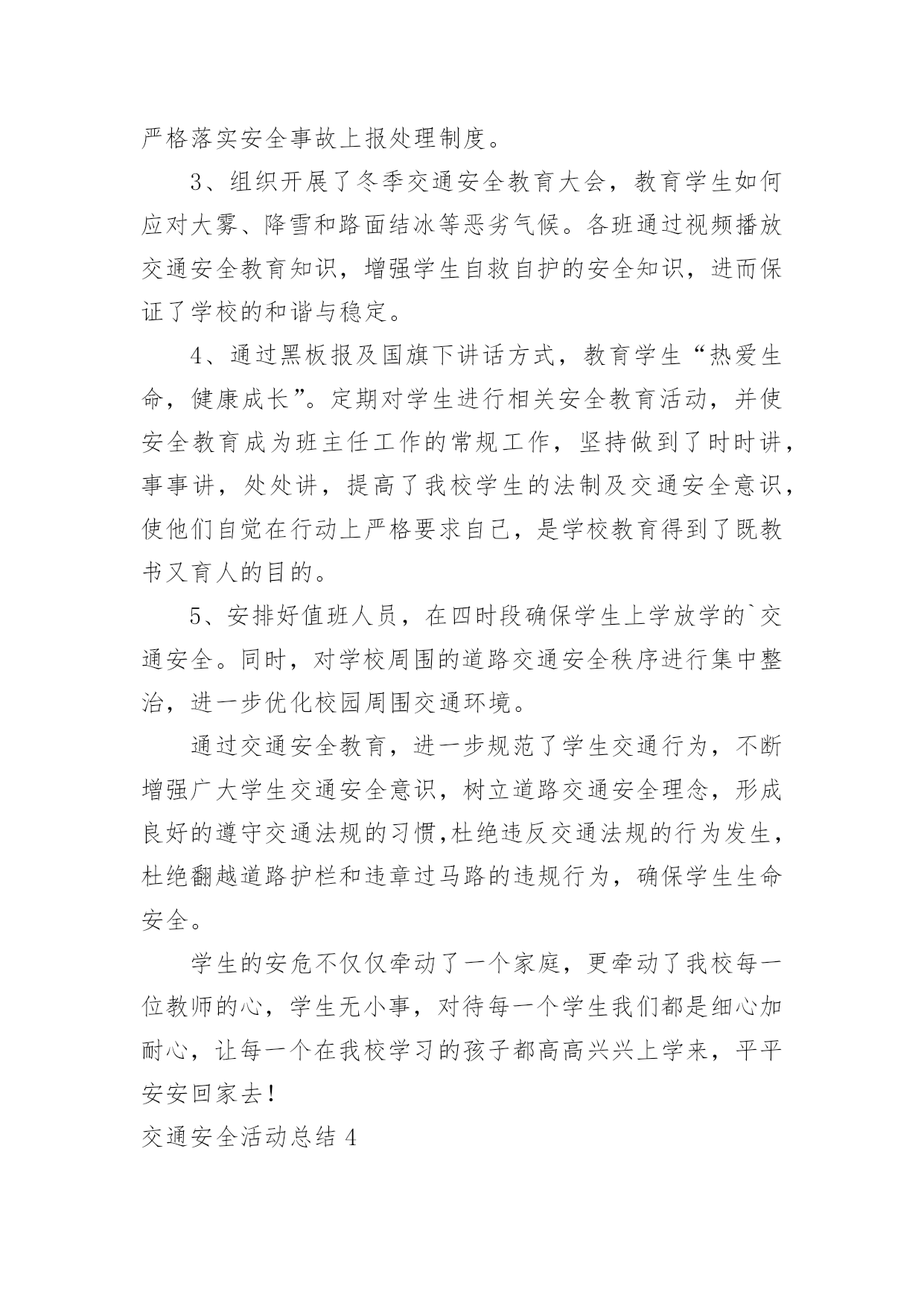 交通安全活动总结交通安全活动总结(通用15篇)总结是事后对某一阶段的学习、工作或其完成情况加以回顾和分析的一种书面材料,它可以给我们下一阶段的学习和工作生活做指导,不如静下心来好好写写总结吧。你想知道总结怎么写吗?以下是小编为大家收集的交通安全活动总结,欢迎大家分享。交通安全活动总结1镇教育组:今年12月2日,是我国第三个“国家交通安全日”,我校按照宝鸡市实施“文明交通行动计划”领导小组办公室《关于认真开展20xx年“全国交通安全日”主题活动的通知》(宝文交办《20xx》1号)要求,我校全面深入抓好安全教育工作,并结合学校实际,积极、主动、科学、有效地开展了丰富多彩的交通安全宣传教育,营造浓厚的宣传教育氛围。动员全校师生共同参与交通安全活动,不断提高全校师生的交通安全意识和应对突发事件的自救能力,最大限度地预防和减少各种事故的发生,为构建“平安校园”、“和谐校园”提供了安全保障。现就我校此项活动情况总结如下:一、高度重视,加强领导学校领导高度重视安全教育主题活动的开展,牢固树立“珍爱生命、安全第一”的意识,坚持以人为本。本着对学校安全工作高度负责的态度,由副校长具体负责此项活动的开展,认真负起学校安全教育的领导责任,切实把安全教育摆上学校议事日程,作为学校安全建设的一项重要内容来抓,精心组织,周密安排,使我校交通安全主题教育活动取得实实在在的效果。二、周密计划,认真落实学校紧密结合本校实际,认真贯彻交通安全教育。结合学生认知特点,制定切实可行的交通安全教育活动方案,明确安全教育目标、组织领导机构、教育活动措施、实施方法步骤等,确保交通安全教育活动有人抓、不脱节。12月2日,庞拴才校长利用升国旗仪式做了题为《关爱生命文明出行》的.国旗下讲话,并且学校发放了《朱家滩小学冬季安全告家长书》,做好宣传教育发动工作,营造安全教育活动氛围。12月4日法制教育日,利用课间时间集合学生进行法制教育宣传,主管安全赵副校长做了题为《知法守法,与法同行》的讲话。同时,学校充分利用黑板报、标语以及班队会活动等方式,大张旗鼓地向学生进行交通安全宣传教育:1、组织学生观看了一部分交通安全教育片,了解道路交通的法律法规和一些触目惊心的交通事故现场,这些片段给每一位同学投敲响了警钟:不遵守交通规则的代价是惨重的!2、组织各班办了《交通安全知识》专题板报,向学生介绍交通安全知识。3、利用班队会形式组织了交通安全主题班会。4、每天放学时各班都要排好整齐的队伍才可离校,各班班主任都需将学生队伍带到指定的家长接送地点。5、发放《朱家滩小学冬季安全告家长书》,提示家长重视孩子上下学的交通安全。多渠道、多形式地传播交通安全常识和教育活动,使交通安全教育真正进校园、进课堂、进学生头脑。今后,我校将继续认真组织开展交通安全宣传活动,并把这项工作常规化。结合学校实际,进一步丰富活动内容,创新活动形式,提高全校师生交通安全意识和应对突发事件、自救互救、疏散救援的能力,保障广大师生的生命安全,为创建“平安校园”、“和谐校园”提供强有力的安全保障。交通安全活动总结2今年的12月2日是我国第五个“全国交通安全日”。为进一步提升师生交通法制、安全和文明意识,积极预防道路交通事故的发生,11月28日上午,江苏省淮安市楚州中学利用国旗下讲话的机会对全校师生进行了“全国交通安全日”宣传教育活动。隆重的升旗仪式后,楚州中学校长办公室宣传工作负责人向全体师生作了题为“美好人生从安全出行开始”的专题讲话。在讲话中,他列举了一组令人吃惊的数据:我国每年发生交通事故约50万起,死亡人数超过10万人。其中中小学生占比近五分之一。该负责人强调预防交通事故发生的特效药就是崇尚规则,只有自觉遵守交通法规,掌握行人交通安全特点,才能防止交通事故的发生。该负责人向全体师生作了四点提醒:一是汽车并非一刹车就能停止,千万不能横穿马路;二是千万不要在车前、车后急穿公路;三是要让特种车辆先行,积极配合;四是应积极避让转弯车辆。最后,该负责人号召全体师生一定要培养文明交通的'良好习惯,崇尚规则,只有始终把交通安全牢记在心里,落实到行动中,才可以远离交通事故。本次交通安全宣传教育活动,使“122全国交通安全宣传日”的公众认知度在师生中得到了提升,使师生的交通安全意识和自觉摒弃陋习、文明出行的自觉性得到了进一步增强。交通安全活动总结3冬季来临,为了强化学生交通法规和安全常识的意识,提高学生自我防护能力,我校通过开展形式多样的学习教育活动,加大了安全的宣传力度,增强了全体学生的安全观念,牢固树立了“安全第一,预防为主“的思想。把“交通安全教育系列”活动作为学校德育特色活动,切实加强对学生交通法规教育,增强学生交通安全意识,确保学生交通安全。现总结如下:1、冬季天气恶劣,针对学生安全我校坚持做到时时教育,时刻强调。通过班会、国