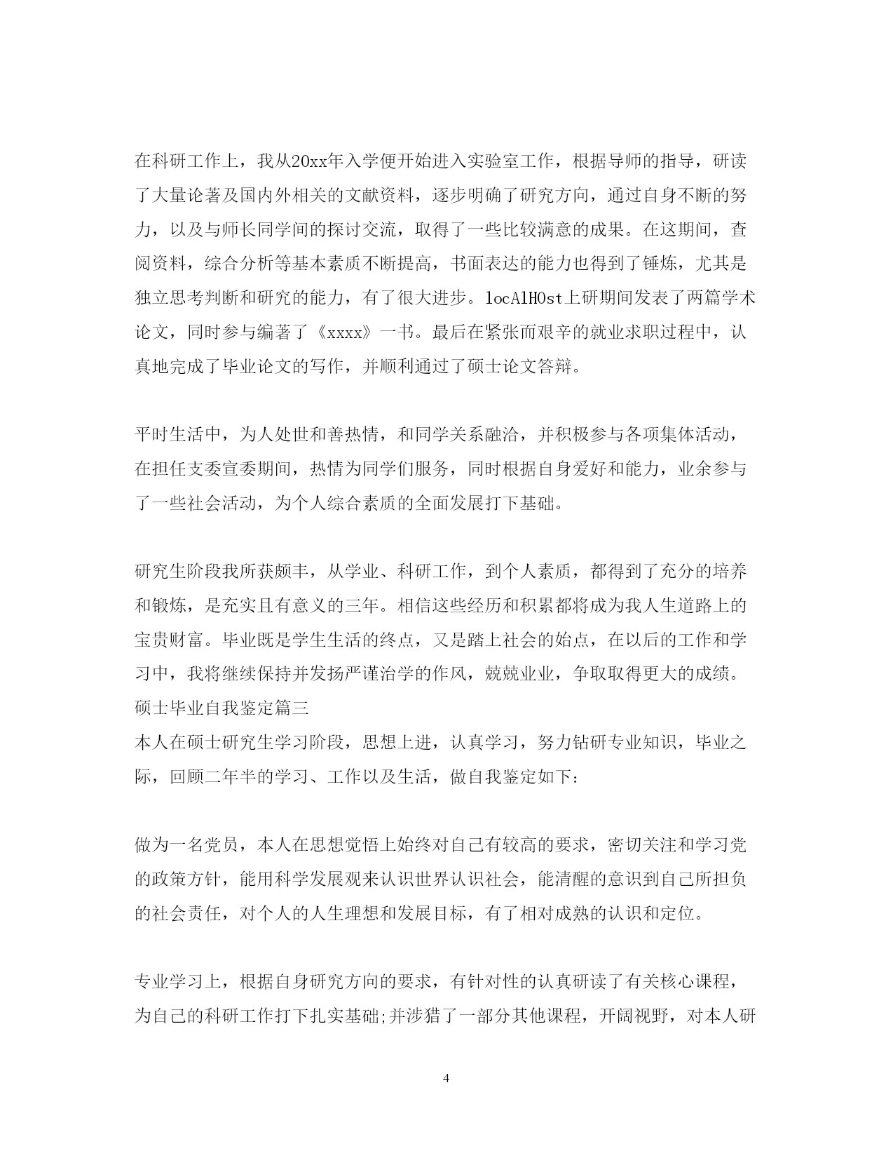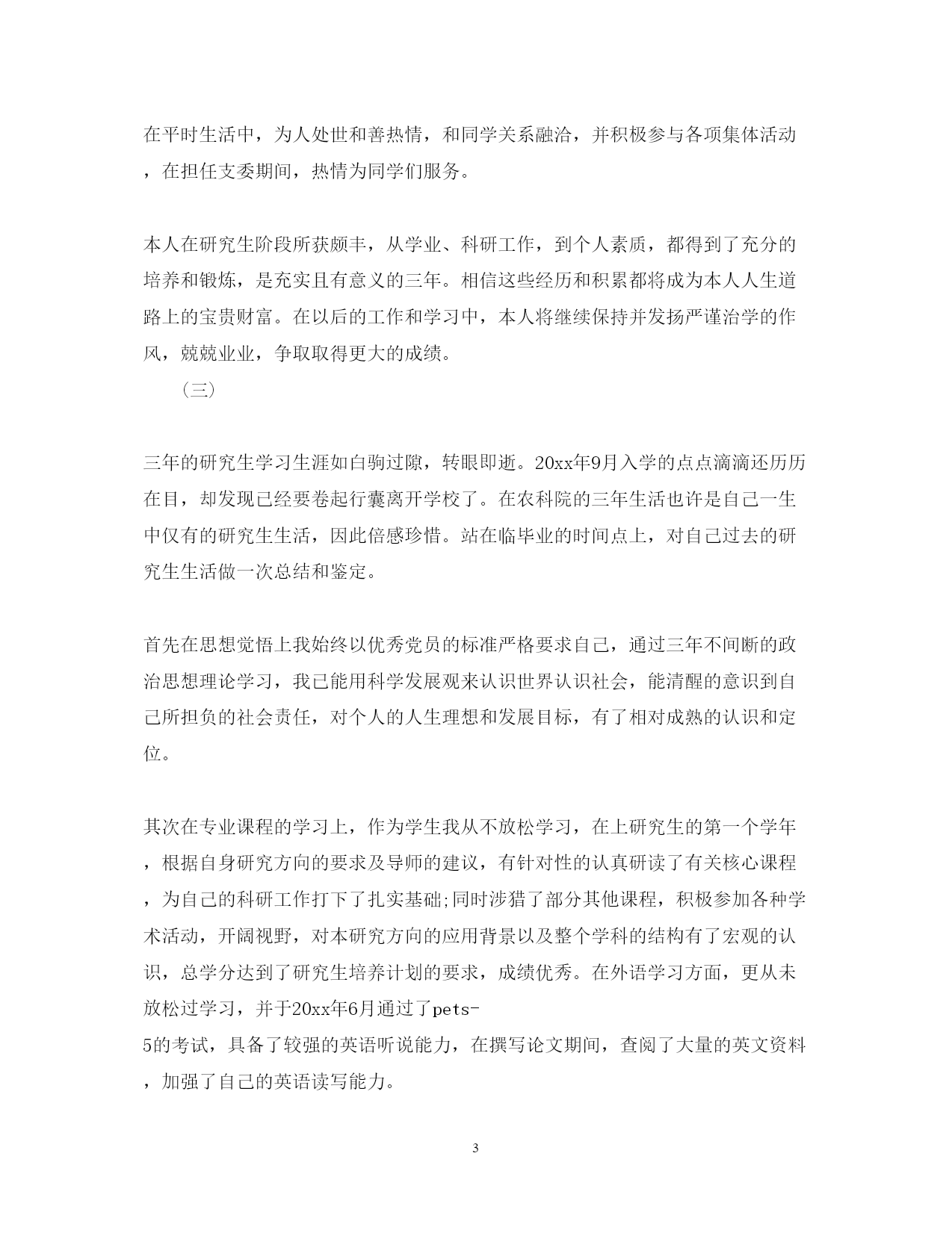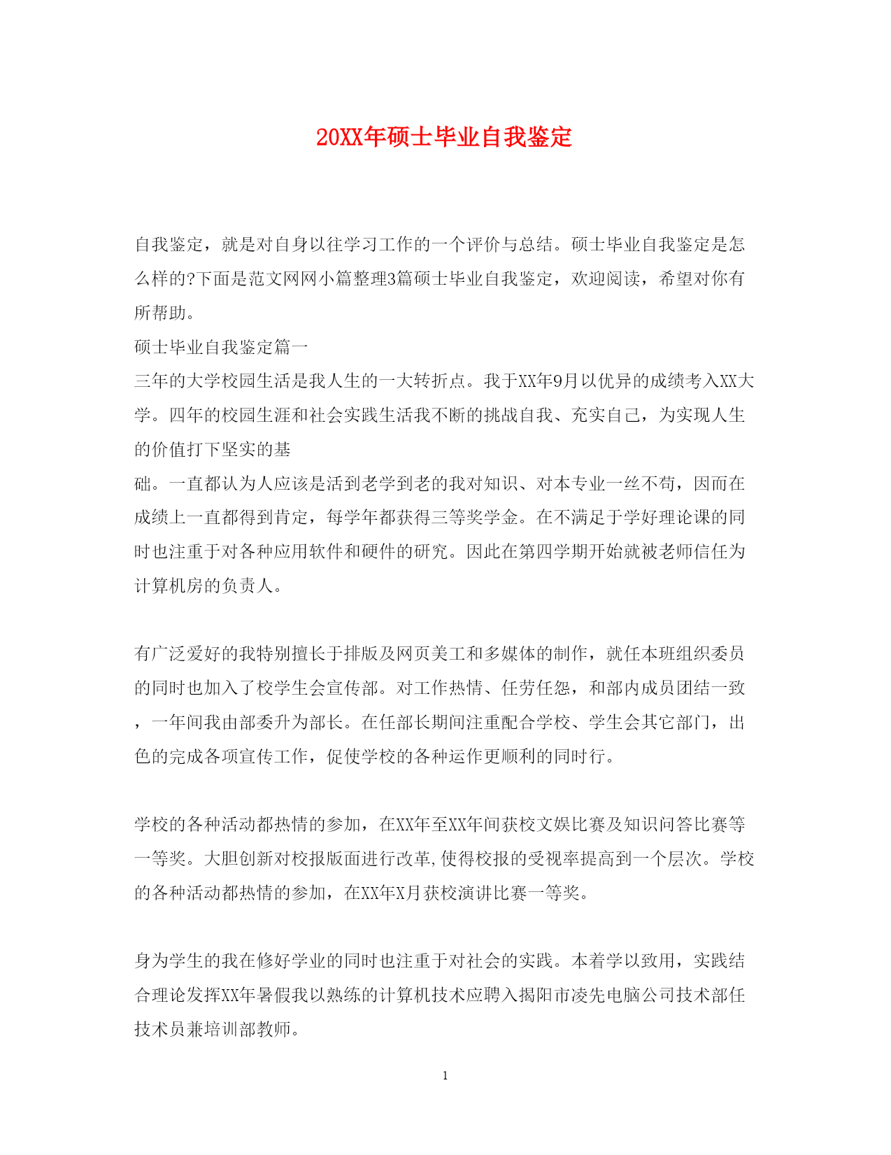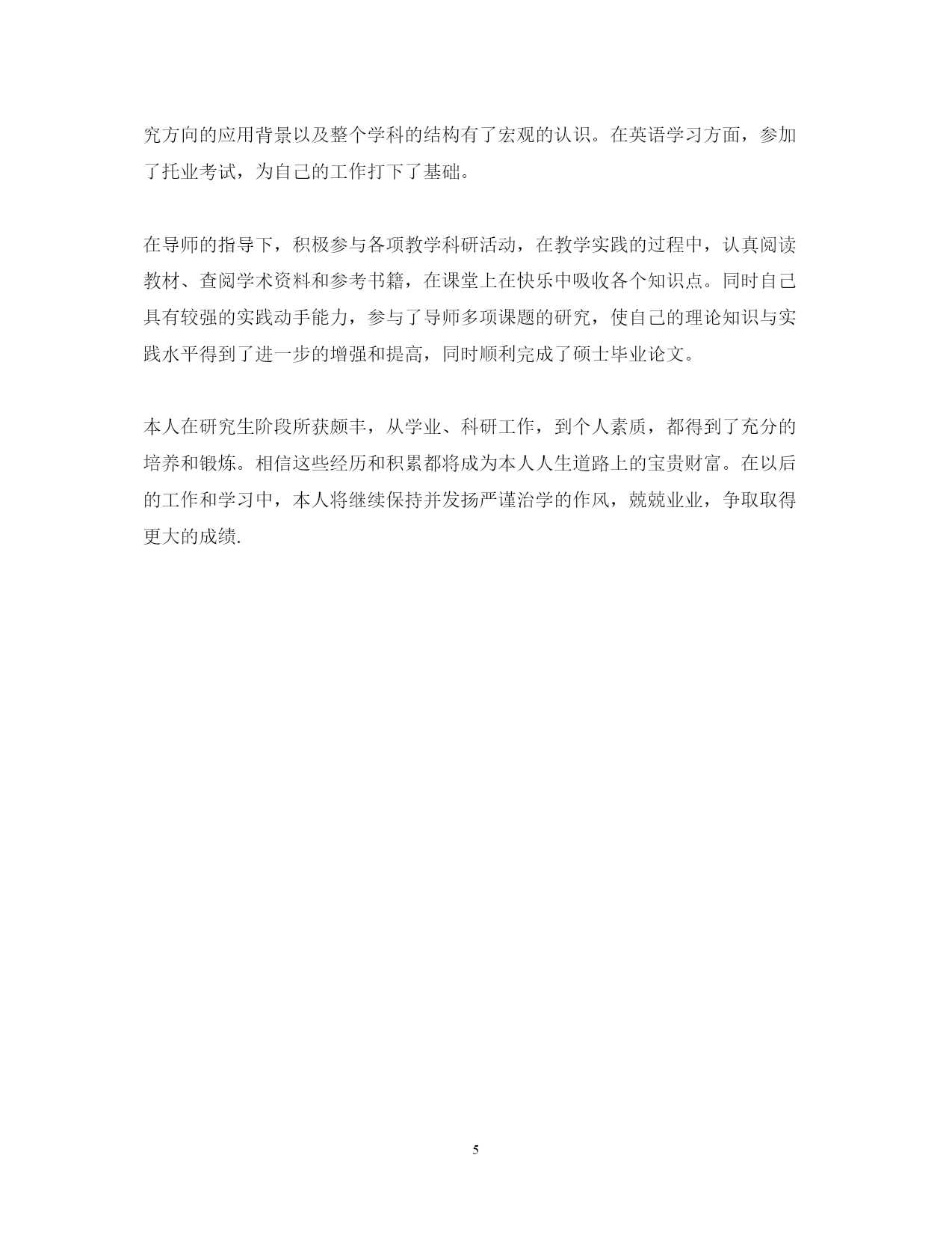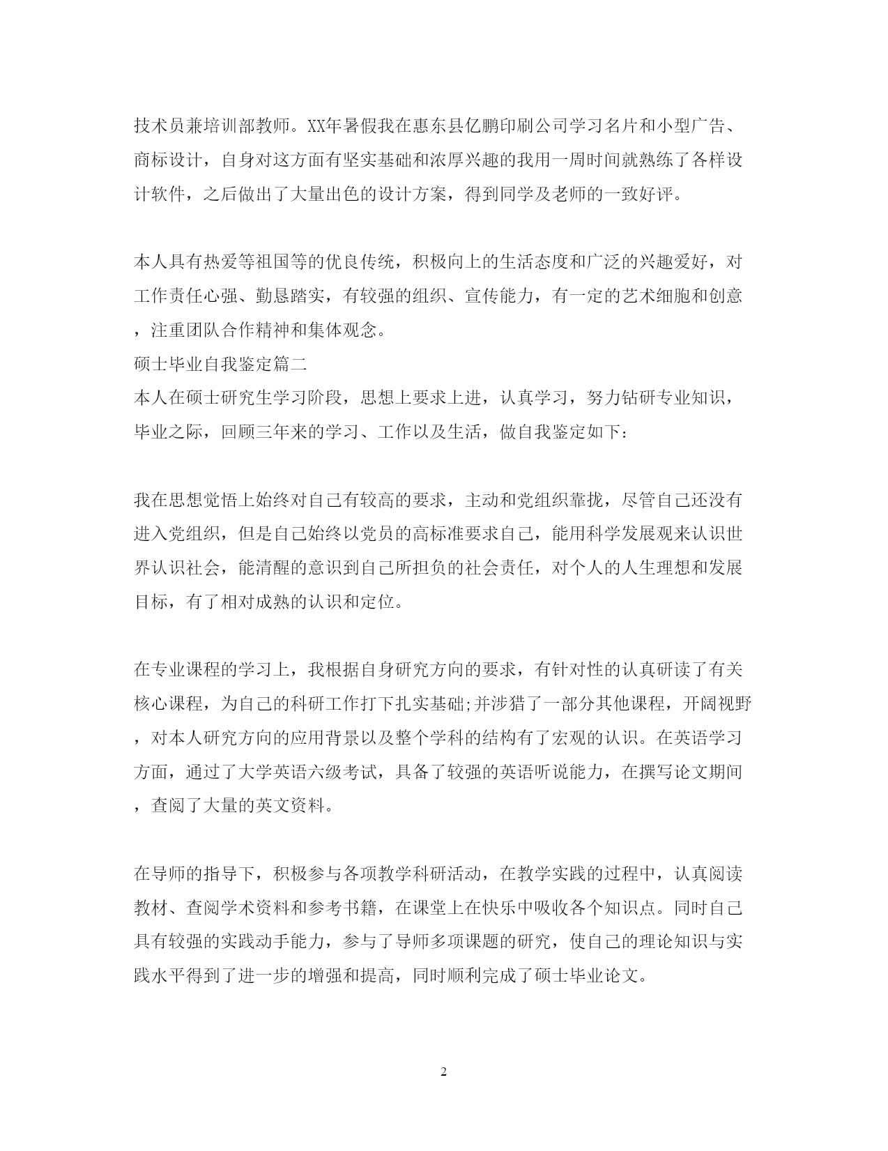 此资料由网络收集而来,如有侵权请告知上传者立即删除。资料共分享,我们负责传递知识。PAGEPAGE520XX年硕士毕业自我鉴定自我鉴定,就是对自身以往学习工作的一个评价与总结。硕士毕业自我鉴定是怎么样的?下面是范文网网小篇整理3篇硕士毕业自我鉴定,欢迎阅读,希望对你有所帮助。硕士毕业自我鉴定篇一三年的大学校园生活是我人生的一大转折点。我于XX年9月以优异的成绩考入XX大学。四年的校园生涯和社会实践生活我不断的挑战自我、充实自己,为实现人生的价值打下坚实的基础。一直都认为人应该是活到老学到老的我对知识、对本专业一丝不苟,因而在成绩上一直都得到肯定,每学年都获得三等奖学金。在不满足于学好理论课的同时也注重于对各种应用软件和硬件的研究。因此在第四学期开始就被老师信任为计算机房的负责人。有广泛爱好的我特别擅长于排版及网页美工和多媒体的制作,就任本班组织委员的同时也加入了校学生会宣传部。对工作热情、任劳任怨,和部内成员团结一致,一年间我由部委升为部长。在任部长期间注重配合学校、学生会其它部门,出色的完成各项宣传工作,促使学校的各种运作更顺利的同时行。学校的各种活动都热情的参加,在XX年至XX年间获校文娱比赛及知识问答比赛等一等奖。大胆创新对校报版面进行改革,使得校报的受视率提高到一个层次。学校的各种活动都热情的参加,在XX年X月获校演讲比赛一等奖。身为学生的我在修好学业的同时也注重于对社会的实践。本着学以致用,实践结合理论发挥XX年暑假我以熟练的计算机技术应聘入揭阳市凌先电脑公司技术部任技术员兼培训部教师。技术员兼培训部教师。XX年暑假我在惠东县亿鹏印刷公司学习名片和小型广告、商标设计,自身对这方面有坚实基础和浓厚兴趣的我用一周时间就熟练了各样设计软件,之后做出了大量出色的设计方案,得到同学及老师的一致好评。本人具有热爱等祖国等的优良传统,积极向上的生活态度和广泛的兴趣爱好,对工作责任心强、勤恳踏实,有较强的组织、宣传能力,有一定的艺术细胞和创意,注重团队合作精神和集体观念。硕士毕业自我鉴定篇二本人在硕士研究生学习阶段,思想上要求上进,认真学习,努力钻研专业知识,毕业之际,回顾三年来的学习、工作以及生活,做自我鉴定如下:我在思想觉悟上始终对自己有较高的要求,主动和党组织靠拢,尽管自己还没有进入党组织,但是自己始终以党员的高标准要求自己,能用科学发展观来认识世界认识社会,能清醒的意识到自己所担负的社会责任,对个人的人生理想和发展目标,有了相对成熟的认识和定位。在专业课程的学习上,我根据自身研究方向的要求,有针对性的认真研读了有关核心课程,为自己的科研工作打下扎实基础;并涉猎了一部分其他课程,开阔视野,对本人研究方向的应用背景以及整个学科的结构有了宏观的认识。在英语学习方面,通过了大学英语六级考试,具备了较强的英语听说能力,在撰写论文期间,查阅了大量的英文资料。在导师的指导下,积极参与各项教学科研活动,在教学实践的过程中,认真阅读教材、查阅学术资料和参考书籍,在课堂上在快乐中吸收各个知识点。同时自己具有较强的实践动手能力,参与了导师多项课题的研究,使自己的理论知识与实践水平得到了进一步的增强和提高,同时顺利完成了硕士毕业论文。在平时生活中,为人处世和善热情,和同学关系融洽,并积极参与各项集体活动,在担任支委期间,热情为同学们服务。本人在研究生阶段所获颇丰,从学业、科研工作,到个人素质,都得到了充分的培养和锻炼,是充实且有意义的三年。相信这些经历和积累都将成为本人人生道路上的宝贵财富。在以后的工作和学习中,本人将继续保持并发扬严谨治学的作风,兢兢业业,争取取得更大的成绩。(三)三年的研究生学习生涯如白驹过隙,转眼即逝。20xx年9月入学的点点滴滴还历历在目,却发现已经要卷起行囊离开学校了。在农科院的三年生活也许是自己一生中仅有的研究生生活,因此倍感珍惜。站在临毕业的时间点上,对自己过去的研究生生活做一次总结和鉴定。首先在思想觉悟上我始终以优秀党员的标准严格要求自己,通过三年不间断的政治思想理论学习,我已能用科学发展观来认识世界认识社会,能清醒的意识到自己所担负的社会责任,对个人的人生理想和发展目标,有了相对成熟的认识和定位。其次在专业课程的学习上,作为学生我从不放松学习,在上研究生的第一个学年,根据自身研究方向的要求及导师的建议,有针对性的认真研读了有关核心课程,为自己的科研工作打下了扎实基础;同时涉猎了部分其他课程,积极参加各种学术活动,开阔视野,对本研究方向的应用背景以及整个学科的结构有了宏观的认识,总学分达到了研究生培养计划的要求,成绩优秀。在外语学习方面,更从未放松过学习,并于20xx年6月通过了pets-5的考试,具备了较强的英语听说能力,在撰写论文期间,查阅了大量的英文资料,加