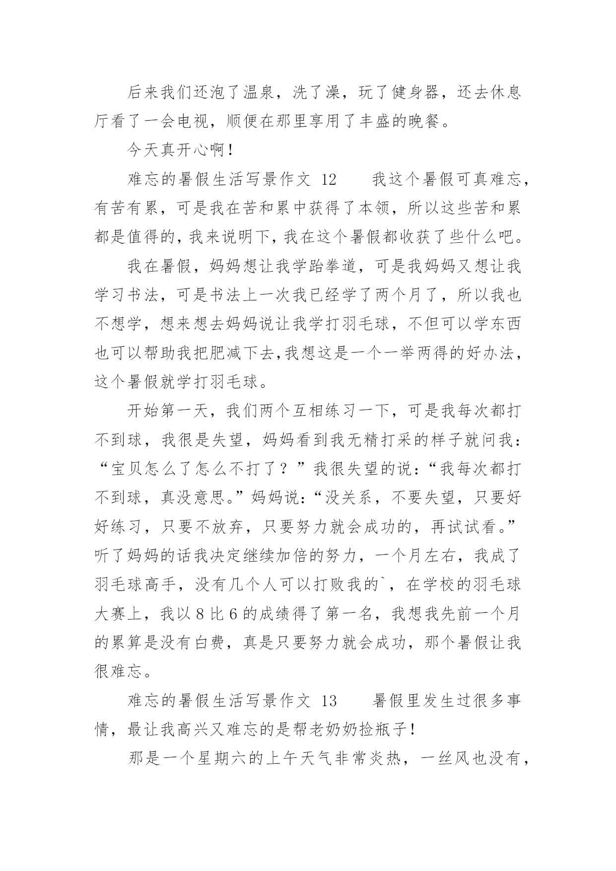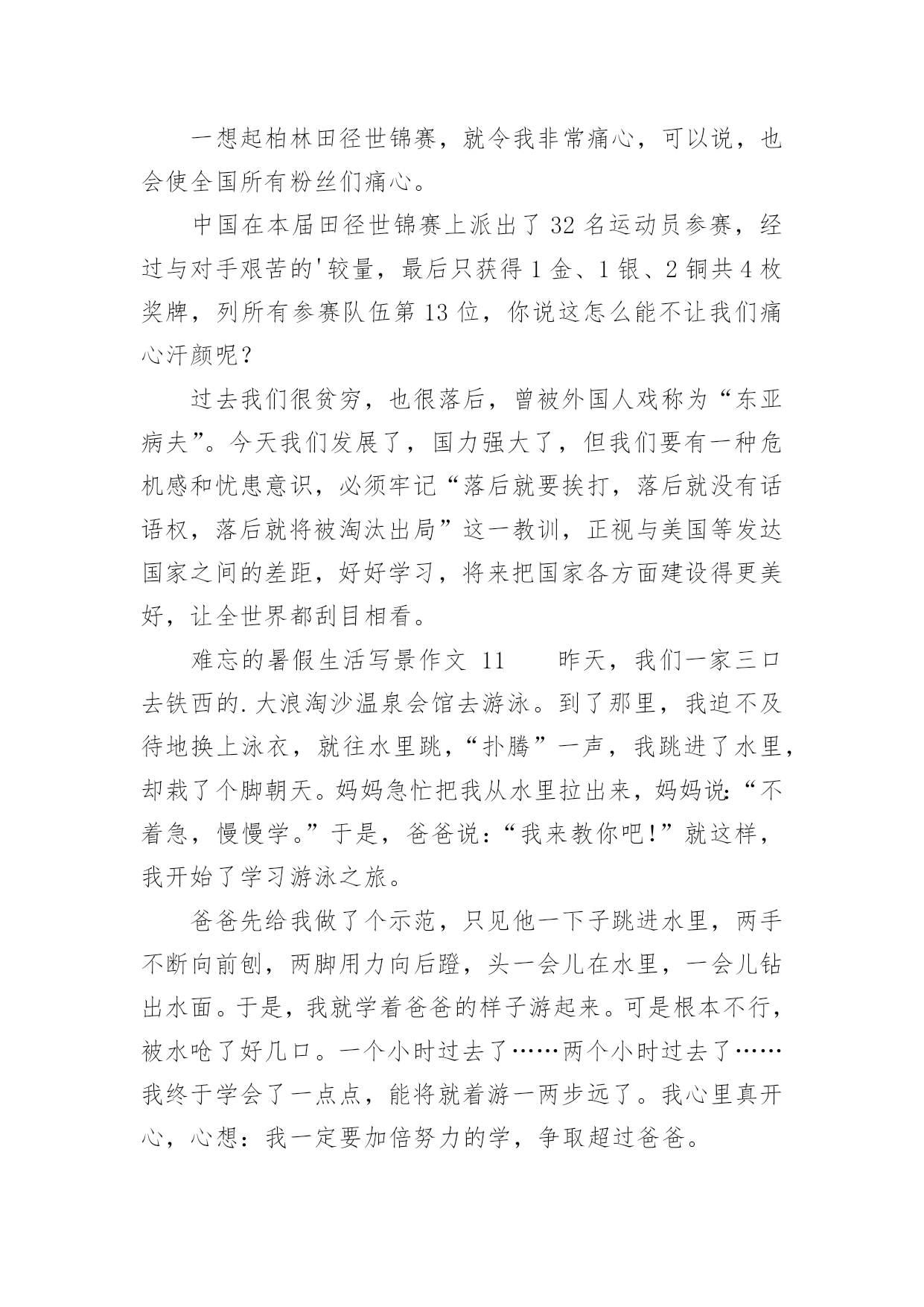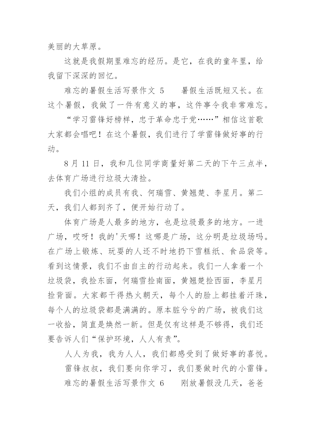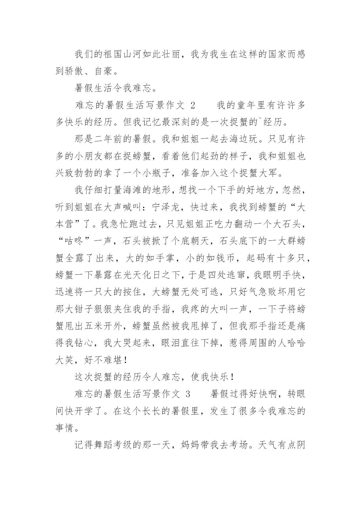 难忘的暑假生活写景作文难忘的暑假生活写景作文(精选51篇)大家都写过作文,肯定对各类作文都很熟悉吧,尤其是作文中不可忽视的写景作文,写景作文是记叙文的一种,通常指以写景为主的文章。那要怎么写好这类型的作文呢?以下是小编为大家整理的难忘的暑假生活写景作文,欢迎大家分享。难忘的暑假生活写景作文1我的暑假生活丰富多彩。我和爸爸妈妈去美丽的海南岛旅游,那里美丽级了令我流连忘返。我和爸爸妈妈来到海南岛,那里有波涛汹涌的大海,和那里的特产——椰子。我们来到大海边。大海给我的第一种感觉就是大海真大啊!浩翰无比。蓝天碧水,如一副美丽的图画。我被这美丽的景色深深的吸引住了。早晨,蔚蓝的大海如一位身着蓝砂裙的姑娘,在那美丽的沙滩上,有许许多多美丽的贝壳,被那红色的朝阳照着,发出点点光斑,绚丽多彩。中午,大海千变万化。有时风平浪静,有时却波涛汹涌。波涛汹涌的海浪,撞在坚硬的礁石上,溅起洁白的浪花这又是一副美丽的'图画啊!傍晚,天上的正西方,出现一团团红色的火烧云,美丽极了。这些夕阳照在海面上,发出五颜六色的色彩,这些色彩在画家的调色板上是很难调出来的。我们的祖国山河如此壮丽,我为我生在这样的国家而感到骄傲、自豪。暑假生活令我难忘。难忘的暑假生活写景作文2我的童年里有许许多多快乐的经历。但我记忆最深刻的是一次捉蟹的`经历。那是二年前的暑假。我和姐姐一起去海边玩。只见有许多的小朋友都在捉螃蟹,看着他们起劲的样子,我和姐姐也兴致勃勃的拿了一个小瓶子,准备加入这个捉蟹大军。我仔细打量海滩的地形,想找一个下手的好地方,忽然,听到姐姐在大声喊叫:宁泽龙,快过来,我找到螃蟹的“大本营”了。我急忙跑过去,只见姐姐正吃力翻动一个大石头,“咕咚”一声,石头被掀了个底朝天,石头底下的一大群螃蟹全露了出来,大的如手掌,小的如钱币,起码有十多只,螃蟹一下暴露在光天化日之下,于是四处逃窜,我眼明手快,迅速将一只大的按住,大螃蟹无处可逃,只好气急败坏用它那大钳子狠狠夹住我的手指,我疼的大叫一声,一下子将螃蟹甩出五米开外,螃蟹虽然被我甩掉了,但我那手指还是痛得我钻心,我大哭起来,眼泪直往下掉,惹得周围的人哈哈大笑,好不难堪!这次捉蟹的经历令人难忘,使我快乐!难忘的暑假生活写景作文3暑假过得好快啊,转眼间快开学了。在这个长长的暑假里,发生了很多令我难忘的事情。记得舞蹈考级的那一天,妈妈带我去考场。天气有点阴还有点风,相比去年的考级天气好多了。我和小朋友们一边玩一边等,考级的`时间快到了,我们在老师的带领下来到了考场外等候。过了一会儿,就到了我们考试了,老师为我们带上考牌,然后排队进入了考场。考级的音乐响了,我们跟着节奏就跳了起来。大概过了十几分钟,五级的内容便考完了。考级老师说:“真不错!真不错!”我们好高兴啊!考完级出来,妈妈问我怎么样,“还不错!”我自信地说。舞蹈考级真得令我很难忘。难忘的暑假生活写景作文4在暑假里,有许多难忘的经历,但最难忘的还是那件。暑假,妈妈带我去草原游玩,一望无际的大草原,让我产生无限的遐想。草原上有许多马儿,它们有的在悠闲地吃草,有的在抬头长嘶,有的在草原上奔跑。我兴奋地骑上一匹枣红马,让阿姨牵着马走向远方。我观赏着风景,不经意间,我发现了一种颜色呈金黄色的小花,在绿油油的小草的'衬托下显得格外醒目,我小心翼翼地拔起一棵,想要把它种在我的花盆里,微风吹拂,闻到一股沁人心脾的芳香。我问阿姨,阿姨说,它叫金盏花,不但漂亮还可以入药呢。“哦!”我恍然大悟地点点头。到达终点了,我下了马,漫步在草丛中,不时地传来音乐家蛐蛐儿美妙的歌声。我沉醉在这如诗如画的风景中。如果时间可以停留的话,我愿永远停在那一刻:如果时间可以倒流的话,我愿再经历一次有趣的旅行:如果时间可以从头再来的话,我愿再骑一次那枣红马儿,再观光一次那美丽的大草原。这就是我假期里难忘的经历。是它,在我的童年里,给我留下深深的回忆。难忘的暑假生活写景作文5暑假生活既短又长。在这个暑假,我做了一件有意义的事,这件事令我非常难忘。“学习雷锋好榜样,忠于革命忠于党……”相信这首歌大家都会唱吧!在这个暑假,我们进行了学雷锋做好事的行动。8月11日,我和几位同学商量好第二天的下午三点半,去体育广场进行垃圾大清捡。我们小组的成员有我、何瑞雪、黄翘楚、李星月。第二天,我们人都到齐了,便开始行动了。体育广场是人最多的地方,也是垃圾最多的地方。一进广场,哎呀!我的'天哪!这哪是广场,这分明是垃圾场吗。在广场上锻炼、玩耍的人还不时地扔下雪糕纸、食品袋等。看到这情景,我们不由自主的行动起来。我们一人拿着一个垃圾袋,我捡东面,何瑞雪捡南面,黄翘楚捡西面,李星月捡背面。大家都干得热火朝天,每个人的脸上都挂着汗珠,每个人的垃圾袋都是满满的。原本脏兮兮的广场,被我们这一收拾,简直是焕然一新。但是仅有这样是不够得,我们还要告诉人们