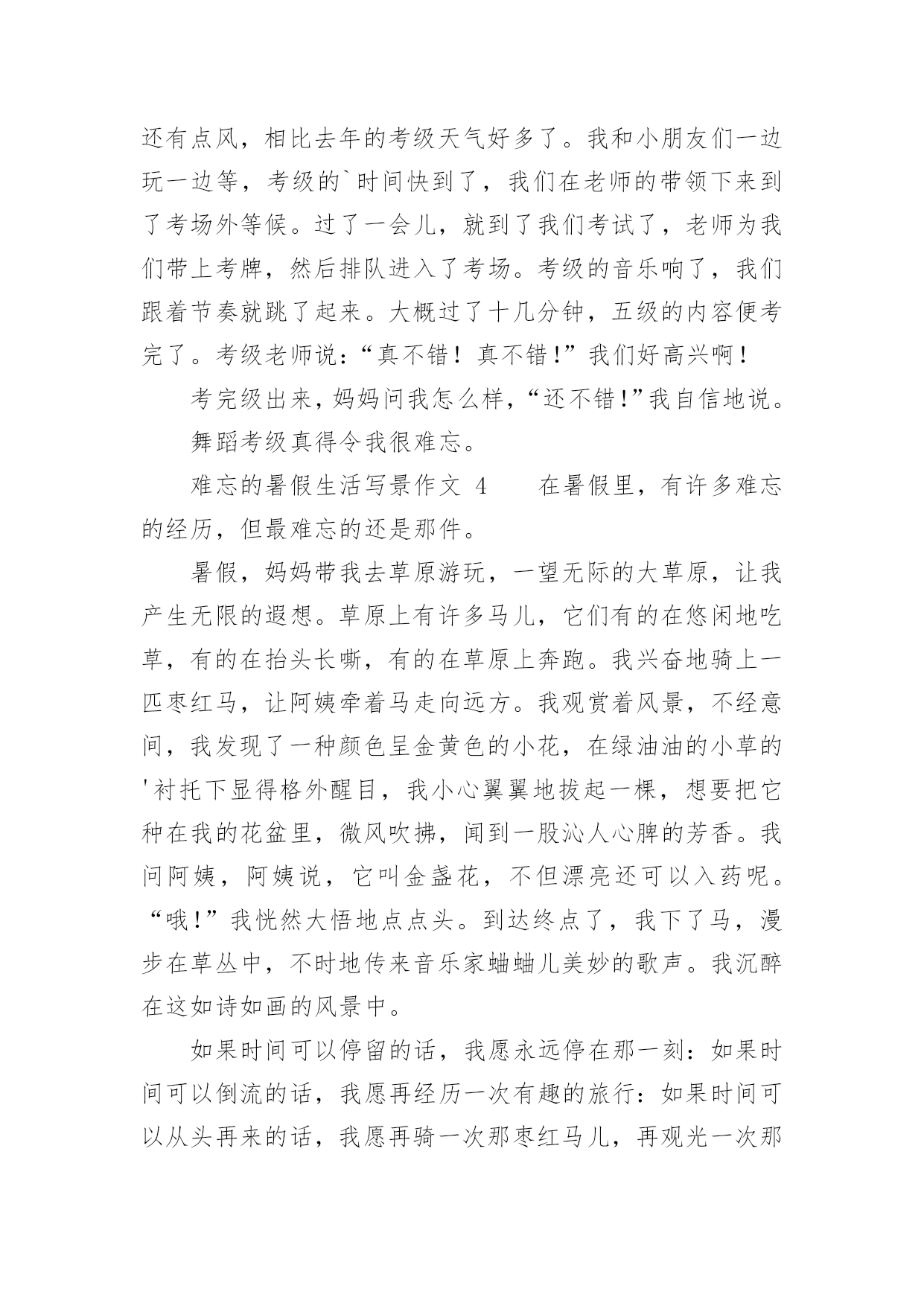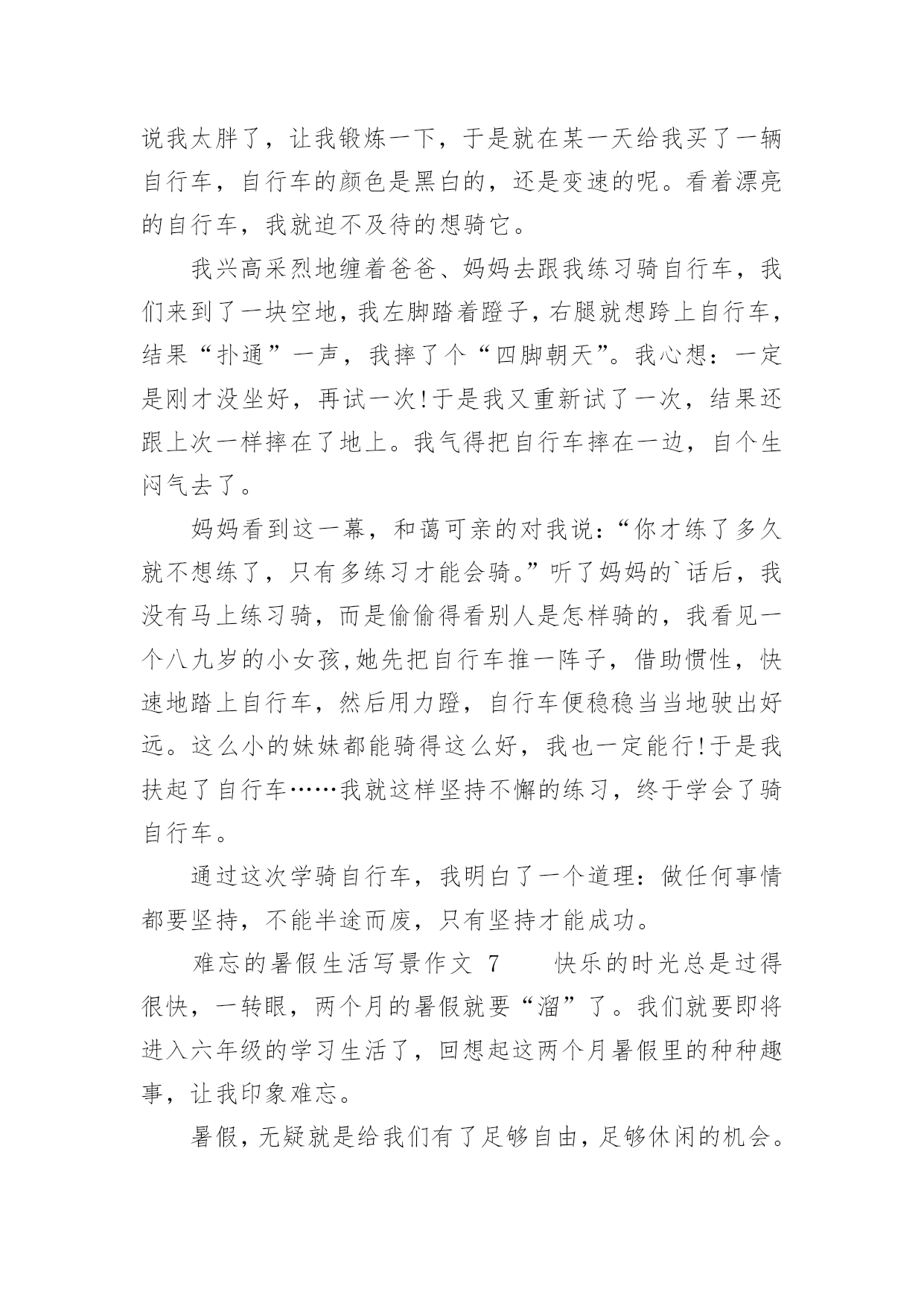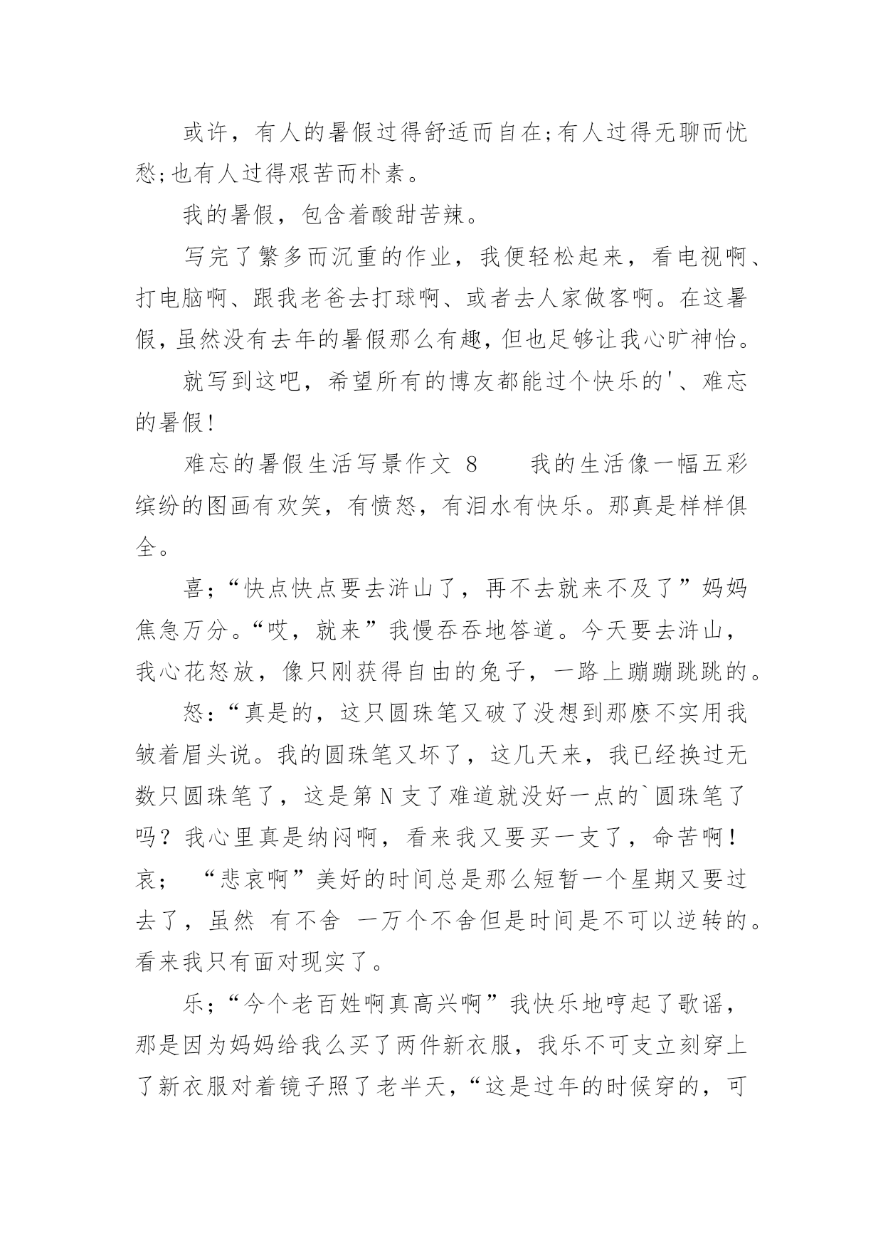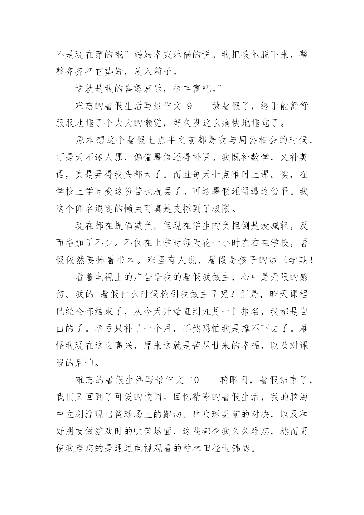 难忘的暑假生活写景作文难忘的暑假生活写景作文(精选51篇)大家都写过作文,肯定对各类作文都很熟悉吧,尤其是作文中不可忽视的写景作文,写景作文是记叙文的一种,通常指以写景为主的文章。那要怎么写好这类型的作文呢?以下是小编为大家整理的难忘的暑假生活写景作文,欢迎大家分享。难忘的暑假生活写景作文1我的暑假生活丰富多彩。我和爸爸妈妈去美丽的海南岛旅游,那里美丽级了令我流连忘返。我和爸爸妈妈来到海南岛,那里有波涛汹涌的大海,和那里的特产——椰子。我们来到大海边。大海给我的第一种感觉就是大海真大啊!浩翰无比。蓝天碧水,如一副美丽的图画。我被这美丽的景色深深的吸引住了。早晨,蔚蓝的大海如一位身着蓝砂裙的姑娘,在那美丽的沙滩上,有许许多多美丽的贝壳,被那红色的朝阳照着,发出点点光斑,绚丽多彩。中午,大海千变万化。有时风平浪静,有时却波涛汹涌。波涛汹涌的海浪,撞在坚硬的礁石上,溅起洁白的浪花这又是一副美丽的'图画啊!傍晚,天上的正西方,出现一团团红色的火烧云,美丽极了。这些夕阳照在海面上,发出五颜六色的色彩,这些色彩在画家的调色板上是很难调出来的。我们的祖国山河如此壮丽,我为我生在这样的国家而感到骄傲、自豪。暑假生活令我难忘。难忘的暑假生活写景作文2我的童年里有许许多多快乐的经历。但我记忆最深刻的是一次捉蟹的`经历。那是二年前的暑假。我和姐姐一起去海边玩。只见有许多的小朋友都在捉螃蟹,看着他们起劲的样子,我和姐姐也兴致勃勃的拿了一个小瓶子,准备加入这个捉蟹大军。我仔细打量海滩的地形,想找一个下手的好地方,忽然,听到姐姐在大声喊叫:宁泽龙,快过来,我找到螃蟹的“大本营”了。我急忙跑过去,只见姐姐正吃力翻动一个大石头,“咕咚”一声,石头被掀了个底朝天,石头底下的一大群螃蟹全露了出来,大的如手掌,小的如钱币,起码有十多只,螃蟹一下暴露在光天化日之下,于是四处逃窜,我眼明手快,迅速将一只大的按住,大螃蟹无处可逃,只好气急败坏用它那大钳子狠狠夹住我的手指,我疼的大叫一声,一下子将螃蟹甩出五米开外,螃蟹虽然被我甩掉了,但我那手指还是痛得我钻心,我大哭起来,眼泪直往下掉,惹得周围的人哈哈大笑,好不难堪!这次捉蟹的经历令人难忘,使我快乐!难忘的暑假生活写景作文3暑假过得好快啊,转眼间快开学了。在这个长长的暑假里,发生了很多令我难忘的事情。记得舞蹈考级的那一天,妈妈带我去考场。天气有点阴还有点风,相比去年的考级天气好多了。我和小朋友们一边玩一边等,考级的`时间快到了,我们在老师的带领下来到了考场外等候。过了一会儿,就到了我们考试了,老师为我们带上考牌,然后排队进入了考场。考级的音乐响了,我们跟着节奏就跳了起来。大概过了十几分钟,五级的内容便考完了。考级老师说:“真不错!真不错!”我们好高兴啊!考完级出来,妈妈问我怎么样,“还不错!”我自信地说。舞蹈考级真得令我很难忘。难忘的暑假生活写景作文4在暑假里,有许多难忘的经历,但最难忘的还是那件。暑假,妈妈带我去草原游玩,一望无际的大草原,让我产生无限的遐想。草原上有许多马儿,它们有的在悠闲地吃草,有的在抬头长嘶,有的在草原上奔跑。我兴奋地骑上一匹枣红马,让阿姨牵着马走向远方。我观赏着风景,不经意间,我发现了一种颜色呈金黄色的小花,在绿油油的小草的'衬托下显得格外醒目,我小心翼翼地拔起一棵,想要把它种在我的花盆里,微风吹拂,闻到一股沁人心脾的芳香。我问阿姨,阿姨说,它叫金盏花,不但漂亮还可以入药呢。“哦!”我恍然大悟地点点头。到达终点了,我下了马,漫步在草丛中,不时地传来音乐家蛐蛐儿美妙的歌声。我沉醉在这如诗如画的风景中。如果时间可以停留的话,我愿永远停在那一刻:如果时间可以倒流的话,我愿再经历一次有趣的旅行:如果时间可以从头再来的话,我愿再骑一次那枣红马儿,再观光一次那美丽的大草原。这就是我假期里难忘的经历。是它,在我的童年里,给我留下深深的回忆。难忘的暑假生活写景作文5暑假生活既短又长。在这个暑假,我做了一件有意义的事,这件事令我非常难忘。“学习雷锋好榜样,忠于革命忠于党……”相信这首歌大家都会唱吧!在这个暑假,我们进行了学雷锋做好事的行动。8月11日,我和几位同学商量好第二天的下午三点半,去体育广场进行垃圾大清捡。我们小组的成员有我、何瑞雪、黄翘楚、李星月。第二天,我们人都到齐了,便开始行动了。体育广场是人最多的地方,也是垃圾最多的地方。一进广场,哎呀!我的'天哪!这哪是广场,这分明是垃圾场吗。在广场上锻炼、玩耍的人还不时地扔下雪糕纸、食品袋等。看到这情景,我们不由自主的行动起来。我们一人拿着一个垃圾袋,我捡东面,何瑞雪捡南面,黄翘楚捡西面,李星月捡背面。大家都干得热火朝天,每个人的脸上都挂着汗珠,每个人的垃圾袋都是满满的。原本脏兮兮的广场,被我们这一收拾,简直是焕然一新。但是仅有这样是不够得,我们还要告诉人们