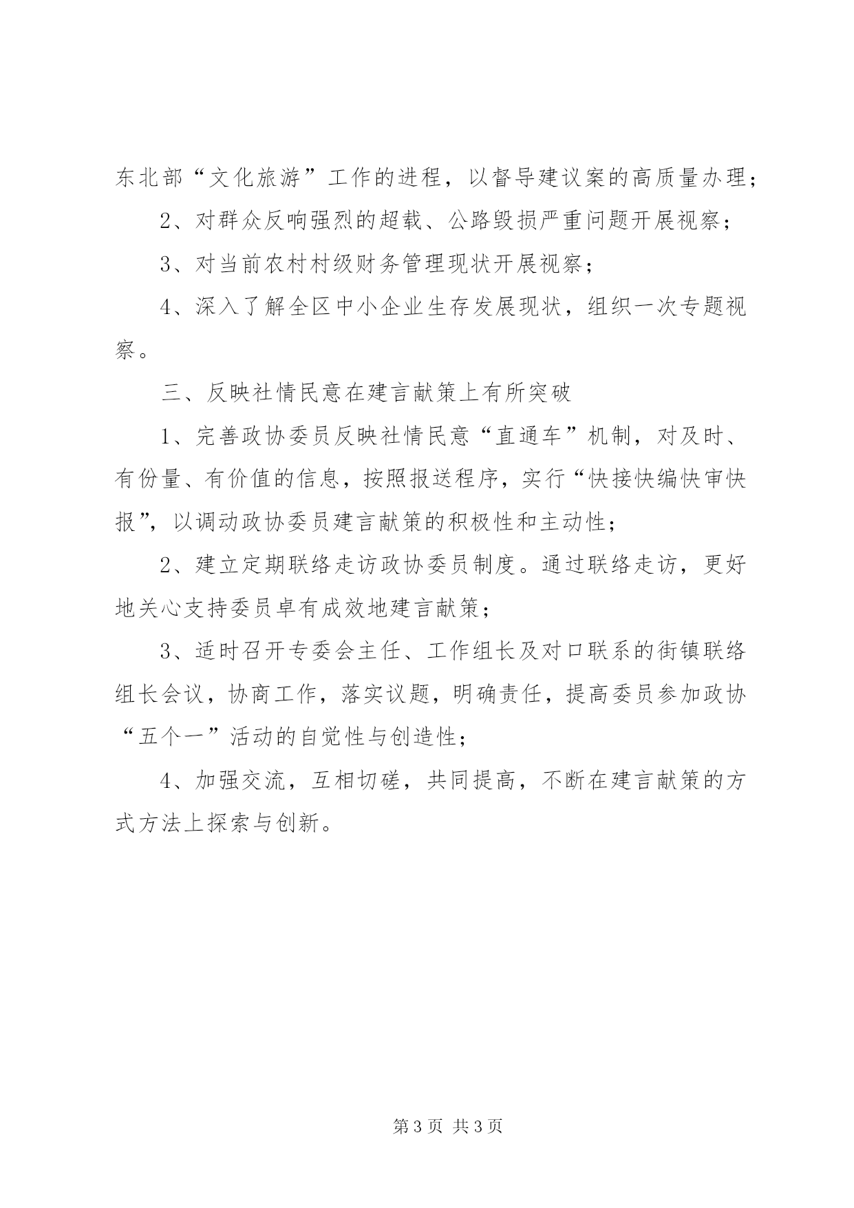 第PAGE\*Arabic\*MERGEFORMAT3页共NUMPAGES\*MERGEFORMAT3页政协经济科工作计划编者按:本文主要从深入调研,在参政议政方面有所作为;开展视察,在民主监督方式上有所创新;反映社情民意,在建言献策上有所突破进行讲述。其中,主要包括:围绕中央出台的惠农政策,调研政策的落实到位情况,了解实施过程中存在哪些“肠硬阻”,出现哪些新问题、不断提高调研质量,为委员调研提供力所能及的帮助与支持;探索开辟新渠道,以转化委员的调研成果、围绕经济发展和民生问题,在热点、难点、疑点方面由委员自选课题,以发挥委员的自身特色和聪明才智、深入了解全区中小企业生存发展现状,组织一次专题视察、对当前农村村级财务管理现状开展视察、开展“我区东北部生态文化旅游”专项视察、对群众反响强烈的超载、公路毁损严重问题开展视察、建立定期联络走访政协委员制度、完善政协委员反映社情民意“直通车”机制、适时召开专委会主任、工作组长及对口联系的街镇联络组长会议,协商工作,落实议题,明确责任,提高委员参加政协“五个一”活动的自觉性与创造性、加强交流,互相切磋,共同提高,不断在建言献策的方式方法上探索与创新等,具体材料请详见:2010年是实施“十一五”规划的最后一年,也是区政协围绕全区经济发展出智出力、献计献策最关键的一年。经济科技委员会在政协常委会和主席会议领导下,根据政协章程要求,结合自身特色与职责,更紧密地咬住全区发展目标,充分发挥好委员的主体作用及界别的专业作用,不失时机,不遗余力地做好民主监督和参政议政工作,为我区各项工作再上台阶擂鼓助威。据此,提出本年度工作计划:一、深入调研在参政议政方面有所作为根据区政协的总体安排,结合经济科技委自身的实际,紧紧围绕区委区政府的工作重心以及我区经济社会发展过程中的热点、焦点、难点,遴选好专题,精心组织一批过硬的政协委员,开展有针对性的调研活动。1、围绕中央出台的惠农政策,调研政策的落实到位情况,了解实施过程中存在哪些“肠硬阻”,出现哪些新问题;2、围绕经济发展和民生问题,在热点、难点、疑点方面由委员自选课题,以发挥委员的自身特色和聪明才智;3、围绕“工业xx”做文章,调研全区财政收入现状、潜在实力及发展后劲;4、不断提高调研质量,为委员调研提供力所能及的帮助与支持;探索开辟新渠道,以转化委员的调研成果。二、开展视察在民主监督方式上有所创新组织政协委员开展视察,是民主监督的有效手段之一。2010年,我们将借督办建议案和重点提案的契机,组织政协委员开展专项视察活动。1、开展“我区东北部生态文化旅游”专项视察,了解我区东北部“文化旅游”工作的进程,以督导建议案的高质量办理;2、对群众反响强烈的超载、公路毁损严重问题开展视察;3、对当前农村村级财务管理现状开展视察;4、深入了解全区中小企业生存发展现状,组织一次专题视察。三、反映社情民意在建言献策上有所突破1、完善政协委员反映社情民意“直通车”机制,对及时、有份量、有价值的信息,按照报送程序,实行“快接快编快审快报”,以调动政协委员建言献策的积极性和主动性;2、建立定期联络走访政协委员制度。通过联络走访,更好地关心支持委员卓有成效地建言献策;3、适时召开专委会主任、工作组长及对口联系的街镇联络组长会议,协商工作,落实议题,明确责任,提高委员参加政协“五个一”活动的自觉性与创造性;4、加强交流,互相切磋,共同提高,不断在建言献策的方式方法上探索与创新。