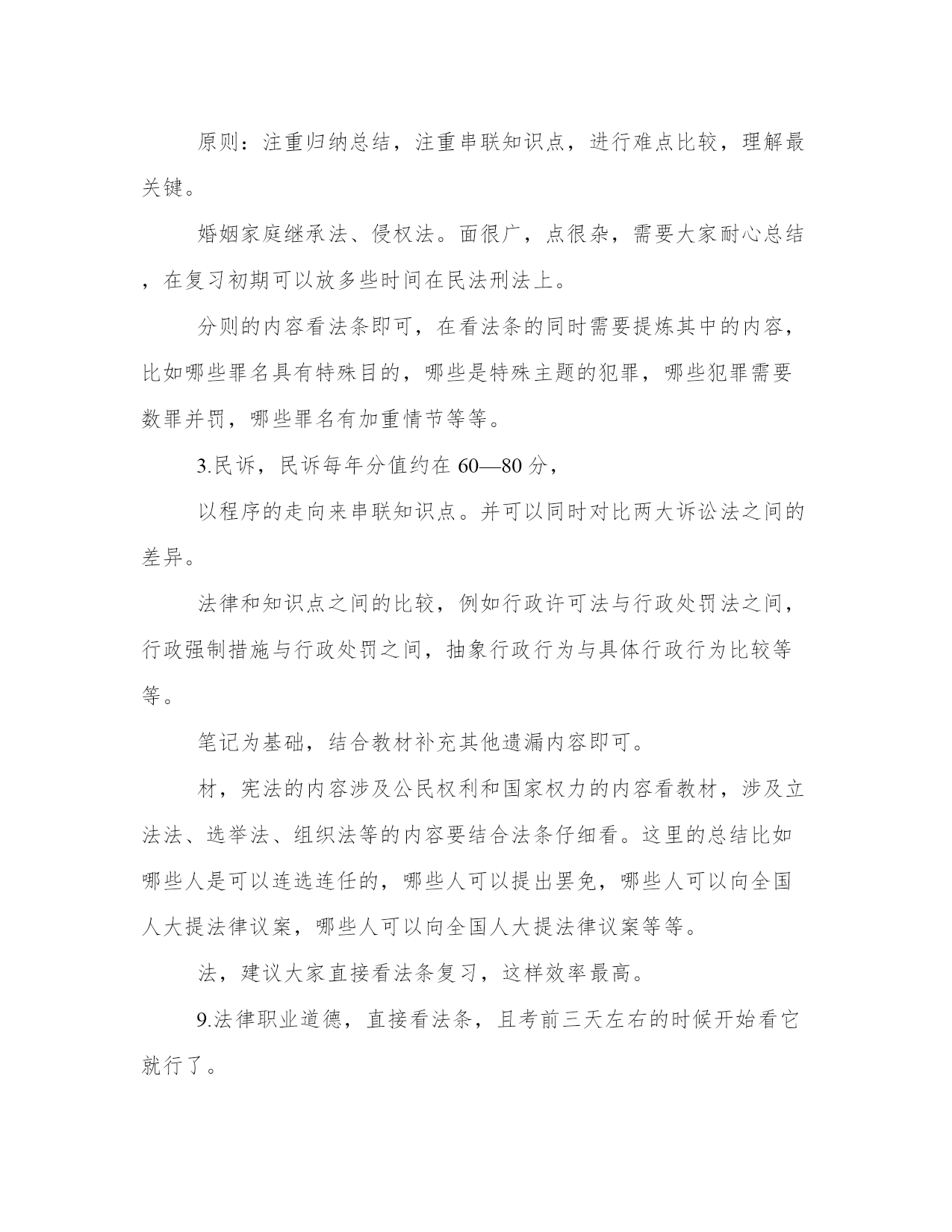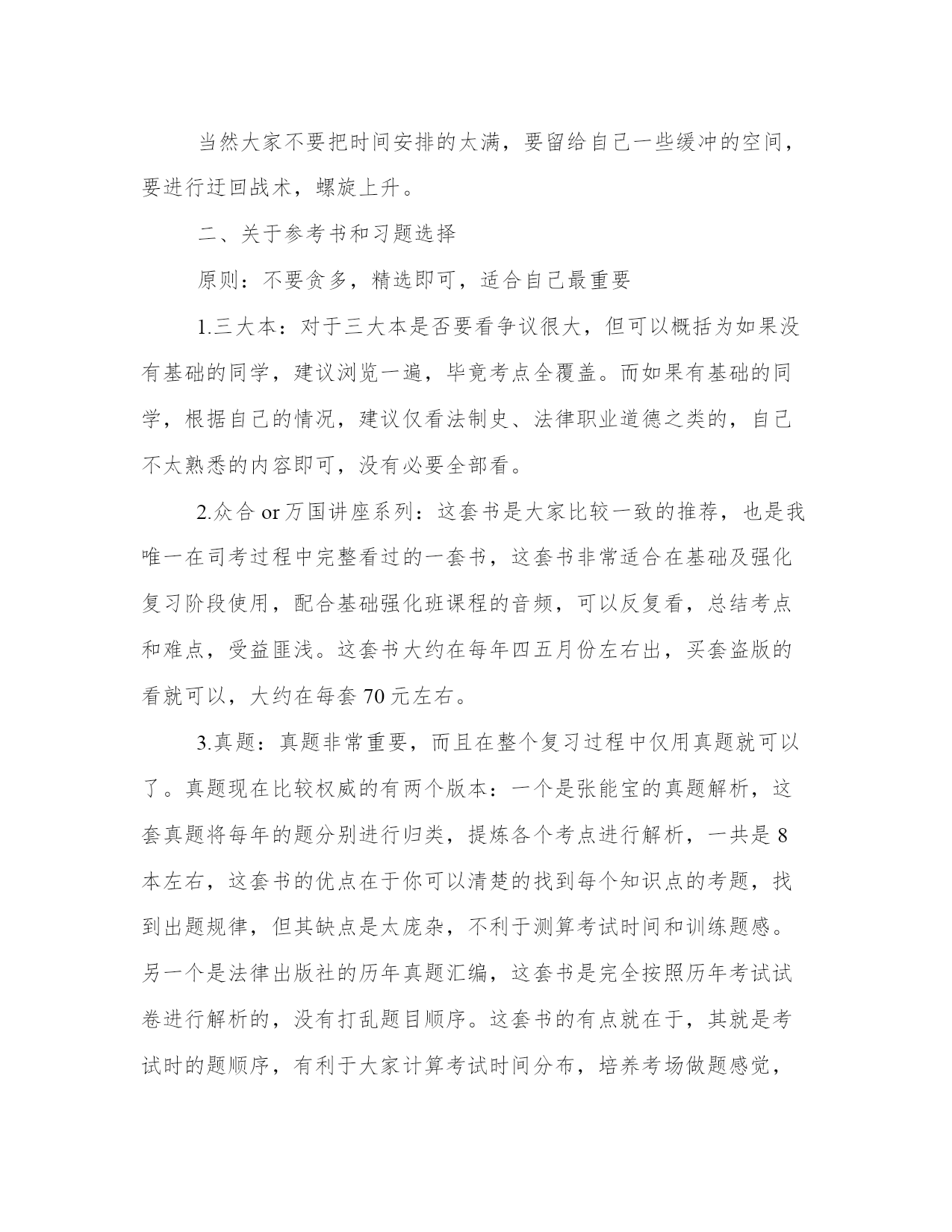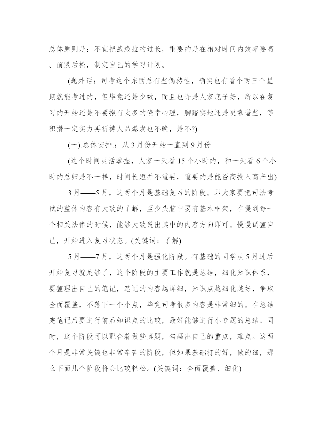 最新司法心得体会(通用9篇)心得体会对个人的成长和发展具有重要意义,可以帮助个人更好地理解和领悟所经历的事物,发现自身的不足和问题,提高实践能力和解决问题的能力,促进与他人的交流和分享。我们应该重视心得体会,将其作为一种宝贵的财富,不断积累和分享。下面是小编帮大家整理的心得体会范文大全,供大家参考借鉴,希望可以帮助到有需要的朋友。司法心得体会篇一司法是国家行使执法权力的重要部门,它对于社会的正常运行和人民的安宁起着至关重要的作用。长期以来,我作为一名法学专业的学生,通过课堂学习和实践经验,对司法工作有了深刻的了解和体会。下面从犯罪与刑罚、法官职责、证据和辩护、公平与公正、司法改革五个方面,阐述我在司法工作中的心得体会。首先是犯罪与刑罚。司法的首要任务是惩罚犯罪行为,维护社会的法律尊严和秩序。在刑罚方面,司法必须坚守公平和合理原则,不能过分放纵或过度惩罚,要依法审理每一个案件,确保每个被告人都能获得公正的判决。作为司法工其次是法官职责。法官是司法工作中最重要的角色,他们要根据法律规定和事实依据,公正地裁判案件。在审理案件过程中,法官要耐心听取双方当事人的陈述和证据,认真分析案情,全面评估证据的真实性和可信度。同时,法官还要注重法理和公平精神的统一,法理是法官的工作基础,而公平精神则是司法公正的灵魂。法官的判决应当既符合法律规定,又符合社会公众的正义感。第三是证据和辩护。证据是决定案件胜负的重要因素,同时也是司法公正的关键保障。法庭审理过程中,双方当事人要提供清晰、充分、可信的证据。而作为法官,我们要对证据进行审查和权衡,判断其真伪和可靠性。通过对证据的审查,能够辨别出有关当事人的真正意图,确保判决的准确性和公正性。另外,辩护也是司法工作中不可忽视的一环。无论是被告人还是原告人,都有权利进行辩护。作为法官,我们要尊重被告人的辩护权利,并判断其辩护理由的合理性与成立性。第四是公平与公正。公平与公正是司法工作的核心原则,它体现了法治精神和司法公正,也是司法公信力的重要标志。司法工作必须以公平和公正为宗旨,平等对待每一个案件,不分种族、性别、地区和社会地位。法官应当以最高尺度对待每一个案件,做到公正无私,不受任何外界因素的影响。而作为法律工最后是司法改革。司法改革是司法工作不断向前发展的必要条件,它可以促进司法公正和司法效率的提高。司法改革需要不断完善相关法律法规,加强对司法工作的监督和评估,并加强司法人员的培训。司法工作的公正和廉洁是司法改革的重要目标,要严惩腐败行为,提高司法工作的透明度和公信力。总之,司法工作是一项具有巨大责任和荣誉的工作,它关系到人民的利益和社会的和谐稳定。作为一名法学专业的学生,我深深体会到司法工作的艰辛和重要性。通过加强法规的学习,深入实践经验的累积,我将努力成为一名合格的法律工司法心得体会篇二卷一:宪法、法理、法制史、国际公法、国际私法、国际经济法、经济法、法律职业道德卷二:刑法、刑诉、行政法、行政诉讼法卷三:民法、民诉、商法正文下面开始正题,我将整个总结分为五大部分:第一部分是关于时间安排第二部分是参考书和习题的选择第三部分是复习方法第四部分是关于辅导班的取舍第五部分是其他注意事项一、关于时间安排时间安排是整个司考复习的开始,有了具体的时间安排,才好有步骤的进行复习,但由于每个人的具体情况不太一样,有基础好一些的,有基础薄弱一些的,时间上可以灵活处理。这里只给大家一个基本的时间安排进行参考,同学们根据自己的时间安排进行自我调整。总体原则是:不宜把战线拉的过长,重要的是在相对时间内效率要高。前紧后松,制定自己的学习计划。(题外话:司考这个东西总有些偶然性,确实也有看个两三个星期就能考过的,但毕竟还是少数,而且也许是人家底子好,所以在复习的开始还是不要抱有太多的侥幸心理,脚踏实地还是更靠谱些,等积攒一定实力再祈祷人品爆发也不晚,是不?)(一).总体安排.:从3月份开始一直到9月份(这个时间灵活掌握,人家一天看15个小时的,和一天看6个小时的总归是不一样,时间长短并不重要,重要的是能否高投入高产出)3月——5月,这两个月是基础复习的阶段。即大家要把司法考试的整体内容有大致的了解,至少头脑中要有基本框架,在提到每一个相关法律的时候,能够大致说出其中的内容方向即可。慢慢调整自己,开始进入复习状态。(关键词:了解)5月——7月,这两个月是强化阶段。有基础的同学从5月过后开始复习就足够了,这个阶段的主要工作就是总结,细化知识体系,要整理出自己的笔记,笔记的内容越详细,知识点越细化越好,争取全面覆盖,不落下一个小点,毕竟司考很多内容是非常细的。在总结完笔记后要进行前后知识点的比较,最好能够进行小专题的总结。同时,这个阶段可以配合着做些真题,勾画出自己的重点,难点。这
