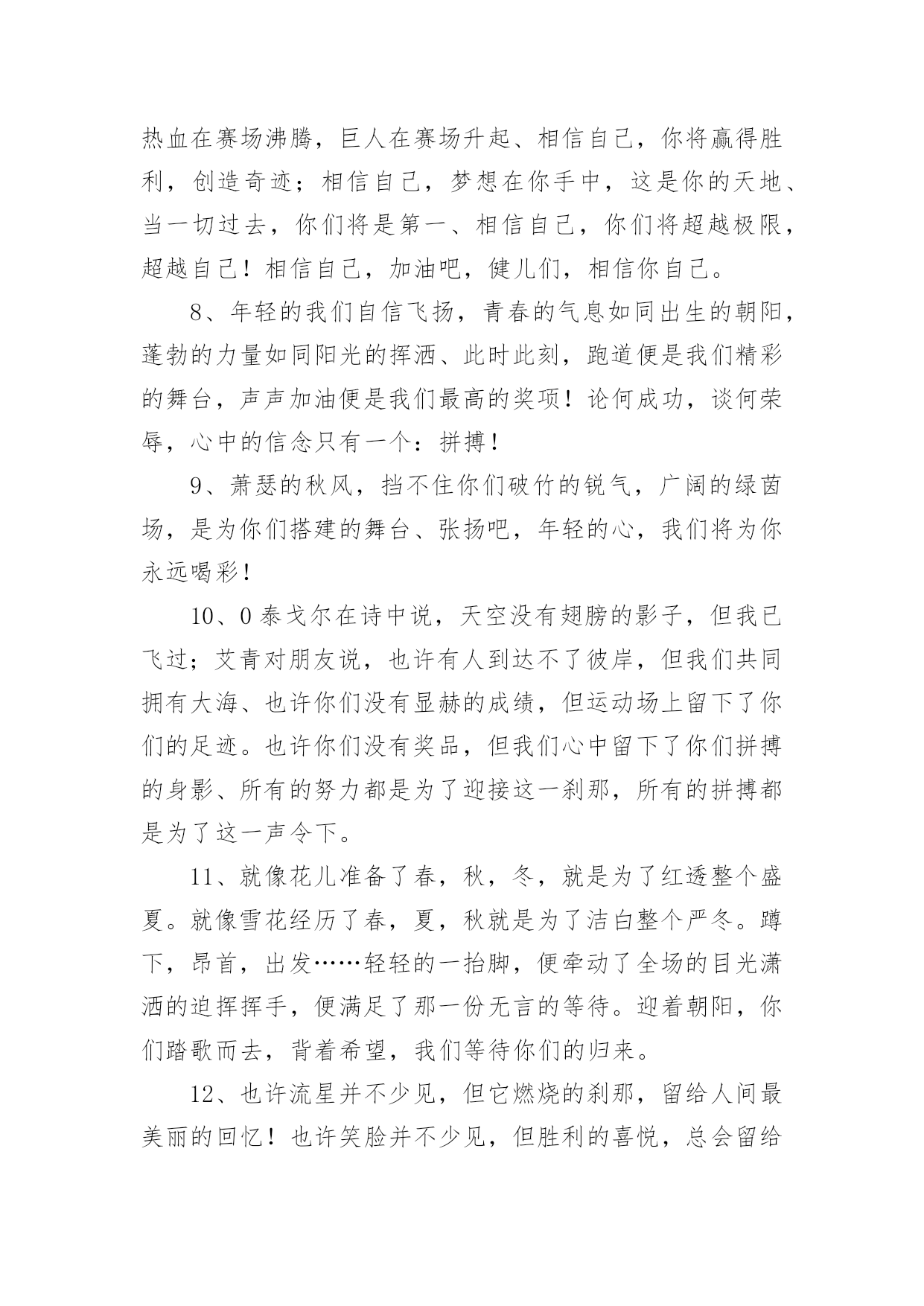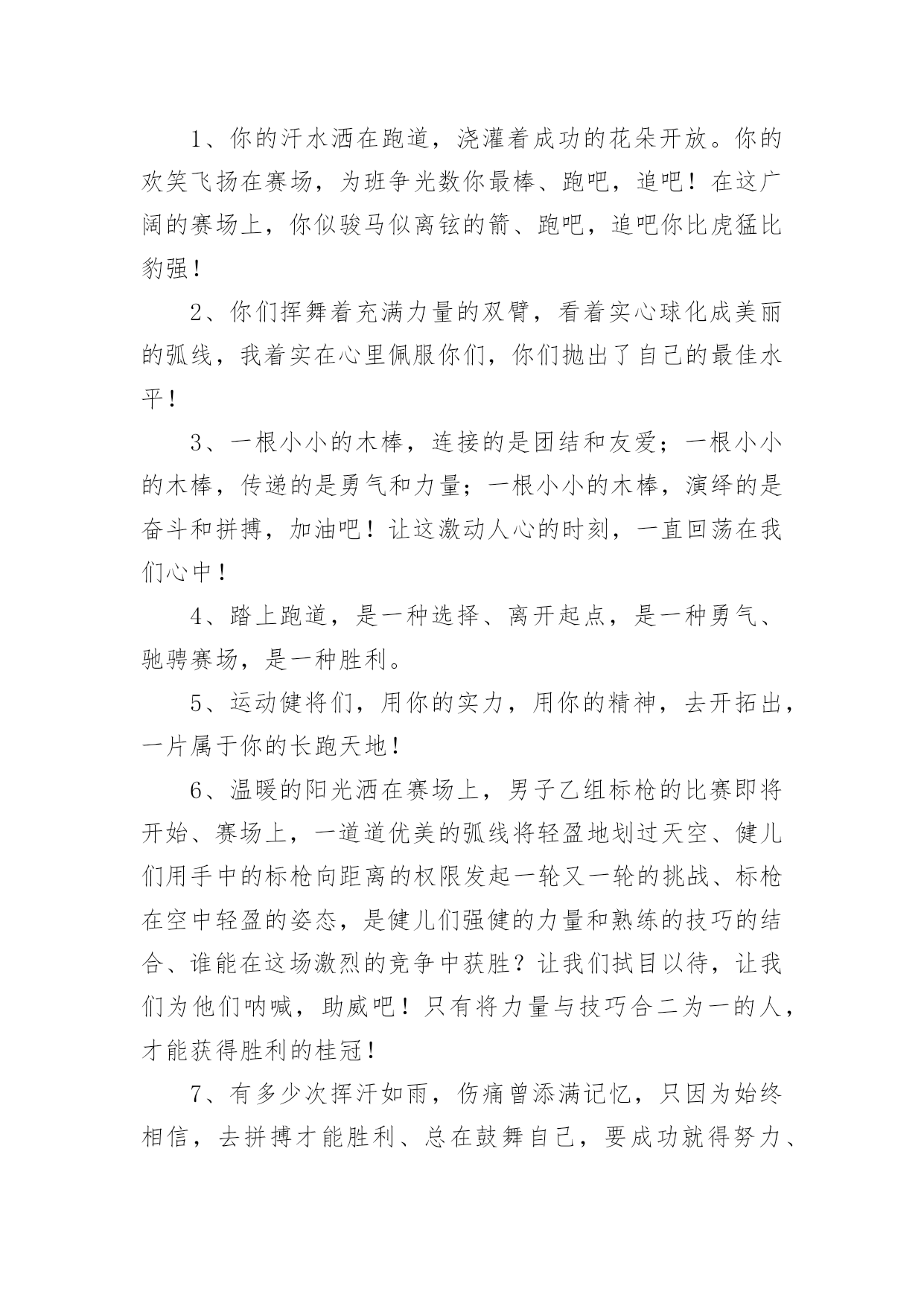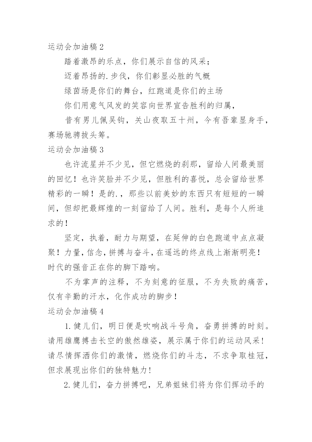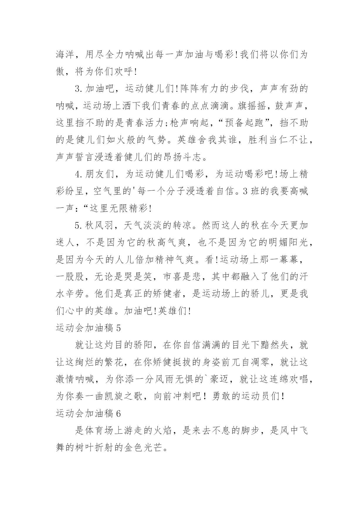 运动会加油稿运动会加油稿优秀15篇在现实社会中,各种加油稿频频出现,加油稿是用于给别人加油鼓气,提升别人气势的文稿。你所见过的加油稿是什么样的呢?下面是小编帮大家整理的运动会加油稿,希望能够帮助到大家。运动会加油稿1偌大的竞技场期待着你矫健的身影,飒飒的秋风为你送来爽朗的气息,朋友,在你踏上跑道的那一刻,告诉自己——将信心进行到底。看台上你一双双期待的目光替你吧奋斗的锣鼓敲响。耳边此起彼伏的呐喊声将为你增添无穷的力量。朋友,在你挑战自我,挑战极限的时候,告诉自己——将信心进行到底。无论成功与否,请微笑着跑完全程,只要年轻的心还在蓬勃的`跳动,就要大声告诉自己——将信心进行到底。在阳光的照耀下,跳高的比赛场地格外辉煌,运动健儿们,用那矫键的身躯,冲刺着一个又一个的高度。没有尝试,怎会知道自己是否为强者,超越自己,也许会创造一番新天地!运动健儿们加油吧,去创造一份份奇奇迹,去创造一份份惊喜!运动会加油稿2踏着激昂的乐点,你们展示自信的风采;迈着昂扬的.步伐,你们彰显必胜的气概绿茵场是你们的舞台,红跑道是你们的主场你们用意气风发的笑容向世界宣告胜利的归属,昔有男儿佩吴钩,关山夜取五十州,今有吾辈显身手,赛场驰骋拔头筹。运动会加油稿3也许流星并不少见,但它燃烧的刹那,留给人间最美丽的回忆!也许笑脸并不少见,但胜利的喜悦,总会留给世界精彩的一瞬!是的.,那些以前美妙的东西只有短短的一瞬间,但却把最辉煌的一刻留给了人间。胜利,是每个人所追求的!坚定,执着,耐力与期望,在延伸的白色跑道中点点凝聚!力量,信念,拼搏与奋斗,在遥远的终点线上渐渐明亮!时代的强音正在你的脚下踏响。不为掌声的注释,不为刻意的征服,不为失败的痛苦,仅有辛勤的汗水,化作成功的脚步!运动会加油稿41.健儿们,明日便是吹响战斗号角,奋勇拼搏的时刻。请用雄鹰搏击长空的傲然雄姿,展示属于你们的运动风采!请尽情挥洒你们的激情,燃烧你们的斗志,不求争取桂冠,但求展现出你们的独特魅力!2.健儿们,奋力拼搏吧,兄弟姐妹们将为你们挥动手的海洋,用尽全力呐喊出每一声加油与喝彩!我们将以你们为傲,将为你们欢呼!3.加油吧,运动健儿们!阵阵有力的步伐,声声有劲的呐喊,运动场上洒下我们青春的点点滴滴。旗摇摇,鼓声声,这里挡不助的是青春活力;枪声响起,“预备起跑”,挡不助的是健儿们如火般的气势。英雄舍我其谁,胜利当仁不让,声声誓言浸透着健儿们的昂扬斗志。4.朋友们,为运动健儿们喝彩,为运动喝彩吧!场上精彩纷呈,空气里的'每一个分子浸透着自信。3班的我要高喊一声:“这里无限精彩!5.秋风羽,天气淡淡的转凉。然而这人的秋在今天更加迷人,不是因为它的秋高气爽,也不是因为它的明媚阳光,是因为今天的人儿倍加精神气爽。看!运动场上那一幕幕,一股股,无论是哭是笑,市喜是悲,其中都融入了他们的汗水辛劳。他们是真正的矫健者,是运动场上的骄儿,更是我们心中的英雄。加油吧!英雄们!运动会加油稿5就让这灼目的骄阳,在你自信满满的目光下黯然失,就让这绚烂的繁花,在你矫健挺拔的身姿前兀自凋零,就让这激情呐喊,为你添一分风雨无惧的`豪迈,就让这连绵欢唱,为你奏一曲凯旋之歌,向前冲刺吧!勇敢的运动员们!运动会加油稿6是体育场上游走的火焰,是来去不息的脚步,是风中飞舞的树叶折射的金色光芒。藉此,可以诠释运动员兴奋的脸庞。那轻盈的步伐似飞鸟的`翅膀,那清脆的枪声响彻天际。它粲然升起那跃动的渴望,起跑、加速、超越、冲刺,一步一步延向胜利的曙光。那是力的比拼,素质的较量,是石榴树上,跃动的心脏。运动会加油稿7运动员,当你驰骋在运动场上,你便征服了别人,你便征服了自己。站再那坚硬的起跑线前,也就是成就你梦想的时刻。是的,有很多梦是遥不可及的,但梦想是可以成真的。克雷洛夫有句名言:现实在此岸,理想在彼岸,中间隔着湍急的河流。努力行动则是架在川上的.桥梁。要从现实的此岸,到达理想的彼岸,重在努力,重在自信。贵在坚持,而这更应该是我们运动健儿的精神。雄鹰属于蓝天,激流属于大海,而我们的运动员则属于绿茵茵的草地。那是希望升起的地方,也将是胜利降临的舞台。自信的运动健儿们,当你们为梦想而拼搏,为胜利而流汗时,也在为我们xx中争光。运动会加油稿8我们不喜欢无云的天空,我们不喜欢无泪的人生,因为,云朵也是一道风景,眼泪也是一种晶莹,不要总是遗憾,生命的美丽,常常在于过程,不要总是哀叹,一点点挫折,只会让人,越战越勇。今日的你们英姿飒爽,今日的你们一马当先。不要放下,不要气馁。相信自己,你是最棒的!你永远都是我们心中的.体育健儿!加油!时值秋暮冬初,虽然已过了金秋十月,然而初冬依然暖阳高照,校运动会在这样风和日丽的天气里如期举行了。运动会加油稿91、你和红色的地面有个约定,那上面,总有你奔跑的身影;你与绿色的草坪有个约定,那上面,有着你辛劳的汗渍。2