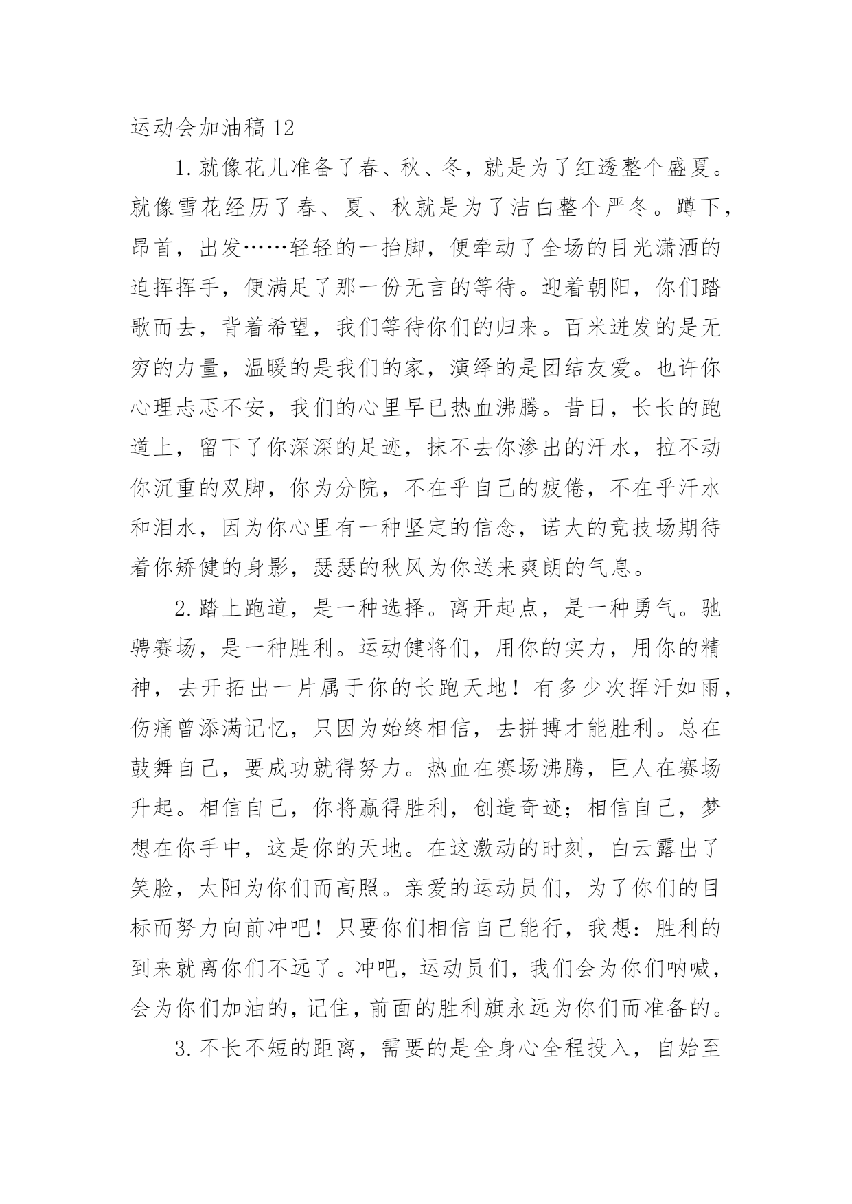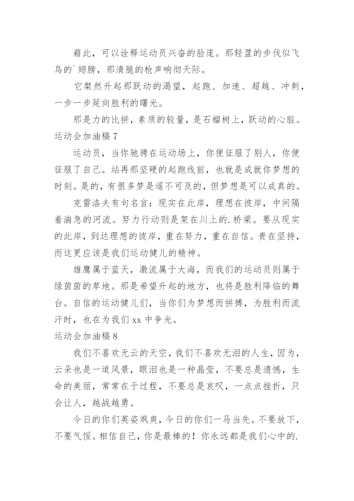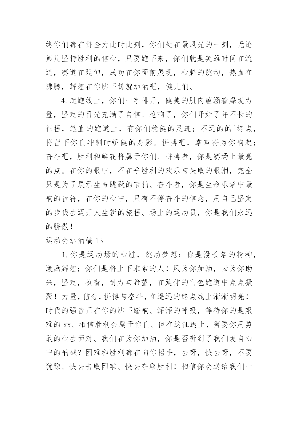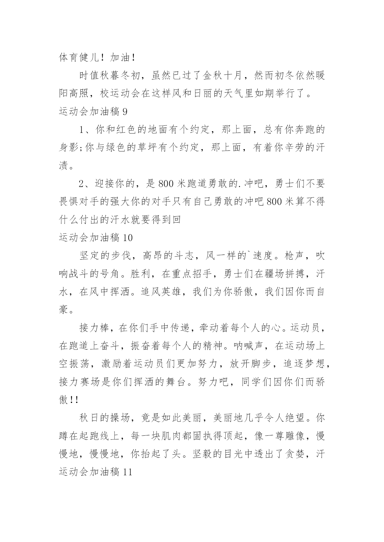 运动会加油稿运动会加油稿优秀15篇在现实社会中,各种加油稿频频出现,加油稿是用于给别人加油鼓气,提升别人气势的文稿。你所见过的加油稿是什么样的呢?下面是小编帮大家整理的运动会加油稿,希望能够帮助到大家。运动会加油稿1偌大的竞技场期待着你矫健的身影,飒飒的秋风为你送来爽朗的气息,朋友,在你踏上跑道的那一刻,告诉自己——将信心进行到底。看台上你一双双期待的目光替你吧奋斗的锣鼓敲响。耳边此起彼伏的呐喊声将为你增添无穷的力量。朋友,在你挑战自我,挑战极限的时候,告诉自己——将信心进行到底。无论成功与否,请微笑着跑完全程,只要年轻的心还在蓬勃的`跳动,就要大声告诉自己——将信心进行到底。在阳光的照耀下,跳高的比赛场地格外辉煌,运动健儿们,用那矫键的身躯,冲刺着一个又一个的高度。没有尝试,怎会知道自己是否为强者,超越自己,也许会创造一番新天地!运动健儿们加油吧,去创造一份份奇奇迹,去创造一份份惊喜!运动会加油稿2踏着激昂的乐点,你们展示自信的风采;迈着昂扬的.步伐,你们彰显必胜的气概绿茵场是你们的舞台,红跑道是你们的主场你们用意气风发的笑容向世界宣告胜利的归属,昔有男儿佩吴钩,关山夜取五十州,今有吾辈显身手,赛场驰骋拔头筹。运动会加油稿3也许流星并不少见,但它燃烧的刹那,留给人间最美丽的回忆!也许笑脸并不少见,但胜利的喜悦,总会留给世界精彩的一瞬!是的.,那些以前美妙的东西只有短短的一瞬间,但却把最辉煌的一刻留给了人间。胜利,是每个人所追求的!坚定,执着,耐力与期望,在延伸的白色跑道中点点凝聚!力量,信念,拼搏与奋斗,在遥远的终点线上渐渐明亮!时代的强音正在你的脚下踏响。不为掌声的注释,不为刻意的征服,不为失败的痛苦,仅有辛勤的汗水,化作成功的脚步!运动会加油稿41.健儿们,明日便是吹响战斗号角,奋勇拼搏的时刻。请用雄鹰搏击长空的傲然雄姿,展示属于你们的运动风采!请尽情挥洒你们的激情,燃烧你们的斗志,不求争取桂冠,但求展现出你们的独特魅力!2.健儿们,奋力拼搏吧,兄弟姐妹们将为你们挥动手的海洋,用尽全力呐喊出每一声加油与喝彩!我们将以你们为傲,将为你们欢呼!3.加油吧,运动健儿们!阵阵有力的步伐,声声有劲的呐喊,运动场上洒下我们青春的点点滴滴。旗摇摇,鼓声声,这里挡不助的是青春活力;枪声响起,“预备起跑”,挡不助的是健儿们如火般的气势。英雄舍我其谁,胜利当仁不让,声声誓言浸透着健儿们的昂扬斗志。4.朋友们,为运动健儿们喝彩,为运动喝彩吧!场上精彩纷呈,空气里的'每一个分子浸透着自信。3班的我要高喊一声:“这里无限精彩!5.秋风羽,天气淡淡的转凉。然而这人的秋在今天更加迷人,不是因为它的秋高气爽,也不是因为它的明媚阳光,是因为今天的人儿倍加精神气爽。看!运动场上那一幕幕,一股股,无论是哭是笑,市喜是悲,其中都融入了他们的汗水辛劳。他们是真正的矫健者,是运动场上的骄儿,更是我们心中的英雄。加油吧!英雄们!运动会加油稿5就让这灼目的骄阳,在你自信满满的目光下黯然失,就让这绚烂的繁花,在你矫健挺拔的身姿前兀自凋零,就让这激情呐喊,为你添一分风雨无惧的`豪迈,就让这连绵欢唱,为你奏一曲凯旋之歌,向前冲刺吧!勇敢的运动员们!运动会加油稿6是体育场上游走的火焰,是来去不息的脚步,是风中飞舞的树叶折射的金色光芒。藉此,可以诠释运动员兴奋的脸庞。那轻盈的步伐似飞鸟的`翅膀,那清脆的枪声响彻天际。它粲然升起那跃动的渴望,起跑、加速、超越、冲刺,一步一步延向胜利的曙光。那是力的比拼,素质的较量,是石榴树上,跃动的心脏。运动会加油稿7运动员,当你驰骋在运动场上,你便征服了别人,你便征服了自己。站再那坚硬的起跑线前,也就是成就你梦想的时刻。是的,有很多梦是遥不可及的,但梦想是可以成真的。克雷洛夫有句名言:现实在此岸,理想在彼岸,中间隔着湍急的河流。努力行动则是架在川上的.桥梁。要从现实的此岸,到达理想的彼岸,重在努力,重在自信。贵在坚持,而这更应该是我们运动健儿的精神。雄鹰属于蓝天,激流属于大海,而我们的运动员则属于绿茵茵的草地。那是希望升起的地方,也将是胜利降临的舞台。自信的运动健儿们,当你们为梦想而拼搏,为胜利而流汗时,也在为我们xx中争光。运动会加油稿8我们不喜欢无云的天空,我们不喜欢无泪的人生,因为,云朵也是一道风景,眼泪也是一种晶莹,不要总是遗憾,生命的美丽,常常在于过程,不要总是哀叹,一点点挫折,只会让人,越战越勇。今日的你们英姿飒爽,今日的你们一马当先。不要放下,不要气馁。相信自己,你是最棒的!你永远都是我们心中的.体育健儿!加油!时值秋暮冬初,虽然已过了金秋十月,然而初冬依然暖阳高照,校运动会在这样风和日丽的天气里如期举行了。运动会加油稿91、你和红色的地面有个约定,那上面,总有你奔跑的身影;你与绿色的草坪有个约定,那上面,有着你辛劳的汗渍。2