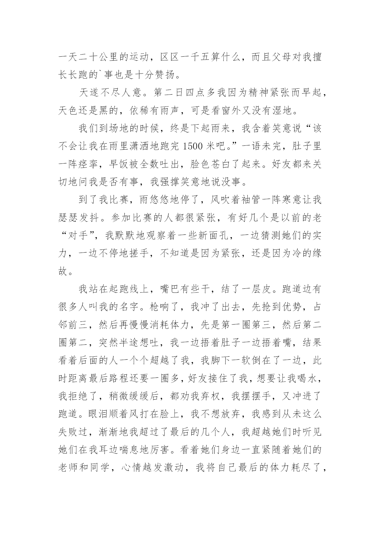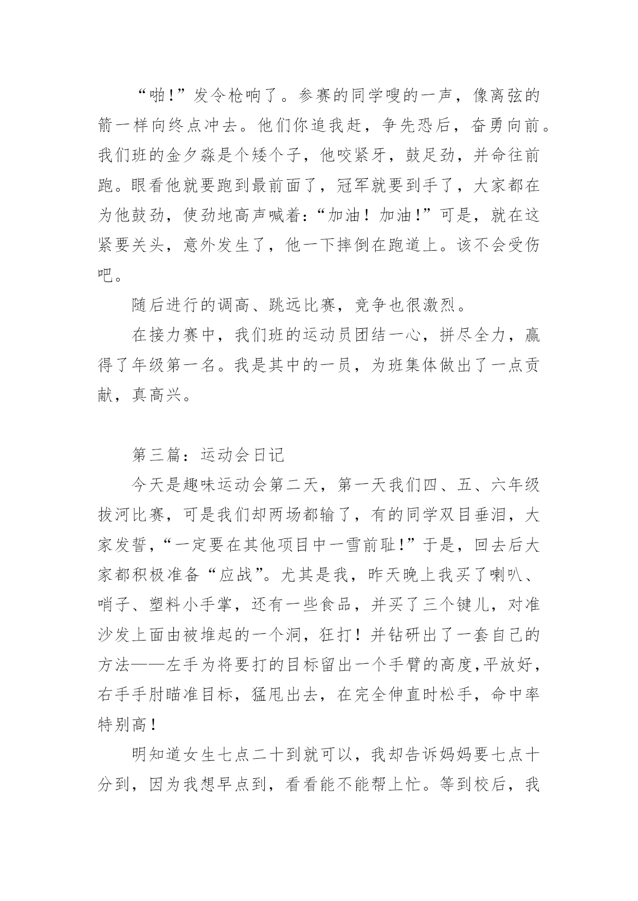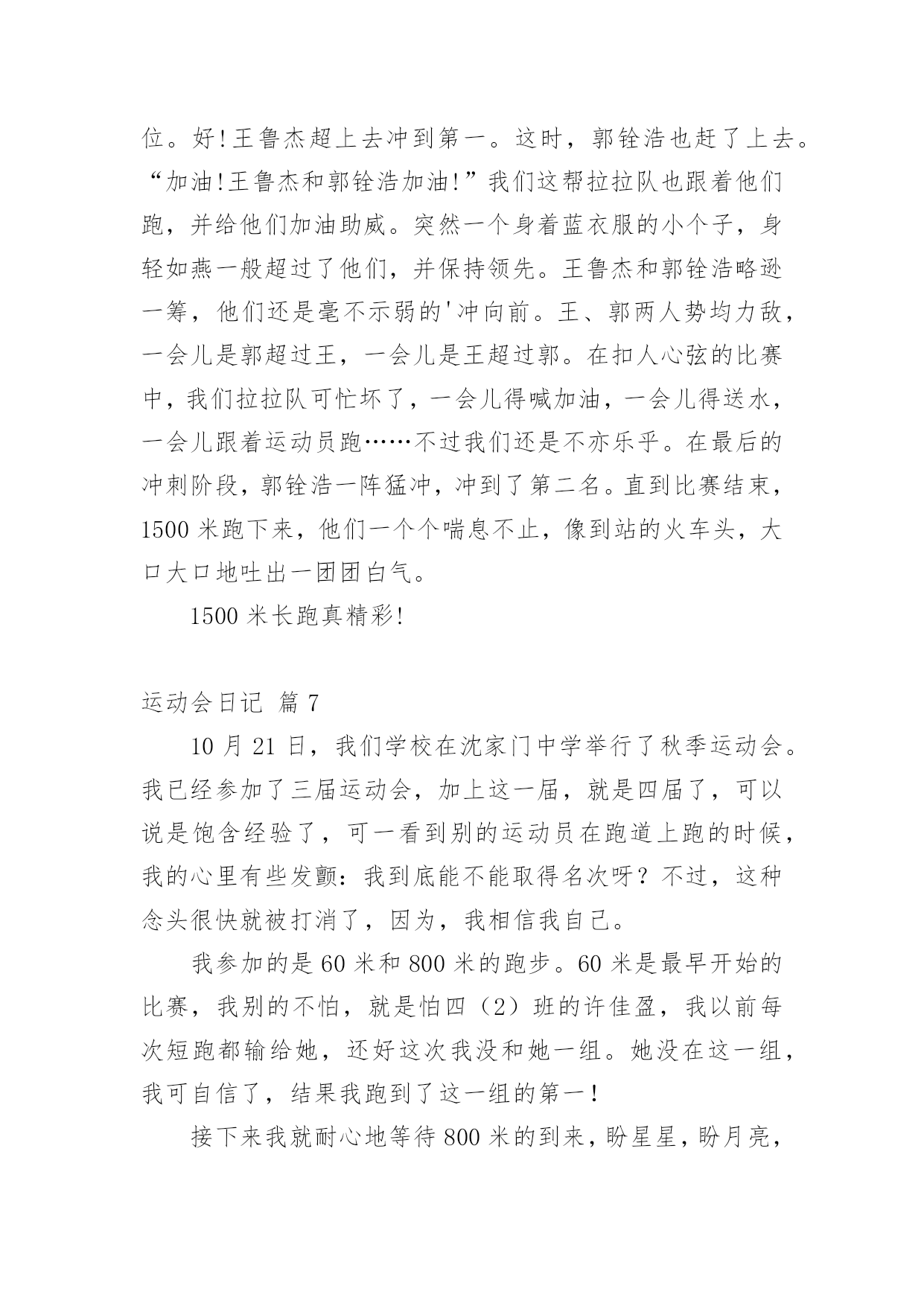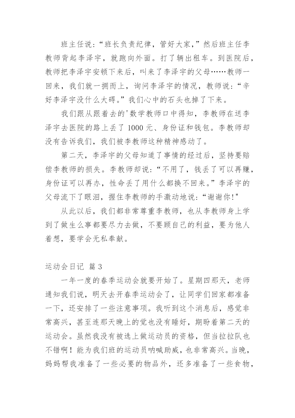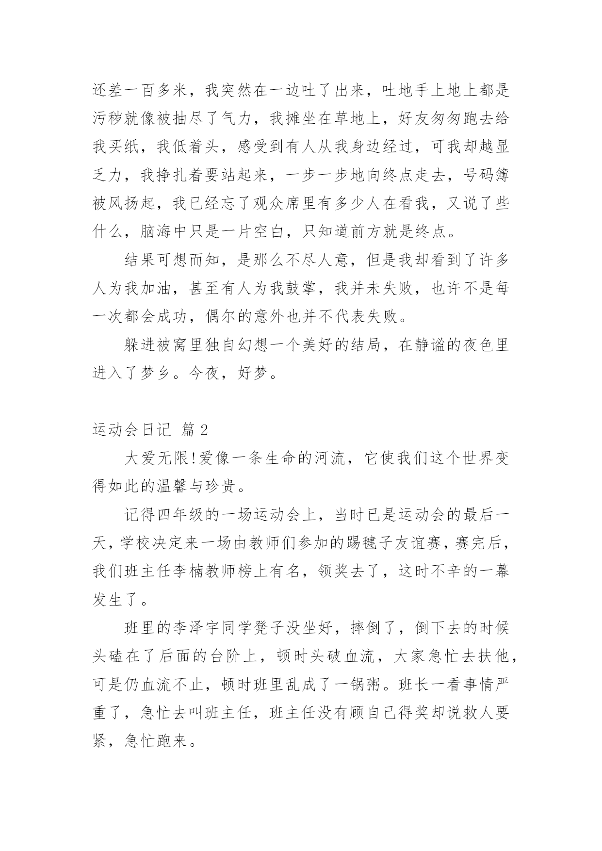 运动会日记运动会日记8篇[精选]一天的时间即将结束了,想必有很多难忘的瞬间吧,何不趁现在赶紧写一篇日记。日记怎么写才不会千篇一律呢?下面是小编整理的运动会日记8篇,希望能够帮助到大家。运动会日记篇1静谧的夜,空气骤冷,风声一下一下地发出叹息,我不免又想起自己的表现,眼泪便开始悠悠打转,在滴落的瞬间却冷却在风里……今天是我期待已久的运动会,比当初说好的时间晚到了几个星期,已是十一月,天气却变的很不寻常,第一日的太阳热情似火,烤的让人无处闪躲,汗顺着额头衣袖流下,看比赛的人越来越少,第一天因为没有项目我撑着伞在观众席里看运动员比赛,看到熟人,互相打个招呼。我们班赛绩不佳,大部分人都发挥失常。我开始担心,心开始嘭嘭跳,好友看出了我的担忧,满是笑意地对我说“明天我陪你一起跑,路上给你送水,长跑小心点,撑不住就放弃啊,别逞能哈。”“姐姐我怎么可能跑不下了,那么多年都是前几名,跑完气都不喘的好不好。”……是的,我一直很自信,从我发现我的长跑强项后,每次运动会都参加,且频频拿奖,加上每天早起跑步三公里甚至一天二十公里的运动,区区一千五算什么,而且父母对我擅长长跑的`事也是十分赞扬。天遂不尽人意。第二日四点多我因为精神紧张而早起,天色还是黑的,依稀有雨声,可是看窗外又没有湿地。我们到场地的时候,终是下起雨来,我含着笑意说“该不会让我在雨里潇洒地跑完1500米吧。”一语未完,肚子里一阵痉挛,早饭被全数吐出,脸色苍白了起来。好友都来关切地问我是否有事,我强撑笑意地说没事。到了我比赛,雨悠悠地停了,风吹着袖管一阵寒意让我瑟瑟发抖。参加比赛的人都很紧张,有好几个是以前的老“对手”,我默默地观察着一些新面孔,一边猜测她们的实力,一边不停地搓手,不知道是因为紧张,还是因为冷的缘故。我站在起跑线上,嘴巴有些干,结了一层皮。跑道边有很多人叫我的名字。枪响了,我冲了出去,先抢到优势,占邻前三,然后再慢慢消耗体力,先是第一圈第三,然后第二圈第二,突然半途想吐,我一边捂着肚子一边捂着嘴,结果看着后面的人一个个超越了我,我脚下一软倒在了一边,此时距离最后路程还要一圈多,好友接住了我,想要让我喝水,我拒绝了,稍微缓缓后,都劝我弃权,我摆摆手,又冲进了跑道。眼泪顺着风打在脸上,我不想放弃,我感到从未这么失败过,渐渐地我超过了最后的几个人,我超越她们时听见她们在我耳边喘息地厉害。看着她们身边一直紧随着她们的老师和同学,心情越发激动,我将自己最后的体力耗尽了,还差一百多米,我突然在一边吐了出来,吐地手上地上都是污秽就像被抽尽了气力,我摊坐在草地上,好友匆匆跑去给我买纸,我低着头,感受到有人从我身边经过,可我却越显乏力,我挣扎着要站起来,一步一步地向终点走去,号码簿被风扬起,我已经忘了观众席里有多少人在看我,又说了些什么,脑海中只是一片空白,只知道前方就是终点。结果可想而知,是那么不尽人意,但是我却看到了许多人为我加油,甚至有人为我鼓掌,我并未失败,也许不是每一次都会成功,偶尔的意外也并不代表失败。躲进被窝里独自幻想一个美好的结局,在静谧的夜色里进入了梦乡。今夜,好梦。运动会日记篇2大爱无限!爱像一条生命的河流,它使我们这个世界变得如此的温馨与珍贵。记得四年级的一场运动会上,当时已是运动会的最后一天,学校决定来一场由教师们参加的踢毽子友谊赛,赛完后,我们班主任李楠教师榜上有名,领奖去了,这时不辛的一幕发生了。班里的李泽宇同学凳子没坐好,摔倒了,倒下去的时候头磕在了后面的台阶上,顿时头破血流,大家急忙去扶他,可是仍血流不止,顿时班里乱成了一锅粥。班长一看事情严重了,急忙去叫班主任,班主任没有顾自己得奖却说救人要紧,急忙跑来。班主任说:“班长负责纪律,管好大家,”然后班主任李教师背起李泽宇,就跑向外面。打了辆出租车。到医院后,教师把李泽宇安顿下来后,叫来了李泽宇的父母……教师一回来,我们就一拥而上,询问李泽宇的情况,教师说:“辛好李泽宇没什么大碍。”我们心中的石头也掉了下来。我们跟从跟着去的'数学教师口中得知,李教师在送李泽宇去医院的路上丢了1000元、身份证和钱包。李教师却没有告诉我们,我们被李教师这种精神感动了。第二天,李泽宇的父母知道了事情的经过后,坚持要赔偿李教师的损失。李教师却说:“不用了,钱丢了可以再赚,身份证可以再办,性命丢了用什么都换不回来。”李泽宇的父母流下了眼泪,握住李教师的手激动地说:“谢谢你!"从此以后,我们都非常尊重李教师,也从李教师身上学到了做生么事都要尽力去做,不要顾自己的利益,要为他人着想,要学会无私奉献。运动会日记篇3一年一度的春季运动会就要开始了。星期四那天,老师通知我们说,明天去开春季运动会了,让同学们回家都准备一下,还安排了一些注意事项。我听到这个消息后,感觉非常高兴,甚至连那天晚上的觉也没有睡好,期盼着第二天的运动会。虽然我没有被选上
