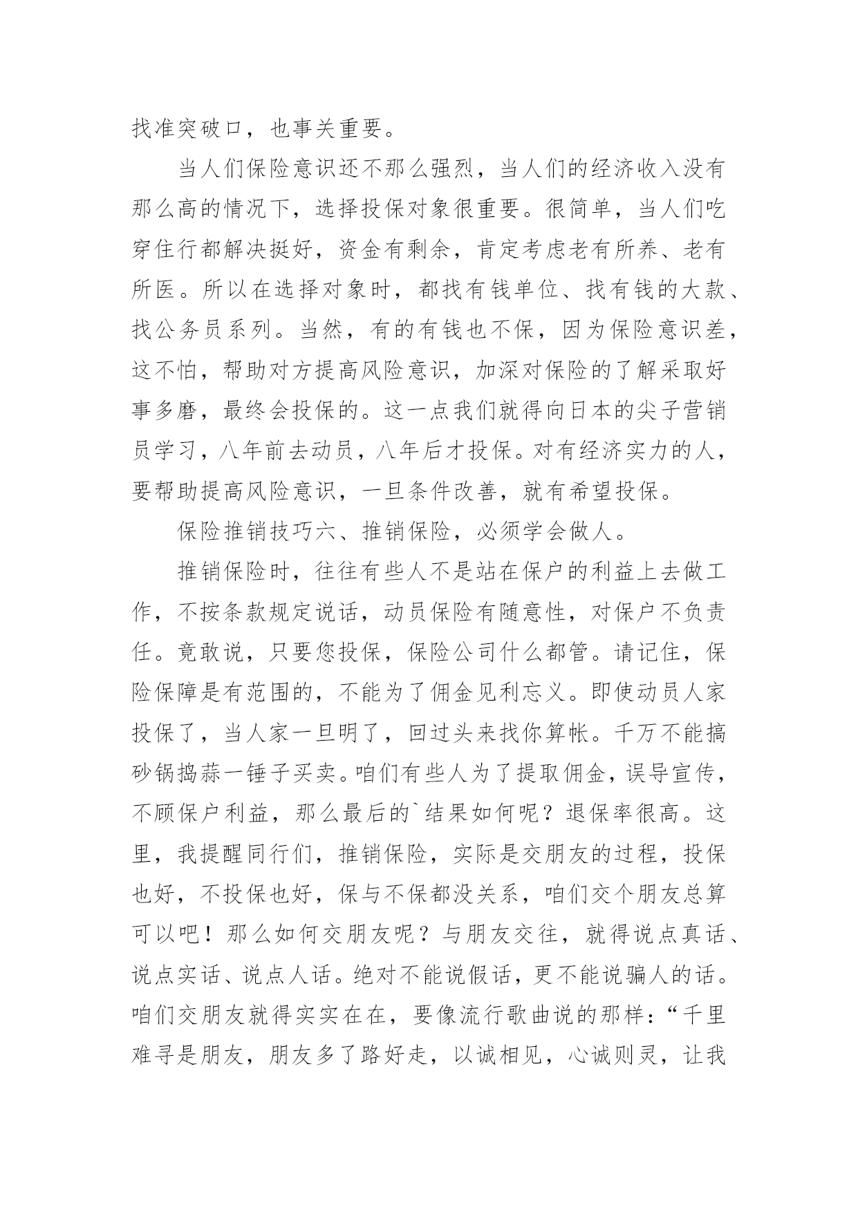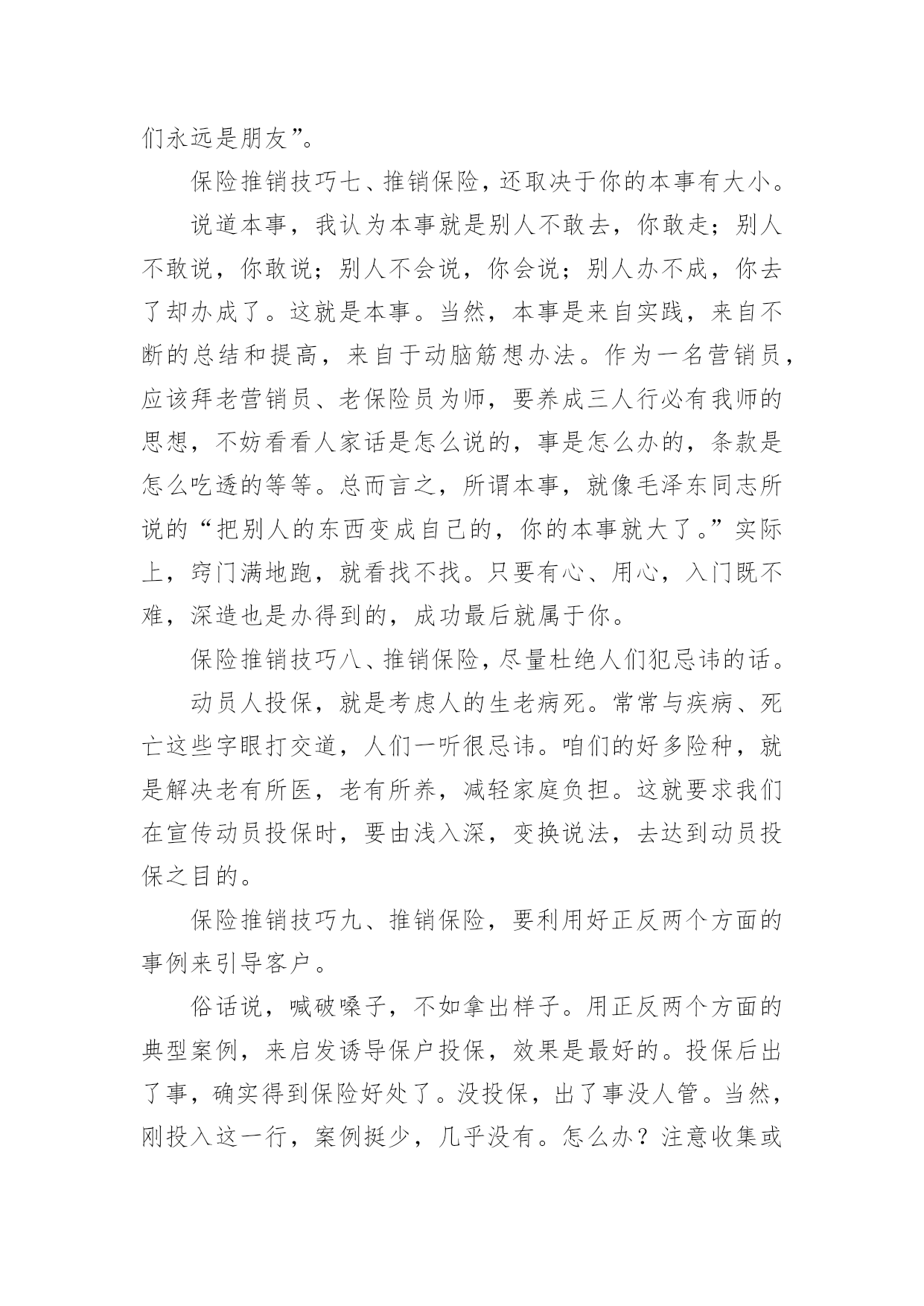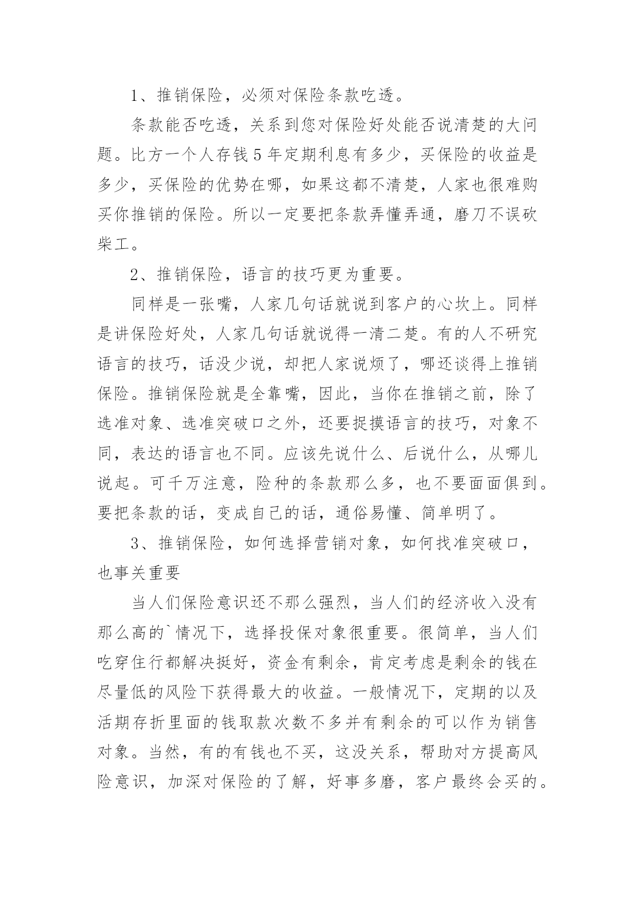 保险销售技巧心得体会保险销售技巧心得体会[实用]我们从一些事情上得到感悟后,可以寻思将其写进心得体会中,如此可以一直更新迭代自己的想法。那么好的心得体会是什么样的呢?以下是小编整理的保险销售技巧心得体会,欢迎阅读,希望大家能够喜欢。保险销售技巧心得体会1三个多月以来,在同事们的帮助下,自己在电话销售方面学到了很多东西,下面谈一谈这段时间的心得。做电话销售也可能是所有销售里最难,最具有挑战性的了;对于别人的拒绝总是很让我伤自尊。但是自己必须要迈过这个门槛。说实话当时我是把自己看成被“逼”上梁山的好汉,每天都在打电话,打好多的电话让自己遭受拒绝,学会承受。在开始的时候也是在师傅包括一部的同志们帮助以及熏陶下才慢慢的适应,别人可以做到,为什么我就不可以?作为销售人员我感觉背负着挺大的工作压力。当面对背井离乡孤军奋战时的寂寞时,当面对完不成销售任务的沮丧时,当面对部分蛮不讲理的客户时,一旦丢失了坚强的意志,那么就只能逃离营销这个职业或者浑浑恶恶过日子。尤其是做电话销售,我们每天至少打五十个电话,每个月如果有十六个工作日,那每个月我们就要800个电话。可见我们要经受多少次的拒绝,我们听得最多的声音就是“拒绝”,如果不能激励自己,不能互相激励,那我们可能每天都会愁云罩面,每天都不想打电话,甚至看到电话头就痛,因为没有一个人会喜欢被拒绝的感觉。在追求成功的时候,必然会碰到各种各样的困难、曲折、打击、不如意。可能这个世界上会有极少数的人,他的一生一路顺风,但是大部分的人,他都曾经遭遇过失败或正在遭遇失败,包括很多成功人士也是一样。除了要对自己当初确立的目标要有坚定的信心外,必须要不时回过头去,检验自己一路走来的足迹有没有偏离了轨道,有没有多走了弯路,如果走偏了就赶紧回来,赶紧修正,不时地总结和回顾,才能保证方向永远是正确的。正如常言道:“一个人不追求进步的同时就是在原地踏步”!此时回头一想,我本人在工作中还是存在不少的'缺点和不足之处,尤其最明显的一点就是马虎大意,在发传真的时候忘记该称呼有几次,甚至有次去开会竟然还把鞋子忘记了带,最后还是满天去借,此等性质的问题细节在生活中也是经常发生;打电话的时候还是不能够独立面对问题,在客户遇到问题的时候自己容易惊慌失措,不能镇定的稳住阵脚,就把电话直接塞给师傅或者其他同事了,这点来说,现在做的非常不好,包括打回访自己都不会去打,现在刚来了不到一个月的新人都可以自己面对这些问题,我这点就做的不够成功了,以后一定要努力改掉这个习惯,不能什么时候都依靠别人,要靠自己解决!还有一点是平时工作和生活两者不能区分开来,有时工作中的烦恼会带到生活中,而生活中不愉快的心情也有时导致一天的心情,当然这样是肯定不好的,因为一天没有好心情就直接决定能否有回执来报答一天的劳效!所以平时工作以及生活中,在自己给自己调解的同时要坚信:郁闷的人找郁闷的人,会更加郁闷。一定要找比自己成功的人,比自己愉快的人,他的愉快会感染会传染,就会找到力量和信心。保险销售技巧心得体会2保险推销技巧一、推销保险之前,自己应先投保。我说的从我做起,就是说保险是好,那么你自己选择一份先投保上。不然,你怎么去动员别人。在推销保险时,客户很可能提出,你说保险好,那么你保了吗?这时,你可以理直气壮的回答,我投保了,不信您可以看看这里有我的保单。这样说服力会很强。我想这一招绝对灵。事情就是这样的,保险这么好、那么好,可您就是不保,这样是没有说服力的。保险推销技巧二、推销保险,可先从亲朋好友开始。回顾营销展业的历史,我们的营销员几乎都是这么走过来的,应该说这是一条成功的经验。为什么这样说,保险确实好,保险公司带头保,亲朋好友跟着保。这样做,陌生的人知道后,保险不是骗人。如果骗人、害人,保险公司不可能坑害自己的亲朋好友。另外,从亲朋好友中动员投保,因为他们了解你,用老百姓的话说,对你知根知底,认为你不可能骗他、害他,一旦投保,他也愿意把钱交给你。所以说,得出这样一个结论,熟人好办事。同行们,回顾您所走过的历程,生人和熟人相比较,哪个成功率高?保险推销技巧三、推销保险,必须对保险条款吃透。条款能否吃透,关系到您对保险好处能否说清楚的大问题。比方一个人应该交多少钱,有多少好处,什么时间受益等都说不清楚,人家也很难投保。应该做到,不同的年龄,不同的经济状况,选择不同的险种,既少花钱,得到实惠又多,使保户享有最大的利益,我想,他一定投保。伙伴们,不要着急,一定要把条款弄懂弄通,磨刀不误砍柴工。保险推销技巧四、推销保险,语言的技巧更为重要。俗话说:“好马在腿上,好人在嘴上”。同样是一张嘴,人家几句话就说到保户的心坎上。同样是一张嘴,比较陌生的人,几句话就把两者关系拉进。同样是讲保险好处,几句话就说得一清二楚。有的人不研究语言的技巧,话没少说,却把人家说烦了,甚至把他赶出