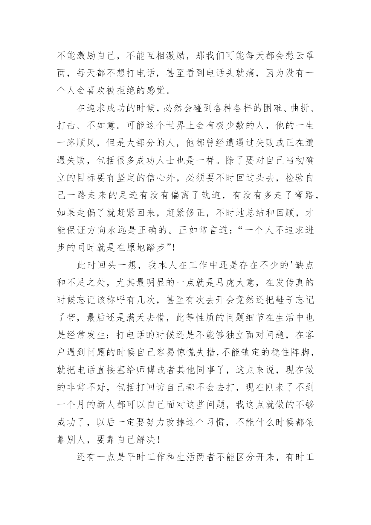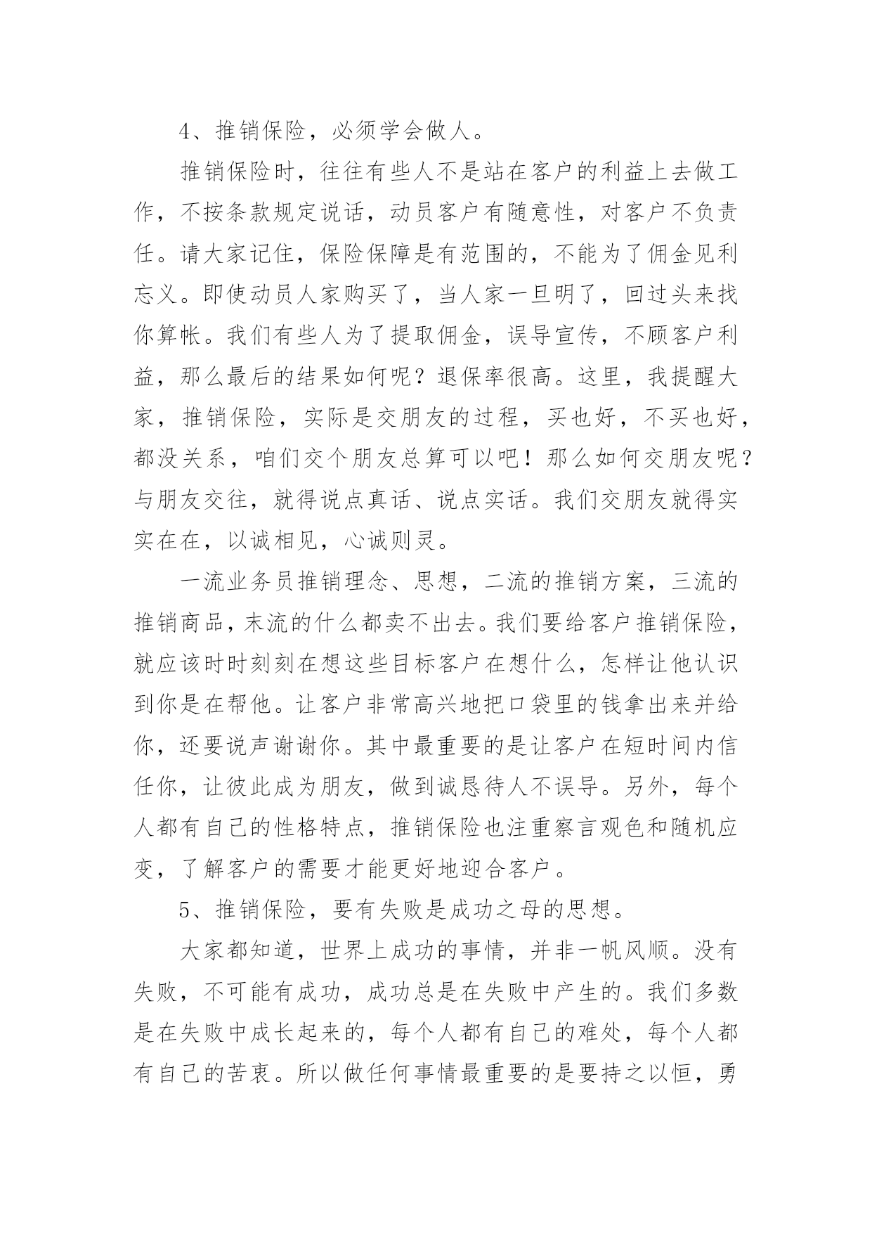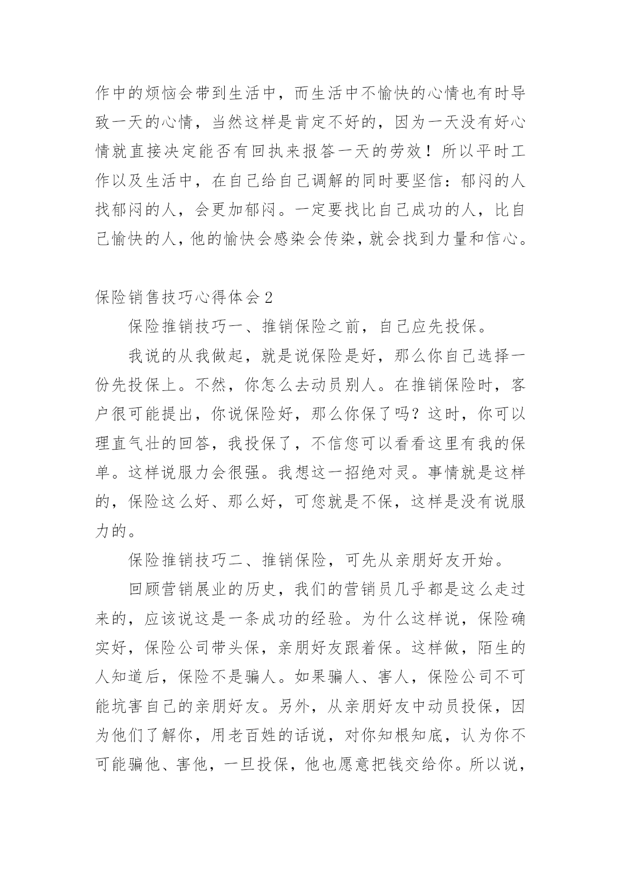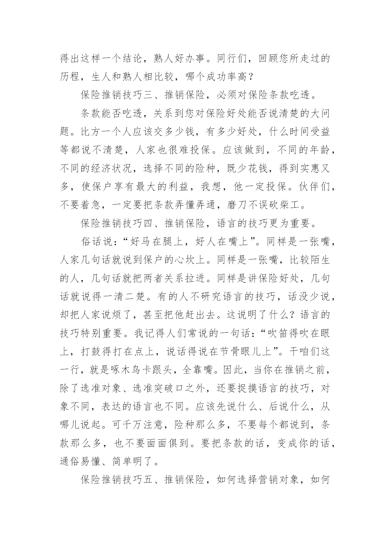 保险销售技巧心得体会保险销售技巧心得体会[实用]我们从一些事情上得到感悟后,可以寻思将其写进心得体会中,如此可以一直更新迭代自己的想法。那么好的心得体会是什么样的呢?以下是小编整理的保险销售技巧心得体会,欢迎阅读,希望大家能够喜欢。保险销售技巧心得体会1三个多月以来,在同事们的帮助下,自己在电话销售方面学到了很多东西,下面谈一谈这段时间的心得。做电话销售也可能是所有销售里最难,最具有挑战性的了;对于别人的拒绝总是很让我伤自尊。但是自己必须要迈过这个门槛。说实话当时我是把自己看成被“逼”上梁山的好汉,每天都在打电话,打好多的电话让自己遭受拒绝,学会承受。在开始的时候也是在师傅包括一部的同志们帮助以及熏陶下才慢慢的适应,别人可以做到,为什么我就不可以?作为销售人员我感觉背负着挺大的工作压力。当面对背井离乡孤军奋战时的寂寞时,当面对完不成销售任务的沮丧时,当面对部分蛮不讲理的客户时,一旦丢失了坚强的意志,那么就只能逃离营销这个职业或者浑浑恶恶过日子。尤其是做电话销售,我们每天至少打五十个电话,每个月如果有十六个工作日,那每个月我们就要800个电话。可见我们要经受多少次的拒绝,我们听得最多的声音就是“拒绝”,如果不能激励自己,不能互相激励,那我们可能每天都会愁云罩面,每天都不想打电话,甚至看到电话头就痛,因为没有一个人会喜欢被拒绝的感觉。在追求成功的时候,必然会碰到各种各样的困难、曲折、打击、不如意。可能这个世界上会有极少数的人,他的一生一路顺风,但是大部分的人,他都曾经遭遇过失败或正在遭遇失败,包括很多成功人士也是一样。除了要对自己当初确立的目标要有坚定的信心外,必须要不时回过头去,检验自己一路走来的足迹有没有偏离了轨道,有没有多走了弯路,如果走偏了就赶紧回来,赶紧修正,不时地总结和回顾,才能保证方向永远是正确的。正如常言道:“一个人不追求进步的同时就是在原地踏步”!此时回头一想,我本人在工作中还是存在不少的'缺点和不足之处,尤其最明显的一点就是马虎大意,在发传真的时候忘记该称呼有几次,甚至有次去开会竟然还把鞋子忘记了带,最后还是满天去借,此等性质的问题细节在生活中也是经常发生;打电话的时候还是不能够独立面对问题,在客户遇到问题的时候自己容易惊慌失措,不能镇定的稳住阵脚,就把电话直接塞给师傅或者其他同事了,这点来说,现在做的非常不好,包括打回访自己都不会去打,现在刚来了不到一个月的新人都可以自己面对这些问题,我这点就做的不够成功了,以后一定要努力改掉这个习惯,不能什么时候都依靠别人,要靠自己解决!还有一点是平时工作和生活两者不能区分开来,有时工作中的烦恼会带到生活中,而生活中不愉快的心情也有时导致一天的心情,当然这样是肯定不好的,因为一天没有好心情就直接决定能否有回执来报答一天的劳效!所以平时工作以及生活中,在自己给自己调解的同时要坚信:郁闷的人找郁闷的人,会更加郁闷。一定要找比自己成功的人,比自己愉快的人,他的愉快会感染会传染,就会找到力量和信心。保险销售技巧心得体会2保险推销技巧一、推销保险之前,自己应先投保。我说的从我做起,就是说保险是好,那么你自己选择一份先投保上。不然,你怎么去动员别人。在推销保险时,客户很可能提出,你说保险好,那么你保了吗?这时,你可以理直气壮的回答,我投保了,不信您可以看看这里有我的保单。这样说服力会很强。我想这一招绝对灵。事情就是这样的,保险这么好、那么好,可您就是不保,这样是没有说服力的。保险推销技巧二、推销保险,可先从亲朋好友开始。回顾营销展业的历史,我们的营销员几乎都是这么走过来的,应该说这是一条成功的经验。为什么这样说,保险确实好,保险公司带头保,亲朋好友跟着保。这样做,陌生的人知道后,保险不是骗人。如果骗人、害人,保险公司不可能坑害自己的亲朋好友。另外,从亲朋好友中动员投保,因为他们了解你,用老百姓的话说,对你知根知底,认为你不可能骗他、害他,一旦投保,他也愿意把钱交给你。所以说,得出这样一个结论,熟人好办事。同行们,回顾您所走过的历程,生人和熟人相比较,哪个成功率高?保险推销技巧三、推销保险,必须对保险条款吃透。条款能否吃透,关系到您对保险好处能否说清楚的大问题。比方一个人应该交多少钱,有多少好处,什么时间受益等都说不清楚,人家也很难投保。应该做到,不同的年龄,不同的经济状况,选择不同的险种,既少花钱,得到实惠又多,使保户享有最大的利益,我想,他一定投保。伙伴们,不要着急,一定要把条款弄懂弄通,磨刀不误砍柴工。保险推销技巧四、推销保险,语言的技巧更为重要。俗话说:“好马在腿上,好人在嘴上”。同样是一张嘴,人家几句话就说到保户的心坎上。同样是一张嘴,比较陌生的人,几句话就把两者关系拉进。同样是讲保险好处,几句话就说得一清二楚。有的人不研究语言的技巧,话没少说,却把人家说烦了,甚至把他赶出