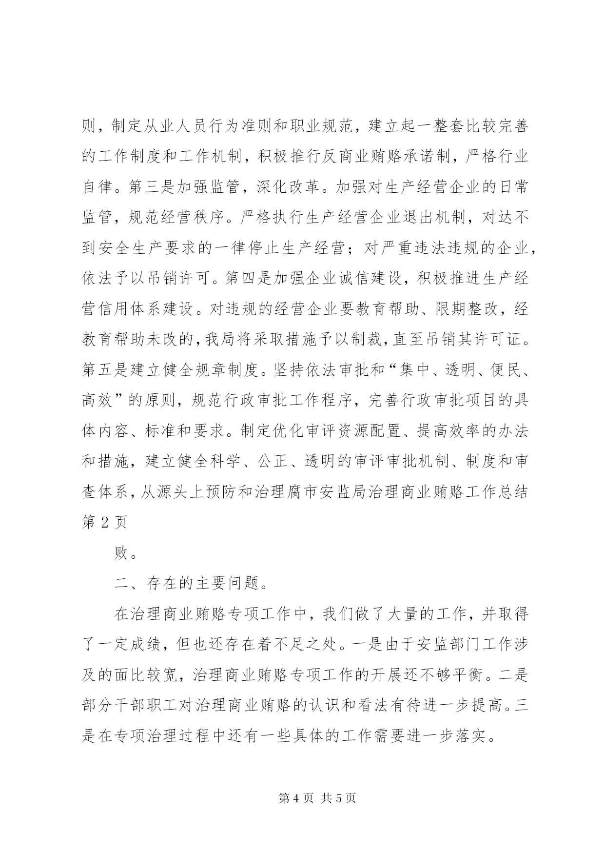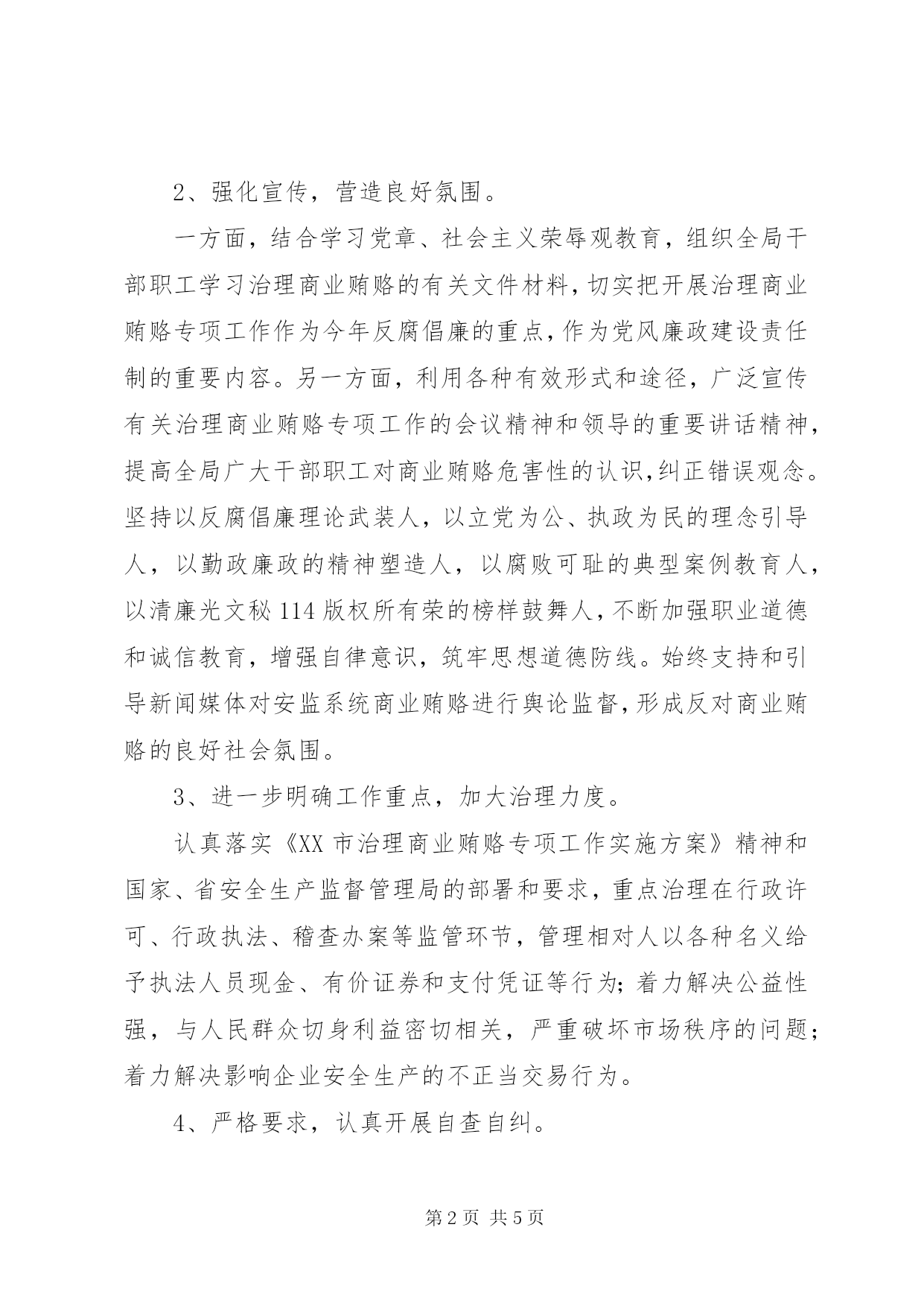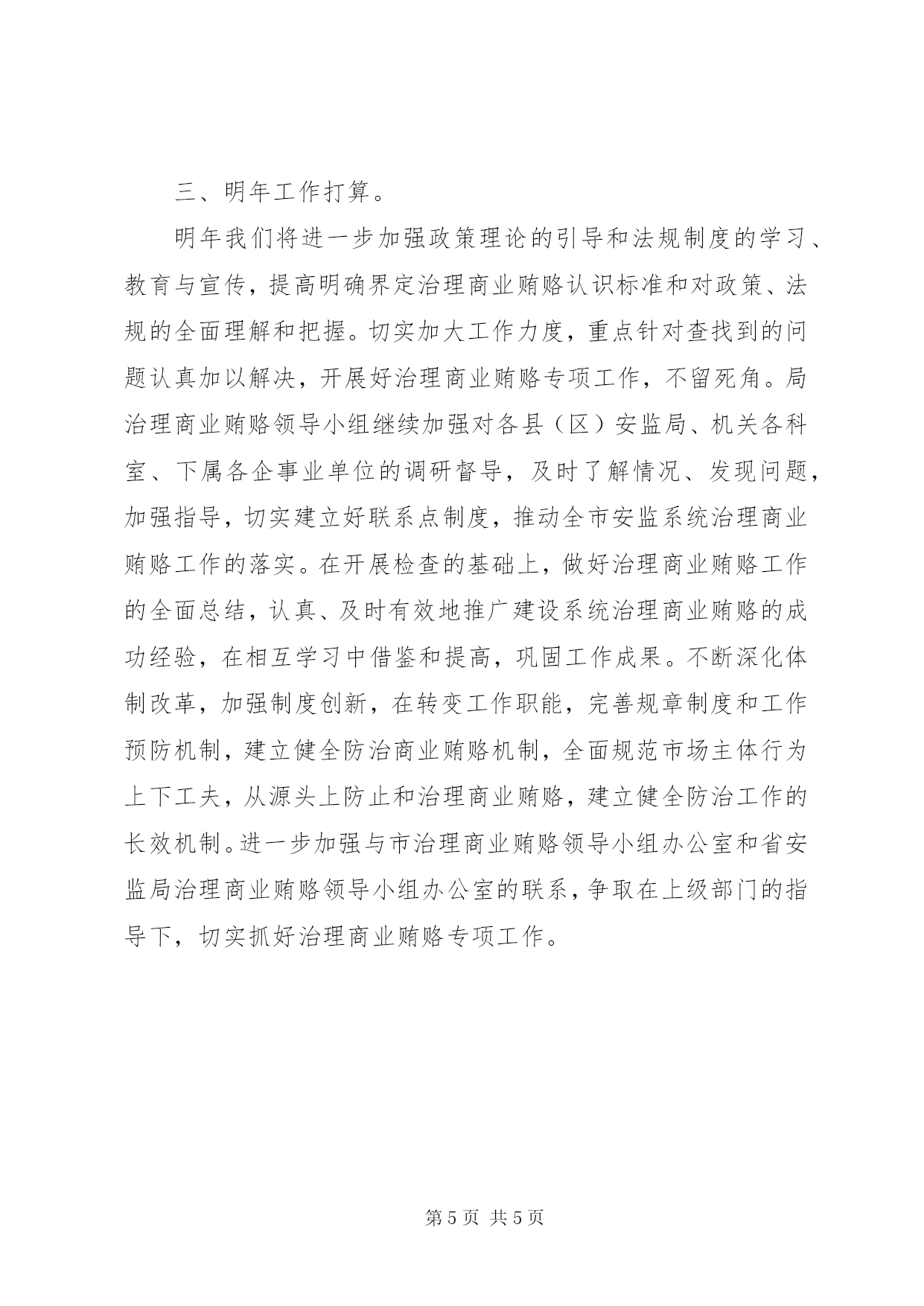 第PAGE\*Arabic\*MERGEFORMAT5页共NUMPAGES\*MERGEFORMAT5页市安监局治理商业贿赂工作总结市安监局20xx年治理商业贿赂工作总结今年以来,我局认真贯彻落实市委、市政府的部署,把治理商业贿赂作为抓好安监系统廉政建设的一个良好机遇,精心组织,周密部署,强化措施,狠抓落实,有力地推动了治理商业贿赂专项工作的深入开展。现将我局治理商业贿赂专项工作的有关情况总结如下:一、开展专项治理工作的基本情况1、加强对治贿专项工作的组织领导。6月8日全市治理商业贿赂工作会议结束以后,我局立即召开了全局干部职工大会,传达了“6.8”会议文秘114版权所有精神,并制定了治理商业贿赂专项工作实施方案。为切实抓好治贿工作,确保治贿工作扎实有效的进行,经局党组研究决定,成立了XX市安监局治理商业贿赂工作领导小组,由党组副书记谭伟龙同志任组长,其他党组成员、纪检组长任副组长,局办公室、法制培训科、纪检监察室负责同志为领导小组成员,领导小组办公室设在局纪检监察室,监察室主任兼任领导小组办公室主任,负责领导小组日常工作,确定了联络员,设立了市安监系统治理商业贿赂举报电话和意见箱,明确了各自的工作职责,形成了主要领导亲自抓、分管领导具体抓、各科室、下属各单位共同参与、齐抓共管的良好工作格局。2、强化宣传,营造良好氛围。一方面,结合学习党章、社会主义荣辱观教育,组织全局干部职工学习治理商业贿赂的有关文件材料,切实把开展治理商业贿赂专项工作作为今年反腐倡廉的重点,作为党风廉政建设责任制的重要内容。另一方面,利用各种有效形式和途径,广泛宣传有关治理商业贿赂专项工作的会议精神和领导的重要讲话精神,提高全局广大干部职工对商业贿赂危害性的认识,纠正错误观念。坚持以反腐倡廉理论武装人,以立党为公、执政为民的理念引导人,以勤政廉政的精神塑造人,以腐败可耻的典型案例教育人,以清廉光文秘114版权所有荣的榜样鼓舞人,不断加强职业道德和诚信教育,增强自律意识,筑牢思想道德防线。始终支持和引导新闻媒体对安监系统商业贿赂进行舆论监督,形成反对商业贿赂的良好社会氛围。3、进一步明确工作重点,加大治理力度。认真落实《XX市治理商业贿赂专项工作实施方案》精神和国家、省安全生产监督管理局的部署和要求,重点治理在行政许可、行政执法、稽查办案等监管环节,管理相对人以各种名义给予执法人员现金、有价证券和支付凭证等行为;着力解决公益性强,与人民群众切身利益密切相关,严重破坏市场秩序的问题;着力解决影响企业安全生产的不正当交易行为。4、严格要求,认真开展自查自纠。按照“谁主管(监管)、谁负责”和边查边改的原则,始终坚持本单位(科室)自查自纠与主管(监管)部门督促检查相结合,坚持批评教育、自我纠正与上级相关部门查办处理并重,坚持完善现行规章制度与建立防治商业贿赂长效机制相促进,结合自身实际,对本部门履行行政管理职能的情况和20xx年以来在经营活动中发生的不正当交易行为认真开展了自查自纠工作,主要从四个方面,一查是否依法行使行政审批权和行政执法权,有无不按法定条件和程序审批发证的问题,以及不正当执法的行为;二查是否存在参与或干预企业事业单位经营活动,谋取非法利益、索贿受贿等行为;三查是否存在玩忽职守、失职渎职以及其他不积极履行监管职责,放任、纵容甚至包庇搞不正当交易的行为;四查监管手段、方法和有关规章制度存在的缺陷或不足;经过将近半年来的对照检查,自查自纠,截至目前,未收到群众的投诉举报,也未发现一起违法违纪案件。5、建立起防治商业贿赂的长效机制。第一是加强教育引导,运用典型。在生产经营企业开展法律、法规、纪律和职业道德等方面的教育,广泛宣传有关政策,引导大家牢固树立以“八荣八耻”为主要内容的社会主义荣辱观,自觉增强拒腐防变的能力,积极营造科学监管、规范经营、公平交易的良好氛围。第二是强化企业制度建设,生产经营企业要树立以守法诚信、优质服务为核心的经营理念,严格遵守公平竞争规则,制定从业人员行为准则和职业规范,建立起一整套比较完善的工作制度和工作机制,积极推行反商业贿赂承诺制,严格行业自律。第三是加强监管,深化改革。加强对生产经营企业的日常监管,规范经营秩序。严格执行生产经营企业退出机制,对达不到安全生产要求的一律停止生产经营;对严重违法违规的企业,依法予以吊销许可。第四是加强企业诚信建设,积极推进生产经营信用体系建设。对违规的经营企业要教育帮助、限期整改,经教育帮助未改的,我局将采取措施予以制裁,直至吊销其许可证。第五是建立健全规章制度。坚持依法审批和“集中、透明、便民、高效”的原则,规范行政审批工作程序,完善行政审批项目的具体内容、标准和要求。制定优化审评资源配置、提高效率的办法和措施,建立健全科学、公正、透明的审评审批机制、制度和审查体系,