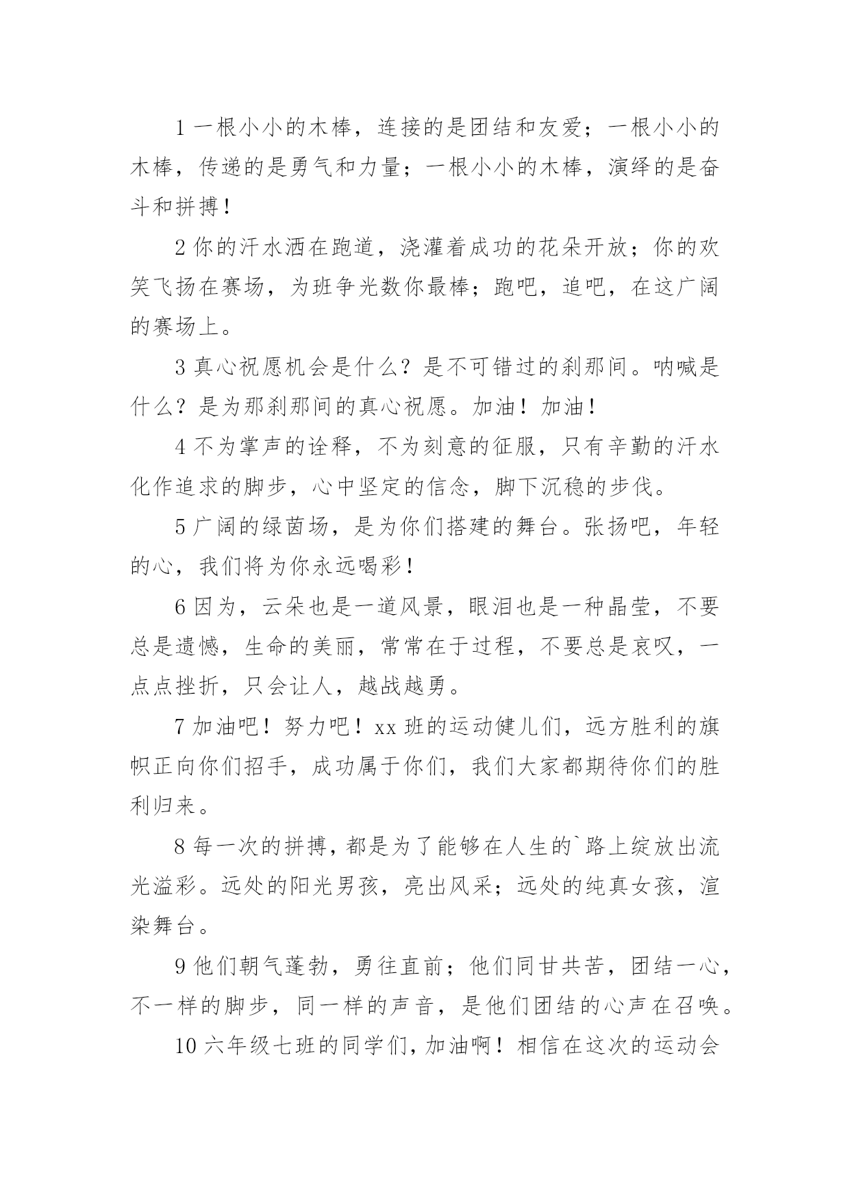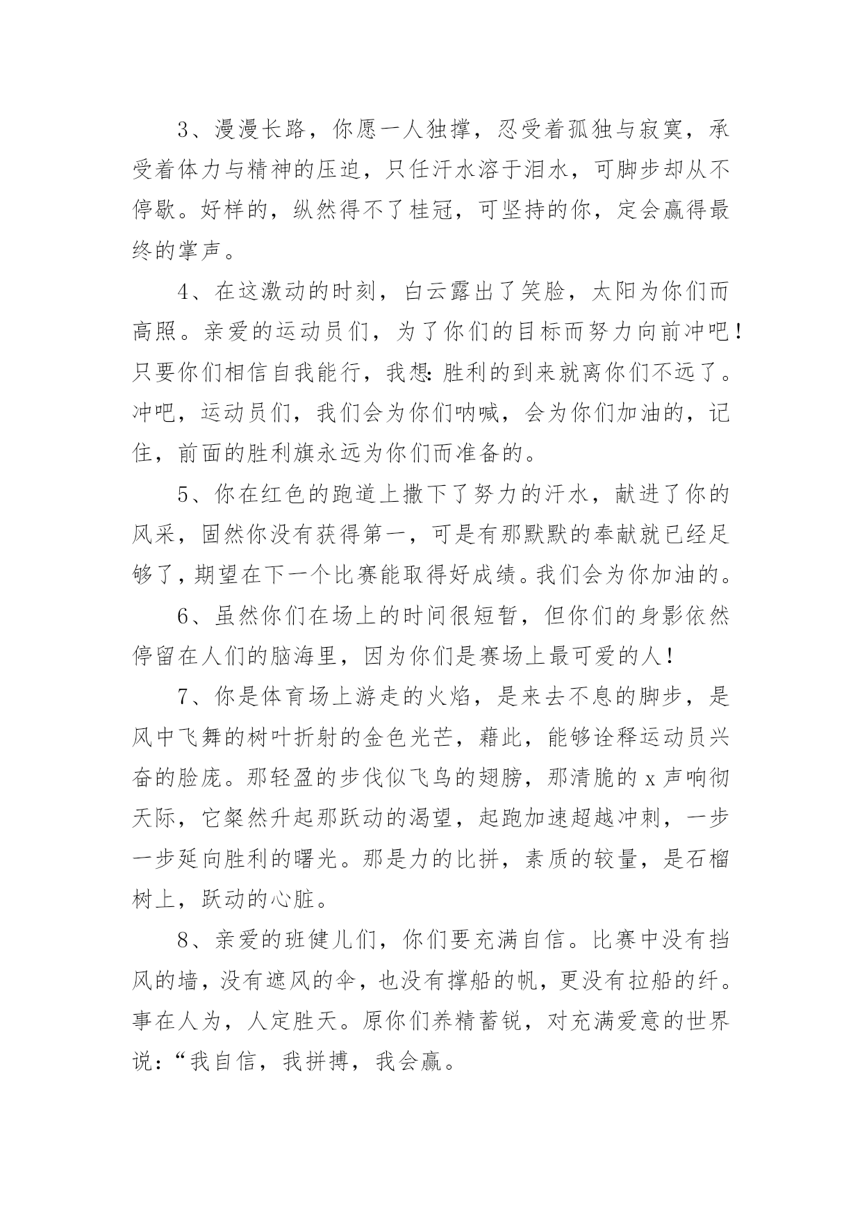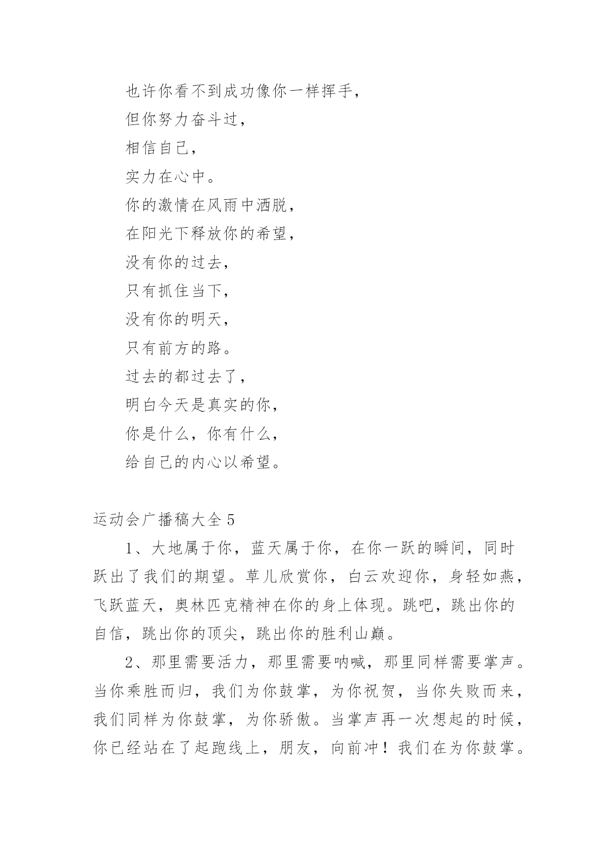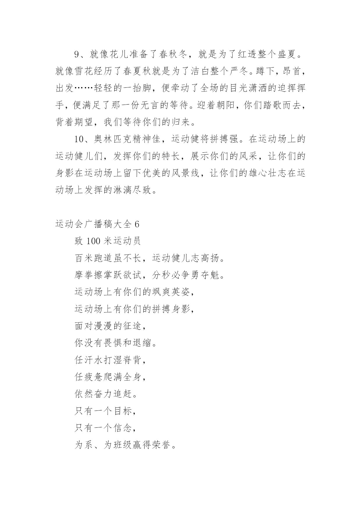 运动会广播稿运动会广播稿大全如果你是学校广播站的播音员,肯定会知道广播前一般都会预先做好广播稿,一份一流的广播稿能提高节目效果,那么你有了解过广播稿吗?下面是小编为大家整理的运动会广播稿大全,欢迎阅读与收藏。运动会广播稿大全1走过荒山野岭高峡低谷,我们在沿途燃起篝火,一站一站的路被抛在身后,我们感到疲惫感到困惑。还有那么长的路伸向远方,远方那片星光藏在哪儿,远方那颗童话树躲在何处,努力吧,奋斗吧!远方有我们的理想,由我们的希望!长跑运动员运动会广播稿大全2青春飞扬,我们向新纪元进军。冲吧,跳吧!拼出你顽强的毅力,展现你矫健的身姿。漫漫征途就在脚下,胜利歌声属于拼搏不息的生命。激情荡漾,我们演绎人类凯歌。喊吧,唱吧!吼出你心底的歌声,唱出你远大的宏图。心中目标终成现实,胜利歌声属于每一颗激动的心。为生命喝彩,向青春举杯。这儿杭电体育场,我们新世纪大学生。一起向胜利进军,向人类极限挑战。人类生命之舟因之而永远向前,为生命喝彩,更为年轻的生命喝彩!运动会广播稿大全3这是速度与毅力的接力,这是期望与祈盼的接力,时间在这里凝固,千百双眼睛都在注视着你们那矫健的身影,成功失败就在转瞬间,但我们有理由相信你们是最棒的,全班50多双眼睛在注视着你们,一点不要辜负了这些为你们跳动的心,向前冲吧。迸发的是无穷的力量,温暖的是全体xx班师生的心,演绎的是我们的团结友爱,50多双眼睛此时凝聚成一道信任的光束,希望你们带着这些光束创造属于你们的成功。不长不短的距离,需要的却是全身心全程投入,自始至终你们都在拼尽全力,此时此刻,你们处在最风光的一刻,无论第几坚持胜利的信心,只要跑下来,你们就是英雄。运动会广播稿大全4你是跑道上的流星,燃烧自己,发光,也许你看不到成功像你一样挥手,但你努力奋斗过,相信自己,实力在心中。你的激情在风雨中洒脱,在阳光下释放你的希望,没有你的过去,只有抓住当下,没有你的明天,只有前方的路。过去的都过去了,明白今天是真实的你,你是什么,你有什么,给自己的内心以希望。运动会广播稿大全51、大地属于你,蓝天属于你,在你一跃的瞬间,同时跃出了我们的期望。草儿欣赏你,白云欢迎你,身轻如燕,飞跃蓝天,奥林匹克精神在你的身上体现。跳吧,跳出你的自信,跳出你的顶尖,跳出你的胜利山巅。2、那里需要活力,那里需要呐喊,那里同样需要掌声。当你乘胜而归,我们为你鼓掌,为你祝贺,当你失败而来,我们同样为你鼓掌,为你骄傲。当掌声再一次想起的时候,你已经站在了起跑线上,朋友,向前冲!我们在为你鼓掌。3、漫漫长路,你愿一人独撑,忍受着孤独与寂寞,承受着体力与精神的压迫,只任汗水溶于泪水,可脚步却从不停歇。好样的,纵然得不了桂冠,可坚持的你,定会赢得最终的掌声。4、在这激动的时刻,白云露出了笑脸,太阳为你们而高照。亲爱的运动员们,为了你们的目标而努力向前冲吧!只要你们相信自我能行,我想:胜利的到来就离你们不远了。冲吧,运动员们,我们会为你们呐喊,会为你们加油的,记住,前面的胜利旗永远为你们而准备的。5、你在红色的跑道上撒下了努力的汗水,献进了你的风采,固然你没有获得第一,可是有那默默的奉献就已经足够了,期望在下一个比赛能取得好成绩。我们会为你加油的。6、虽然你们在场上的时间很短暂,但你们的身影依然停留在人们的脑海里,因为你们是赛场上最可爱的人!7、你是体育场上游走的火焰,是来去不息的脚步,是风中飞舞的树叶折射的金色光芒,藉此,能够诠释运动员兴奋的脸庞。那轻盈的步伐似飞鸟的翅膀,那清脆的x声响彻天际,它粲然升起那跃动的渴望,起跑加速超越冲刺,一步一步延向胜利的曙光。那是力的比拼,素质的较量,是石榴树上,跃动的心脏。8、亲爱的班健儿们,你们要充满自信。比赛中没有挡风的墙,没有遮风的伞,也没有撑船的帆,更没有拉船的纤。事在人为,人定胜天。原你们养精蓄锐,对充满爱意的世界说:“我自信,我拼搏,我会赢。9、就像花儿准备了春秋冬,就是为了红透整个盛夏。就像雪花经历了春夏秋就是为了洁白整个严冬。蹲下,昂首,出发……轻轻的一抬脚,便牵动了全场的目光潇洒的迫挥挥手,便满足了那一份无言的等待。迎着朝阳,你们踏歌而去,背着期望,我们等待你们的归来。10、奥林匹克精神佳,运动健将拼搏强。在运动场上的运动健儿们,发挥你们的特长,展示你们的风采,让你们的身影在运动场上留下优美的风景线,让你们的雄心壮志在运动场上发挥的淋漓尽致。运动会广播稿大全6致100米运动员百米跑道虽不长,运动健儿志高扬。摩拳擦掌跃欲试,分秒必争勇夺魁。运动场上有你们的飒爽英姿,运动场上有你们的拼搏身影,面对漫漫的征途,你没有畏惧和退缩。任汗水打湿脊背,任疲惫爬满全身,依然奋力追赶。只有一个目标,只有一个信念,为系、为班级赢得荣誉。无限追求,奋力追赶,拼搏吧!我为你们呐喊、欢呼、跳跃!我们为你骄傲、自豪。加油,加油致