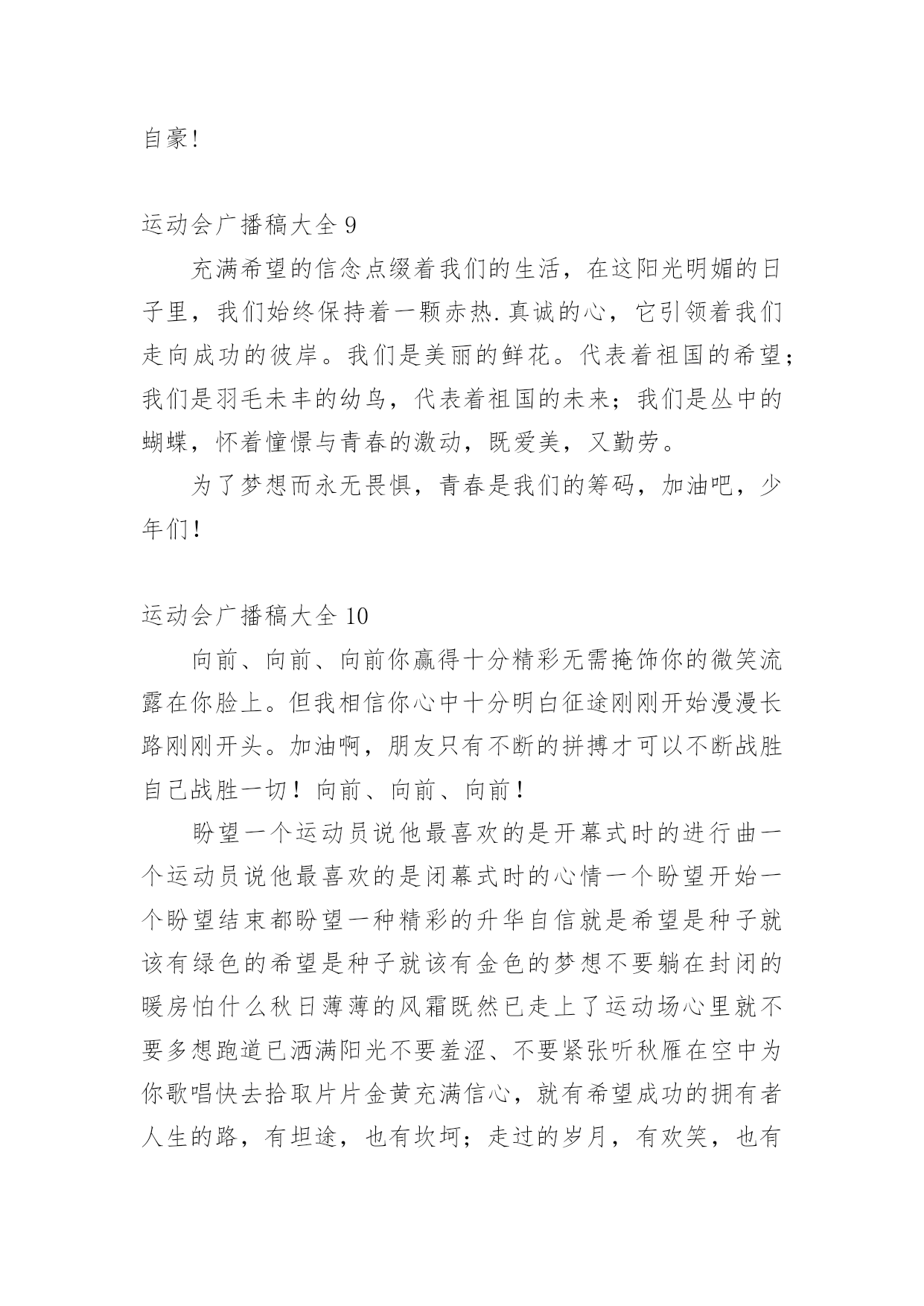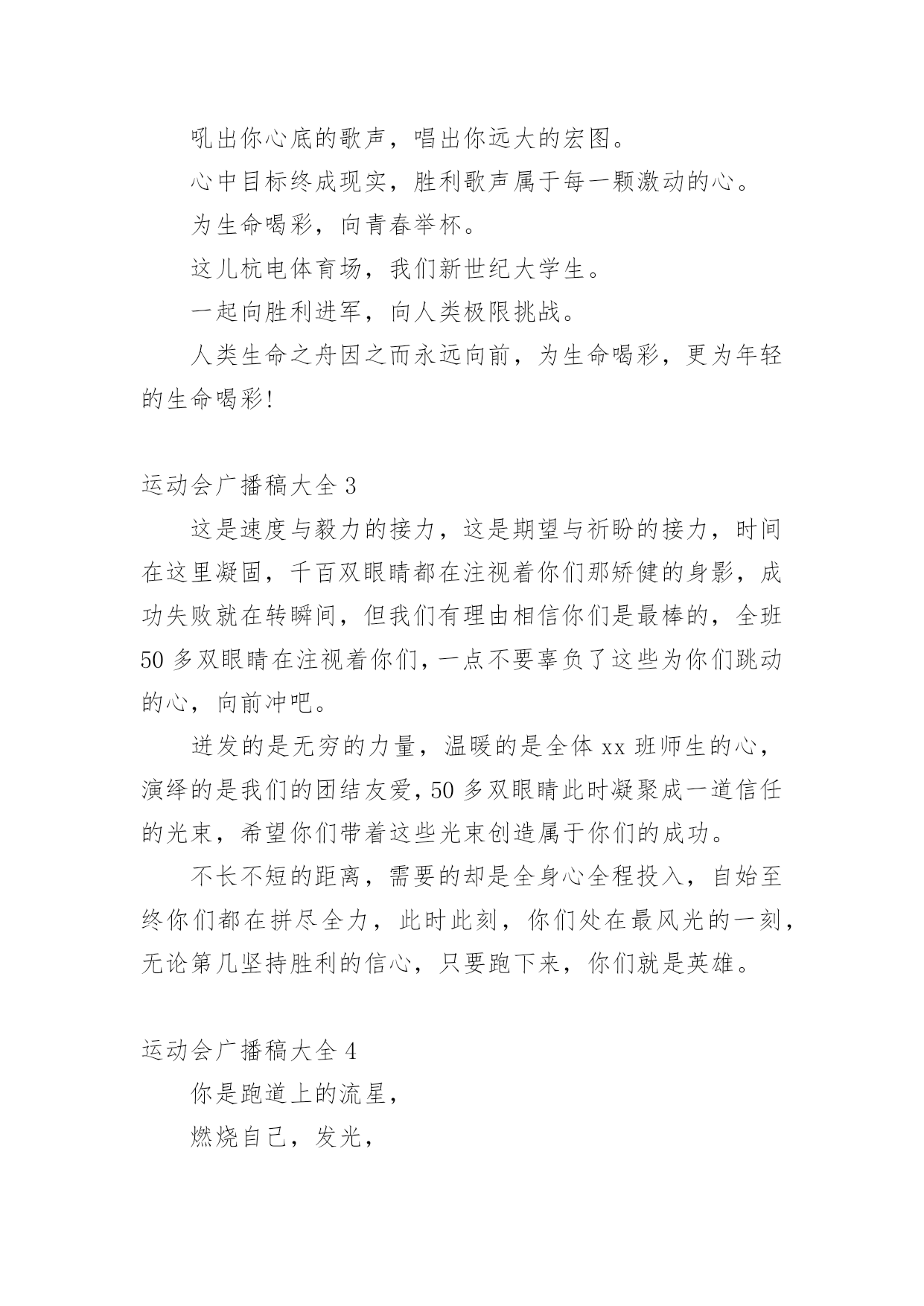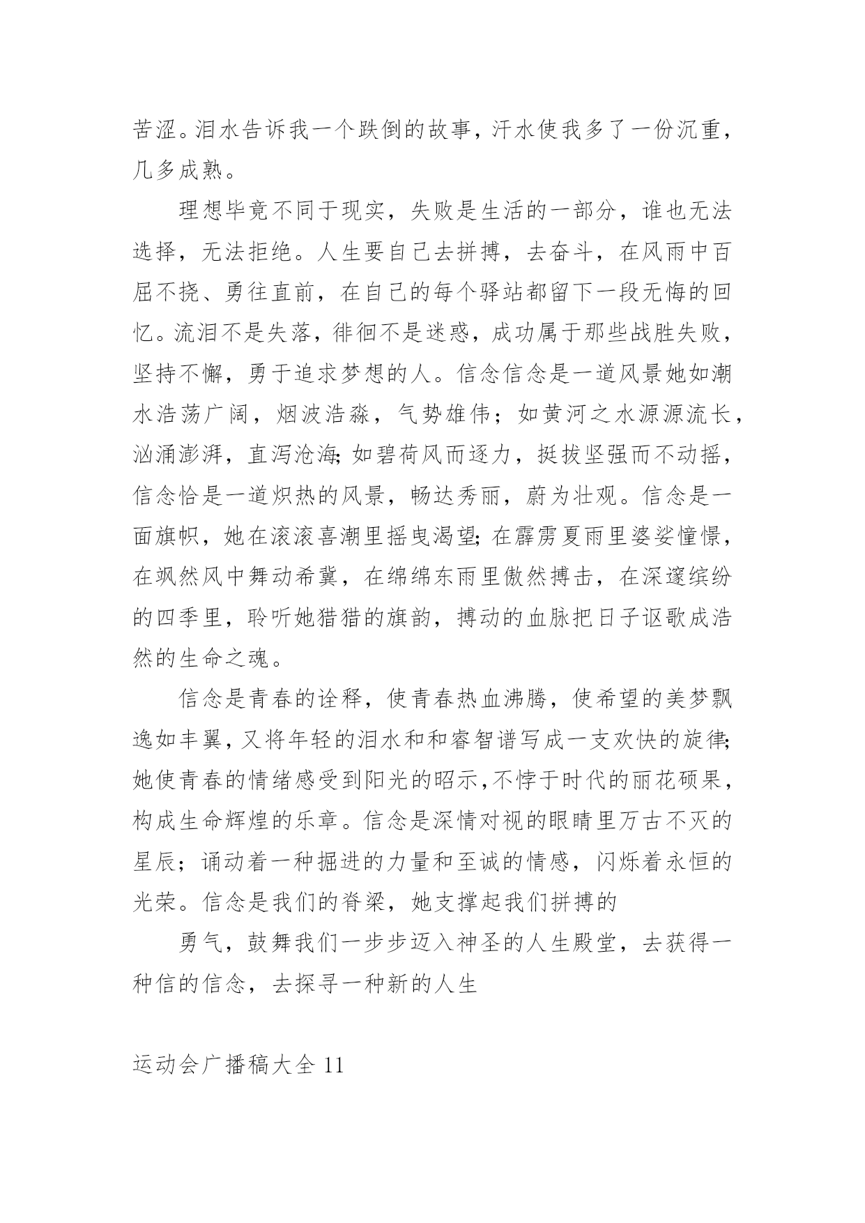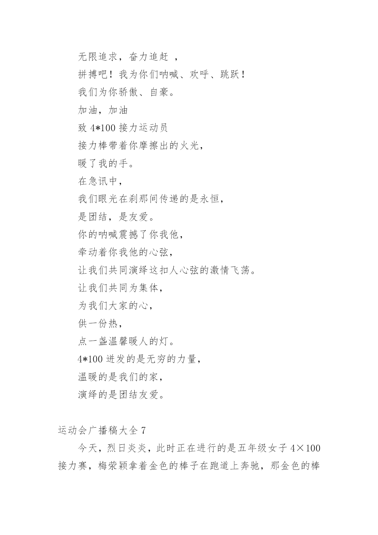运动会广播稿运动会广播稿大全如果你是学校广播站的播音员,肯定会知道广播前一般都会预先做好广播稿,一份一流的广播稿能提高节目效果,那么你有了解过广播稿吗?下面是小编为大家整理的运动会广播稿大全,欢迎阅读与收藏。运动会广播稿大全1走过荒山野岭高峡低谷,我们在沿途燃起篝火,一站一站的路被抛在身后,我们感到疲惫感到困惑。还有那么长的路伸向远方,远方那片星光藏在哪儿,远方那颗童话树躲在何处,努力吧,奋斗吧!远方有我们的理想,由我们的希望!长跑运动员运动会广播稿大全2青春飞扬,我们向新纪元进军。冲吧,跳吧!拼出你顽强的毅力,展现你矫健的身姿。漫漫征途就在脚下,胜利歌声属于拼搏不息的生命。激情荡漾,我们演绎人类凯歌。喊吧,唱吧!吼出你心底的歌声,唱出你远大的宏图。心中目标终成现实,胜利歌声属于每一颗激动的心。为生命喝彩,向青春举杯。这儿杭电体育场,我们新世纪大学生。一起向胜利进军,向人类极限挑战。人类生命之舟因之而永远向前,为生命喝彩,更为年轻的生命喝彩!运动会广播稿大全3这是速度与毅力的接力,这是期望与祈盼的接力,时间在这里凝固,千百双眼睛都在注视着你们那矫健的身影,成功失败就在转瞬间,但我们有理由相信你们是最棒的,全班50多双眼睛在注视着你们,一点不要辜负了这些为你们跳动的心,向前冲吧。迸发的是无穷的力量,温暖的是全体xx班师生的心,演绎的是我们的团结友爱,50多双眼睛此时凝聚成一道信任的光束,希望你们带着这些光束创造属于你们的成功。不长不短的距离,需要的却是全身心全程投入,自始至终你们都在拼尽全力,此时此刻,你们处在最风光的一刻,无论第几坚持胜利的信心,只要跑下来,你们就是英雄。运动会广播稿大全4你是跑道上的流星,燃烧自己,发光,也许你看不到成功像你一样挥手,但你努力奋斗过,相信自己,实力在心中。你的激情在风雨中洒脱,在阳光下释放你的希望,没有你的过去,只有抓住当下,没有你的明天,只有前方的路。过去的都过去了,明白今天是真实的你,你是什么,你有什么,给自己的内心以希望。运动会广播稿大全51、大地属于你,蓝天属于你,在你一跃的瞬间,同时跃出了我们的期望。草儿欣赏你,白云欢迎你,身轻如燕,飞跃蓝天,奥林匹克精神在你的身上体现。跳吧,跳出你的自信,跳出你的顶尖,跳出你的胜利山巅。2、那里需要活力,那里需要呐喊,那里同样需要掌声。当你乘胜而归,我们为你鼓掌,为你祝贺,当你失败而来,我们同样为你鼓掌,为你骄傲。当掌声再一次想起的时候,你已经站在了起跑线上,朋友,向前冲!我们在为你鼓掌。3、漫漫长路,你愿一人独撑,忍受着孤独与寂寞,承受着体力与精神的压迫,只任汗水溶于泪水,可脚步却从不停歇。好样的,纵然得不了桂冠,可坚持的你,定会赢得最终的掌声。4、在这激动的时刻,白云露出了笑脸,太阳为你们而高照。亲爱的运动员们,为了你们的目标而努力向前冲吧!只要你们相信自我能行,我想:胜利的到来就离你们不远了。冲吧,运动员们,我们会为你们呐喊,会为你们加油的,记住,前面的胜利旗永远为你们而准备的。5、你在红色的跑道上撒下了努力的汗水,献进了你的风采,固然你没有获得第一,可是有那默默的奉献就已经足够了,期望在下一个比赛能取得好成绩。我们会为你加油的。6、虽然你们在场上的时间很短暂,但你们的身影依然停留在人们的脑海里,因为你们是赛场上最可爱的人!7、你是体育场上游走的火焰,是来去不息的脚步,是风中飞舞的树叶折射的金色光芒,藉此,能够诠释运动员兴奋的脸庞。那轻盈的步伐似飞鸟的翅膀,那清脆的x声响彻天际,它粲然升起那跃动的渴望,起跑加速超越冲刺,一步一步延向胜利的曙光。那是力的比拼,素质的较量,是石榴树上,跃动的心脏。8、亲爱的班健儿们,你们要充满自信。比赛中没有挡风的墙,没有遮风的伞,也没有撑船的帆,更没有拉船的纤。事在人为,人定胜天。原你们养精蓄锐,对充满爱意的世界说:“我自信,我拼搏,我会赢。9、就像花儿准备了春秋冬,就是为了红透整个盛夏。就像雪花经历了春夏秋就是为了洁白整个严冬。蹲下,昂首,出发……轻轻的一抬脚,便牵动了全场的目光潇洒的迫挥挥手,便满足了那一份无言的等待。迎着朝阳,你们踏歌而去,背着期望,我们等待你们的归来。10、奥林匹克精神佳,运动健将拼搏强。在运动场上的运动健儿们,发挥你们的特长,展示你们的风采,让你们的身影在运动场上留下优美的风景线,让你们的雄心壮志在运动场上发挥的淋漓尽致。运动会广播稿大全6致100米运动员百米跑道虽不长,运动健儿志高扬。摩拳擦掌跃欲试,分秒必争勇夺魁。运动场上有你们的飒爽英姿,运动场上有你们的拼搏身影,面对漫漫的征途,你没有畏惧和退缩。任汗水打湿脊背,任疲惫爬满全身,依然奋力追赶。只有一个目标,只有一个信念,为系、为班级赢得荣誉。无限追求,奋力追赶,拼搏吧!我为你们呐喊、欢呼、跳跃!我们为你骄傲、自豪。加油,加油致