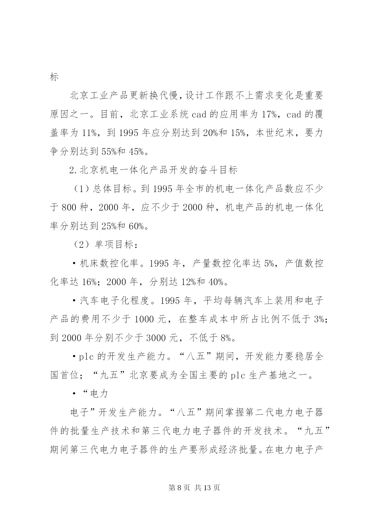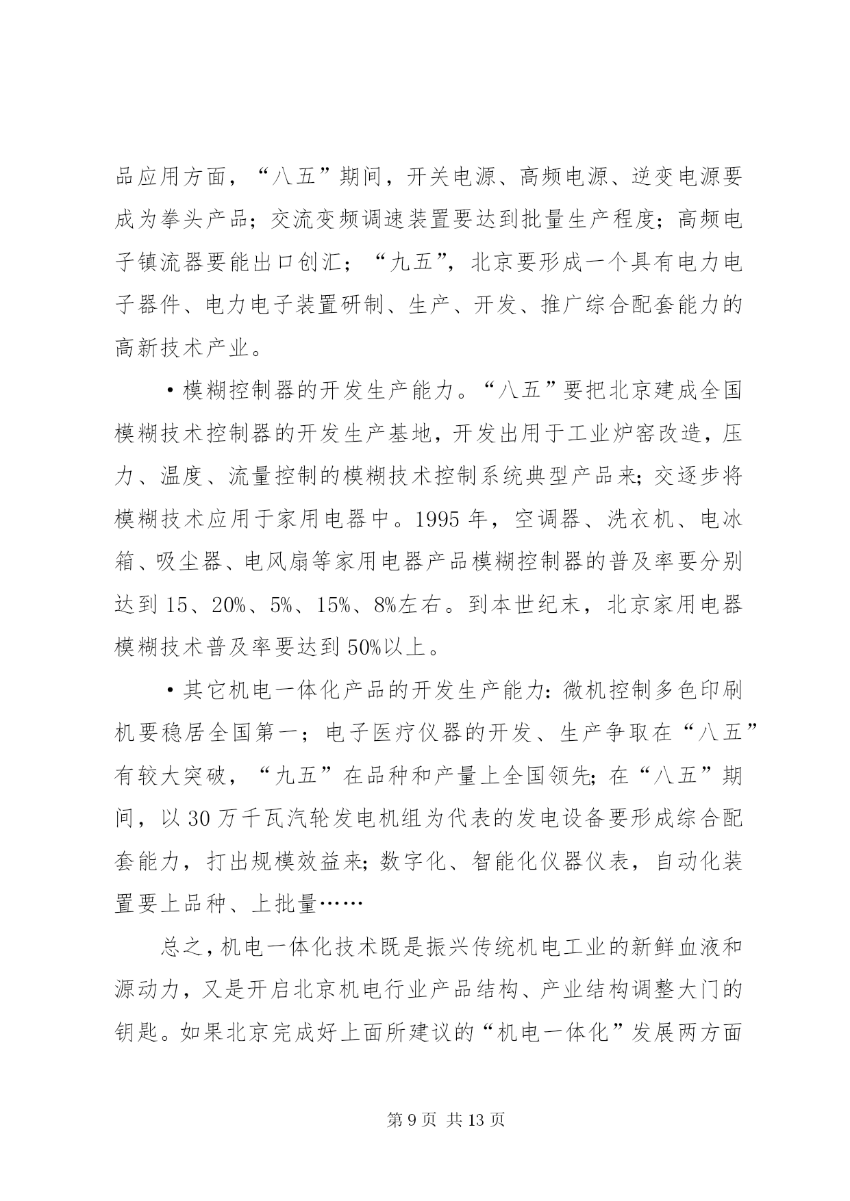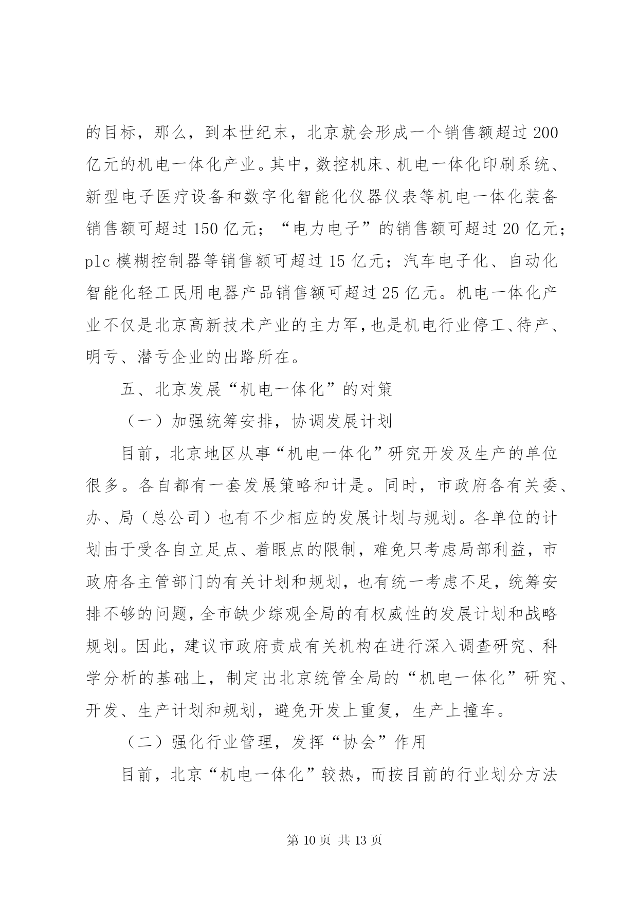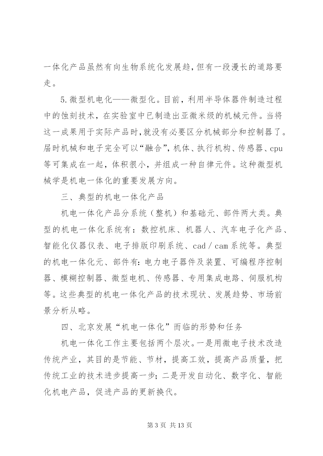 第PAGE\*Arabic\*MERGEFORMAT13页共NUMPAGES\*MERGEFORMAT13页发展“机电一体化”的思路和对策主题词:机电一体化、对策一、机电一体化技术发展历程及其趋势自电子技术一问世,电子技术与机械技术的结合就开始了,只是出现了半导体集成电路,尤其是出现了以微处理器为代表的大规模集成电路以后,"机电一体化"技术之后有了明显进展,引起了人们的广泛注意.(一)"机电一体化"的发展历程1.数控机床的问世,写下了"机电一体化"历史的第一页;2.微电子技术为"机电一体化''带来勃勃生机;3.可编程序控制器、"电力电子"等的发展为"机电一体化"提供了坚强基础;4.激光技术、模糊技术、信息技术等新技术使"机电一体化"跃上新台阶.(二)"机电一体化"发展趋势1.光机电一体化.一般的机电一体化系统是由传感系统、能源系统、信息处理系统、机械结构等部件组成的.因此,引进光学技术,实现光学技术的先天优点是能有效地改进机电一体化系统的传感系统、能源(动力)系统和信息处理系统.光机电一体化是机电产品发展的重要趋势.2.自律分配系统化——柔性化.未来的机电一体化产品,控制和执行系统有足够的“冗余度”,有较强的“柔性”,能较好地应付突发事件,被设计成“自律分配系统”。在自律分配系统中,各个子系统是相互独立工作的,子系统为总系统服务,同时具有本身的“自律性”,可根据不同的环境条件作出不同反应。其特点是子系统可产生本身的信息并附加所给信息,在总的前提下,具体“行动”是可以改变的。这样,既明显地增加了系统的适应能力(柔性),又不因某一子系统的故障而影响整个系统。3.全息系统化——智能化。今后的机电一体化产品“全息”特征越来越明显,智能化水平越来越高。这主要收益于模糊技术、信息技术(尤其是软件及芯片技术)的发展。除此之外,其系统的层次结构,也变简单的“从上到下”的形势而为复杂的、有较多冗余度的双向联系。4.“生物一软件”化—仿生物系统化。今后的机电一体化装置对信息的依赖性很大,并且往往在结构上是处于“静态”时不稳定,但在动态(工作)时却是稳定的。这有点类似于活的生物:当控制系统(大脑)停止工作时,生物便“死亡”,而当控制系统(大脑)工作时,生物就很有活力。仿生学研究领域中已发现的一些生物体优良的机构可为机电一体化产品提供新型机体,但如何使这些新型机体具有活的“生命”还有待于深入研究。这一研究领域称为“生物——软件”或“生物系统”,而生物的特点是硬件(肌体)——软件(大脑)一体,不可分割。看来,机电一体化产品虽然有向生物系统化发展趋,但有一段漫长的道路要走。5.微型机电化——微型化。目前,利用半导体器件制造过程中的蚀刻技术,在实验室中已制造出亚微米级的机械元件。当将这一成果用于实际产品时,就没有必要区分机械部分和控制器了。届时机械和电子完全可以“融合”,机体、执行机构、传感器、cpu等可集成在一起,体积很小,并组成一种自律元件。这种微型机械学是机电一体化的重要发展方向。三、典型的机电一体化产品机电一体化产品分系统(整机)和基础元、部件两大类。典型的机电一体化系统有:数控机床、机器人、汽车电子化产品、智能化仪器仪表、电子排版印刷系统、cad/cam系统等。典型的机电一体化元、部件有:电力电子器件及装置、可编程序控制器、模糊控制器、微型电机、传感器、专用集成电路、伺服机构等。这些典型的机电一体化产品的技术现状、发展趋势、市场前景分析从略。四、北京发展“机电一体化”而临的形势和任务机电一体化工作主要包括两个层次。一是用微电子技术改造传统产业,其目的是节能、节材,提高工效,提高产品质量,把传统工业的技术进步提高一步;二是开发自动化、数字化、智能化机电产品,促进产品的更新换代。前者是面上的工作,普及工作;后者是提高工作,深层次工作。(一)北京“机电一体化”工作面临的形势1.北京用微电子技术改造传统工业的工作量大而广,有难度(1)在700余家XX省属工业系统的企业中,有60%以上的企业用微电子技术改造机床设备、工业窑炉、风机电泵、生产过程的任务还未完成需要量的一半。(2)北京工业系统还有2000余台机床设备亟需用微电子技术进行改造;在已改造的近6500台机床设备中,大约有15%需进一步改造。(3)北京工业系统尚有近250座工业炉窑亟需用电子信息技术进行改造;且610座已改造过的工业炉窑也很有进一步应用模糊技术进行二次改造的必要。(4)北京工业系统cad应用还有较大差距。目前,北京工业品设计,cad应用率仅17%(而美、日等国已超过85%;国内先进地区也超过了30%);cad的覆盖率才达到11%(而全国cad应用工程领导小组指出,“八五”期间大中型企业要达到35%,中小型骨干企业要达到15%—20%;到“九五”时,按国务委员宋