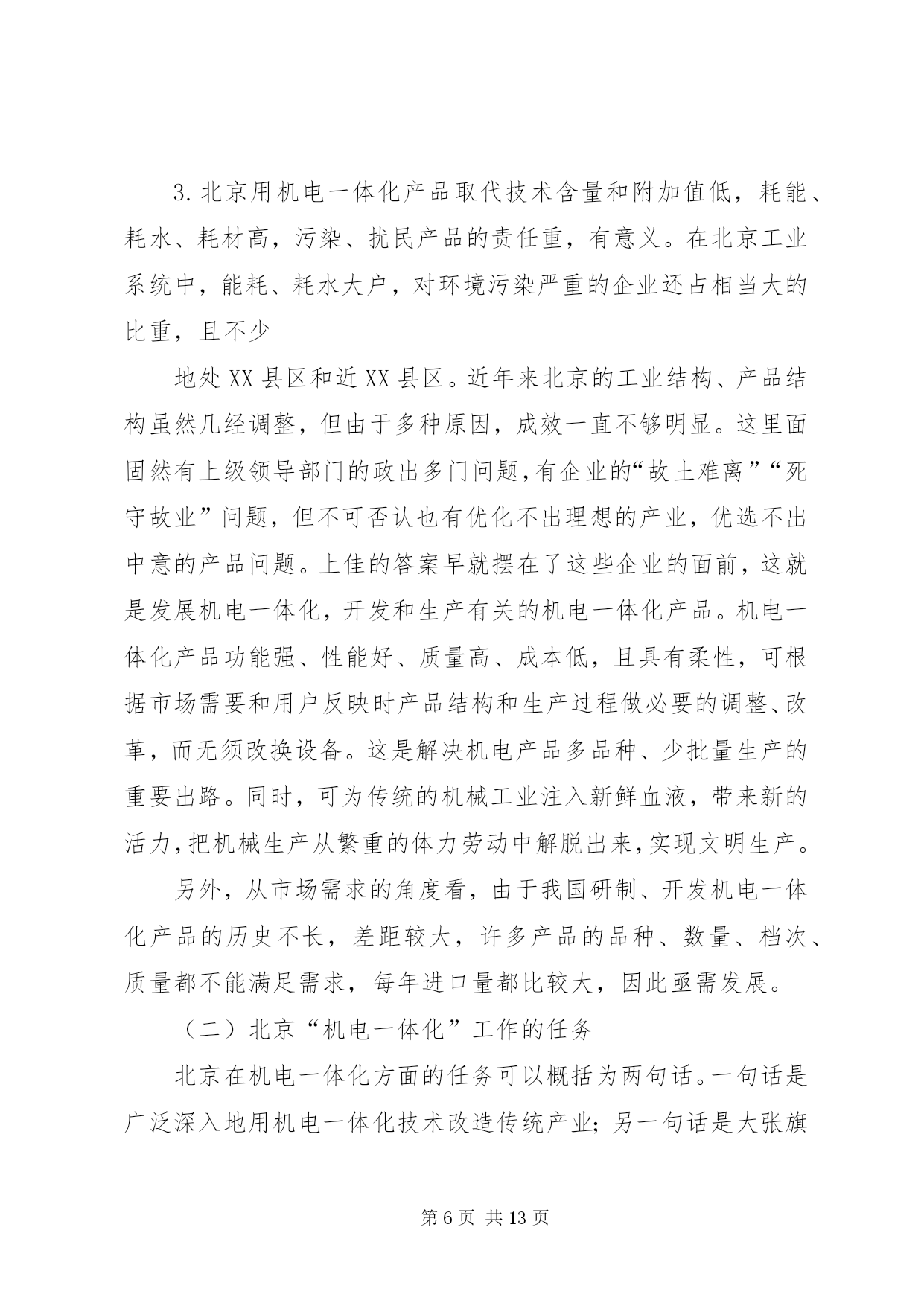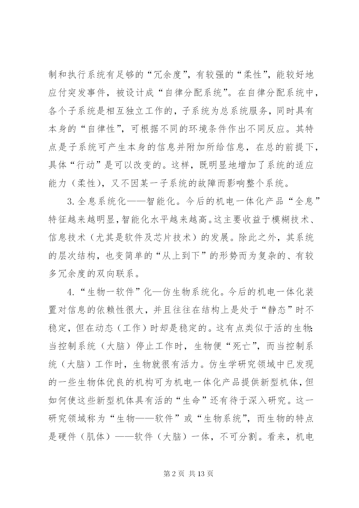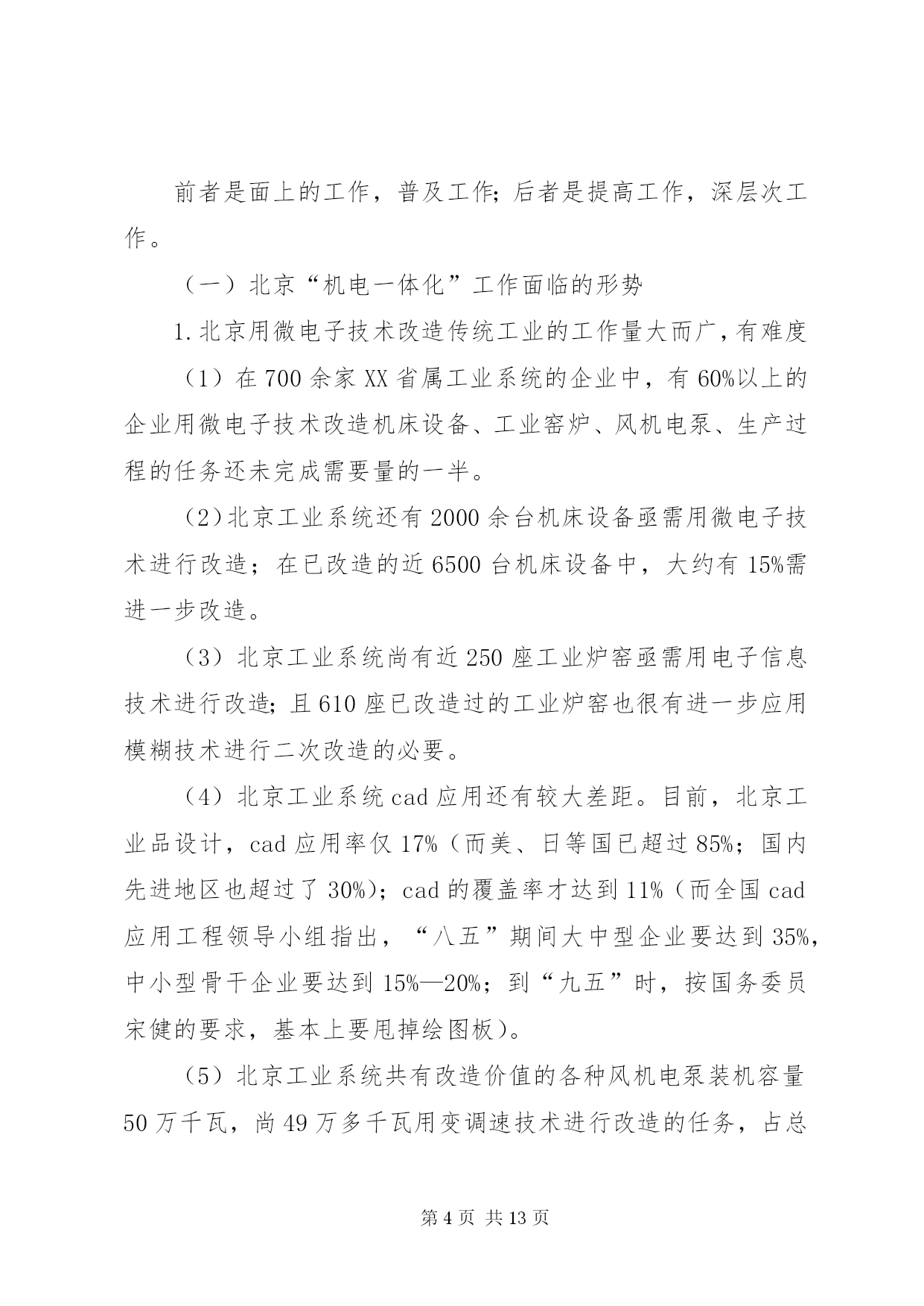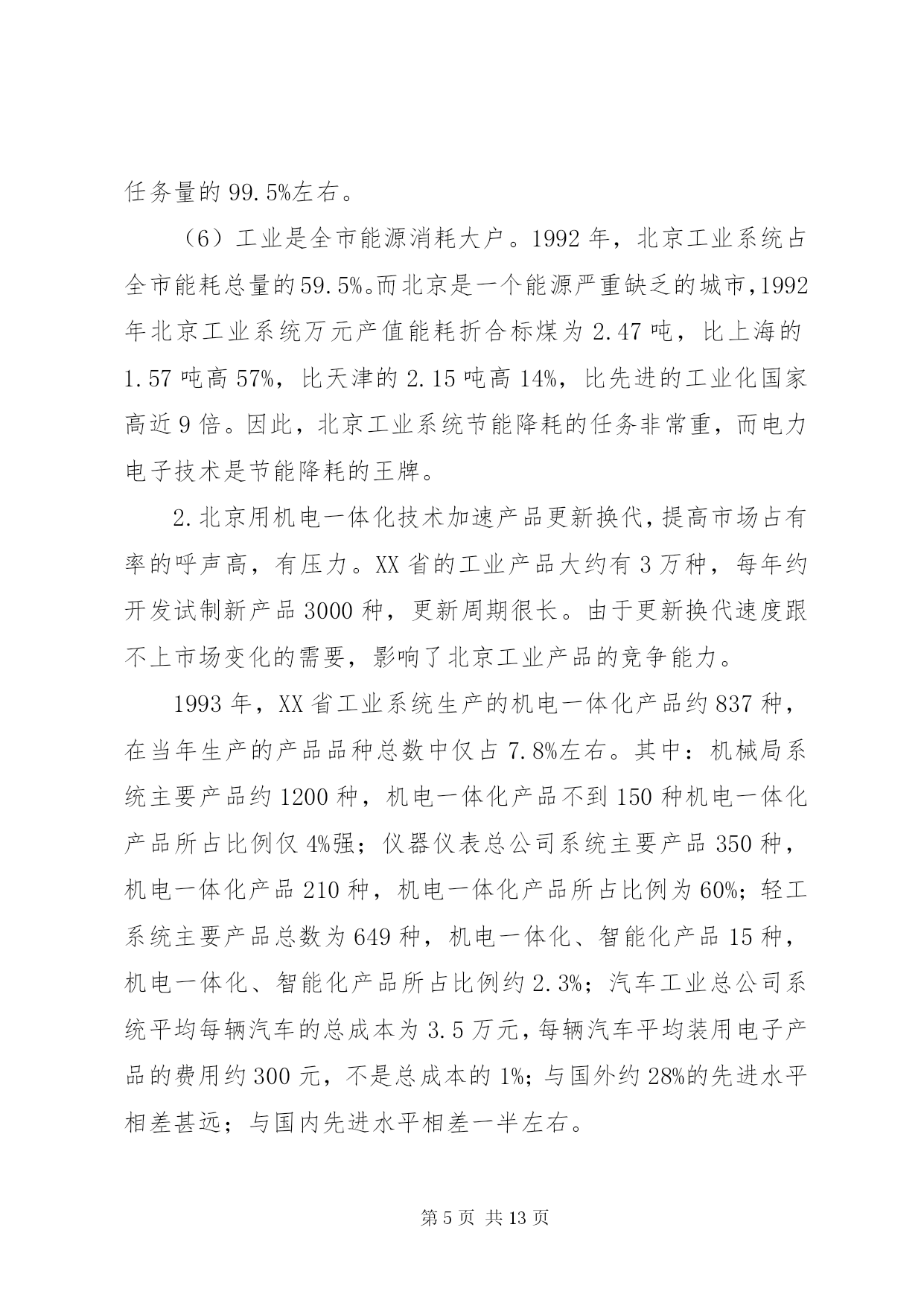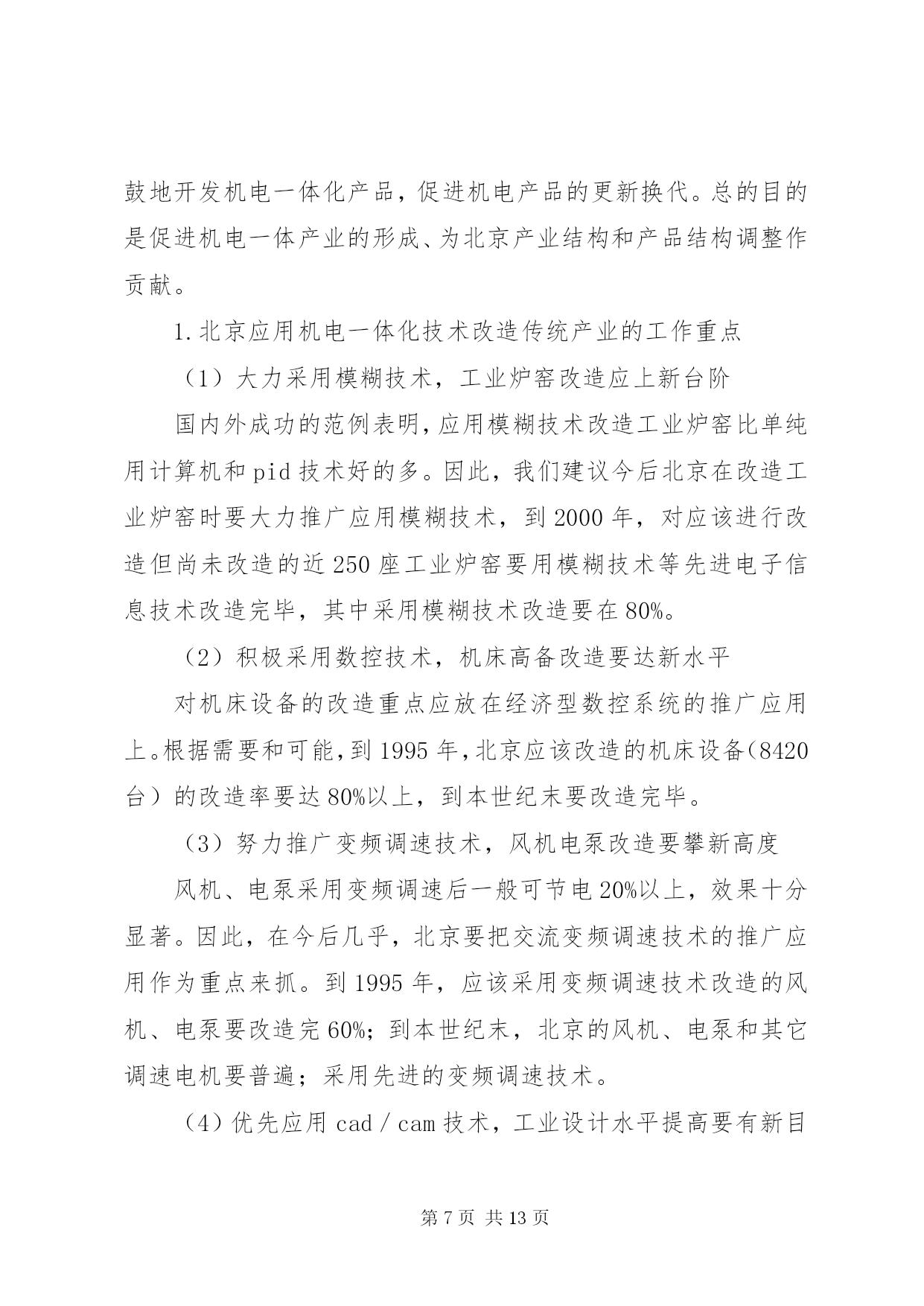 第PAGE\*Arabic\*MERGEFORMAT13页共NUMPAGES\*MERGEFORMAT13页发展“机电一体化”的思路和对策主题词:机电一体化、对策一、机电一体化技术发展历程及其趋势自电子技术一问世,电子技术与机械技术的结合就开始了,只是出现了半导体集成电路,尤其是出现了以微处理器为代表的大规模集成电路以后,"机电一体化"技术之后有了明显进展,引起了人们的广泛注意.(一)"机电一体化"的发展历程1.数控机床的问世,写下了"机电一体化"历史的第一页;2.微电子技术为"机电一体化''带来勃勃生机;3.可编程序控制器、"电力电子"等的发展为"机电一体化"提供了坚强基础;4.激光技术、模糊技术、信息技术等新技术使"机电一体化"跃上新台阶.(二)"机电一体化"发展趋势1.光机电一体化.一般的机电一体化系统是由传感系统、能源系统、信息处理系统、机械结构等部件组成的.因此,引进光学技术,实现光学技术的先天优点是能有效地改进机电一体化系统的传感系统、能源(动力)系统和信息处理系统.光机电一体化是机电产品发展的重要趋势.2.自律分配系统化——柔性化.未来的机电一体化产品,控制和执行系统有足够的“冗余度”,有较强的“柔性”,能较好地应付突发事件,被设计成“自律分配系统”。在自律分配系统中,各个子系统是相互独立工作的,子系统为总系统服务,同时具有本身的“自律性”,可根据不同的环境条件作出不同反应。其特点是子系统可产生本身的信息并附加所给信息,在总的前提下,具体“行动”是可以改变的。这样,既明显地增加了系统的适应能力(柔性),又不因某一子系统的故障而影响整个系统。3.全息系统化——智能化。今后的机电一体化产品“全息”特征越来越明显,智能化水平越来越高。这主要收益于模糊技术、信息技术(尤其是软件及芯片技术)的发展。除此之外,其系统的层次结构,也变简单的“从上到下”的形势而为复杂的、有较多冗余度的双向联系。4.“生物一软件”化—仿生物系统化。今后的机电一体化装置对信息的依赖性很大,并且往往在结构上是处于“静态”时不稳定,但在动态(工作)时却是稳定的。这有点类似于活的生物:当控制系统(大脑)停止工作时,生物便“死亡”,而当控制系统(大脑)工作时,生物就很有活力。仿生学研究领域中已发现的一些生物体优良的机构可为机电一体化产品提供新型机体,但如何使这些新型机体具有活的“生命”还有待于深入研究。这一研究领域称为“生物——软件”或“生物系统”,而生物的特点是硬件(肌体)——软件(大脑)一体,不可分割。看来,机电一体化产品虽然有向生物系统化发展趋,但有一段漫长的道路要走。5.微型机电化——微型化。目前,利用半导体器件制造过程中的蚀刻技术,在实验室中已制造出亚微米级的机械元件。当将这一成果用于实际产品时,就没有必要区分机械部分和控制器了。届时机械和电子完全可以“融合”,机体、执行机构、传感器、cpu等可集成在一起,体积很小,并组成一种自律元件。这种微型机械学是机电一体化的重要发展方向。三、典型的机电一体化产品机电一体化产品分系统(整机)和基础元、部件两大类。典型的机电一体化系统有:数控机床、机器人、汽车电子化产品、智能化仪器仪表、电子排版印刷系统、cad/cam系统等。典型的机电一体化元、部件有:电力电子器件及装置、可编程序控制器、模糊控制器、微型电机、传感器、专用集成电路、伺服机构等。这些典型的机电一体化产品的技术现状、发展趋势、市场前景分析从略。四、北京发展“机电一体化”而临的形势和任务机电一体化工作主要包括两个层次。一是用微电子技术改造传统产业,其目的是节能、节材,提高工效,提高产品质量,把传统工业的技术进步提高一步;二是开发自动化、数字化、智能化机电产品,促进产品的更新换代。前者是面上的工作,普及工作;后者是提高工作,深层次工作。(一)北京“机电一体化”工作面临的形势1.北京用微电子技术改造传统工业的工作量大而广,有难度(1)在700余家XX省属工业系统的企业中,有60%以上的企业用微电子技术改造机床设备、工业窑炉、风机电泵、生产过程的任务还未完成需要量的一半。(2)北京工业系统还有2000余台机床设备亟需用微电子技术进行改造;在已改造的近6500台机床设备中,大约有15%需进一步改造。(3)北京工业系统尚有近250座工业炉窑亟需用电子信息技术进行改造;且610座已改造过的工业炉窑也很有进一步应用模糊技术进行二次改造的必要。(4)北京工业系统cad应用还有较大差距。目前,北京工业品设计,cad应用率仅17%(而美、日等国已超过85%;国内先进地区也超过了30%);cad的覆盖率才达到11%(而全国cad应用工程领导小组指出,“八五”期间大中型企业要达到35%,中小型骨干企业要达到15%—20%;到“九五”时,按国务委员宋