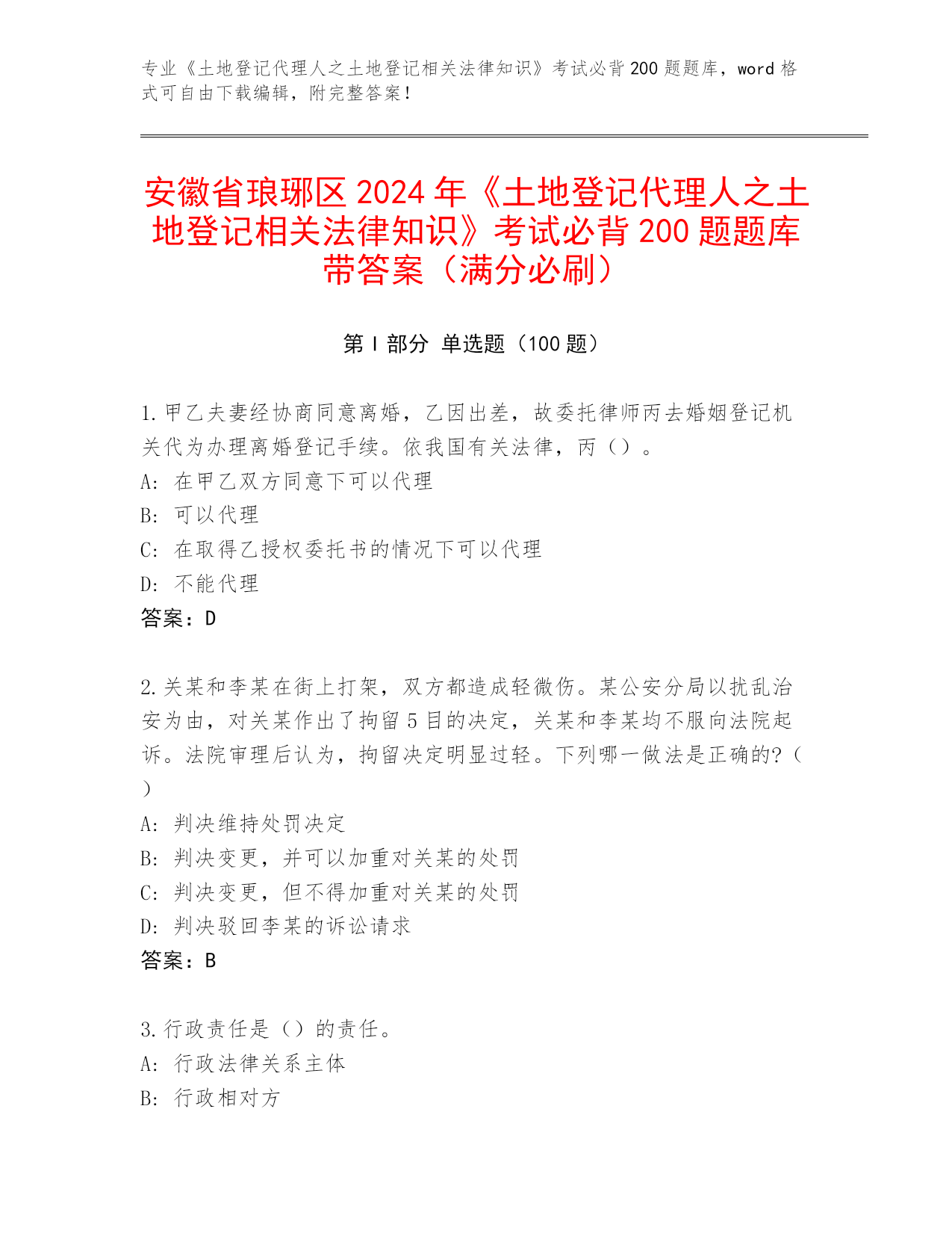 安徽省琅琊区2024年《土地登记代理人之土地登记相关法律知识》考试必背200题题库带答案(满分必刷).docx