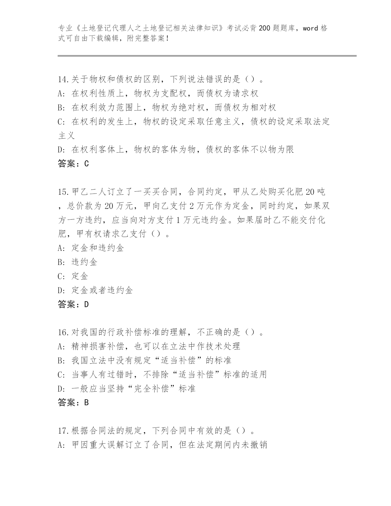 2024年江西省新干县《土地登记代理人之土地登记相关法律知识》资格考试必刷200题题库(突破训练)