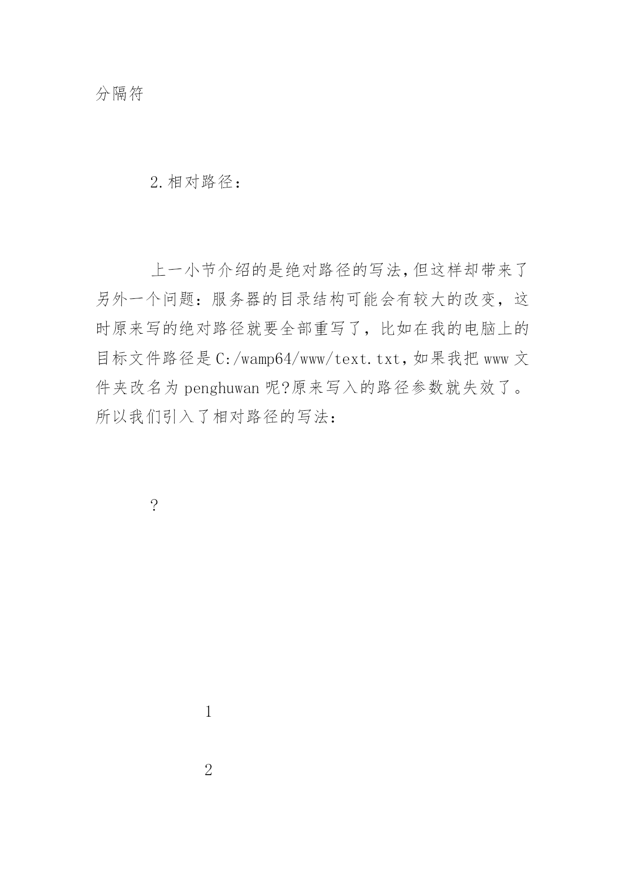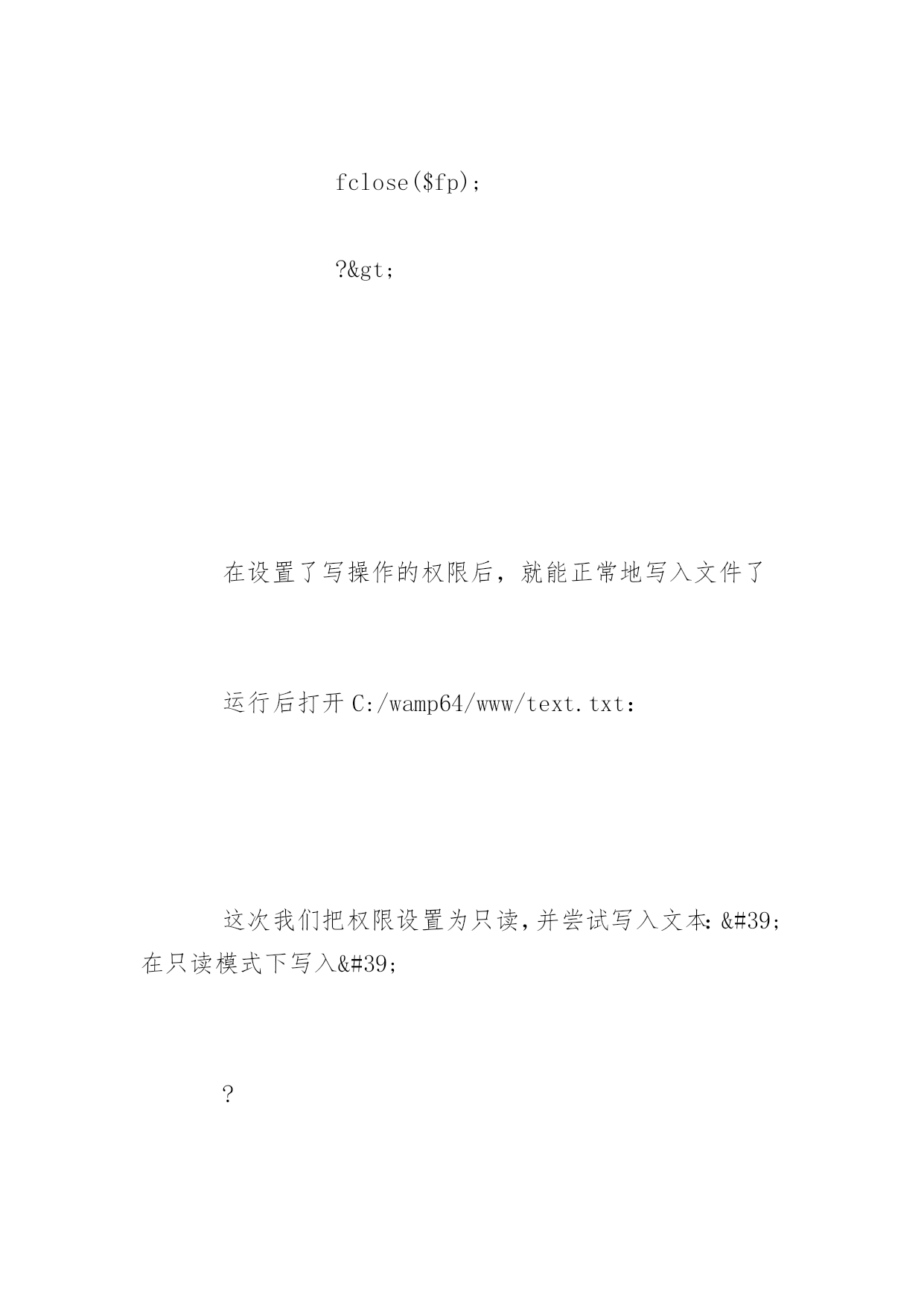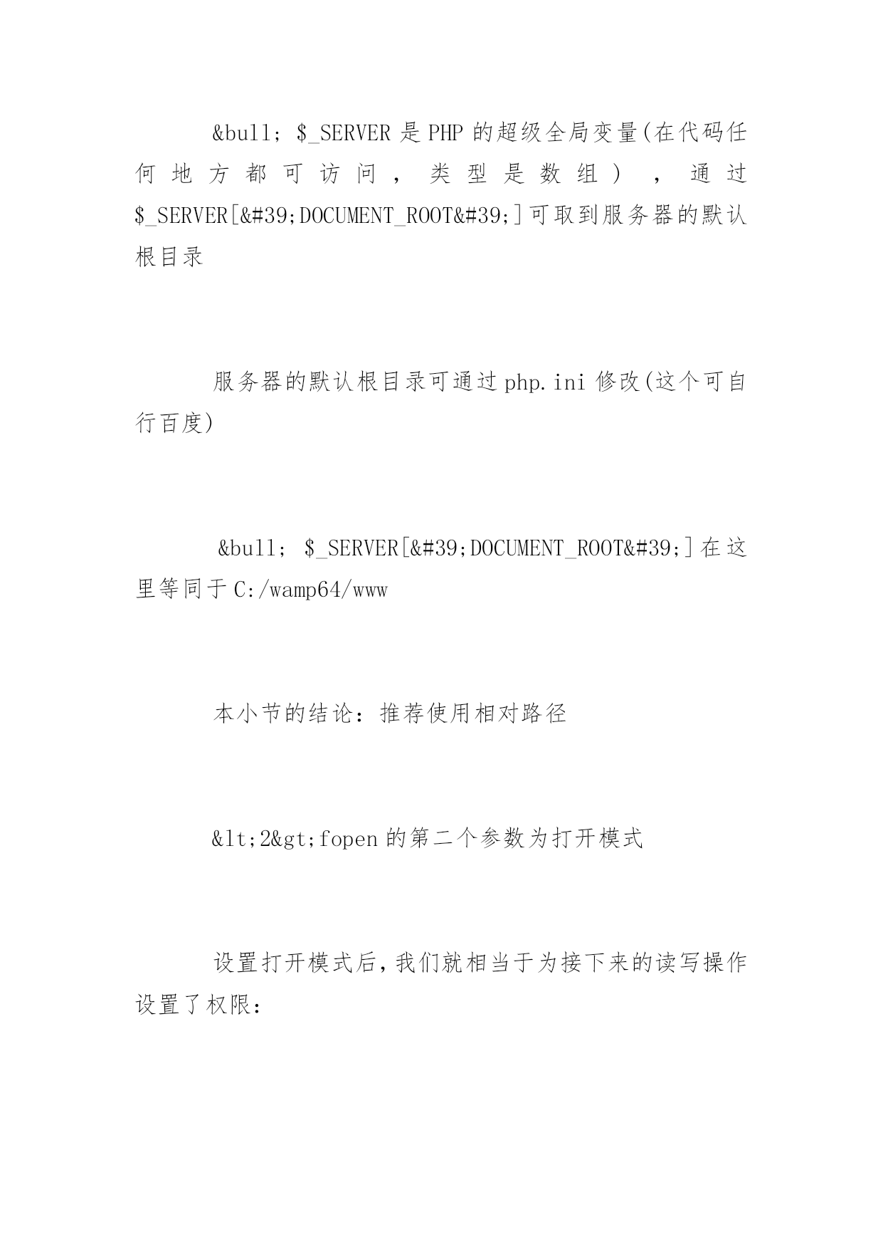 PHP文件写入和读取教程23 $fp=fopen("C:\wamp64\www\text.txt",'w');?>运行后报错,提示路径参数无效所以我们要把分隔符“\”换成“/”:?123 $fp=fopen("C:/wamp64/www/text.txt",'w');?>运行时无报错,说明参数是有效的。【注意】fopen函数不能理解“\”分隔符,如果你想要使用“\”,那么要使用转义,如写成:"C:\\wamp64\\www\\text.txt"这种写法也是可以的,函数也能理解,不会报错。但即使这样,也不推荐使用“\”,因为在OS(mac)下只能识别“/”不能识别“\”本小节的结论:推荐坚持使用“/”作为分隔符2.相对路径:上一小节介绍的是绝对路径的写法,但这样却带来了另外一个问题:服务器的目录结构可能会有较大的改变,这时原来写的绝对路径就要全部重写了,比如在我的电脑上的目标文件路径是C:/wamp64/www/text.txt,如果我把www文件夹改名为penghuwan呢?原来写入的路径参数就失效了。所以我们引入了相对路径的写法:?1234 $DOCUMENT_ROOT=$_SERVER['DOCUMENT_ROOT'];$fp=fopen("$DOCUMENT_ROOT/text.txt",'w');?>•$_SERVER是PHP的超级全局变量(在代码任何地方都可访问,类型是数组),通过$_SERVER['DOCUMENT_ROOT']可取到服务器的默认根目录服务器的默认根目录可通过php.ini修改(这个可自行百度)•$_SERVER['DOCUMENT_ROOT']在这里等同于C:/wamp64/www本小节的结论:推荐使用相对路径<2>fopen的第二个参数为打开模式设置打开模式后,我们就相当于为接下来的读写操作设置了权限:最基本的几个模式:“r”:只能读取文件,不能写入文件(写入操作被忽略)“w”:只能写入文件,不能读取文件(读取操作被忽略)“a”:只追加文件,与“w”类似,区别是“w”删除原有的内容,“a”不删除原有内容,只追加内容?123456 $DOCUMENT_ROOT=$_SERVER['DOCUMENT_ROOT'];$fp=fopen("$DOCUMENT_ROOT/text.txt",'w');fwrite($fp,'在写模式下写入');fclose($fp);?>在设置了写操作的权限后,就能正常地写入文件了运行后打开C:/wamp64/www/text.txt:这次我们把权限设置为只读,并尝试写入文本:'在只读模式下写入'?123456 $DOCUMENT_ROOT=$_SERVER[&#