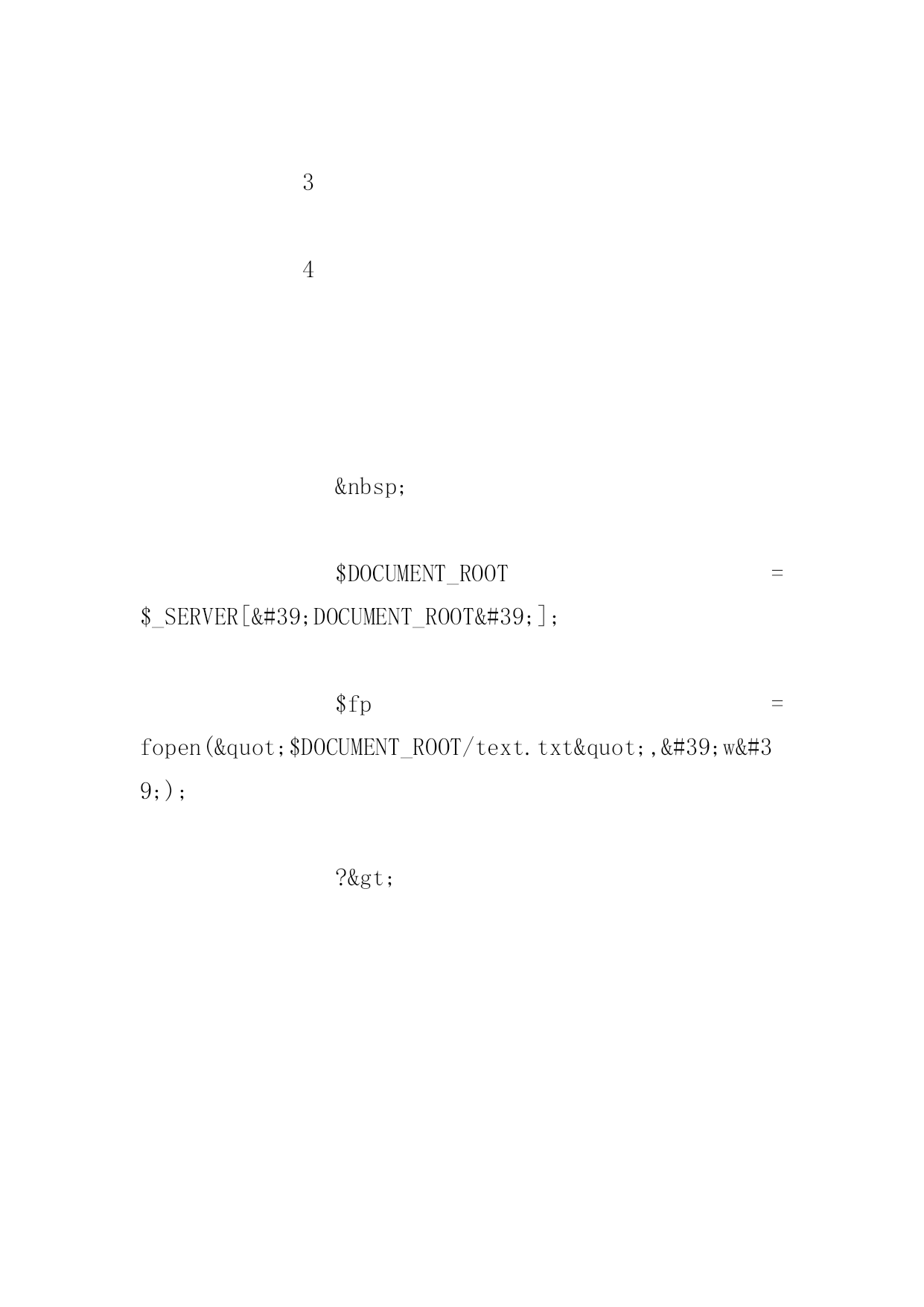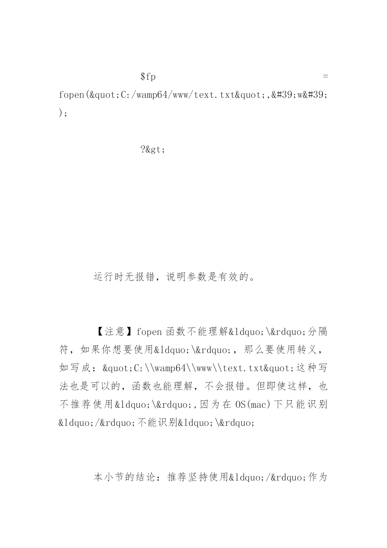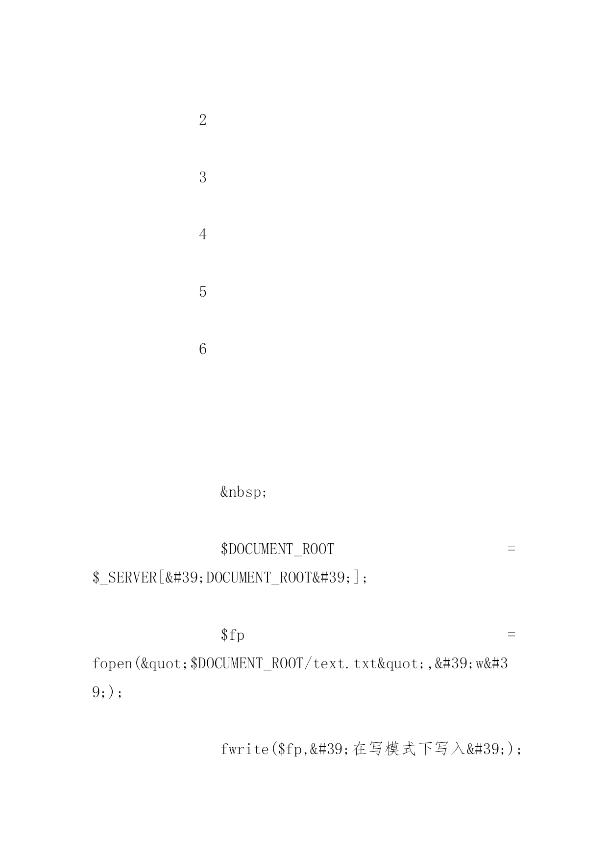PHP文件写入和读取教程23 $fp=fopen("C:\wamp64\www\text.txt",'w');?>运行后报错,提示路径参数无效所以我们要把分隔符“\”换成“/”:?123 $fp=fopen("C:/wamp64/www/text.txt",'w');?>运行时无报错,说明参数是有效的。【注意】fopen函数不能理解“\”分隔符,如果你想要使用“\”,那么要使用转义,如写成:"C:\\wamp64\\www\\text.txt"这种写法也是可以的,函数也能理解,不会报错。但即使这样,也不推荐使用“\”,因为在OS(mac)下只能识别“/”不能识别“\”本小节的结论:推荐坚持使用“/”作为分隔符2.相对路径:上一小节介绍的是绝对路径的写法,但这样却带来了另外一个问题:服务器的目录结构可能会有较大的改变,这时原来写的绝对路径就要全部重写了,比如在我的电脑上的目标文件路径是C:/wamp64/www/text.txt,如果我把www文件夹改名为penghuwan呢?原来写入的路径参数就失效了。所以我们引入了相对路径的写法:?1234 $DOCUMENT_ROOT=$_SERVER['DOCUMENT_ROOT'];$fp=fopen("$DOCUMENT_ROOT/text.txt",'w');?>•$_SERVER是PHP的超级全局变量(在代码任何地方都可访问,类型是数组),通过$_SERVER['DOCUMENT_ROOT']可取到服务器的默认根目录服务器的默认根目录可通过php.ini修改(这个可自行百度)•$_SERVER['DOCUMENT_ROOT']在这里等同于C:/wamp64/www本小节的结论:推荐使用相对路径<2>fopen的第二个参数为打开模式设置打开模式后,我们就相当于为接下来的读写操作设置了权限:最基本的几个模式:“r”:只能读取文件,不能写入文件(写入操作被忽略)“w”:只能写入文件,不能读取文件(读取操作被忽略)“a”:只追加文件,与“w”类似,区别是“w”删除原有的内容,“a”不删除原有内容,只追加内容?123456 $DOCUMENT_ROOT=$_SERVER['DOCUMENT_ROOT'];$fp=fopen("$DOCUMENT_ROOT/text.txt",'w');fwrite($fp,'在写模式下写入');fclose($fp);?>在设置了写操作的权限后,就能正常地写入文件了运行后打开C:/wamp64/www/text.txt:这次我们把权限设置为只读,并尝试写入文本:'在只读模式下写入'?123456 $DOCUMENT_ROOT=$_SERVER[&#