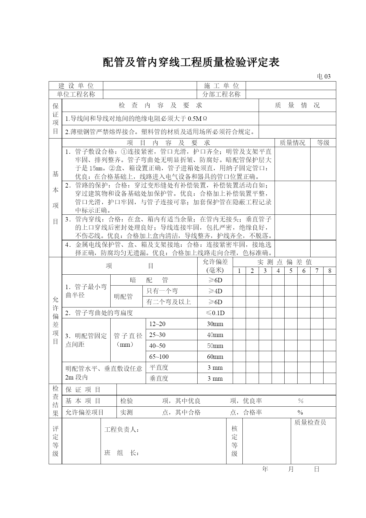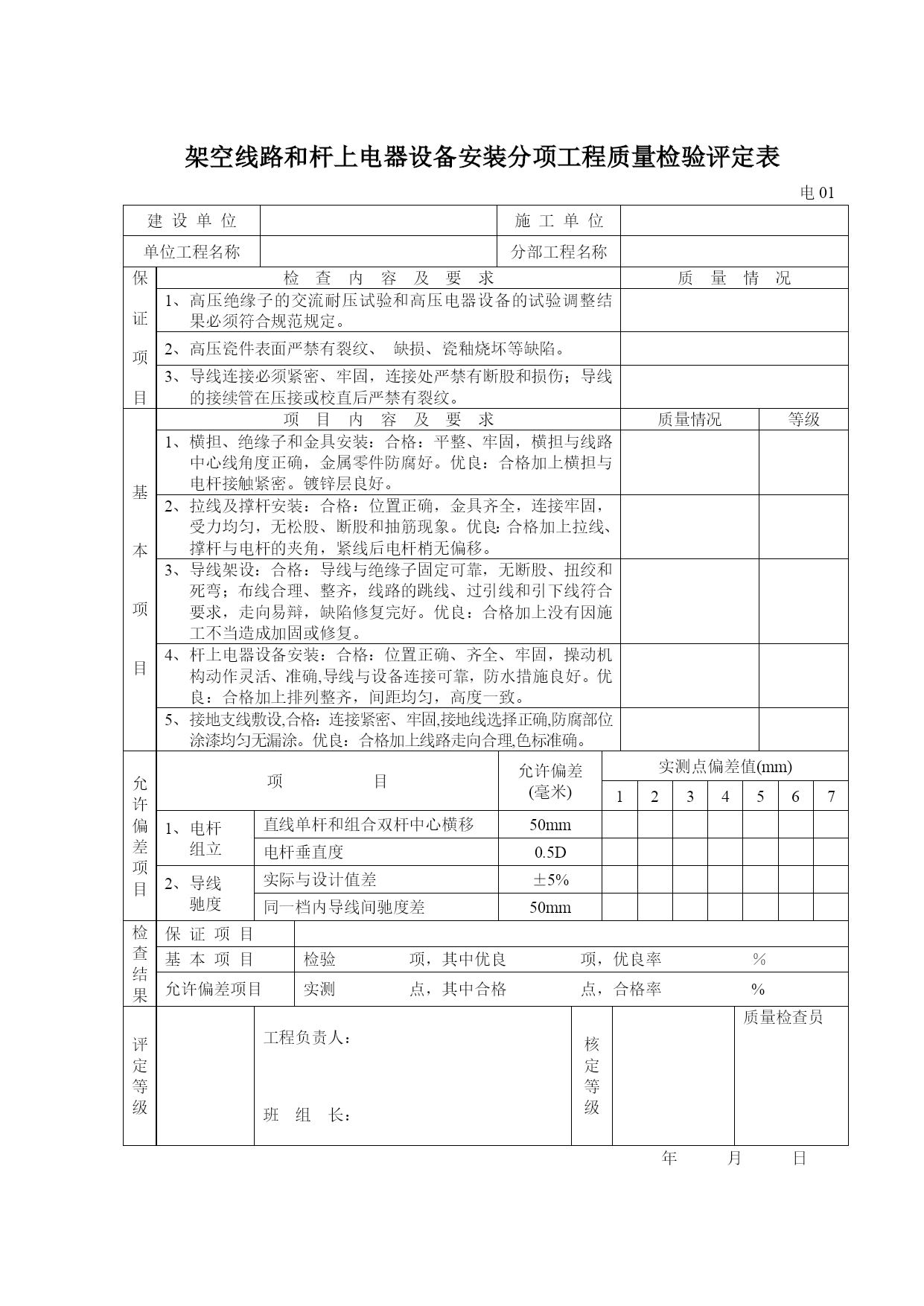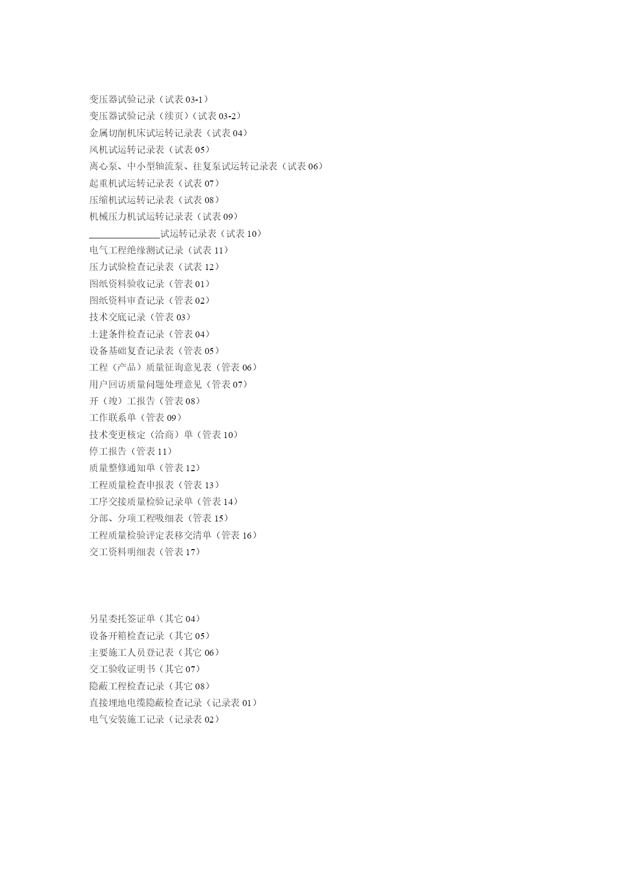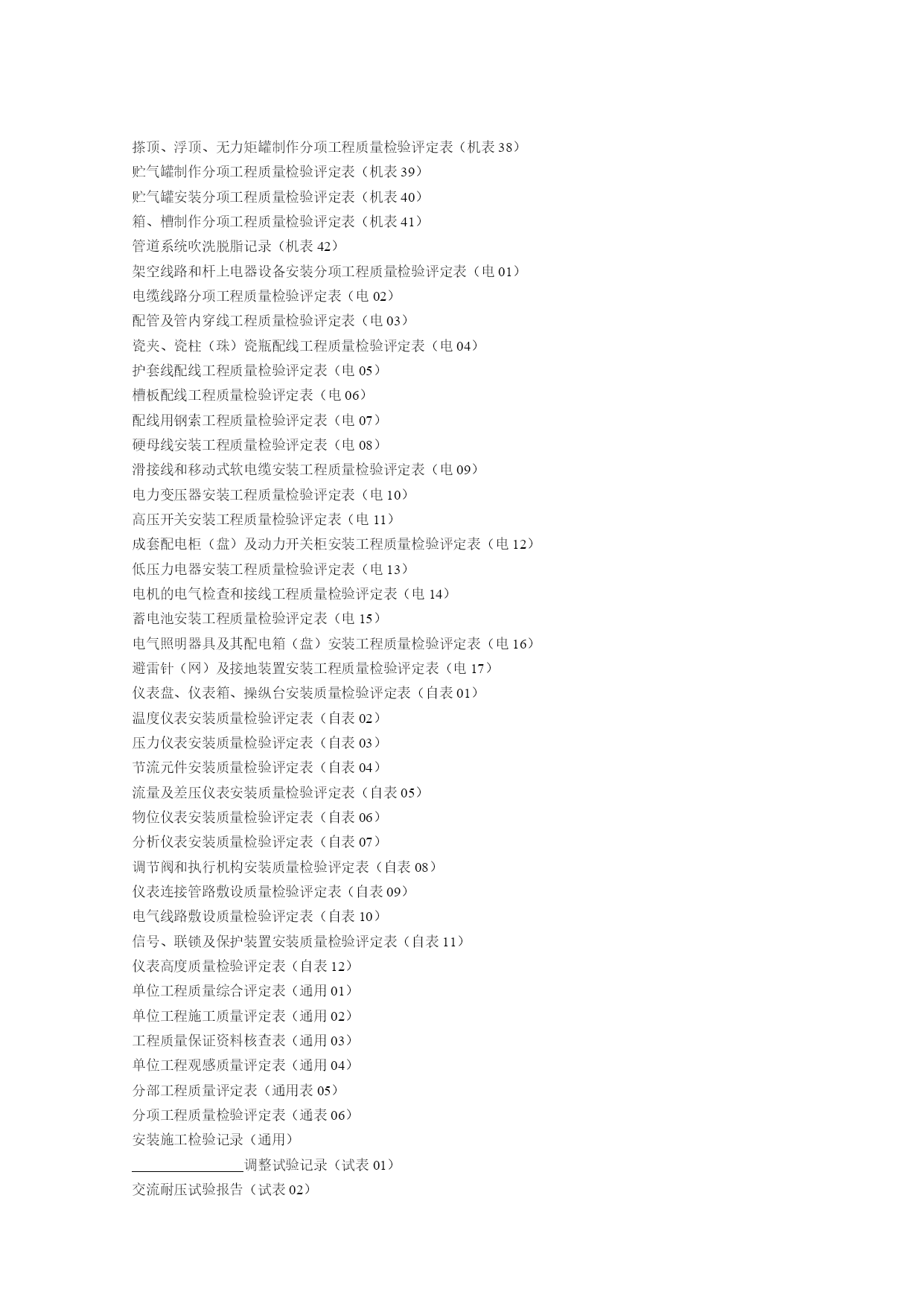 目录金属切削机床安装工程质量检查评定表(机表01)起重机轨道安装分项工程质量检验评定表(机表02)天车轨道测量记录表(机表02付)电动桥式起重机、龙门起重机、电葫芦安装工程质量检验评定表(机表03)整体活塞式气体压缩机、立式、V式、W式制冷压缩机安装分项工程质量检验评定表(机表04)离心式、轴济式、罗茨式、叶氏鼓风机安装分项工程质量检验评定表(机表05)离心泵、轴流泵安装分项工程质量检验评定表(机表06)固定式胶带输送机安装分项工程质量检验评定表(机表07)斗式提升机安装分项工程质量检验评定表(机表08)板式、链式、螺旋输送机安装分项工程质量检验评定表(机表09)箱槽安装分项工程质量检验评定表(机表10)小型圆形容器安装分项工程质量检验评定表(机表11)碳素钢管道安装分项工程质量检验评定表(机表12-1)碳素钢管道安装分项工程质量检验评定表(续)(机表12-2)铸铁管道安装分项工程质量检验评定表(机表13)钢结构安装分项工程质量检验评定表(机表14)采暖管道安装分项工程质量检验评定表(机表15-1)采暖散热器安装分项工程质量检验评定表(机表15-2)剪切机、弯曲校正机安装分项工程质量检验评定表(机表16)锻锤安装分项工程质量检验评定表(机表17)透平鼓风机安装分项工程质量检验评定表(机表18)机械压力机安装分项工程质量检验评定表(机表19)液压机安装分项工程质量检验评定表(机表20)解体组装活塞式空气压缩机安装分项工程质量检验评定表(机表21)解体卧式氨制冷压缩机安装分项工程质量检验评定表(机表22)卫生器具及给水配件安装分项工程质量检验评定表(机表23)玻璃钢冷却塔安装分项工程质量检验评定表(机表24)塔类安装分项工程质量检验评定表(机表25)拱顶罐安装分项工程质量检验评定表(机表26)浮顶罐安装分项工程质量检验评定表(机表27)隔热安装分项工程质量检验评定表(机表28)空气处理设备及消声器安装分项工程质量检验评定表(机表29)金属风管及部件制作工程质量检验评定表(机表30)风管及部件安装分项工程质量检验评定表(一)(机表31-1)风管及部件安装分项工程质量检验评定表(二)(机表31-2)通风机安装分项工程质量检验评定表(机表33)单轨、悬挂输送机安装分项工程质量检验评定表(机表34)不锈钢管道安装分项工程质量检验评定表(机表35-1)不锈钢管道安装分项工程质量检验评定表(机表35-2)钢结构制作分项工程质量检验评定表(机表37)搽顶、浮顶、无力矩罐制作分项工程质量检验评定表(机表38)贮气罐制作分项工程质量检验评定表(机表39)贮气罐安装分项工程质量检验评定表(机表40)箱、槽制作分项工程质量检验评定表(机表41)管道系统吹洗脱脂记录(机表42)架空线路和杆上电器设备安装分项工程质量检验评定表(电01)电缆线路分项工程质量检验评定表(电02)配管及管内穿线工程质量检验评定表(电03)瓷夹、瓷柱(珠)瓷瓶配线工程质量检验评定表(电04)护套线配线工程质量检验评定表(电05)槽板配线工程质量检验评定表(电06)配线用钢索工程质量检验评定表(电07)硬母线安装工程质量检验评定表(电08)滑接线和移动式软电缆安装工程质量检验评定表(电09)电力变压器安装工程质量检验评定表(电10)高压开关安装工程质量检验评定表(电11)成套配电柜(盘)及动力开关柜安装工程质量检验评定表(电12)低压力电器安装工程质量检验评定表(电13)电机的电气检查和接线工程质量检验评定表(电14)蓄电池安装工程质量检验评定表(电15)电气照明器具及其配电箱(盘)安装工程质量检验评定表(电16)避雷针(网)及接地装置安装工程质量检验评定表(电17)仪表盘、仪表箱、操纵台安装质量检验评定表(自表01)温度仪表安装质量检验评定表(自表02)压力仪表安装质量检验评定表(自表03)节流元件安装质量检验评定表(自表04)流量及差压仪表安装质量检验评定表(自表05)物位仪表安装质量检验评定表(自表06)分析仪表安装质量检验评定表(自表07)调节阀和执行机构安装质量检验评定表(自表08)仪表连接管路敷设质量检验评定表(自表09)电气线路敷设质量检验评定表(自表10)信号、联锁及保护装置安装质量检验评定表(自表11)仪表高度质量检验评定表(自表12)单位工程质量综合评定表(通用01)单位工程施工质量评定表(通用02)工程质量保证资料核查表(通用03)单位工程观感质量评定表(通用04)分部工程质量评定表(通用表05)分项工程质量检验评定表(通表06)安装施工检验记录(通用)调整试验记录(试表01)交流耐压试验报告