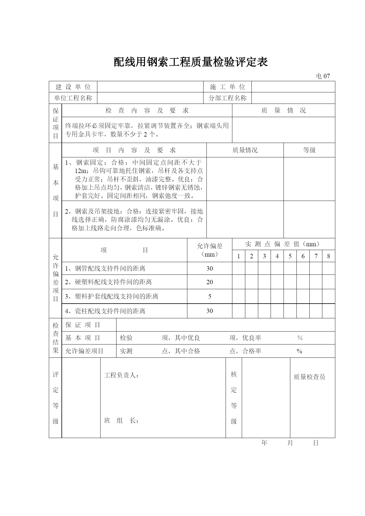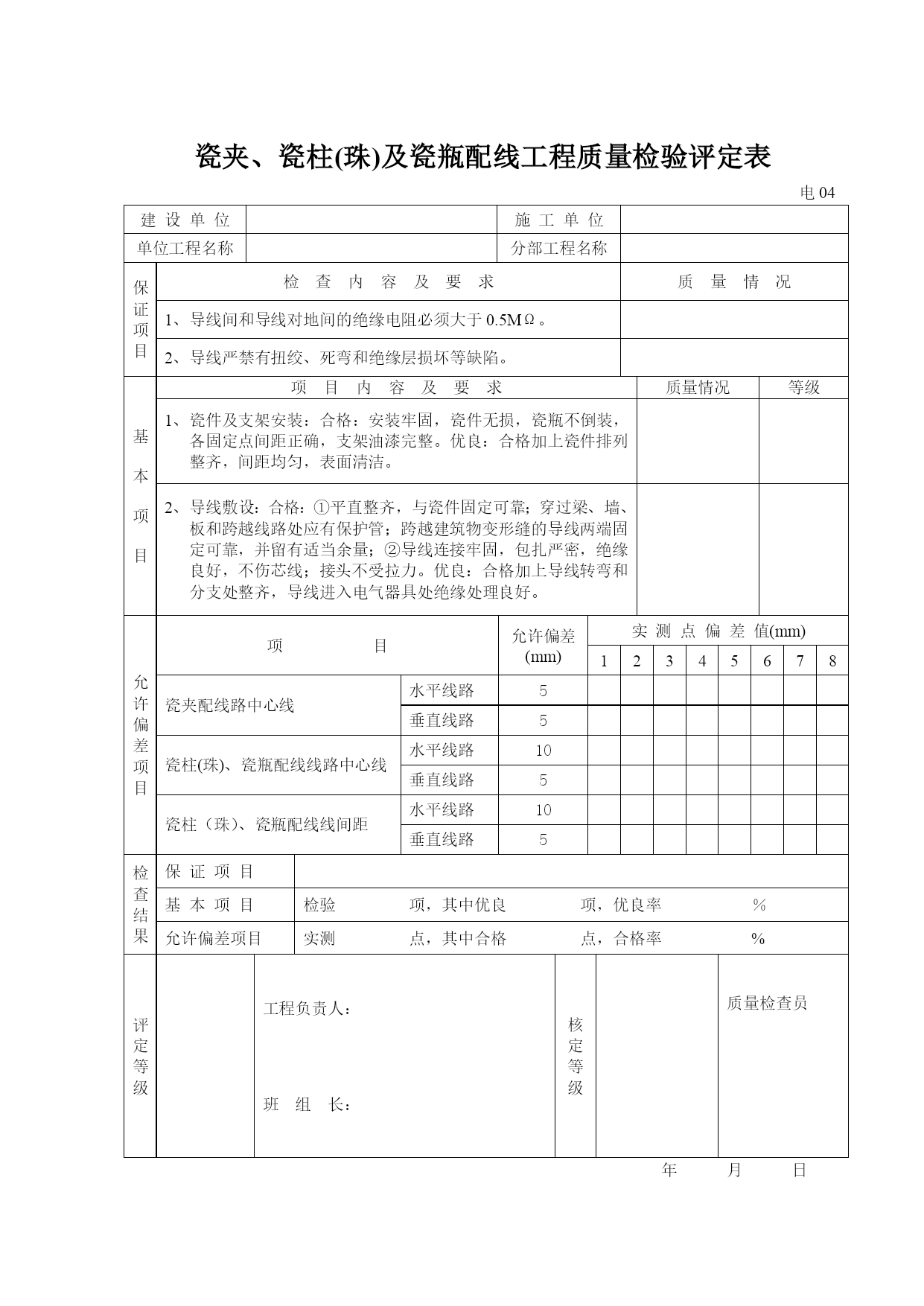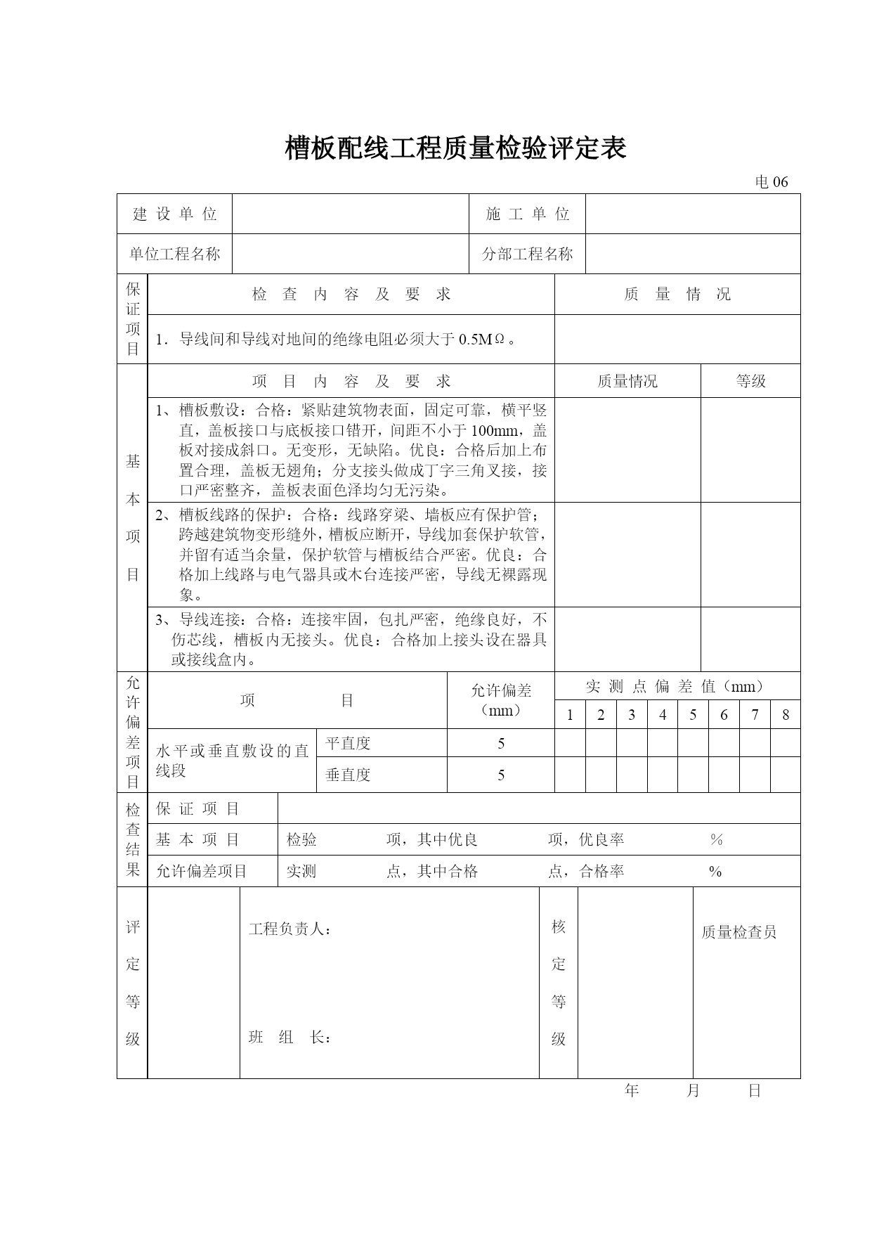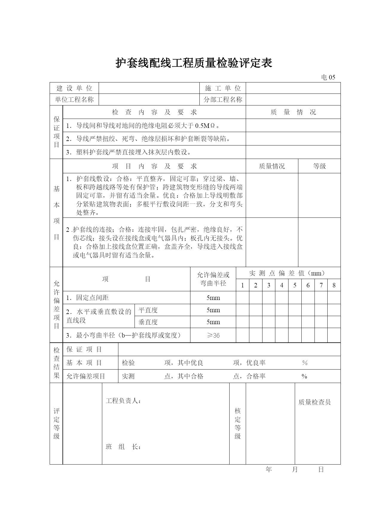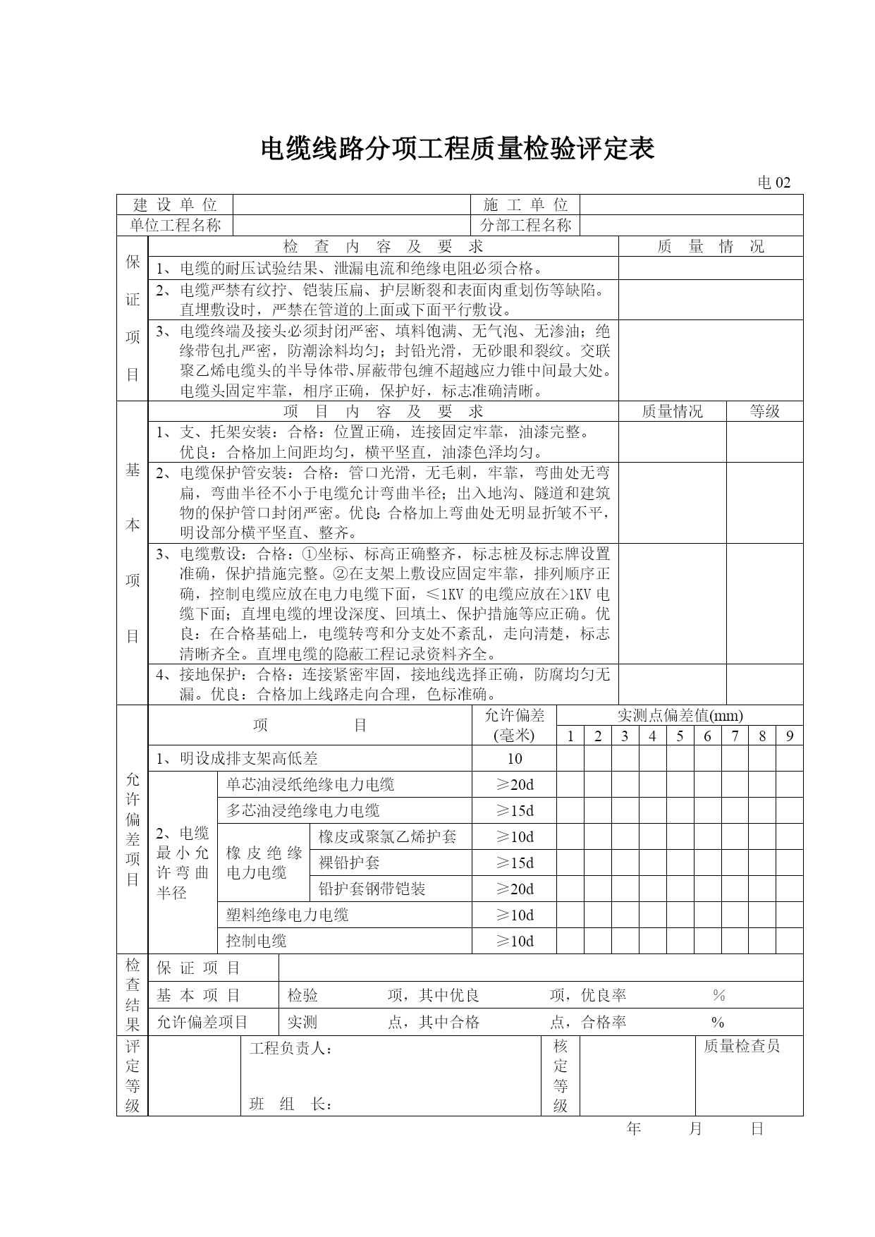 目录金属切削机床安装工程质量检查评定表(机表01)起重机轨道安装分项工程质量检验评定表(机表02)天车轨道测量记录表(机表02付)电动桥式起重机、龙门起重机、电葫芦安装工程质量检验评定表(机表03)整体活塞式气体压缩机、立式、V式、W式制冷压缩机安装分项工程质量检验评定表(机表04)离心式、轴济式、罗茨式、叶氏鼓风机安装分项工程质量检验评定表(机表05)离心泵、轴流泵安装分项工程质量检验评定表(机表06)固定式胶带输送机安装分项工程质量检验评定表(机表07)斗式提升机安装分项工程质量检验评定表(机表08)板式、链式、螺旋输送机安装分项工程质量检验评定表(机表09)箱槽安装分项工程质量检验评定表(机表10)小型圆形容器安装分项工程质量检验评定表(机表11)碳素钢管道安装分项工程质量检验评定表(机表12-1)碳素钢管道安装分项工程质量检验评定表(续)(机表12-2)铸铁管道安装分项工程质量检验评定表(机表13)钢结构安装分项工程质量检验评定表(机表14)采暖管道安装分项工程质量检验评定表(机表15-1)采暖散热器安装分项工程质量检验评定表(机表15-2)剪切机、弯曲校正机安装分项工程质量检验评定表(机表16)锻锤安装分项工程质量检验评定表(机表17)透平鼓风机安装分项工程质量检验评定表(机表18)机械压力机安装分项工程质量检验评定表(机表19)液压机安装分项工程质量检验评定表(机表20)解体组装活塞式空气压缩机安装分项工程质量检验评定表(机表21)解体卧式氨制冷压缩机安装分项工程质量检验评定表(机表22)卫生器具及给水配件安装分项工程质量检验评定表(机表23)玻璃钢冷却塔安装分项工程质量检验评定表(机表24)塔类安装分项工程质量检验评定表(机表25)拱顶罐安装分项工程质量检验评定表(机表26)浮顶罐安装分项工程质量检验评定表(机表27)隔热安装分项工程质量检验评定表(机表28)空气处理设备及消声器安装分项工程质量检验评定表(机表29)金属风管及部件制作工程质量检验评定表(机表30)风管及部件安装分项工程质量检验评定表(一)(机表31-1)风管及部件安装分项工程质量检验评定表(二)(机表31-2)通风机安装分项工程质量检验评定表(机表33)单轨、悬挂输送机安装分项工程质量检验评定表(机表34)不锈钢管道安装分项工程质量检验评定表(机表35-1)不锈钢管道安装分项工程质量检验评定表(机表35-2)钢结构制作分项工程质量检验评定表(机表37)搽顶、浮顶、无力矩罐制作分项工程质量检验评定表(机表38)贮气罐制作分项工程质量检验评定表(机表39)贮气罐安装分项工程质量检验评定表(机表40)箱、槽制作分项工程质量检验评定表(机表41)管道系统吹洗脱脂记录(机表42)架空线路和杆上电器设备安装分项工程质量检验评定表(电01)电缆线路分项工程质量检验评定表(电02)配管及管内穿线工程质量检验评定表(电03)瓷夹、瓷柱(珠)瓷瓶配线工程质量检验评定表(电04)护套线配线工程质量检验评定表(电05)槽板配线工程质量检验评定表(电06)配线用钢索工程质量检验评定表(电07)硬母线安装工程质量检验评定表(电08)滑接线和移动式软电缆安装工程质量检验评定表(电09)电力变压器安装工程质量检验评定表(电10)高压开关安装工程质量检验评定表(电11)成套配电柜(盘)及动力开关柜安装工程质量检验评定表(电12)低压力电器安装工程质量检验评定表(电13)电机的电气检查和接线工程质量检验评定表(电14)蓄电池安装工程质量检验评定表(电15)电气照明器具及其配电箱(盘)安装工程质量检验评定表(电16)避雷针(网)及接地装置安装工程质量检验评定表(电17)仪表盘、仪表箱、操纵台安装质量检验评定表(自表01)温度仪表安装质量检验评定表(自表02)压力仪表安装质量检验评定表(自表03)节流元件安装质量检验评定表(自表04)流量及差压仪表安装质量检验评定表(自表05)物位仪表安装质量检验评定表(自表06)分析仪表安装质量检验评定表(自表07)调节阀和执行机构安装质量检验评定表(自表08)仪表连接管路敷设质量检验评定表(自表09)电气线路敷设质量检验评定表(自表10)信号、联锁及保护装置安装质量检验评定表(自表11)仪表高度质量检验评定表(自表12)单位工程质量综合评定表(通用01)单位工程施工质量评定表(通用02)工程质量保证资料核查表(通用03)单位工程观感质量评定表(通用04)分部工程质量评定表(通用表05)分项工程质量检验评定表(通表06)安装施工检验记录(通用)调整试验记录(试表01)交流耐压试验报告