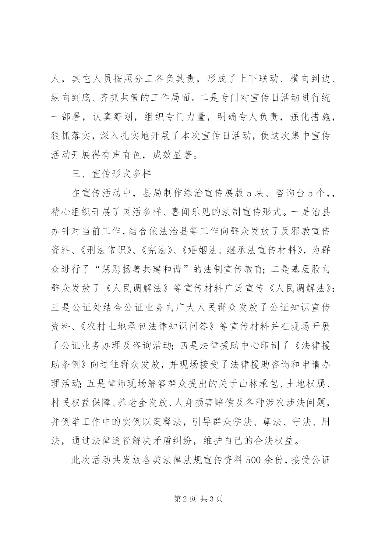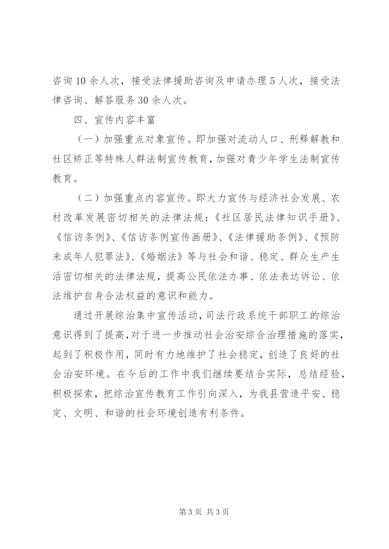 第PAGE\*Arabic\*MERGEFORMAT3页共NUMPAGES\*MERGEFORMAT3页司法局综治宣传日活动总结为认真贯彻落实省委、市委政法委关于做好平安建设宣传工作的要求,深入推进平安单位建设,进一步提高社会各界对综治和平安建设工作的知晓率和参与度,根据县综治办统一安排,发挥司法行政法制宣传的作用,在8月15日组织开展了一系列的综治宣传活动,通过广泛深入开展综治宣传活动,在全县进一步营造了浓厚的综治舆论氛围,使社会治安综合治理观念深入人心,形成人人关心社会治安、人人参与社会治安的局面。现将综治宣传日活动情况总结如下:一、围绕宣传主题,突出宣传重点我单位在宣传内容上主要突出以下几个方面重点。一是大力宣传党的十八大、十八届三中全会和省、市、县司法行政工作会议精神;二是积极宣传各地开展法治建设、平安建设取得的丰硕成果;三是向广大群众展示近年来我县社区矫正、刑释解教人员安置帮教、人民调解、法律服务等工作取得的成果以及法律援助条件、人民调解程序和社区矫正等方面的法律法规。二、加强组织领导,精心部署开展好这次宣传日活动,是践行党的群众路线教育实践活动,努力开创我县综治和平安建设工作新局面的一项重要举措,对此,我局高度重视,局领导班子认真研究,一是建立健全了组织,明确规定各科室、部门负责人为第一责任人,分管领导为主要负责人,其它人员按照分工各负其责,形成了上下联动、横向到边、纵向到底、齐抓共管的工作局面。二是专门对宣传日活动进行统一部署,认真筹划,组织专门力量,明确专人负责,强化措施,狠抓落实,深入扎实地开展了本次宣传日活动,使这次集中宣传活动开展得有声有色,成效显著。三、宣传形式多样在宣传活动中,县局制作综治宣传展版5块、咨询台5个,,精心组织开展了灵活多样、喜闻乐见的法制宣传形式。一是治县办针对当前工作,结合依法治县等工作向群众发放了反邪教宣传资料、《刑法常识》、《宪法》、《婚姻法、继承法宣传材料》,为群众进行了“惩恶扬善共建和谐”的法制宣传教育;二是基层股向群众发放了《人民调解法》等宣传材料广泛宣传《人民调解法》;三是公证处结合公证业务向广大人民群众发放了公证知识宣传资料、《农村土地承包法律知识问答》等宣传材料并在现场开展了公证业务办理及咨询活动;四是法律援助中心印制了《法律援助条例》向过往群众发放,并现场接受了法律援助咨询和申请办理活动;五是律师现场解答群众提出的关于山林承包、土地权属、村民权益保障、养老金发放、人身损害赔偿及各种涉农涉法问题,并例举工作中的实例以案释法,引导群众学法、尊法、守法、用法,通过法律途径解决矛盾纠纷,维护自己的合法权益。此次活动共发放各类法律法规宣传资料500余份,接受公证咨询10余人次,接受法律援助咨询及申请办理5人次,接受法律咨询、解答服务30余人次。四、宣传内容丰富(一)加强重点对象宣传。即加强对流动人口、刑释解教和社区矫正等特殊人群法制宣传教育,加强对青少年学生法制宣传教育。(二)加强重点内容宣传。即大力宣传与经济社会发展、农村改革发展密切相关的法律法规:《社区居民法律知识手册》、《信访条例》、《信访条例宣传画册》、《法律援助条例》、《预防未成年人犯罪法》、《婚姻法》等与社会和谐、稳定、群众生产生活密切相关的法律法规,提高公民依法办事、依法表达诉讼、依法维护自身合法权益的意识和能力。通过开展综治集中宣传活动,司法行政系统干部职工的综治意识得到了提高,对于进一步推动社会治安综合治理措施的落实,起到了积极作用,同时有力地维护了社会稳定,创造了良好的社会治安环境。在今后的工作中我们继续要结合实际,总结经验,积极探索,把综治宣传教育工作引向深入,为我县营造平安、稳定、文明、和谐的社会环境创造有利条件。