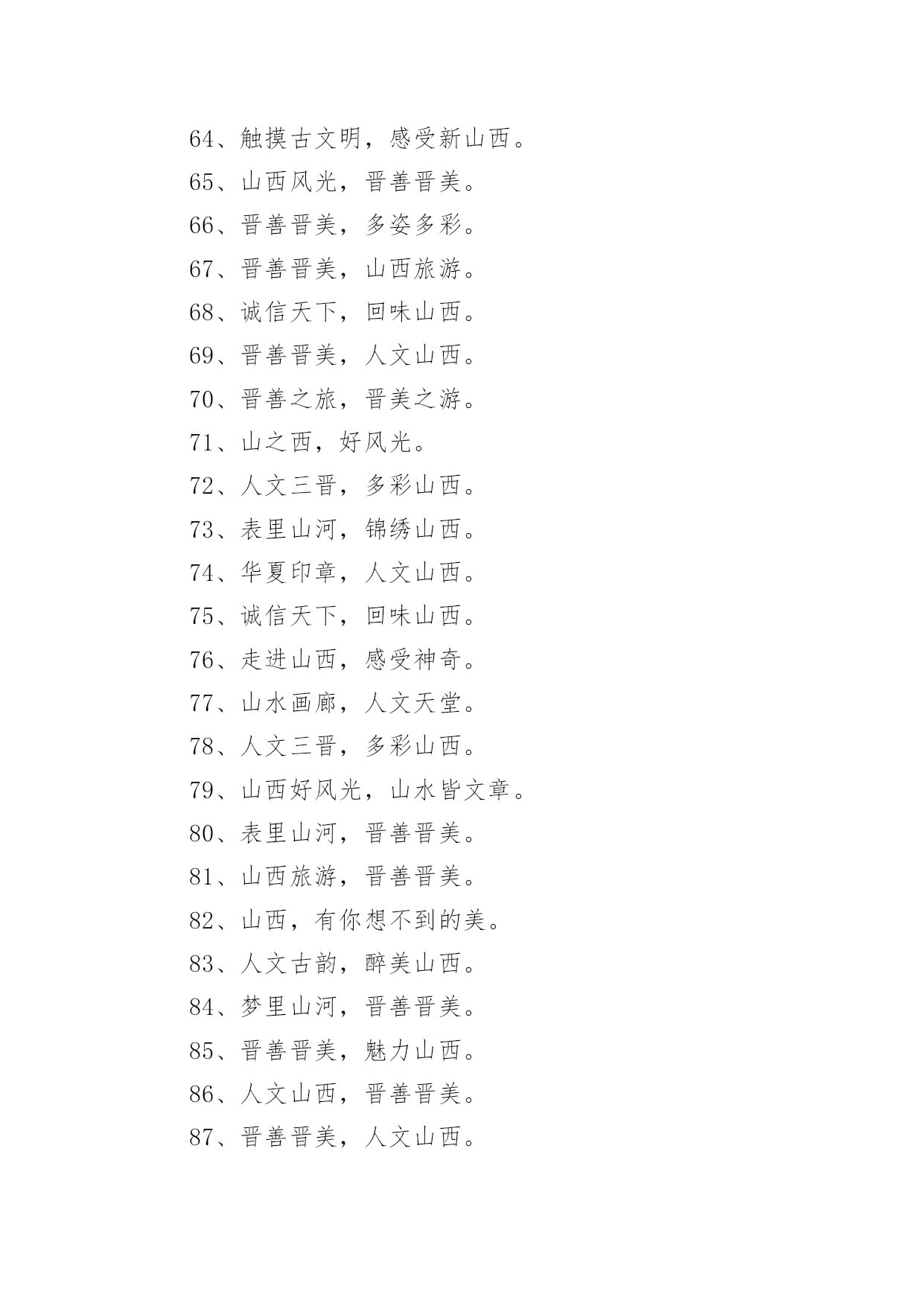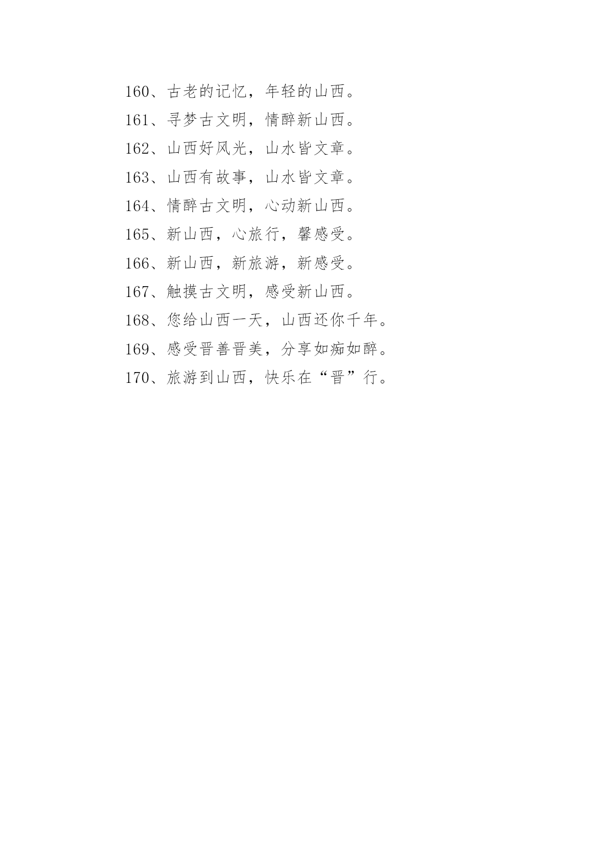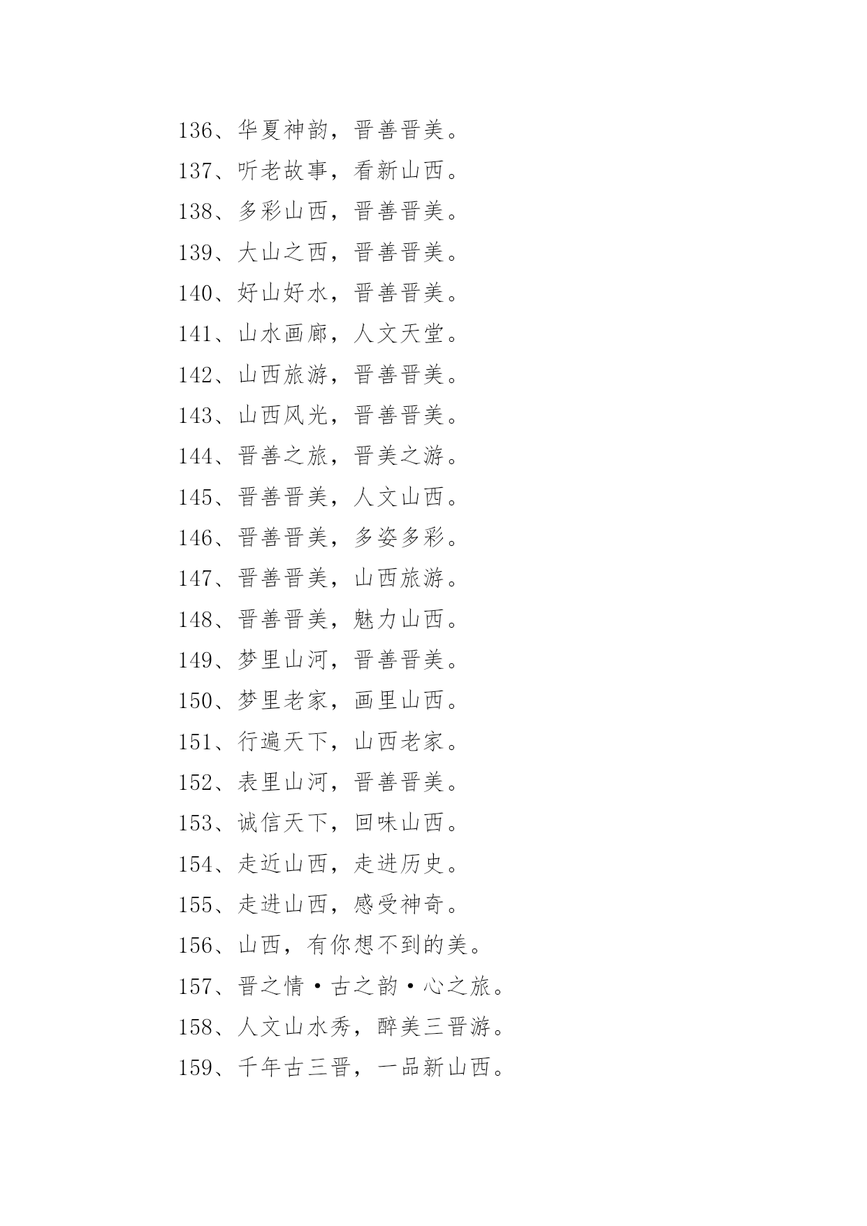 山西旅游口号山西旅游口号170句在日常学习、工作或生活中,大家总少不了接触一些耳熟能详的口号吧,口号既有公文语体准确、简洁的特点,又有政论语体严谨性、鼓动性的特点。你还在找寻优秀经典的口号吗?以下是小编为大家整理的山西旅游口号,希望能够帮助到大家。1、表里山河,锦绣山西。2、华夏印章,人文山西。3、诚信天下,回味山西。4、走进山西,感受神奇。5、山水画廊,人文天堂。6、人文三晋,多彩山西。7、山西好风光,山水皆文章。8、表里山河,晋善晋美。9、山西旅游,晋善晋美。10、山西,有你想不到的美。11、人文古韵,醉美山西。12、梦里山河,晋善晋美。13、晋善晋美,魅力山西。14、人文山西,晋善晋美。15、晋善晋美,人文山西。16、大山之西,晋善晋美。17、触摸古文明,感受新山西。18、晋善晋美,多姿多彩。19、人文三晋,山水山西。20、山西,越来,越美。21、山西风光,晋善晋美。22、晋善晋美,山西旅游。23、华夏神韵,晋善晋美。24、行遍天下,山西老家。25、走近山西,走进历史。26、千年古三晋,一品新山西。27、古老的记忆,年轻的山西。28、山西行,好心情。29、晋善晋美。30、情醉古文明,心动新山西。31、晋善晋美晋兴游。32、您给山西一天,山西还你千年。33、听老故事,看新山西。34、旅游到山西,快乐在“晋”行。35、感受晋善晋美,分享如痴如醉。36、人文山水秀,醉美三晋游。37、山之西,好风光。38、就爱山西好风光。39、晋善晋美晋情游。40、五千年很远,山西很近。41、晋之情·古之韵·心之旅。42、新山西,新旅游,新感受。43、山西有故事,山水皆文章。44、寻梦古文明,情醉新山西。45、品三晋,知天下。46、晋善之旅,晋美之游。47、多彩山西,晋善晋美。48、梦里老家,画里山西。49、好山好水,晋善晋美。50、新山西,心旅行,馨感受。51、人文古韵,醉美山西。52、晋之情·古之韵·心之旅。53、人文山水秀,醉美三晋游。54、梦里老家,画里山西。55、山西有故事,山水皆文章。56、感受晋善晋美,分享如痴如醉。57、山西,越来,越美。58、晋善晋美晋兴游。59、山西行,好心情。60、华夏印章,人文山西。61、品三晋,知天下。62、新山西,新旅游,新感受。63、人文山西,晋善晋美。64、触摸古文明,感受新山西。65、山西风光,晋善晋美。66、晋善晋美,多姿多彩。67、晋善晋美,山西旅游。68、诚信天下,回味山西。69、晋善晋美,人文山西。70、晋善之旅,晋美之游。71、山之西,好风光。72、人文三晋,多彩山西。73、表里山河,锦绣山西。74、华夏印章,人文山西。75、诚信天下,回味山西。76、走进山西,感受神奇。77、山水画廊,人文天堂。78、人文三晋,多彩山西。79、山西好风光,山水皆文章。80、表里山河,晋善晋美。81、山西旅游,晋善晋美。82、山西,有你想不到的美。83、人文古韵,醉美山西。84、梦里山河,晋善晋美。85、晋善晋美,魅力山西。86、人文山西,晋善晋美。87、晋善晋美,人文山西。88、大山之西,晋善晋美。89、触摸古文明,感受新山西。90、晋善晋美,多姿多彩。91、人文三晋,山水山西。92、山西,越来,越美。93、山西风光,晋善晋美。94、晋善晋美,山西旅游。95、华夏神韵,晋善晋美。96、行遍天下,山西老家。97、走近山西,走进历史。98、千年古三晋,一品新山西。99、古老的记忆,年轻的山西。100、山西行,好心情。101、晋善晋美。102、情醉古文明,心动新山西。103、晋善晋美晋兴游。104、您给山西一天,山西还你千年。105、听老故事,看新山西。106、旅游到山西,快乐在“晋”行。107、感受晋善晋美,分享如痴如醉。108、人文山水秀,醉美三晋游。109、山之西,好风光。110、就爱山西好风光。111、晋善晋美晋情游。112、五千年很远,山西很近。113、晋之情·古之韵·心之旅。114、新山西,新旅游,新感受。115、山西有故事,山水皆文章。116、寻梦古文明,情醉新山西。117、品三晋,知天下。118、晋善之旅,晋美之游。119、多彩山西,晋善晋美。120、梦里老家,画里山西。121、好山好水,晋善晋美。122、新山西,心旅行,馨感受。123、品三晋,知天下。124、就爱山西好风光。125、山之西,好风光。126、山西行,好心情。127、晋善晋美晋兴游。128、晋善晋美晋情游。129、山西,越来,越美。130、人文三晋,多彩山西。131、人文三晋,山水山西。132、人文古韵,醉美山西。133、人文山西,晋善晋美。134、千年很远,山西很近。135、华夏印章,人文山西。136、华夏神韵,晋善晋美。137、听老故事,看新山西。138、多彩山西,晋善晋美。139、大山之西,晋善晋美。140、好山好水