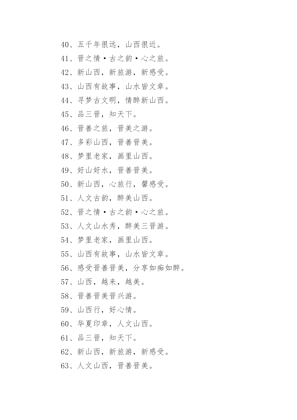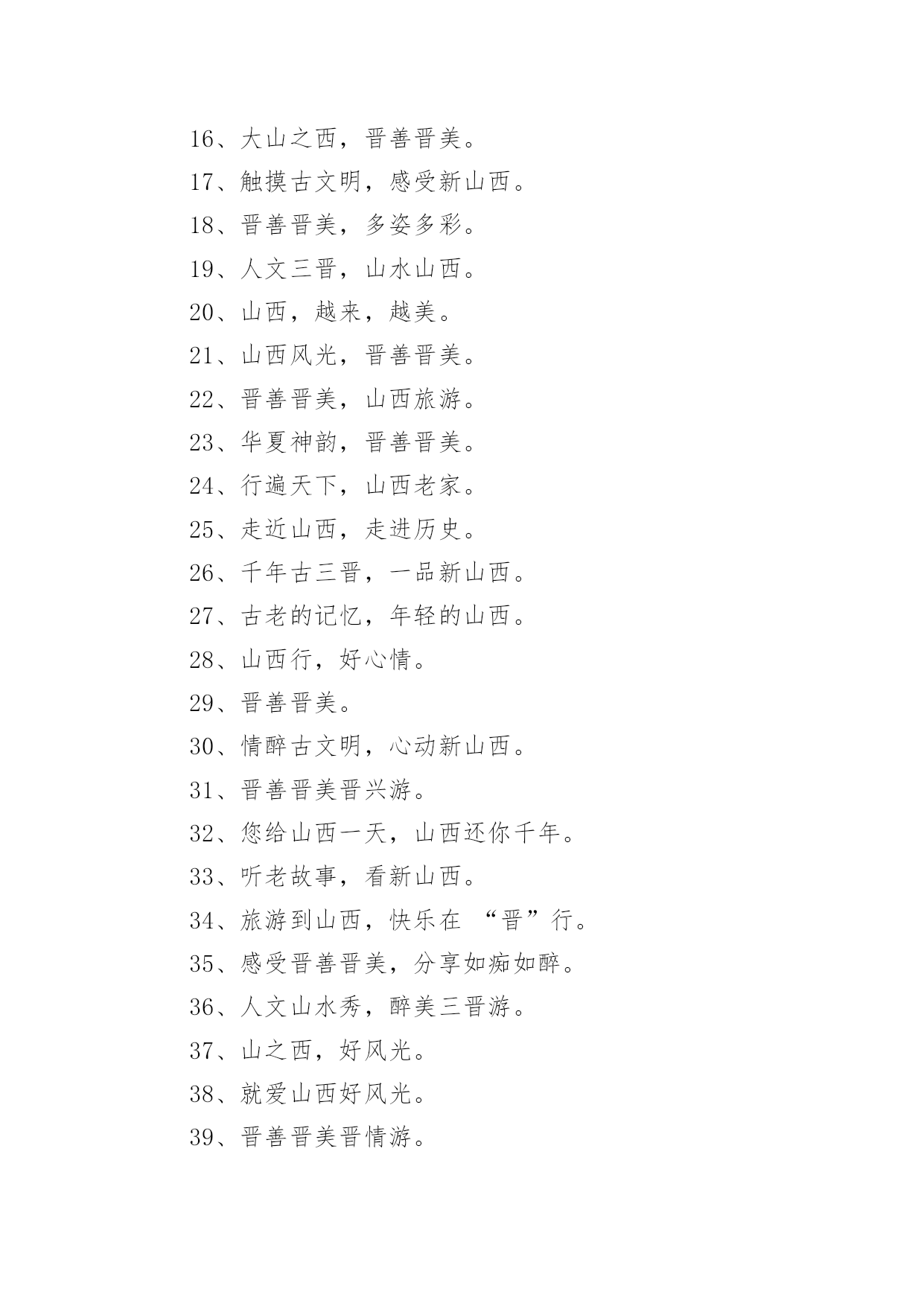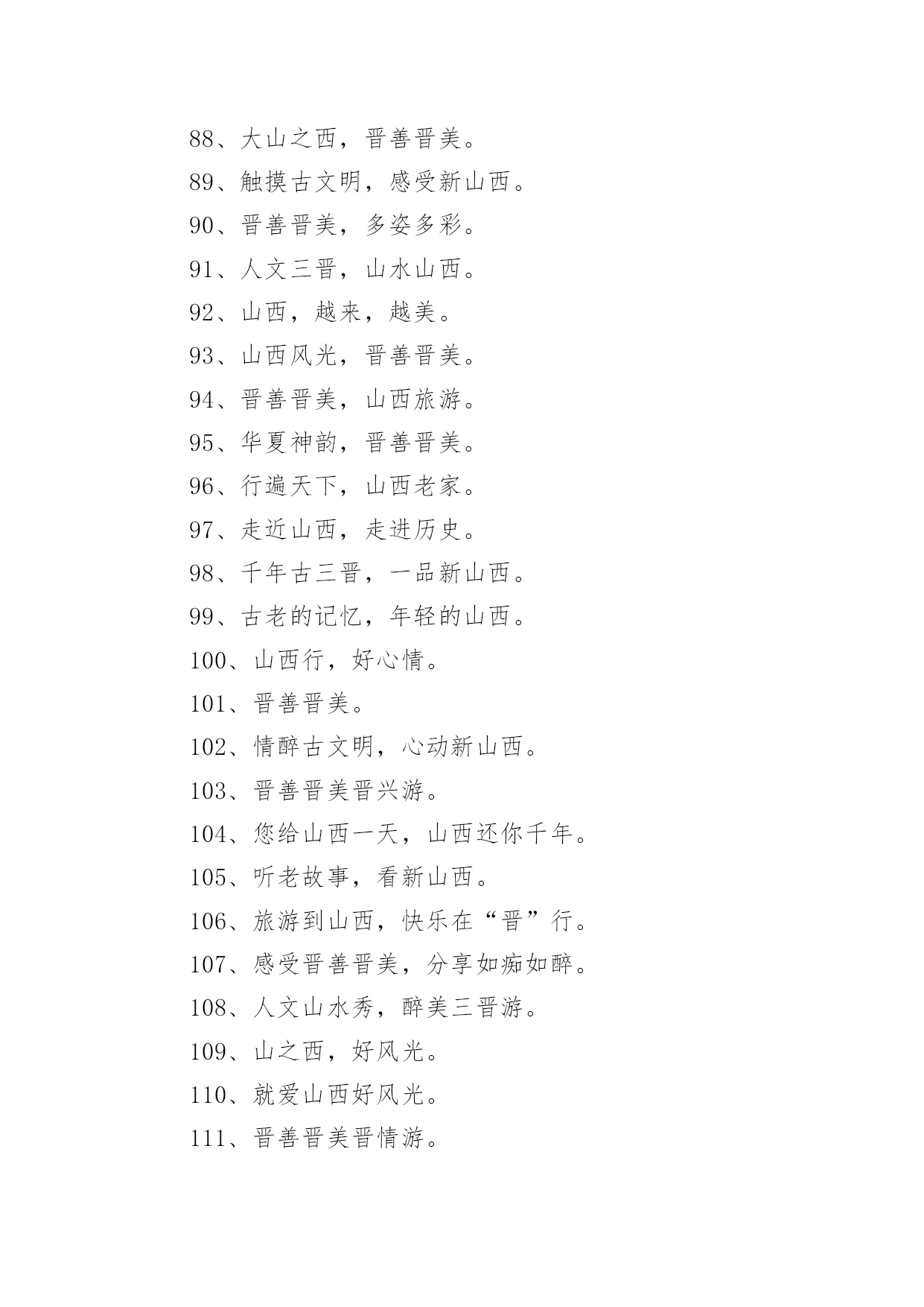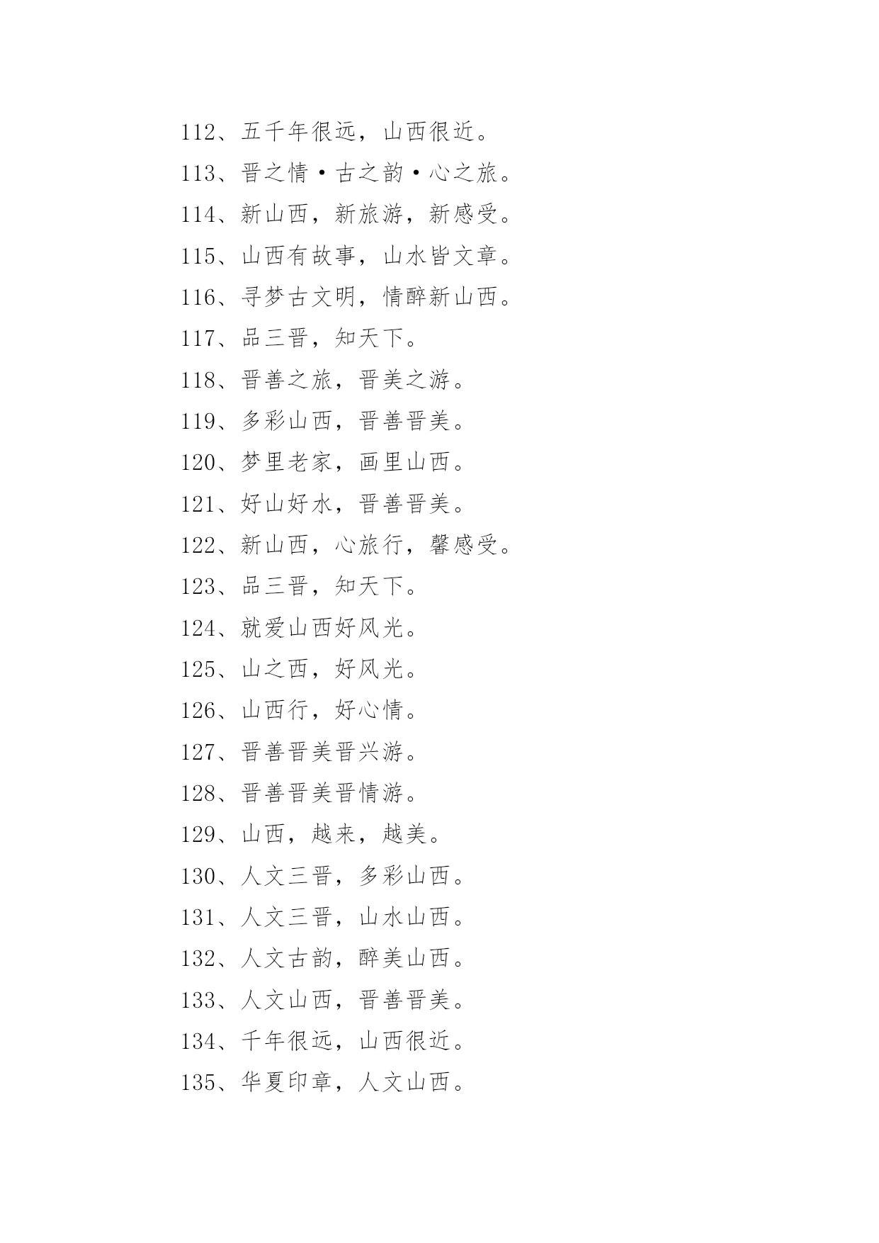 山西旅游口号山西旅游口号170句在日常学习、工作或生活中,大家总少不了接触一些耳熟能详的口号吧,口号既有公文语体准确、简洁的特点,又有政论语体严谨性、鼓动性的特点。你还在找寻优秀经典的口号吗?以下是小编为大家整理的山西旅游口号,希望能够帮助到大家。1、表里山河,锦绣山西。2、华夏印章,人文山西。3、诚信天下,回味山西。4、走进山西,感受神奇。5、山水画廊,人文天堂。6、人文三晋,多彩山西。7、山西好风光,山水皆文章。8、表里山河,晋善晋美。9、山西旅游,晋善晋美。10、山西,有你想不到的美。11、人文古韵,醉美山西。12、梦里山河,晋善晋美。13、晋善晋美,魅力山西。14、人文山西,晋善晋美。15、晋善晋美,人文山西。16、大山之西,晋善晋美。17、触摸古文明,感受新山西。18、晋善晋美,多姿多彩。19、人文三晋,山水山西。20、山西,越来,越美。21、山西风光,晋善晋美。22、晋善晋美,山西旅游。23、华夏神韵,晋善晋美。24、行遍天下,山西老家。25、走近山西,走进历史。26、千年古三晋,一品新山西。27、古老的记忆,年轻的山西。28、山西行,好心情。29、晋善晋美。30、情醉古文明,心动新山西。31、晋善晋美晋兴游。32、您给山西一天,山西还你千年。33、听老故事,看新山西。34、旅游到山西,快乐在“晋”行。35、感受晋善晋美,分享如痴如醉。36、人文山水秀,醉美三晋游。37、山之西,好风光。38、就爱山西好风光。39、晋善晋美晋情游。40、五千年很远,山西很近。41、晋之情·古之韵·心之旅。42、新山西,新旅游,新感受。43、山西有故事,山水皆文章。44、寻梦古文明,情醉新山西。45、品三晋,知天下。46、晋善之旅,晋美之游。47、多彩山西,晋善晋美。48、梦里老家,画里山西。49、好山好水,晋善晋美。50、新山西,心旅行,馨感受。51、人文古韵,醉美山西。52、晋之情·古之韵·心之旅。53、人文山水秀,醉美三晋游。54、梦里老家,画里山西。55、山西有故事,山水皆文章。56、感受晋善晋美,分享如痴如醉。57、山西,越来,越美。58、晋善晋美晋兴游。59、山西行,好心情。60、华夏印章,人文山西。61、品三晋,知天下。62、新山西,新旅游,新感受。63、人文山西,晋善晋美。64、触摸古文明,感受新山西。65、山西风光,晋善晋美。66、晋善晋美,多姿多彩。67、晋善晋美,山西旅游。68、诚信天下,回味山西。69、晋善晋美,人文山西。70、晋善之旅,晋美之游。71、山之西,好风光。72、人文三晋,多彩山西。73、表里山河,锦绣山西。74、华夏印章,人文山西。75、诚信天下,回味山西。76、走进山西,感受神奇。77、山水画廊,人文天堂。78、人文三晋,多彩山西。79、山西好风光,山水皆文章。80、表里山河,晋善晋美。81、山西旅游,晋善晋美。82、山西,有你想不到的美。83、人文古韵,醉美山西。84、梦里山河,晋善晋美。85、晋善晋美,魅力山西。86、人文山西,晋善晋美。87、晋善晋美,人文山西。88、大山之西,晋善晋美。89、触摸古文明,感受新山西。90、晋善晋美,多姿多彩。91、人文三晋,山水山西。92、山西,越来,越美。93、山西风光,晋善晋美。94、晋善晋美,山西旅游。95、华夏神韵,晋善晋美。96、行遍天下,山西老家。97、走近山西,走进历史。98、千年古三晋,一品新山西。99、古老的记忆,年轻的山西。100、山西行,好心情。101、晋善晋美。102、情醉古文明,心动新山西。103、晋善晋美晋兴游。104、您给山西一天,山西还你千年。105、听老故事,看新山西。106、旅游到山西,快乐在“晋”行。107、感受晋善晋美,分享如痴如醉。108、人文山水秀,醉美三晋游。109、山之西,好风光。110、就爱山西好风光。111、晋善晋美晋情游。112、五千年很远,山西很近。113、晋之情·古之韵·心之旅。114、新山西,新旅游,新感受。115、山西有故事,山水皆文章。116、寻梦古文明,情醉新山西。117、品三晋,知天下。118、晋善之旅,晋美之游。119、多彩山西,晋善晋美。120、梦里老家,画里山西。121、好山好水,晋善晋美。122、新山西,心旅行,馨感受。123、品三晋,知天下。124、就爱山西好风光。125、山之西,好风光。126、山西行,好心情。127、晋善晋美晋兴游。128、晋善晋美晋情游。129、山西,越来,越美。130、人文三晋,多彩山西。131、人文三晋,山水山西。132、人文古韵,醉美山西。133、人文山西,晋善晋美。134、千年很远,山西很近。135、华夏印章,人文山西。136、华夏神韵,晋善晋美。137、听老故事,看新山西。138、多彩山西,晋善晋美。139、大山之西,晋善晋美。140、好山好水