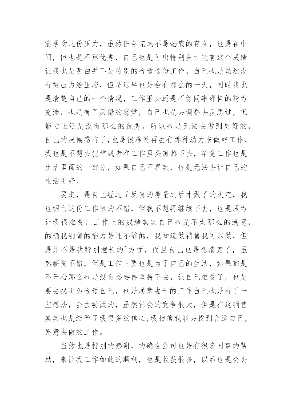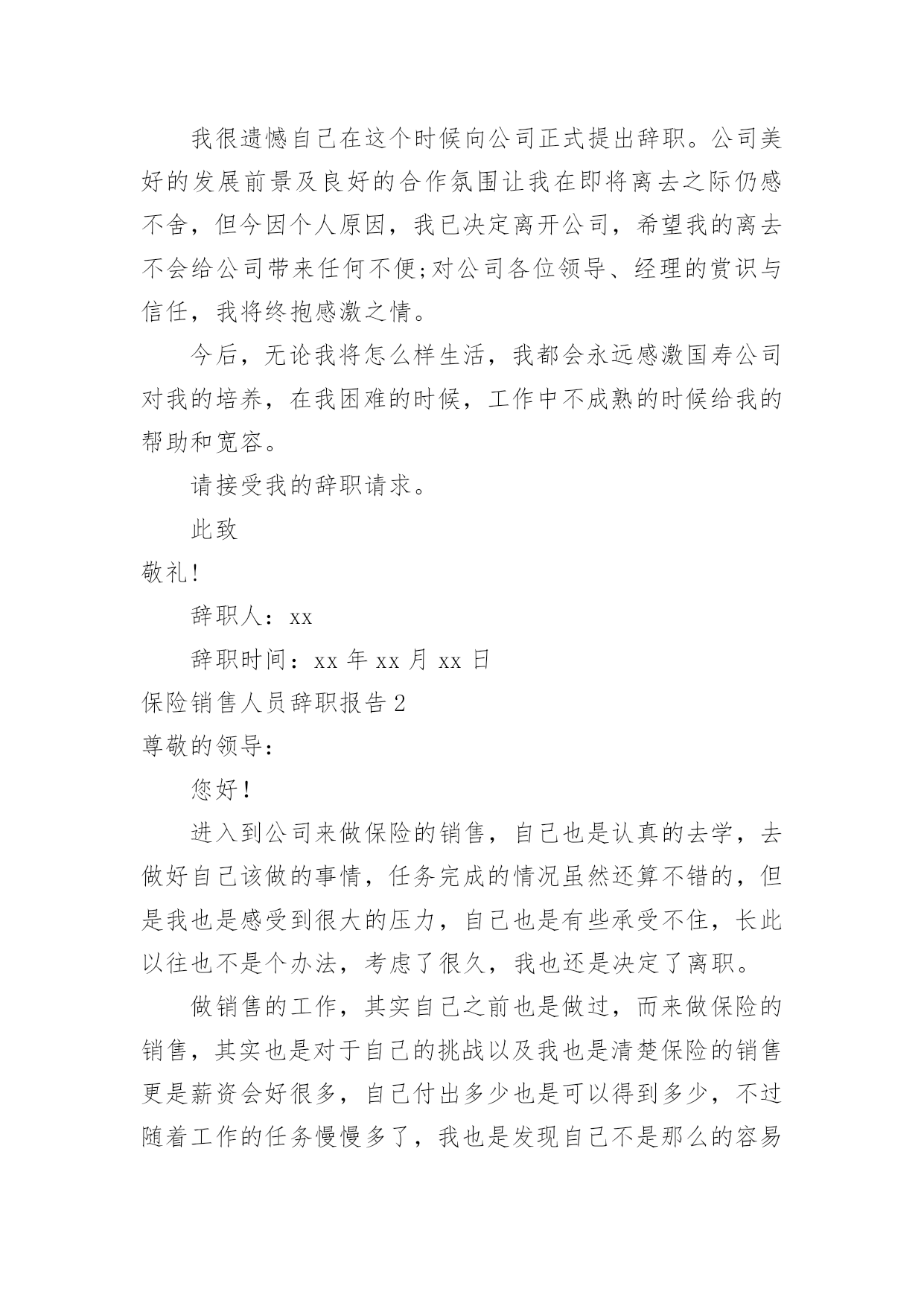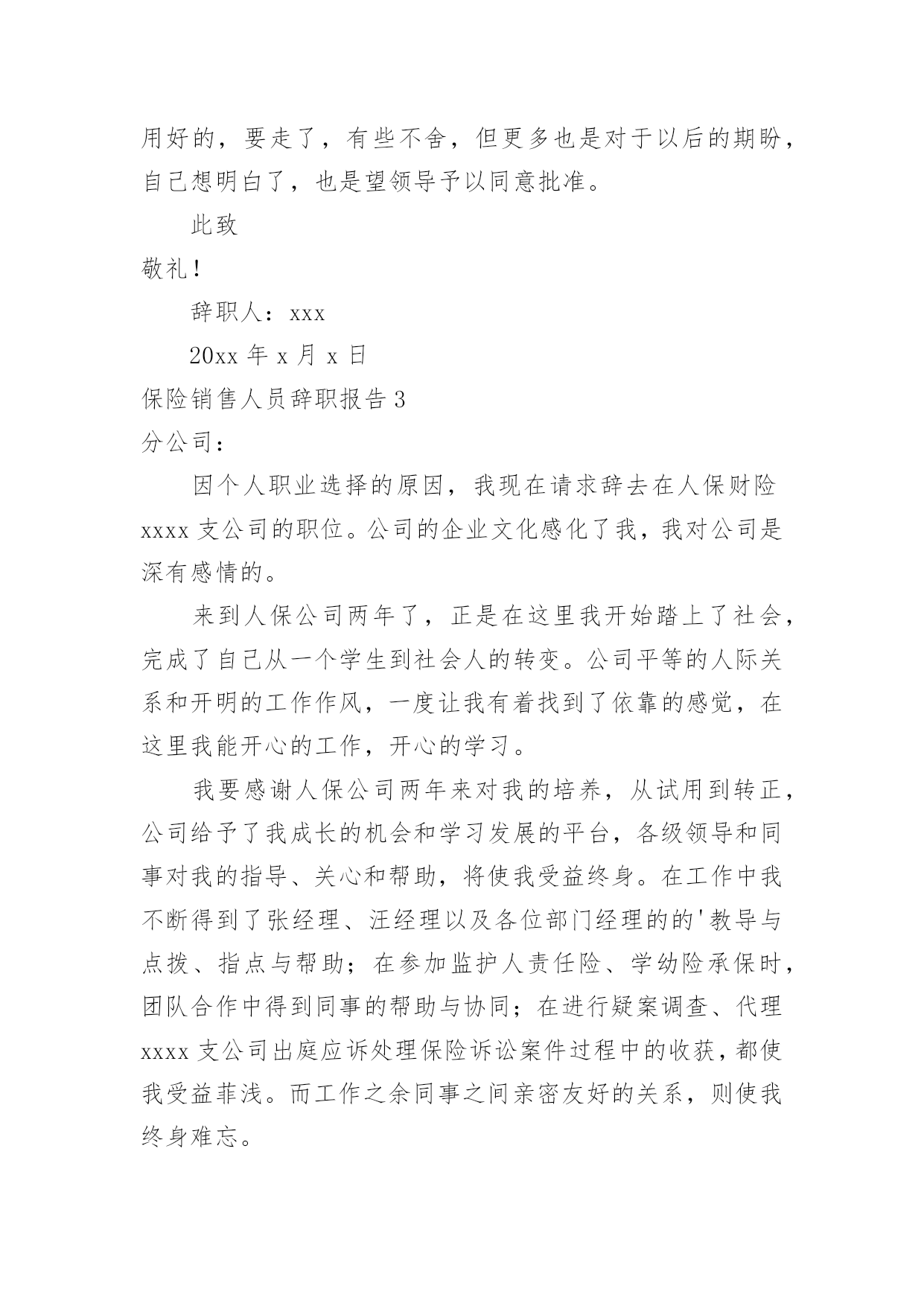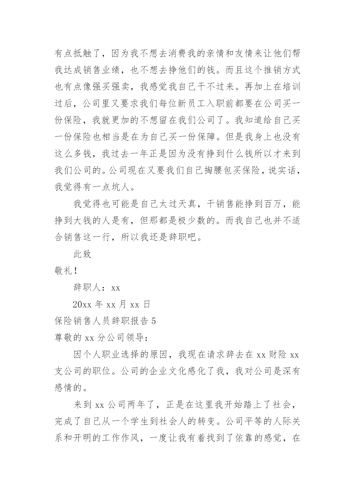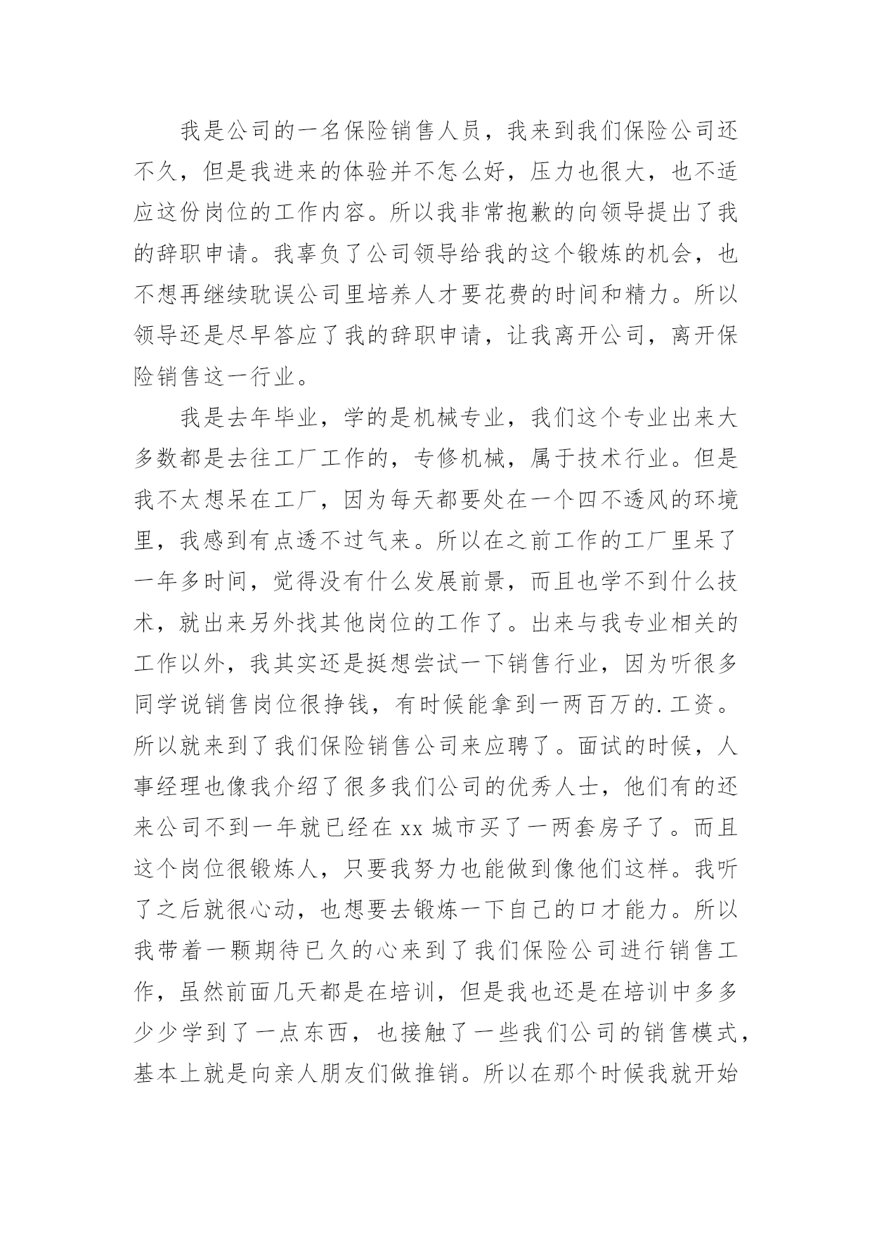 保险销售人员辞职报告保险销售人员辞职报告现今,换工作是一件再正常不过的事了,我们可能会作出离职的决定,这也意味着,需要写辞职报告了。辞职报告怎么写才合适呢?以下是小编为大家收集的保险销售人员辞职报告,欢迎阅读,希望大家能够喜欢。保险销售人员辞职报告1尊敬的领导:您好!因本人生病的公公常年卧床不能自理原因,我现在请求辞去在安吉县人寿保险支公司梅良区部组经理的职位。公司的企业文化感化了我,我对公司是深有感情的。本人来到国寿公司五年整,正是在这里我开始步入了这个大家庭,完成了自己从一个学生到社会人的转变。公司平等的人际关系和开朗的'工作作风,一度让我有着找到乐依靠的感觉,在这里我能开心的工作,开心的学习。我要感谢公司五年来对我的培养,公司给予了我成长的机会和学习发展的平台,各级领导和同事对我的指导、关心和帮助,将使我受益终身。在工作中我不断得到了邹经理、周经理以及各级部门经理的教导与点拨、指点与帮助;团队合作中得到同事的帮助与协同;在保险以及保险亲密友好的关系,则使我终身难忘。我很遗憾自己在这个时候向公司正式提出辞职。公司美好的发展前景及良好的合作氛围让我在即将离去之际仍感不舍,但今因个人原因,我已决定离开公司,希望我的离去不会给公司带来任何不便;对公司各位领导、经理的赏识与信任,我将终抱感激之情。今后,无论我将怎么样生活,我都会永远感激国寿公司对我的培养,在我困难的时候,工作中不成熟的时候给我的帮助和宽容。请接受我的辞职请求。此致敬礼!辞职人:xx辞职时间:xx年xx月xx日保险销售人员辞职报告2尊敬的领导:您好!进入到公司来做保险的销售,自己也是认真的去学,去做好自己该做的事情,任务完成的情况虽然还算不错的,但是我也是感受到很大的压力,自己也是有些承受不住,长此以往也不是个办法,考虑了很久,我也还是决定了离职。做销售的工作,其实自己之前也是做过,而来做保险的销售,其实也是对于自己的挑战以及我也是清楚保险的销售更是薪资会好很多,自己付出多少也是可以得到多少,不过随着工作的任务慢慢多了,我也是发现自己不是那么的容易能承受这份压力,虽然任务完成不是垫底的存在,也是在中间,但也是不算优秀,自己也是付出特别多才能有这个成绩让我也是明白并不是特别的合适这份工作,自己也是虽然没有被压力给压垮,但是迟早也是会有那么的一天,同时我也是清楚自己的一个情况,工作里头还是不像同事那样的精力充沛,也是有了厌倦的感觉,自己也是去调整去反思过,但能力上还是没有那么的优秀,所以也是无法去做到更好的,自己的厌倦感有了,也是很难说再去有那种动力来做好工作,我也是不想去犯错或者在工作里头煎熬下去,毕竟工作也是生活里面的一部分,如果自己不喜欢,也是无法去让自己的生活更好。要走,是自己经过了反复的考量之后才做了的决定,我也明白这份工作真的不错,但我不想再继续下去,也是压力让我很难受,工作上的成绩其实自己也是不太那么的满意,的确我销售的能力是还不够的,我知道做销售我可以做,但是并不是我特别擅长的`方面,而且自己也是想清楚了,虽然薪资不错,但是工作主要也是为了自己的生活,如果都是不开心那么也是没有必要再坚持下去,让自己难受了,也是要去找更为合适自己,也是愿意去干的工作自己也是有了一些想法,会去尝试的,虽然社会的竞争很大,但是在这销售其实也是给予了我很多的信心,我相信我能去找到合适自己,愿意去做的工作。当然也是特别的感谢,的确在公司也是有很多同事的帮助,来让我工作如此的顺利,也是收获很多,以后也是会去用好的,要走了,有些不舍,但更多也是对于以后的期盼,自己想明白了,也是望领导予以同意批准。此致敬礼!辞职人:xxx20xx年x月x日保险销售人员辞职报告3分公司:因个人职业选择的原因,我现在请求辞去在人保财险xxxx支公司的职位。公司的企业文化感化了我,我对公司是深有感情的。来到人保公司两年了,正是在这里我开始踏上了社会,完成了自己从一个学生到社会人的转变。公司平等的人际关系和开明的工作作风,一度让我有着找到了依靠的感觉,在这里我能开心的工作,开心的学习。我要感谢人保公司两年来对我的培养,从试用到转正,公司给予了我成长的机会和学习发展的平台,各级领导和同事对我的指导、关心和帮助,将使我受益终身。在工作中我不断得到了张经理、汪经理以及各位部门经理的的'教导与点拨、指点与帮助;在参加监护人责任险、学幼险承保时,团队合作中得到同事的帮助与协同;在进行疑案调查、代理xxxx支公司出庭应诉处理保险诉讼案件过程中的收获,都使我受益菲浅。而工作之余同事之间亲密友好的关系,则使我终身难忘。我从xxxx年进入公司,正是xxxx支公司经营最困难的时候,我亲身经历了公司摆脱被动不利局面、走上发展的正轨的全过程,同时我也为能在这样一个英明果断的领导班子和团结协作的同事之中工作过而骄傲。我清楚省公司接