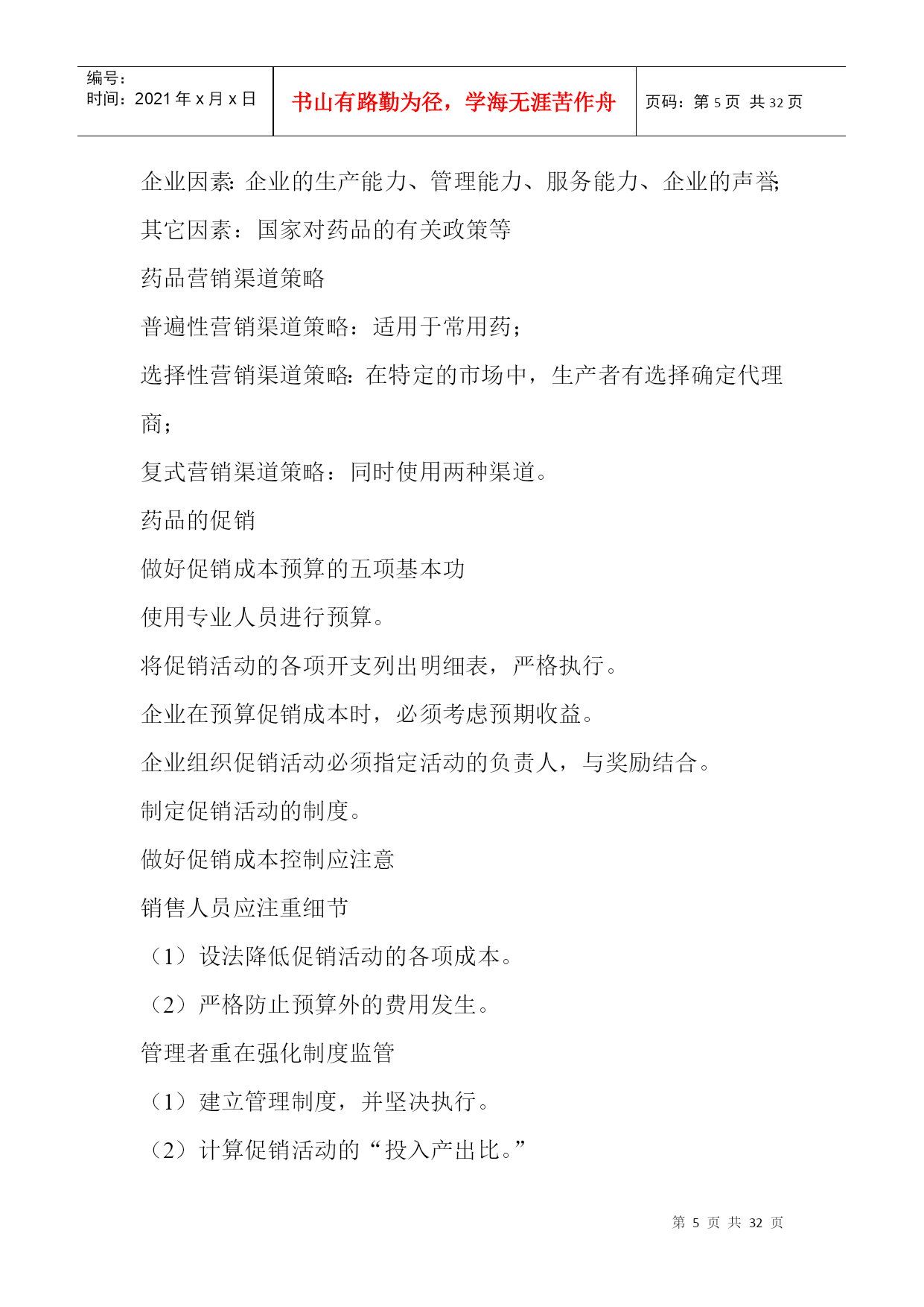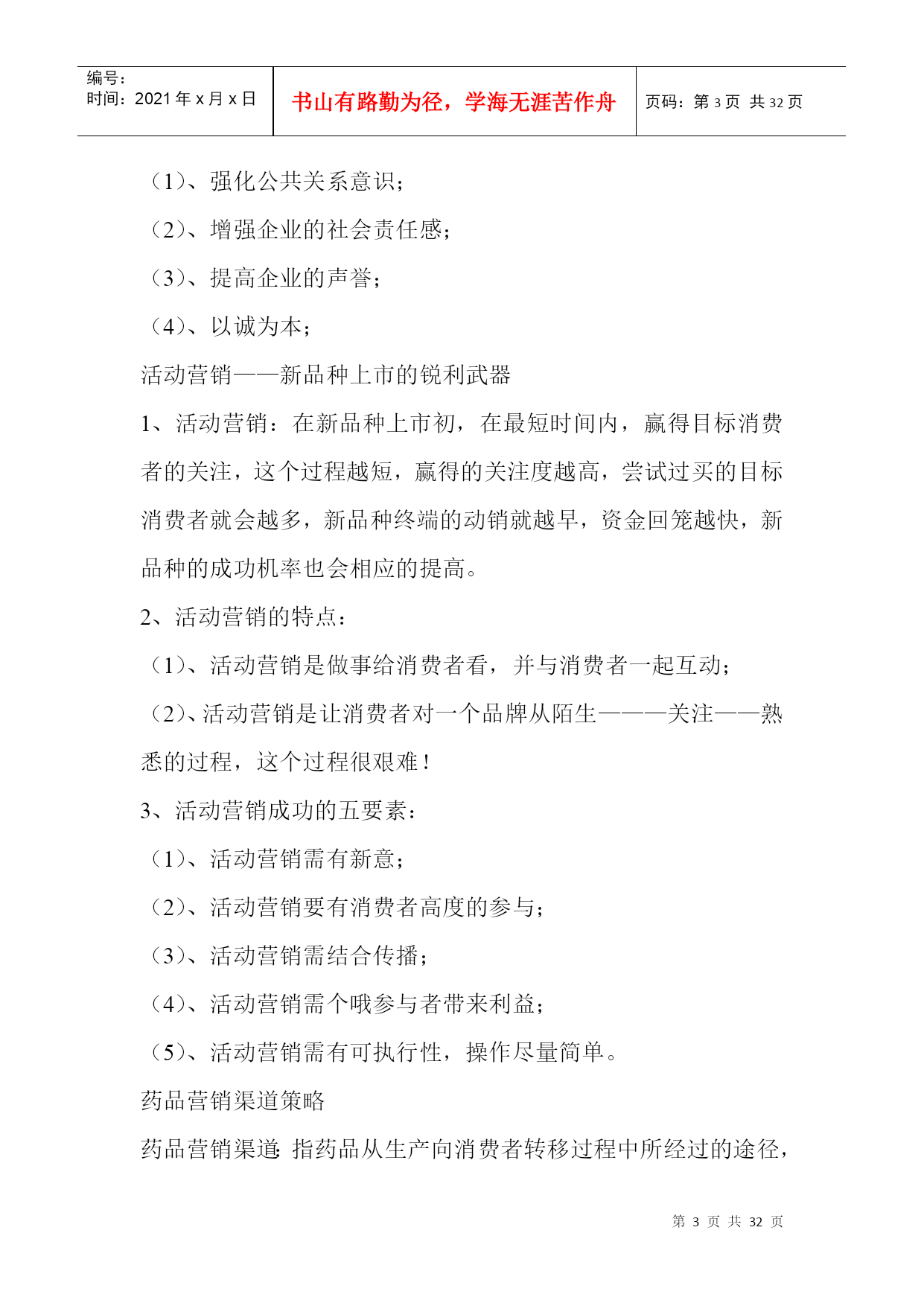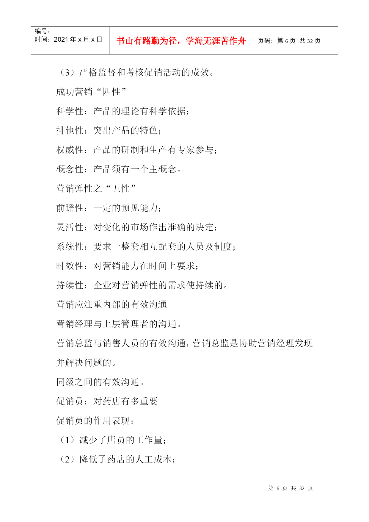 编号:时间:2021年x月x日书山有路勤为径,学海无涯苦作舟页码:第PAGE32页共NUMPAGES32页第PAGE\*MERGEFORMAT32页共NUMPAGES\*MERGEFORMAT32页促销的策划与执行店长应该知道的事问题:1、在工作、生活中,(1)你有明确的计划吗?(2)如果有,确实执行了吗?(3)执行后,有没有总结?2、药品促销的概念与形式?药品促销的概念与作用药品促销(药品促进销售):指医药企业通过人员或非人员的方式,将药品或劳务的信息传递给消费者或用户,引起其兴趣和注意,激发其购买欲望,促进其购买行为的一系列活动。药品促销的作用传递信息,引导消费;刺激需求,促进成交;突出特点,稳定销售;塑造形象,提高声誉;药品促销的形式3、对药品推销员的要求(1)、企业知识;(2)、药品知识;(3)、市场信息;(4)、推销技巧;(5)、心理素质稳定、身体情况符合规定;营业推广1、营业推广:指为了刺激早期需求而采取的能够迅速产生激励作用的促销活动。2、营业推广的形式(1)、对消费者的推广:赠送样品、特价销售、赠品印花;(2)、对推销人员的鼓励:红利提成、推销奖励、推销竞赛;(3)、对中间商的推广;广告促销1、广告促销:指借助报纸、杂志、广播、电视等媒体的宣传而进行的促销活动。2、广告促销的特点:(1)间接性;(2)简练性;(3)单向性;(4)广泛性3、广告促销的管理内容:公共关系1、公共关系:指企业为了实现一定的目标,向社会相关部门、群体或个人展开的一项树立自身形象,取得公众理解、信任、支持和合作的一种公共关系。2、公共关系的内容(1)、强化公共关系意识;(2)、增强企业的社会责任感;(3)、提高企业的声誉;(4)、以诚为本;活动营销——新品种上市的锐利武器1、活动营销:在新品种上市初,在最短时间内,赢得目标消费者的关注,这个过程越短,赢得的关注度越高,尝试过买的目标消费者就会越多,新品种终端的动销就越早,资金回笼越快,新品种的成功机率也会相应的提高。2、活动营销的特点:(1)、活动营销是做事给消费者看,并与消费者一起互动;(2)、活动营销是让消费者对一个品牌从陌生———关注——熟悉的过程,这个过程很艰难!3、活动营销成功的五要素:(1)、活动营销需有新意;(2)、活动营销要有消费者高度的参与;(3)、活动营销需结合传播;(4)、活动营销需个哦参与者带来利益;(5)、活动营销需有可执行性,操作尽量简单。药品营销渠道策略药品营销渠道:指药品从生产向消费者转移过程中所经过的途径,以及相应设置的市场营销机构。药品营销渠道的类型1、不同长度的营销渠道:生产者———消费者生产者——零售商——消费者生产者——批发商——零售商——消费者生产者——代理商——批发商——零售商——消费者2、不同宽度的营销渠道:宽营销渠道:指生产者通过许多相同类型的中间商销售自己的药品。窄营销渠道:指生产者选用较少的相同类型的中间商推销自己的药品。3、垂直营销渠道:指通过一定手段和途径将渠道系统中的多层组织联合起来,使渠道个组织之间互相配合得营销渠道。影响药品营销渠道的因素药品因素:药品的单位价值、药品的重量和体积、药品的包质条件、定制品和标准品、药品的剂型和规格、药品的技术服务程度、新产品试销;市场因素:市场面的大小和用户数量的多少、用户每次的购买数量、用户的购买习惯、市场的季节性和时间性、竞争者的销售渠道;企业因素:企业的生产能力、管理能力、服务能力、企业的声誉;其它因素:国家对药品的有关政策等药品营销渠道策略普遍性营销渠道策略:适用于常用药;选择性营销渠道策略:在特定的市场中,生产者有选择确定代理商;复式营销渠道策略:同时使用两种渠道。药品的促销做好促销成本预算的五项基本功使用专业人员进行预算。将促销活动的各项开支列出明细表,严格执行。企业在预算促销成本时,必须考虑预期收益。企业组织促销活动必须指定活动的负责人,与奖励结合。制定促销活动的制度。做好促销成本控制应注意销售人员应注重细节(1)设法降低促销活动的各项成本。(2)严格防止预算外的费用发生。管理者重在强化制度监管(1)建立管理制度,并坚决执行。(2)计算促销活动的“投入产出比。”(3)严格监督和考核促销活动的成效。成功营销“四性”科学性:产品的理论有科学依据;排他性:突出产品的特色;权威性:产品的研制和生产有专家参与;概念性:产品须有一个主概念。营销弹性之“五性”前瞻性:一定的预见能力;灵活性:对变化的市场作出准确的决定;系统性:要求一整套相互配套的人员及制度;时效性:对营销能