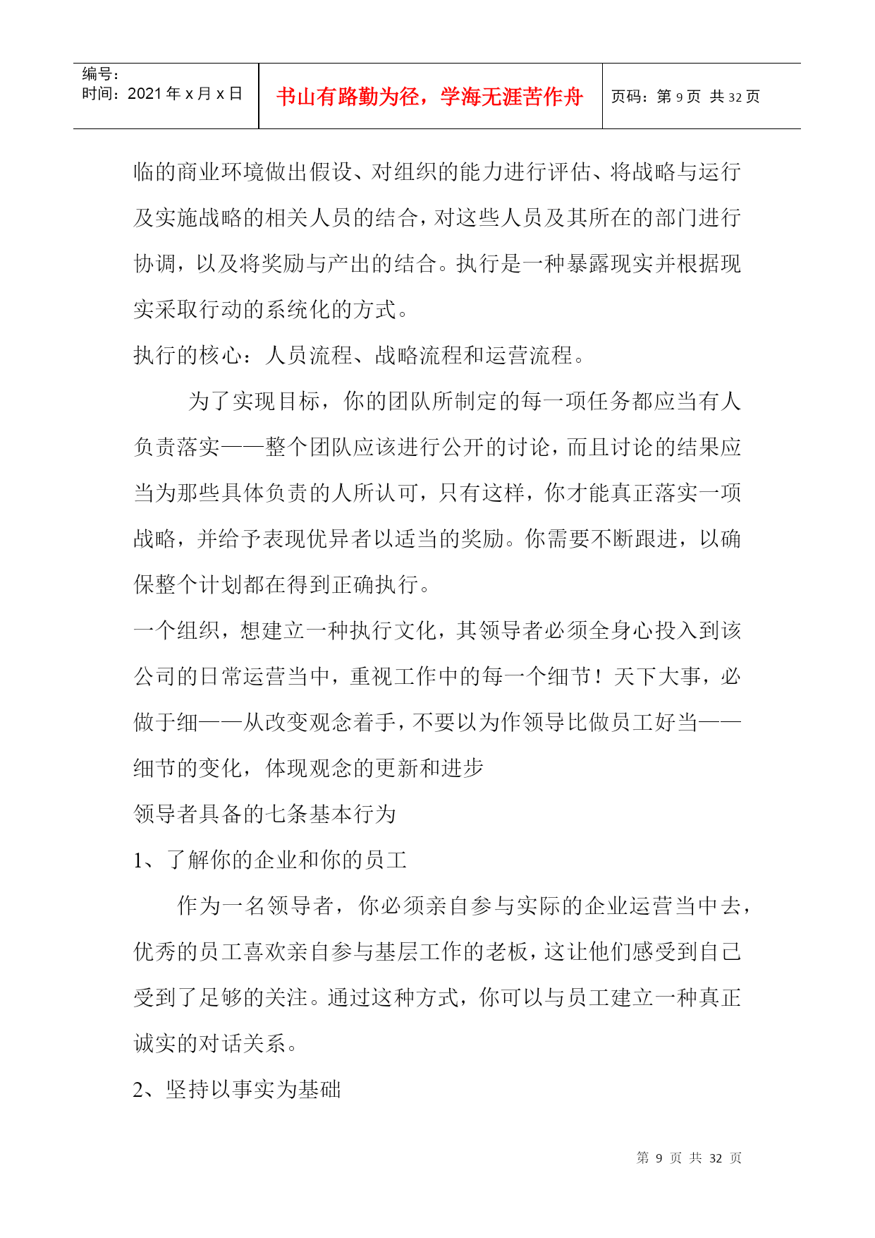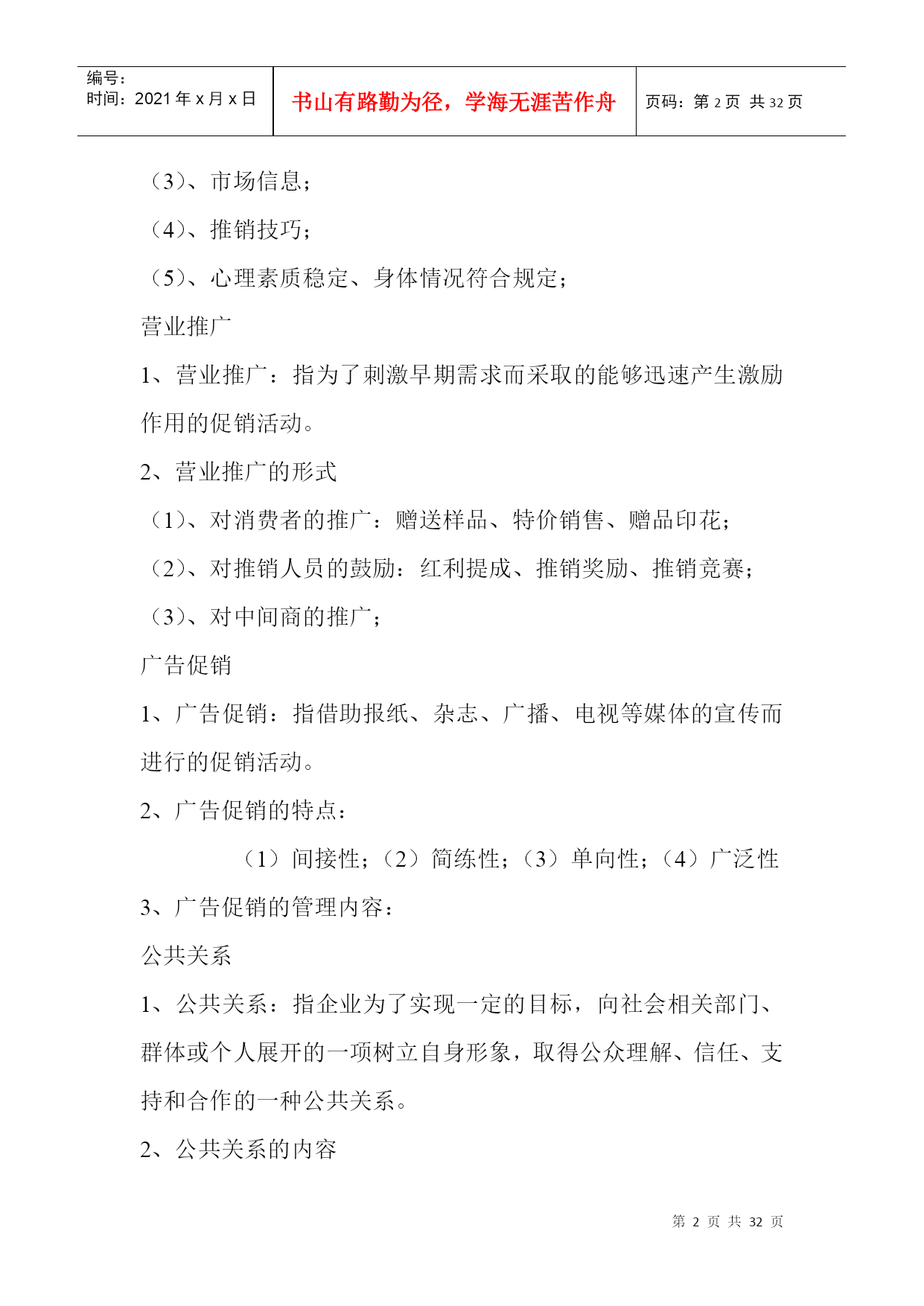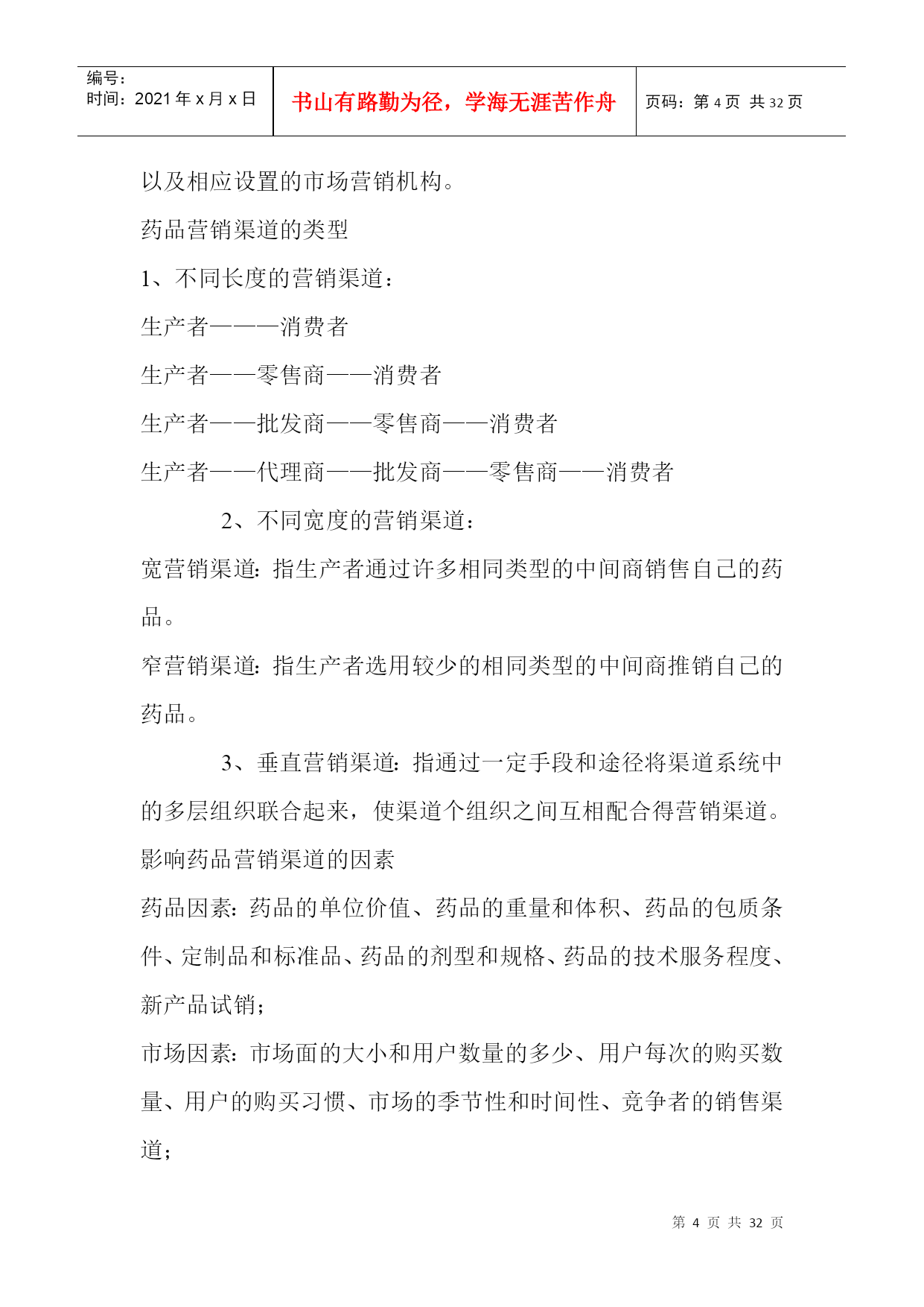 编号:时间:2021年x月x日书山有路勤为径,学海无涯苦作舟页码:第PAGE32页共NUMPAGES32页第PAGE\*MERGEFORMAT32页共NUMPAGES\*MERGEFORMAT32页促销的策划与执行店长应该知道的事问题:1、在工作、生活中,(1)你有明确的计划吗?(2)如果有,确实执行了吗?(3)执行后,有没有总结?2、药品促销的概念与形式?药品促销的概念与作用药品促销(药品促进销售):指医药企业通过人员或非人员的方式,将药品或劳务的信息传递给消费者或用户,引起其兴趣和注意,激发其购买欲望,促进其购买行为的一系列活动。药品促销的作用传递信息,引导消费;刺激需求,促进成交;突出特点,稳定销售;塑造形象,提高声誉;药品促销的形式3、对药品推销员的要求(1)、企业知识;(2)、药品知识;(3)、市场信息;(4)、推销技巧;(5)、心理素质稳定、身体情况符合规定;营业推广1、营业推广:指为了刺激早期需求而采取的能够迅速产生激励作用的促销活动。2、营业推广的形式(1)、对消费者的推广:赠送样品、特价销售、赠品印花;(2)、对推销人员的鼓励:红利提成、推销奖励、推销竞赛;(3)、对中间商的推广;广告促销1、广告促销:指借助报纸、杂志、广播、电视等媒体的宣传而进行的促销活动。2、广告促销的特点:(1)间接性;(2)简练性;(3)单向性;(4)广泛性3、广告促销的管理内容:公共关系1、公共关系:指企业为了实现一定的目标,向社会相关部门、群体或个人展开的一项树立自身形象,取得公众理解、信任、支持和合作的一种公共关系。2、公共关系的内容(1)、强化公共关系意识;(2)、增强企业的社会责任感;(3)、提高企业的声誉;(4)、以诚为本;活动营销——新品种上市的锐利武器1、活动营销:在新品种上市初,在最短时间内,赢得目标消费者的关注,这个过程越短,赢得的关注度越高,尝试过买的目标消费者就会越多,新品种终端的动销就越早,资金回笼越快,新品种的成功机率也会相应的提高。2、活动营销的特点:(1)、活动营销是做事给消费者看,并与消费者一起互动;(2)、活动营销是让消费者对一个品牌从陌生———关注——熟悉的过程,这个过程很艰难!3、活动营销成功的五要素:(1)、活动营销需有新意;(2)、活动营销要有消费者高度的参与;(3)、活动营销需结合传播;(4)、活动营销需个哦参与者带来利益;(5)、活动营销需有可执行性,操作尽量简单。药品营销渠道策略药品营销渠道:指药品从生产向消费者转移过程中所经过的途径,以及相应设置的市场营销机构。药品营销渠道的类型1、不同长度的营销渠道:生产者———消费者生产者——零售商——消费者生产者——批发商——零售商——消费者生产者——代理商——批发商——零售商——消费者2、不同宽度的营销渠道:宽营销渠道:指生产者通过许多相同类型的中间商销售自己的药品。窄营销渠道:指生产者选用较少的相同类型的中间商推销自己的药品。3、垂直营销渠道:指通过一定手段和途径将渠道系统中的多层组织联合起来,使渠道个组织之间互相配合得营销渠道。影响药品营销渠道的因素药品因素:药品的单位价值、药品的重量和体积、药品的包质条件、定制品和标准品、药品的剂型和规格、药品的技术服务程度、新产品试销;市场因素:市场面的大小和用户数量的多少、用户每次的购买数量、用户的购买习惯、市场的季节性和时间性、竞争者的销售渠道;企业因素:企业的生产能力、管理能力、服务能力、企业的声誉;其它因素:国家对药品的有关政策等药品营销渠道策略普遍性营销渠道策略:适用于常用药;选择性营销渠道策略:在特定的市场中,生产者有选择确定代理商;复式营销渠道策略:同时使用两种渠道。药品的促销做好促销成本预算的五项基本功使用专业人员进行预算。将促销活动的各项开支列出明细表,严格执行。企业在预算促销成本时,必须考虑预期收益。企业组织促销活动必须指定活动的负责人,与奖励结合。制定促销活动的制度。做好促销成本控制应注意销售人员应注重细节(1)设法降低促销活动的各项成本。(2)严格防止预算外的费用发生。管理者重在强化制度监管(1)建立管理制度,并坚决执行。(2)计算促销活动的“投入产出比。”(3)严格监督和考核促销活动的成效。成功营销“四性”科学性:产品的理论有科学依据;排他性:突出产品的特色;权威性:产品的研制和生产有专家参与;概念性:产品须有一个主概念。营销弹性之“五性”前瞻性:一定的预见能力;灵活性:对变化的市场作出准确的决定;系统性:要求一整套相互配套的人员及制度;时效性:对营销能