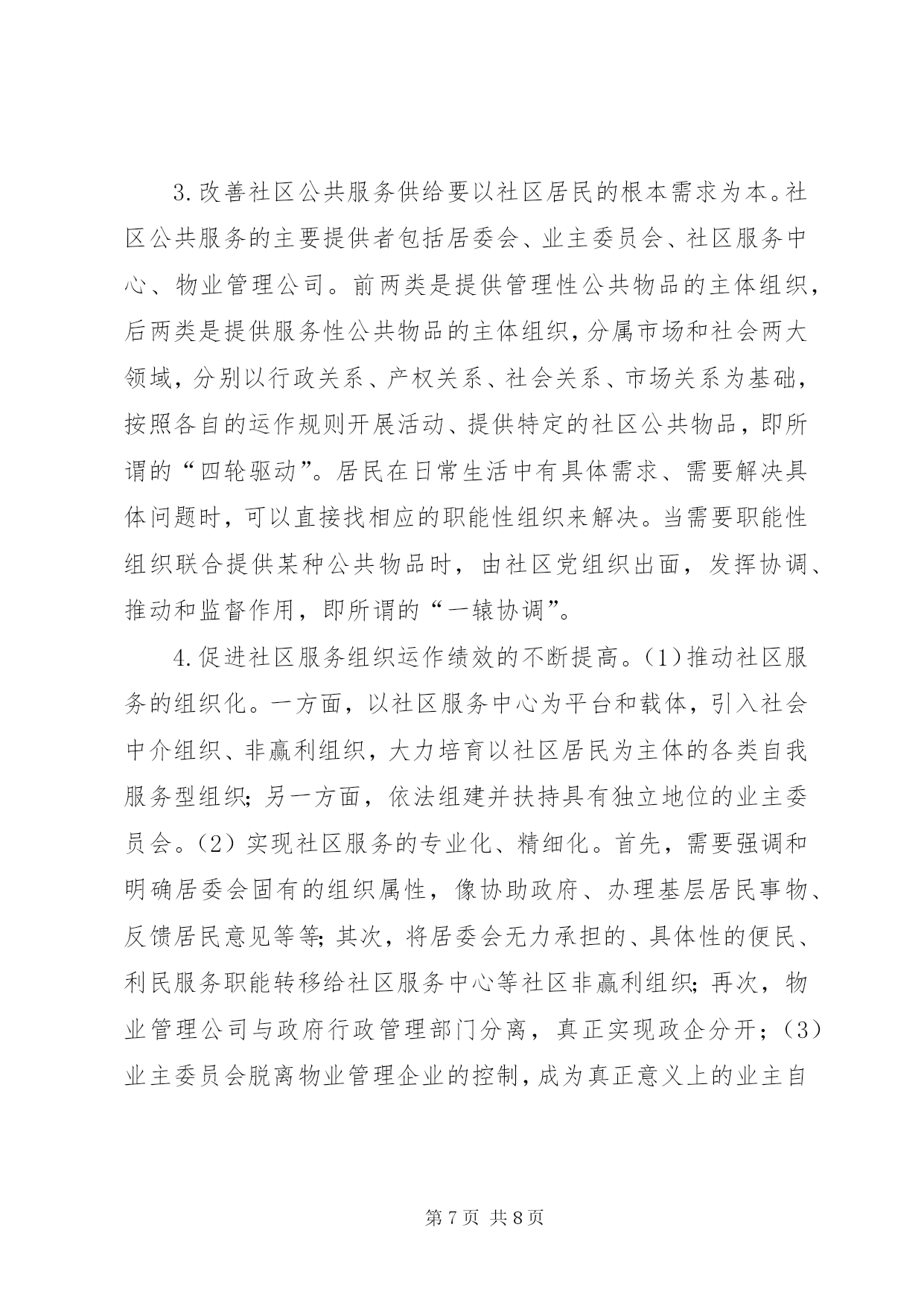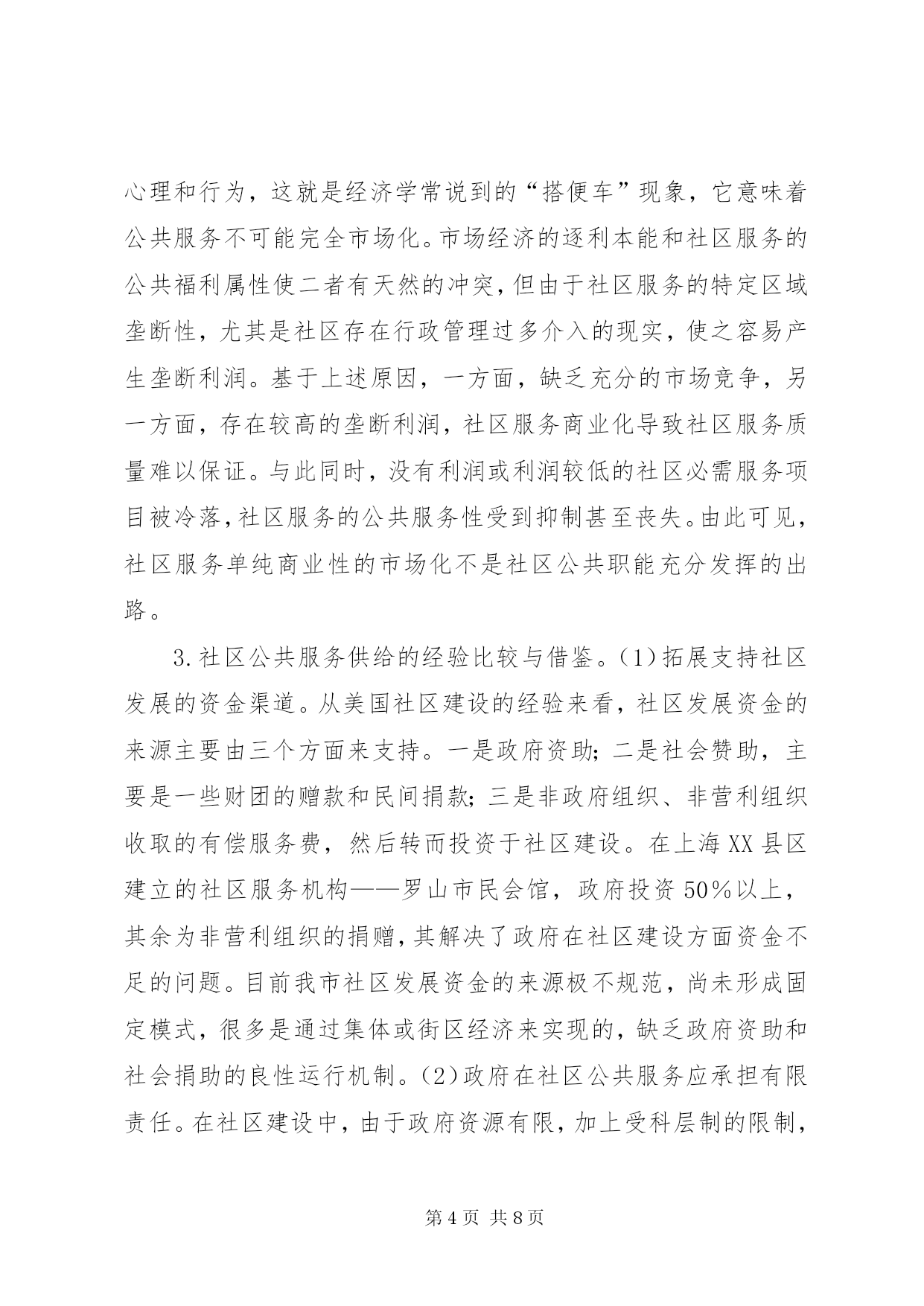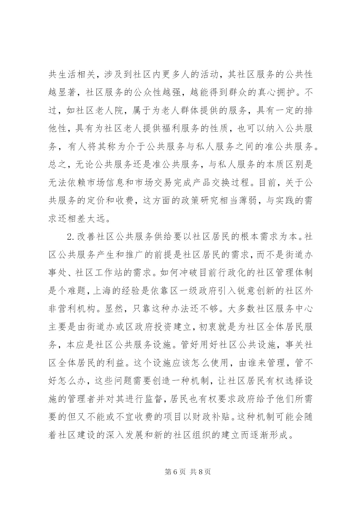 第PAGE\*Arabic\*MERGEFORMAT8页共NUMPAGES\*MERGEFORMAT8页居民社区公共服务供给制度思考[摘要]XX市社区建设在党和政府的领导下,已解决了一些重要问题,但与建设国际化城市的要求还有很大距离,突出表现在社区中居民小区的公共服务职能不足与居民对社区公共服务越来越强烈的需求之间的矛盾尖锐。本文从社区公共服务性质与政策、社区居民的根本需求、社区服务组织运作绩效的提高等方面提出了完善XX市社区服务供给的建议。[关键词]社区公共服务;供给制度;居民;改革一、社区公共服务的内涵、性质与分类1.社区公共服务内涵。指是以服务形式体现的社区内的公益物品,也是以社区为单位提供的社会公共服务,广义包含社区福利服务。社区建设在实质上是一个社区成员参与和共享的社区发展过程,其发展的要素不仅有社区成员(居民与驻区单位)、各类组织、社区公共设施、公共项目等物质性因素,还有包括社区投入体制、社区运行机制、社区管理体系、社区公共意识和社区认同意识等上层建筑和意识形态因素。而能将这些要素整合起来,通过共同行为增强社区凝聚力的社区工作,就是社区公共服务。2.社区公共服务分类。住房商品化、私有化改革以来,在社区特定的生活空间里,住房成了重要的私人物品,相伴的是大量社区公共物品,如:社区卫生、治安、环境、绿化,社区公共设施维护、维修,社区便民、利民服务,居民私人产权和公共产权维护等。社区公共物品可细分为两类:一类是公共设施、公共管理,其提供社区居民、社区组织等活动的规则、秩序、制度;另一类是公共服务,其向居民和业主提供服务。公共物品按照供给者数量,分为垄断性、非垄断性公共物品。在社区内既有垄断性公共物品,如政府对社区进行社会管理,又有非垄断性公共物品,如社区物业管理等。3.社区公共服务的性质。社区公共服务具备一般公共物品所拥有的效用不可分割性和消费的非竞争性。一旦公共物品存在,另外一个人消费它所需付出的追加资源成本为零。社区公共物品还具有“社区性”,即社区公共物品在社区成员之间具有非排他性,但对非社区成员却具有排他性,其主要受益对象是社区内部成员。二、当前XX市社区公共服务供给体制存在的主要问题1.社区建设的发展对公共服务供给体制提出新要求。在社会物质产品极大丰富的同时,城市生活中公共物品供给水平、供给形式、供给层次在总体上依然短缺。在既往的社区服务模式和街居管理体制下,政府是社区内公共物品的主要提供者,远远满足不了社区日益增长的需求。城市社区建设的中心任务是建立新的公共物品供给体系替代传统的单位制和街居制,弥补基层社会管理缺位和服务短缺,有效地满足居民对公共物品的需求。2.当前社区公共服务供给中存在的主要问题。由于历史的原因和实践经验的不足,现在的社区建设普遍面临以下问题。(1)低效率的行政化。迄今为止,社区服务公共设施的运营与管理,由于主要是由街道办事处或区级政府投资建立的,而且几乎都是由政府的派出机构——街道选派人员或由街道民政科负责的,有关部门利用服务设施尤其是房产将某些行政机构挪入,使其具有政府机构的行政功能。尽管社区服务中心也聘用人员,形成了一个操作班子和有一定的规章制度,但由于缺乏有效的、组织化的管理思路、规划和方法,以及一个组织所必需的决策权和管理权,所以顶多只能算是隶属于街道的一个行政事业小组。虽然他们也可能注册成为事业法人,但却无法人的权利也无法人的能力,其地位甚至不如旧体制下的事业单位。由于缺乏成熟的管理模式和规范,加之缺乏营运资金,导致管理状况不佳,不是效率低下就是盲目追求盈利,以至影响了社区公共服务设施功能的发挥。显然简单地由政府代行社区居民公共服务的做法,不仅容易造成效率低下,而且社区公共服务职能和质量很难保证。(2)抑制公共属性的商业化。近年来,为推进社区服务,在“社区服务产业化”的口号下,相当一部分社区服务中心对外承包、出租房屋搞起了经营活动。社区服务中心能不能和应不应该搞创收,是不是可以成为自负盈亏的经营实体,已经成了困扰社区公共服务发展的重要问题。由于公共服务的公众性质,常常难于准确将成本分解到每一个具体的享用者身上,所以,难以避免有些享用者的占便宜心理和行为,这就是经济学常说到的“搭便车”现象,它意味着公共服务不可能完全市场化。市场经济的逐利本能和社区服务的公共福利属性使二者有天然的冲突,但由于社区服务的特定区域垄断性,尤其是社区存在行政管理过多介入的现实,使之容易产生垄断利润。基于上述原因,一方面,缺乏充分的市场竞争,另一方面,存在较高的垄断利润,社区服务商业化导致社区服务质量难以保证。与此同时,没有利润或利润较低的社区必需服务项目被冷落,社区服务的公共服务性受到抑制甚至丧失。由此可见,社区服务单纯商业性的市场化不是社区公共职能充分发挥的出路。3.社区公共服务供