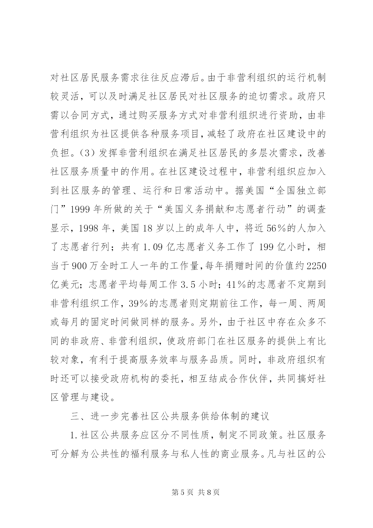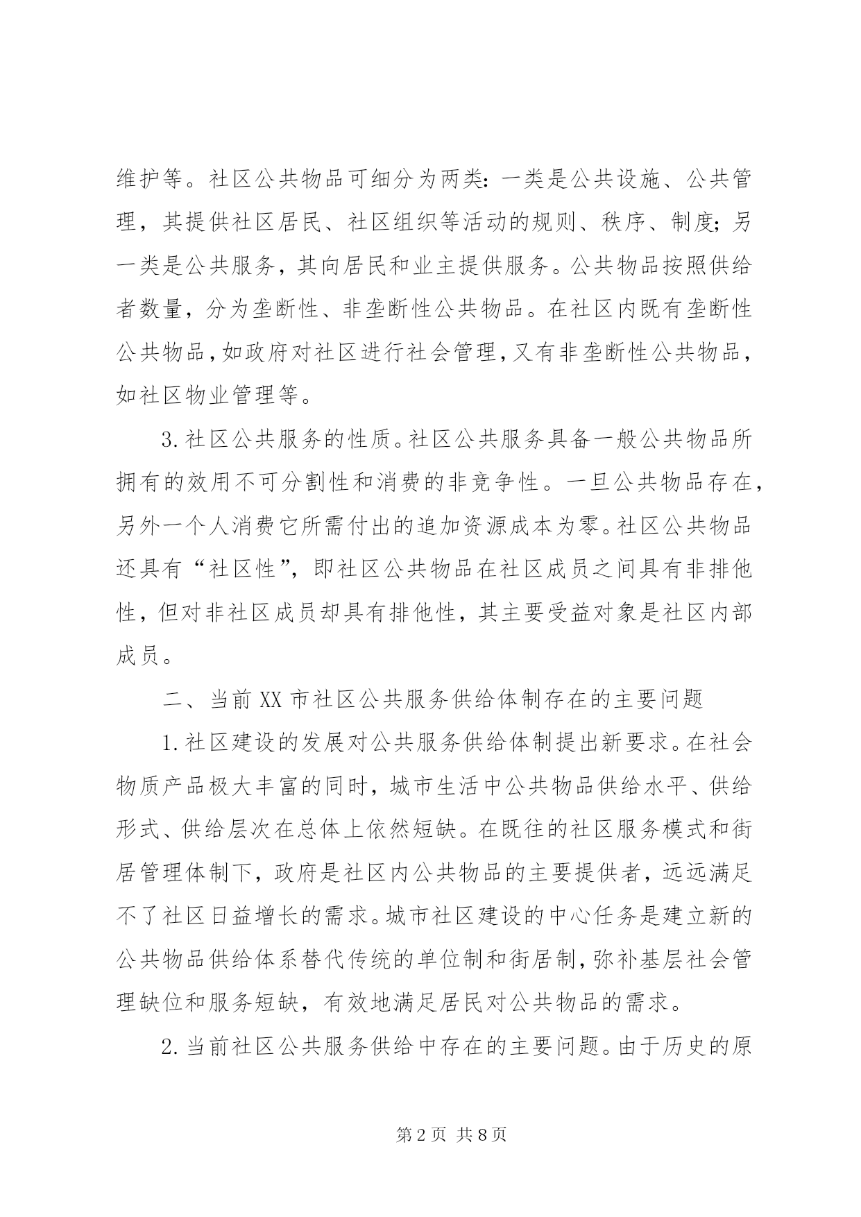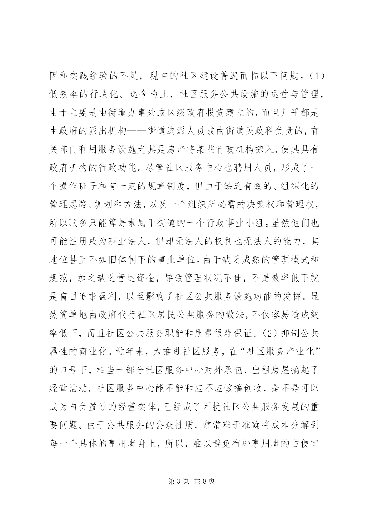 第PAGE\*Arabic\*MERGEFORMAT8页共NUMPAGES\*MERGEFORMAT8页居民社区公共服务供给制度思考[摘要]XX市社区建设在党和政府的领导下,已解决了一些重要问题,但与建设国际化城市的要求还有很大距离,突出表现在社区中居民小区的公共服务职能不足与居民对社区公共服务越来越强烈的需求之间的矛盾尖锐。本文从社区公共服务性质与政策、社区居民的根本需求、社区服务组织运作绩效的提高等方面提出了完善XX市社区服务供给的建议。[关键词]社区公共服务;供给制度;居民;改革一、社区公共服务的内涵、性质与分类1.社区公共服务内涵。指是以服务形式体现的社区内的公益物品,也是以社区为单位提供的社会公共服务,广义包含社区福利服务。社区建设在实质上是一个社区成员参与和共享的社区发展过程,其发展的要素不仅有社区成员(居民与驻区单位)、各类组织、社区公共设施、公共项目等物质性因素,还有包括社区投入体制、社区运行机制、社区管理体系、社区公共意识和社区认同意识等上层建筑和意识形态因素。而能将这些要素整合起来,通过共同行为增强社区凝聚力的社区工作,就是社区公共服务。2.社区公共服务分类。住房商品化、私有化改革以来,在社区特定的生活空间里,住房成了重要的私人物品,相伴的是大量社区公共物品,如:社区卫生、治安、环境、绿化,社区公共设施维护、维修,社区便民、利民服务,居民私人产权和公共产权维护等。社区公共物品可细分为两类:一类是公共设施、公共管理,其提供社区居民、社区组织等活动的规则、秩序、制度;另一类是公共服务,其向居民和业主提供服务。公共物品按照供给者数量,分为垄断性、非垄断性公共物品。在社区内既有垄断性公共物品,如政府对社区进行社会管理,又有非垄断性公共物品,如社区物业管理等。3.社区公共服务的性质。社区公共服务具备一般公共物品所拥有的效用不可分割性和消费的非竞争性。一旦公共物品存在,另外一个人消费它所需付出的追加资源成本为零。社区公共物品还具有“社区性”,即社区公共物品在社区成员之间具有非排他性,但对非社区成员却具有排他性,其主要受益对象是社区内部成员。二、当前XX市社区公共服务供给体制存在的主要问题1.社区建设的发展对公共服务供给体制提出新要求。在社会物质产品极大丰富的同时,城市生活中公共物品供给水平、供给形式、供给层次在总体上依然短缺。在既往的社区服务模式和街居管理体制下,政府是社区内公共物品的主要提供者,远远满足不了社区日益增长的需求。城市社区建设的中心任务是建立新的公共物品供给体系替代传统的单位制和街居制,弥补基层社会管理缺位和服务短缺,有效地满足居民对公共物品的需求。2.当前社区公共服务供给中存在的主要问题。由于历史的原因和实践经验的不足,现在的社区建设普遍面临以下问题。(1)低效率的行政化。迄今为止,社区服务公共设施的运营与管理,由于主要是由街道办事处或区级政府投资建立的,而且几乎都是由政府的派出机构——街道选派人员或由街道民政科负责的,有关部门利用服务设施尤其是房产将某些行政机构挪入,使其具有政府机构的行政功能。尽管社区服务中心也聘用人员,形成了一个操作班子和有一定的规章制度,但由于缺乏有效的、组织化的管理思路、规划和方法,以及一个组织所必需的决策权和管理权,所以顶多只能算是隶属于街道的一个行政事业小组。虽然他们也可能注册成为事业法人,但却无法人的权利也无法人的能力,其地位甚至不如旧体制下的事业单位。由于缺乏成熟的管理模式和规范,加之缺乏营运资金,导致管理状况不佳,不是效率低下就是盲目追求盈利,以至影响了社区公共服务设施功能的发挥。显然简单地由政府代行社区居民公共服务的做法,不仅容易造成效率低下,而且社区公共服务职能和质量很难保证。(2)抑制公共属性的商业化。近年来,为推进社区服务,在“社区服务产业化”的口号下,相当一部分社区服务中心对外承包、出租房屋搞起了经营活动。社区服务中心能不能和应不应该搞创收,是不是可以成为自负盈亏的经营实体,已经成了困扰社区公共服务发展的重要问题。由于公共服务的公众性质,常常难于准确将成本分解到每一个具体的享用者身上,所以,难以避免有些享用者的占便宜心理和行为,这就是经济学常说到的“搭便车”现象,它意味着公共服务不可能完全市场化。市场经济的逐利本能和社区服务的公共福利属性使二者有天然的冲突,但由于社区服务的特定区域垄断性,尤其是社区存在行政管理过多介入的现实,使之容易产生垄断利润。基于上述原因,一方面,缺乏充分的市场竞争,另一方面,存在较高的垄断利润,社区服务商业化导致社区服务质量难以保证。与此同时,没有利润或利润较低的社区必需服务项目被冷落,社区服务的公共服务性受到抑制甚至丧失。由此可见,社区服务单纯商业性的市场化不是社区公共职能充分发挥的出路。3.社区公共服务供